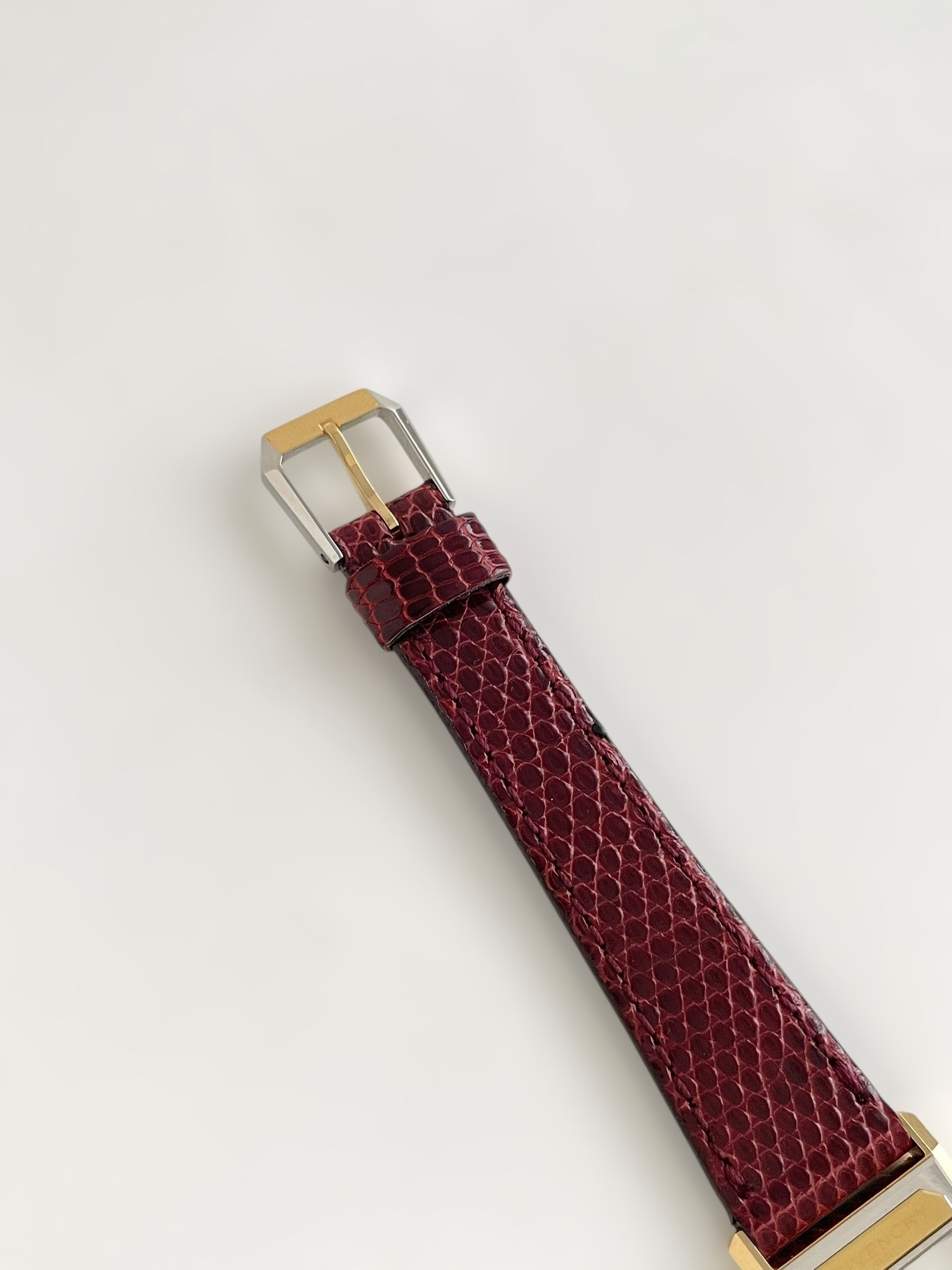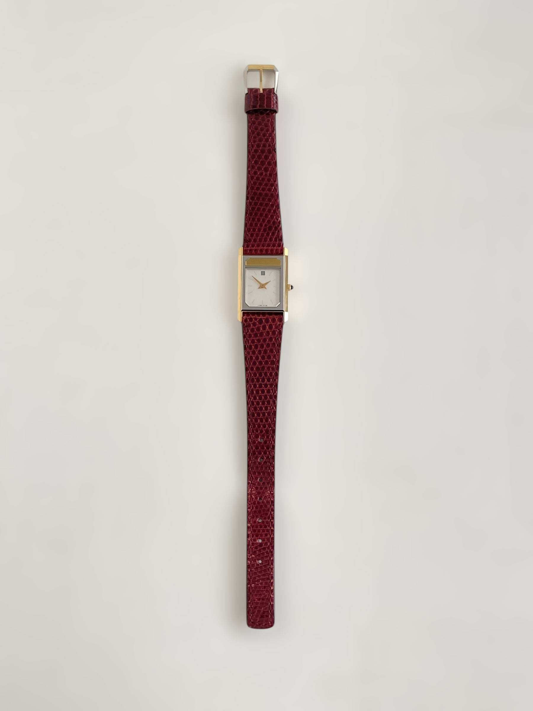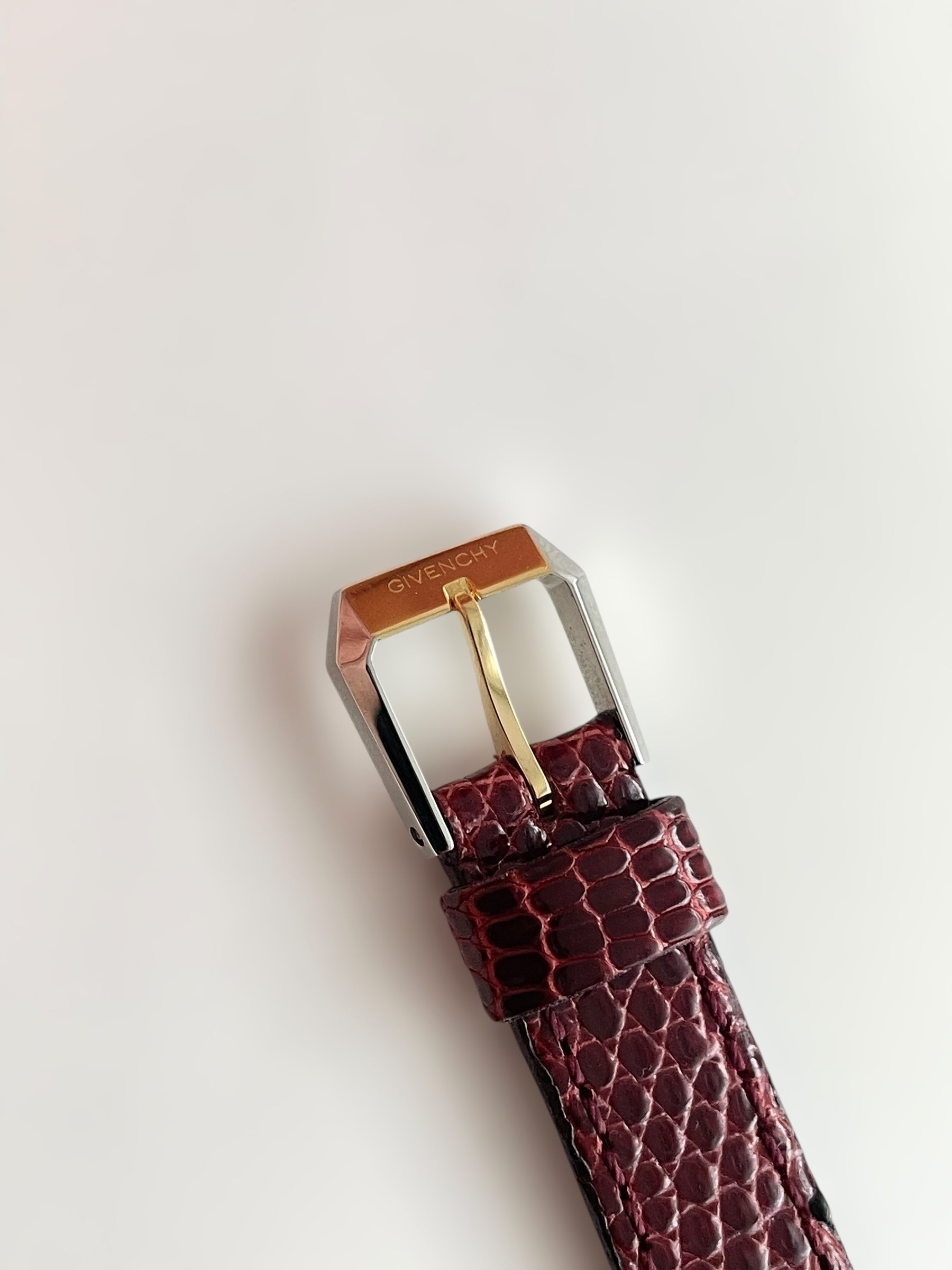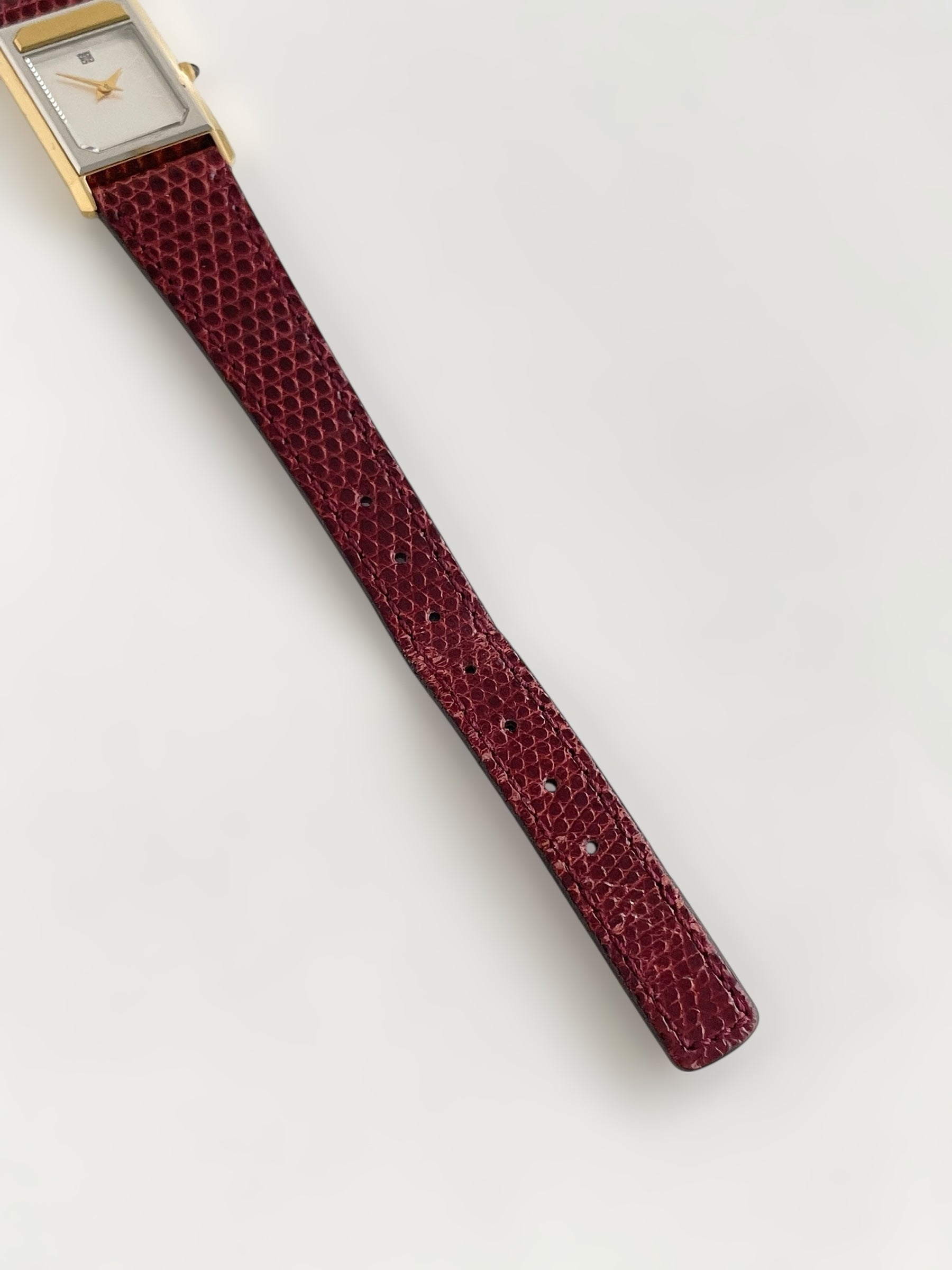 Gorgeous vintage and gold plated Givenchy watch with a croc strap design and a tank case with brand name engraving.