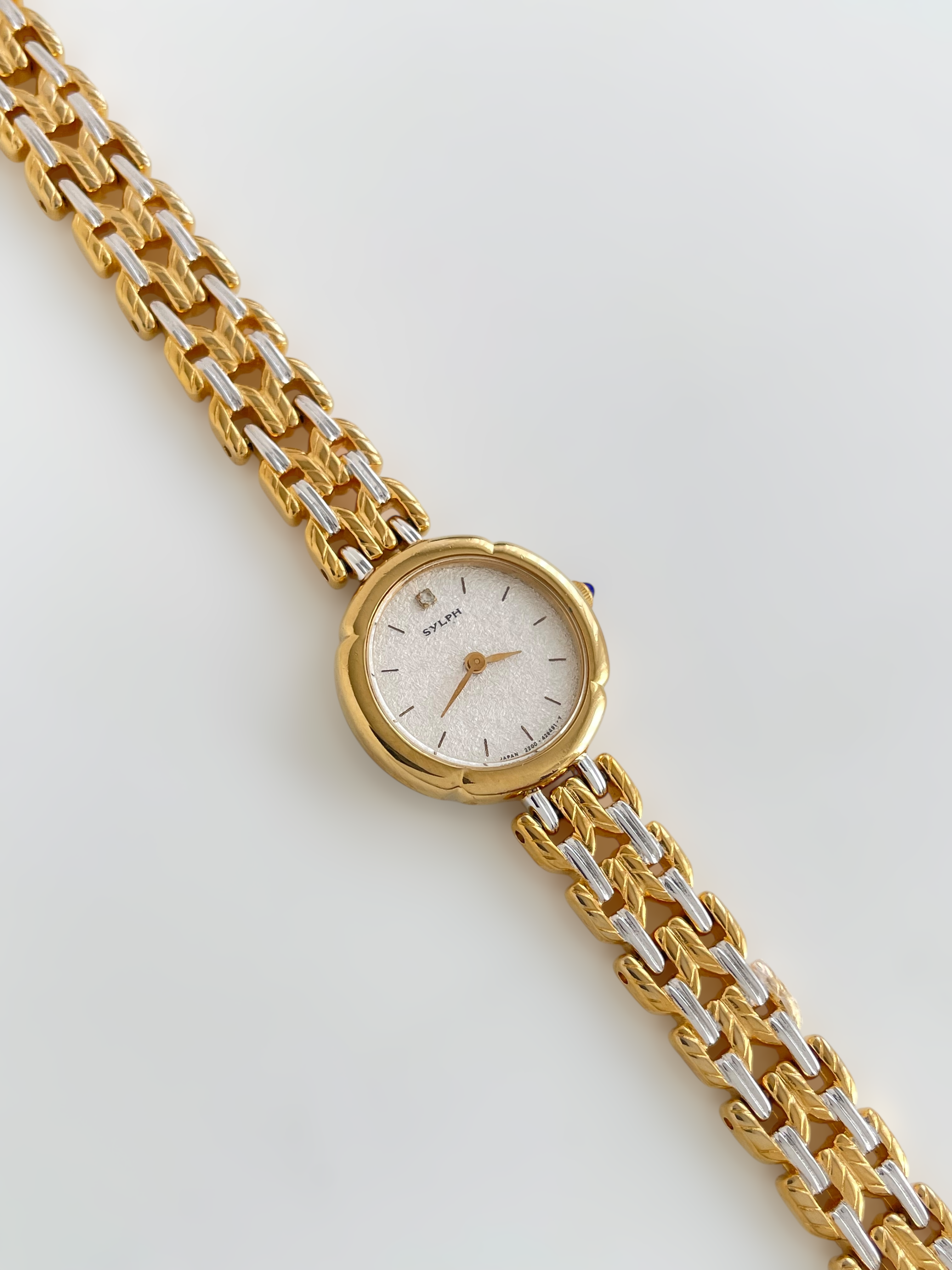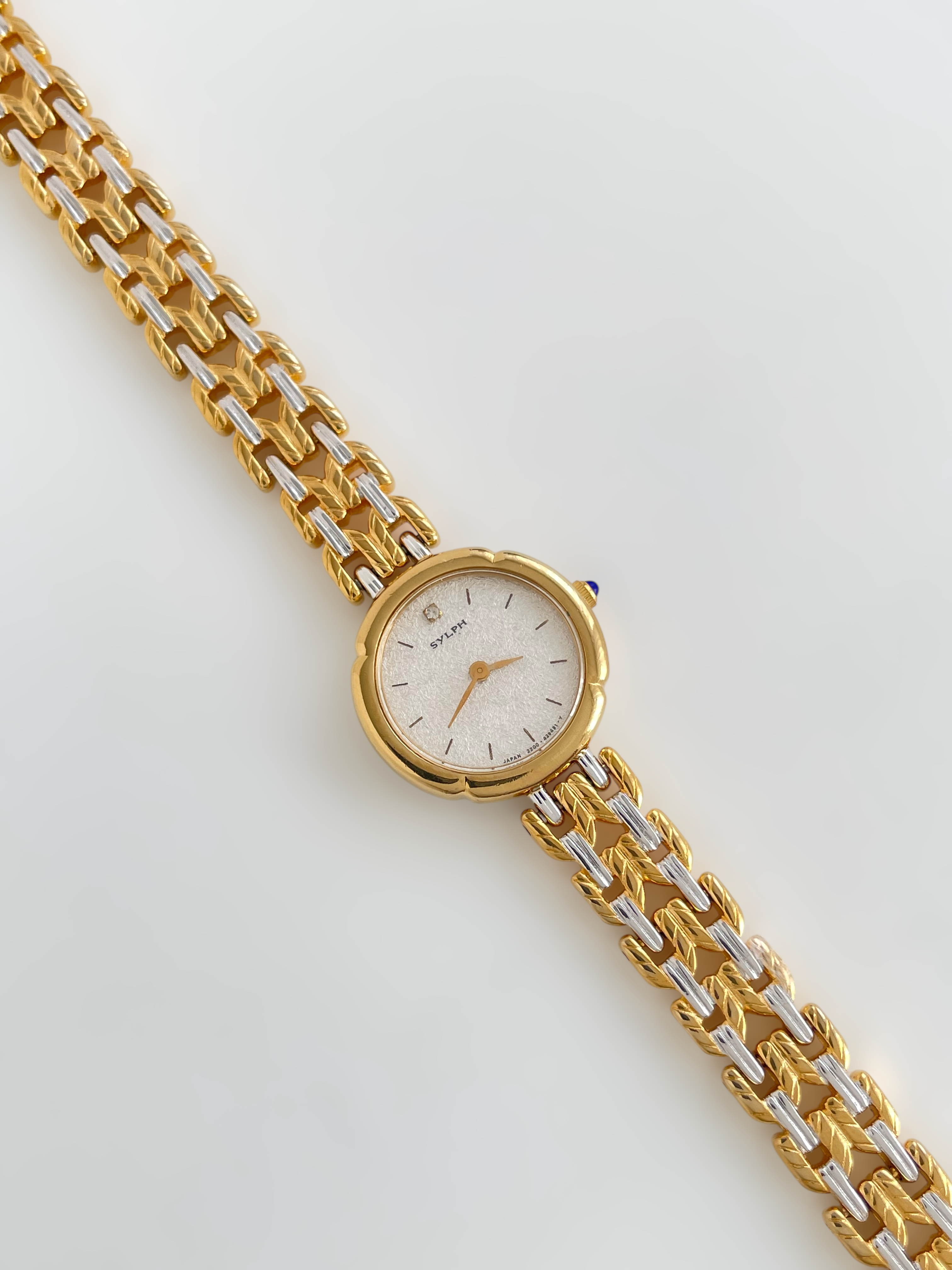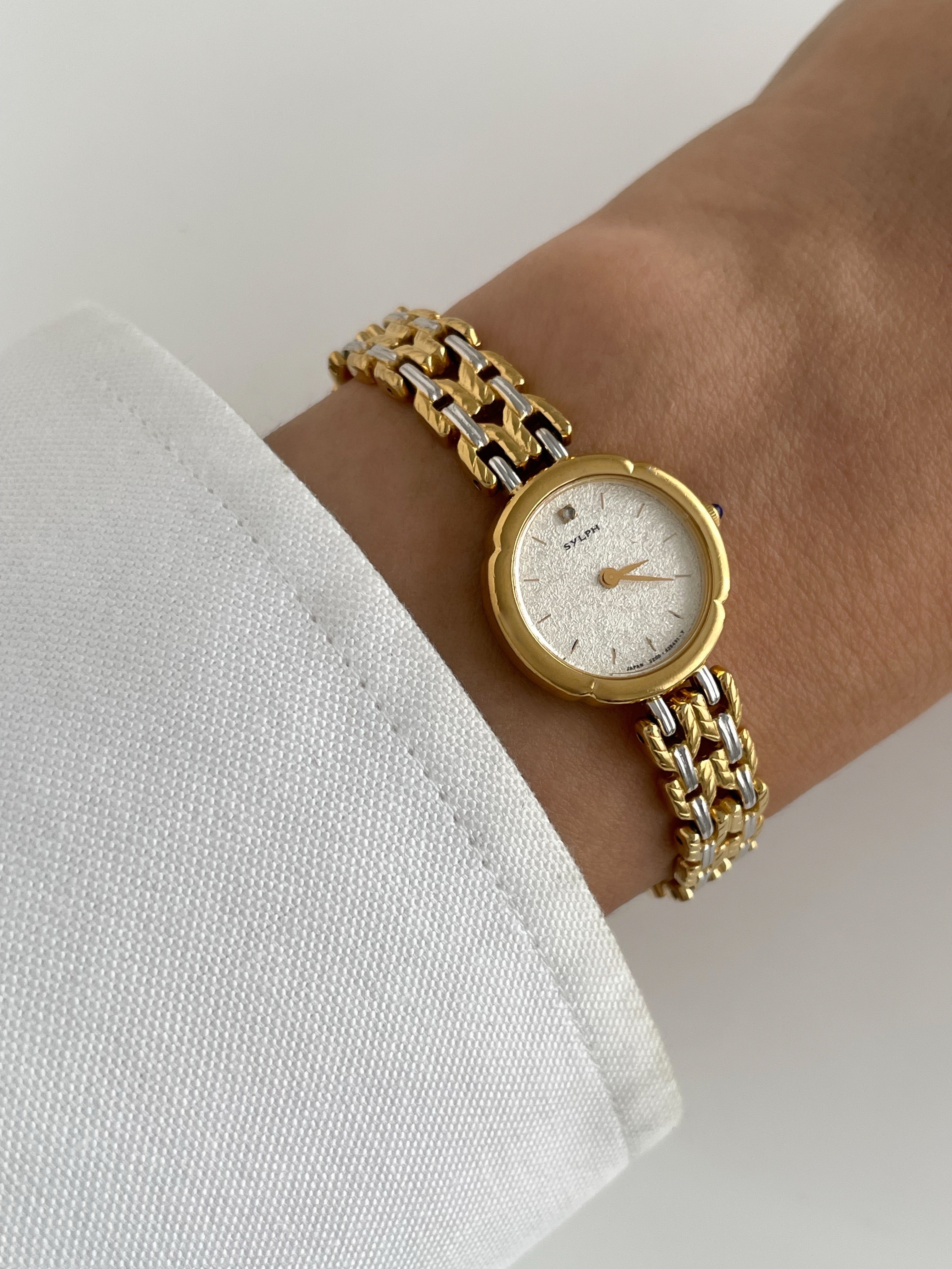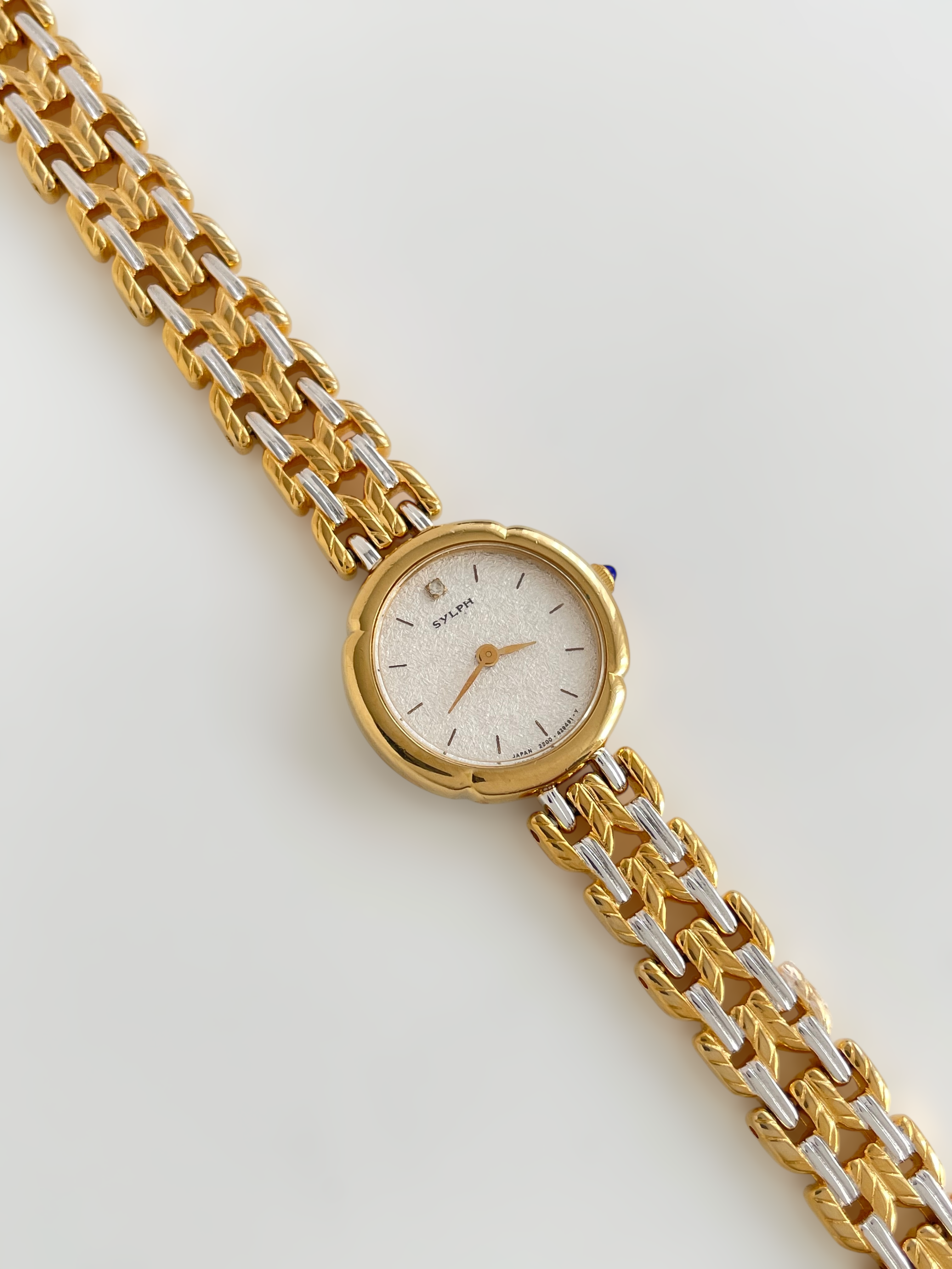 Gorgeous vintage and gold plated duotone Citizen Sylph watch with a beautiful bracelet design and a round case adorned with a diamond on 12’hour mark. Bracelet clasp closure with removable security.