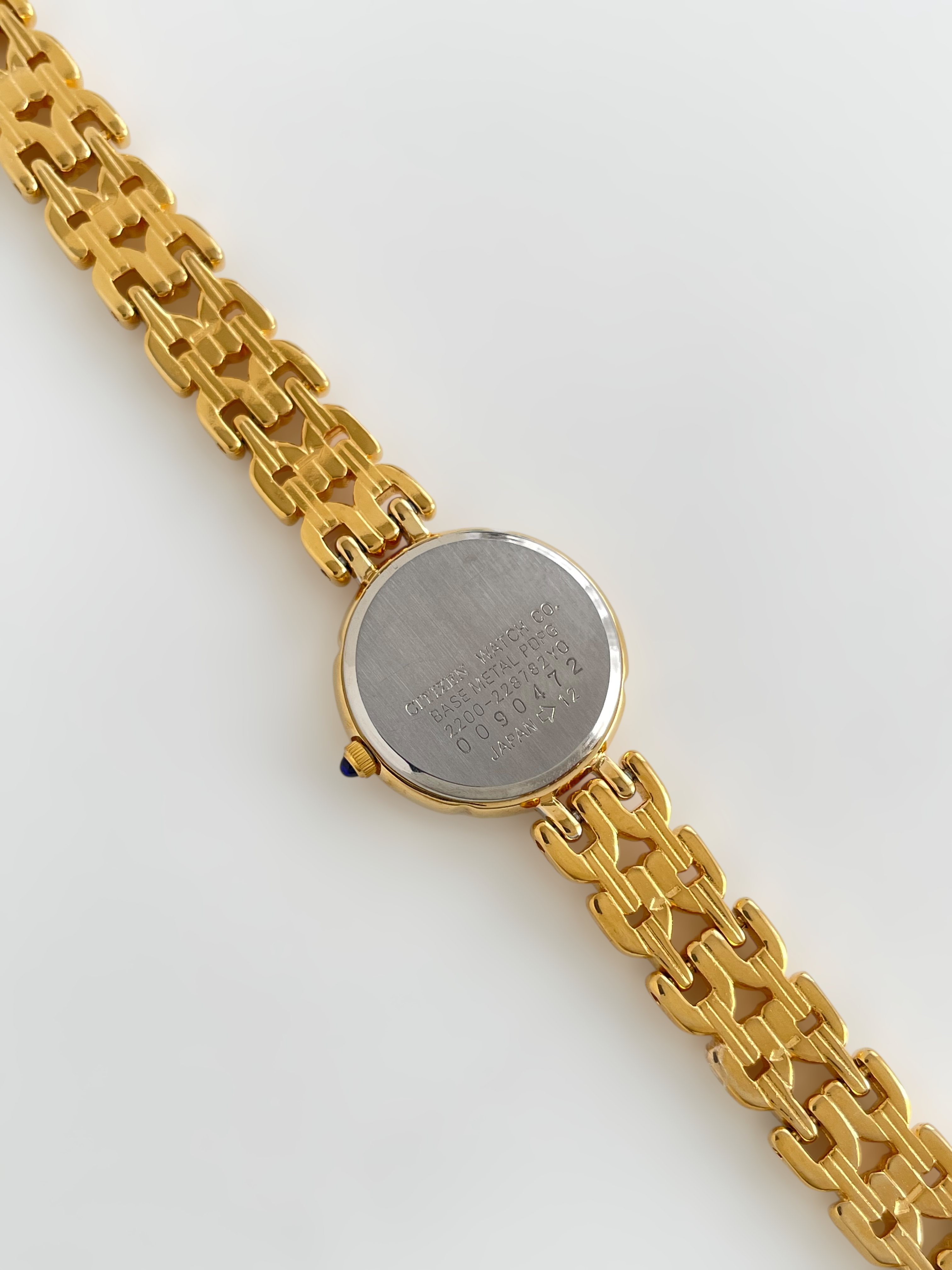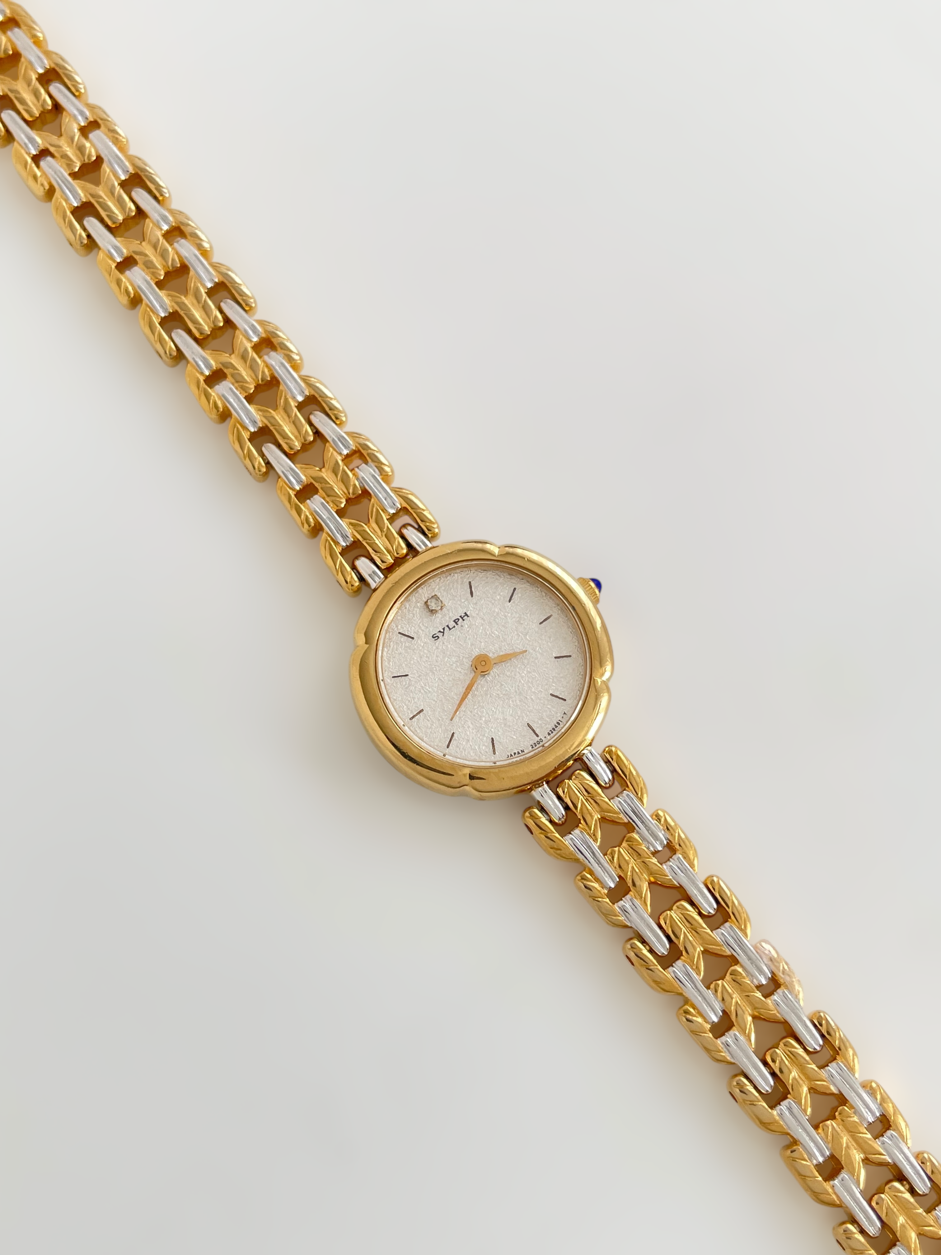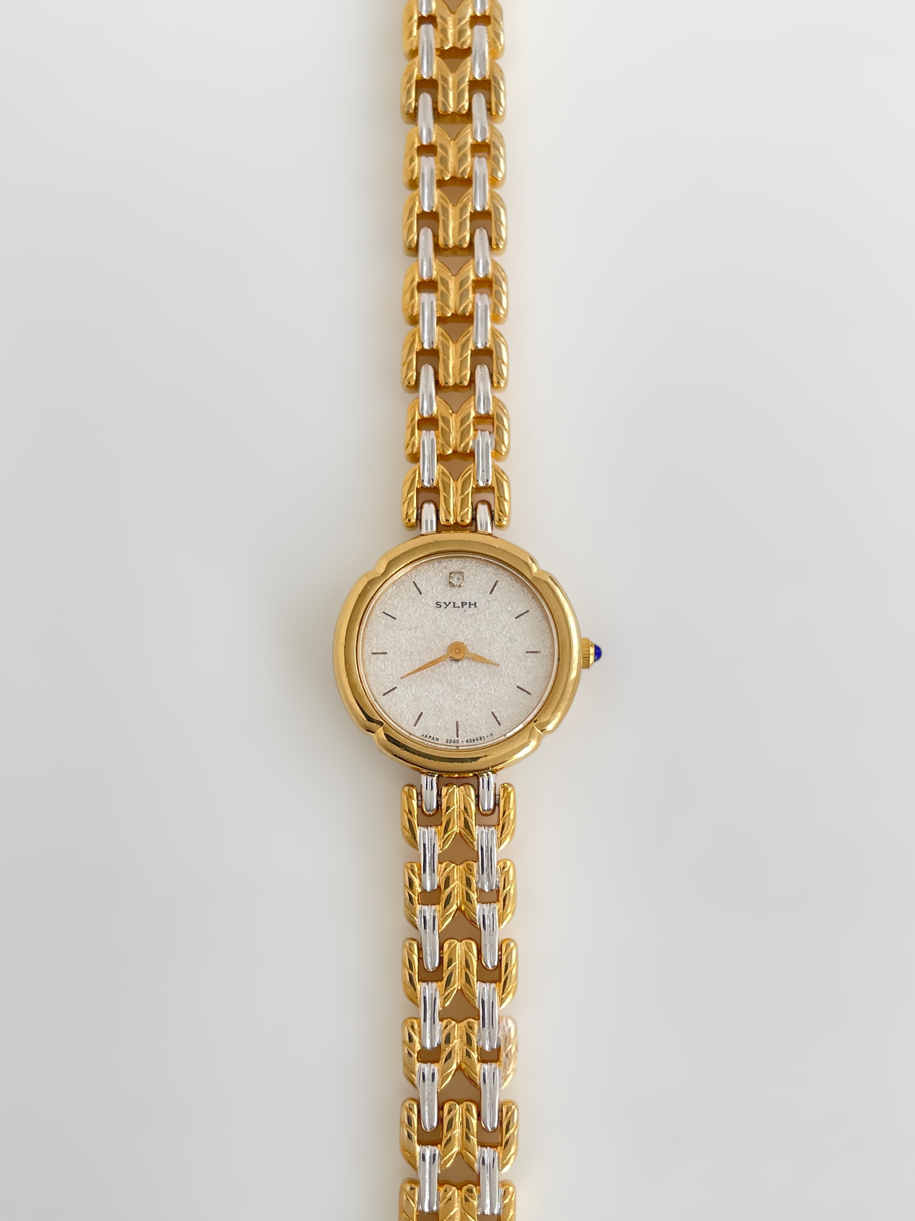 Gorgeous vintage and gold plated duotone Citizen Sylph watch with a beautiful bracelet design and a round case adorned with a diamond on 12’hour mark. Bracelet clasp closure with removable security.