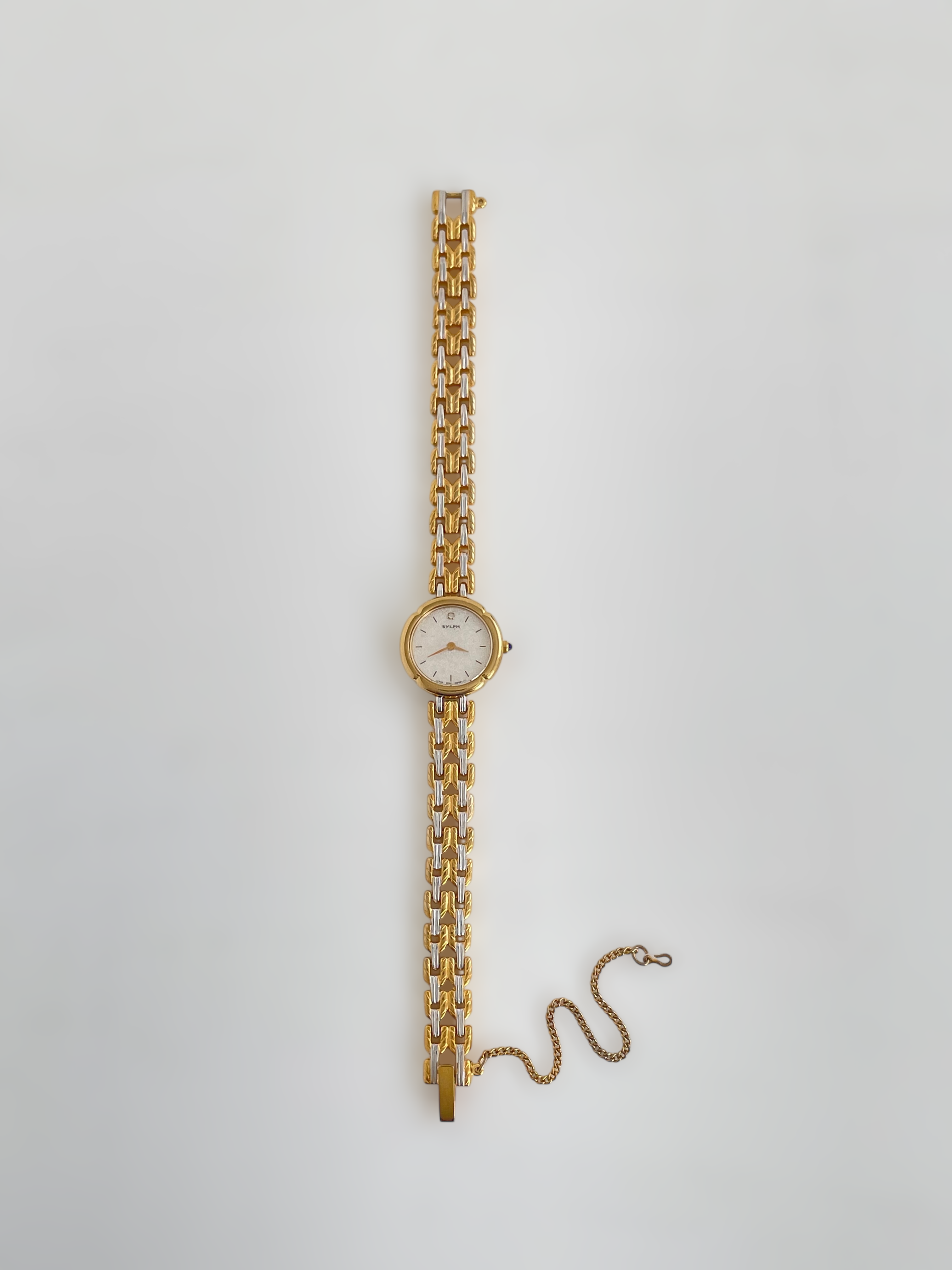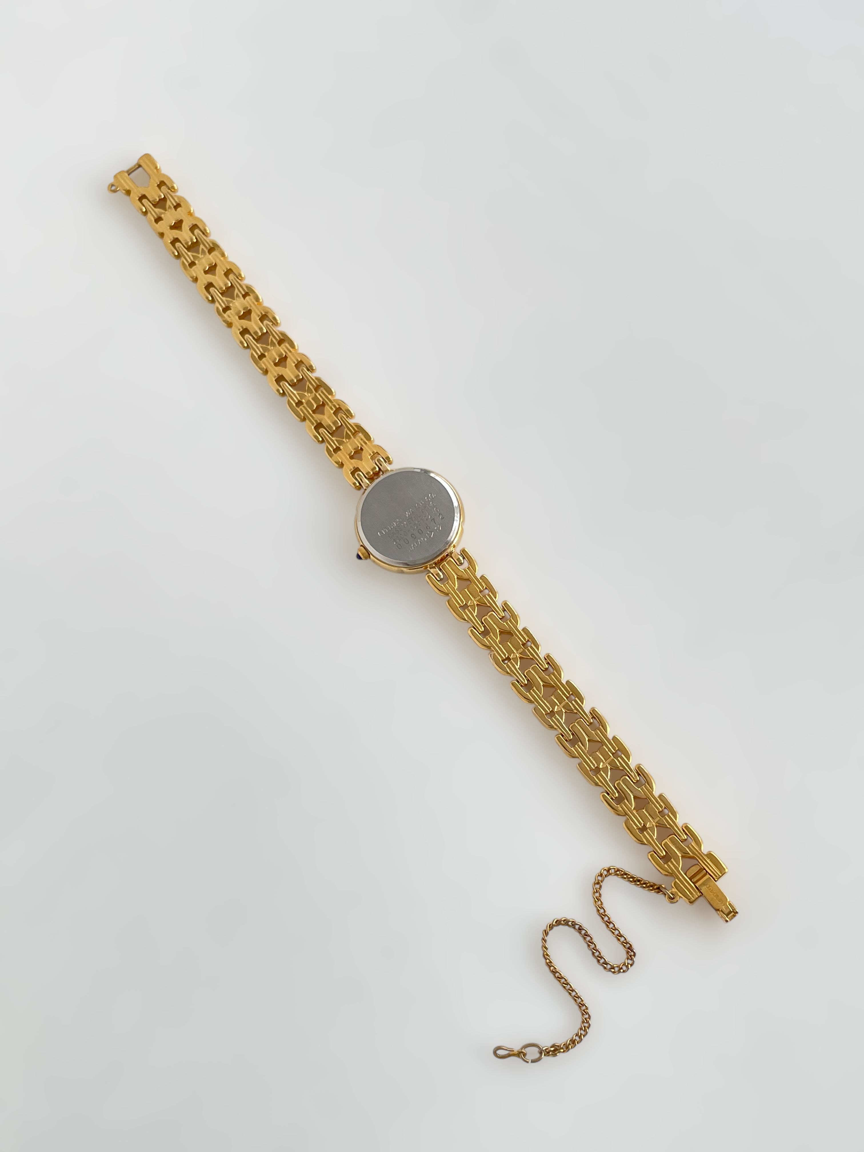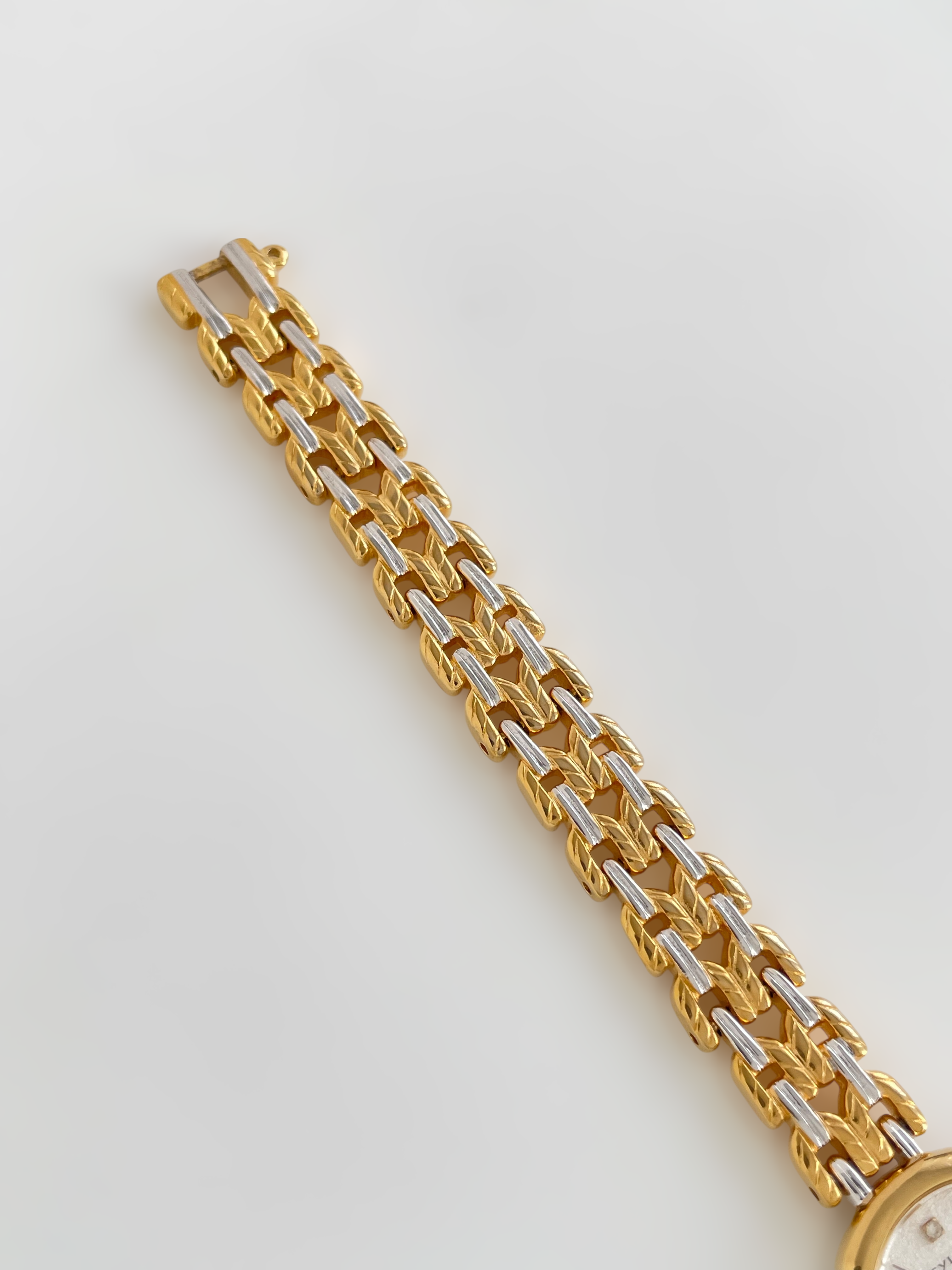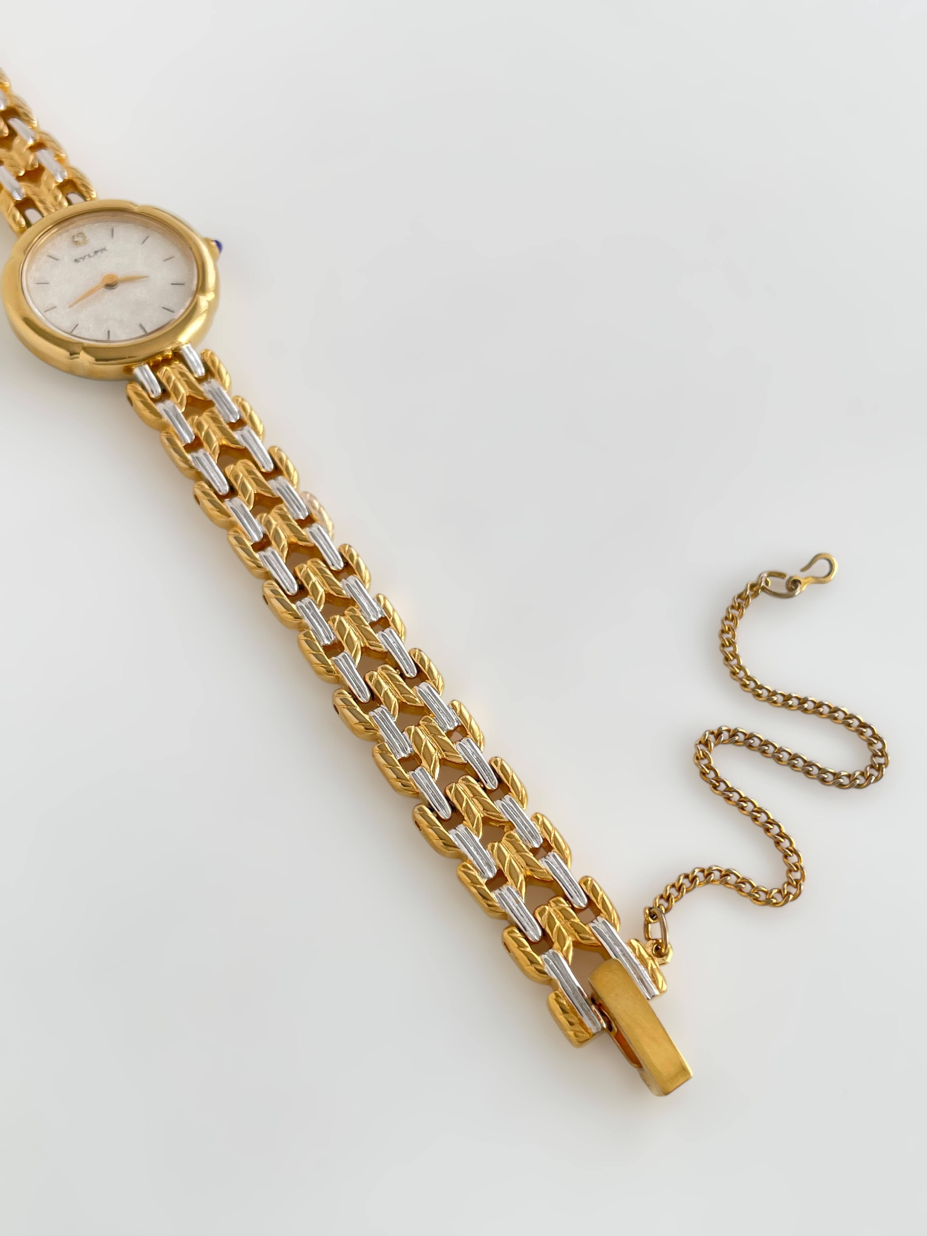 Gorgeous vintage and gold plated duotone Citizen Sylph watch with a beautiful bracelet design and a round case adorned with a diamond on 12’hour mark. Bracelet clasp closure with removable security.