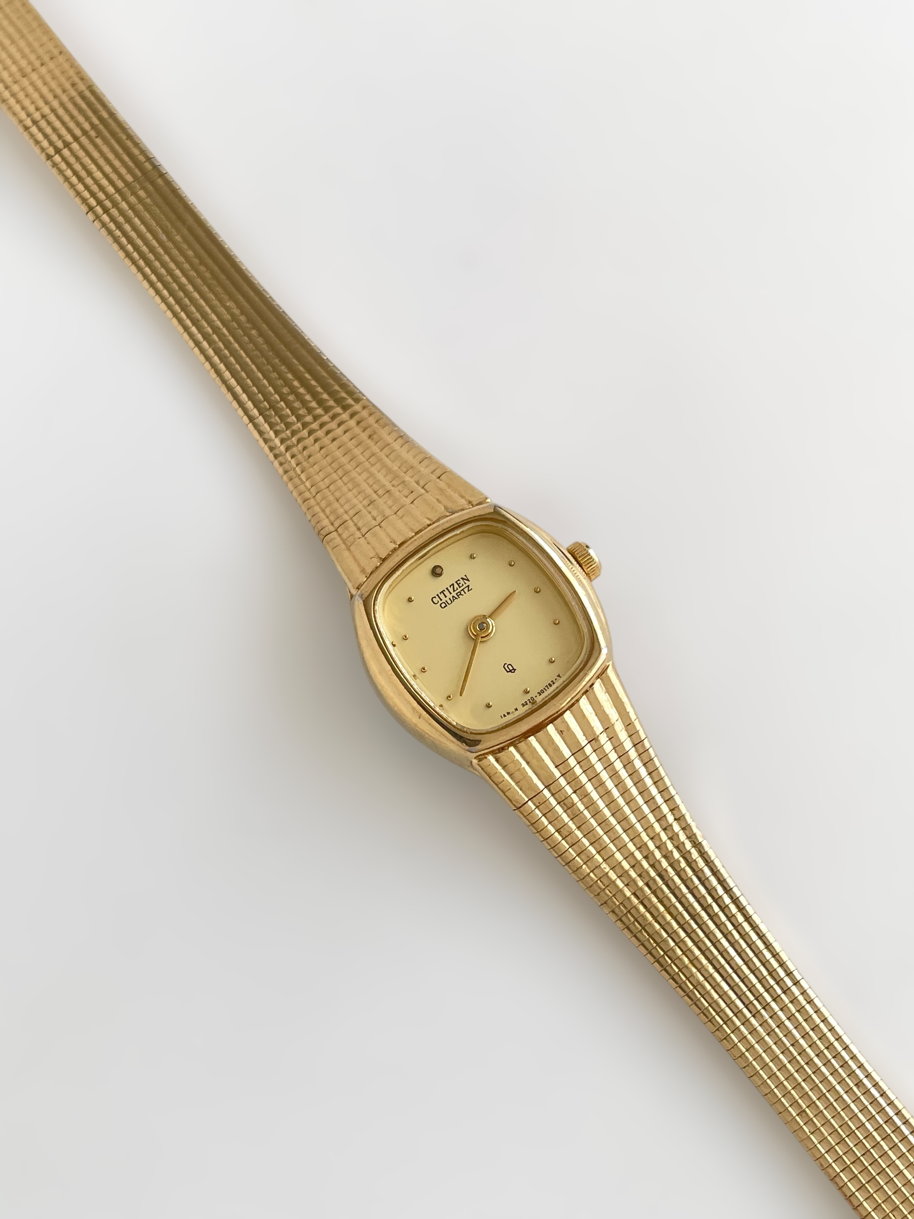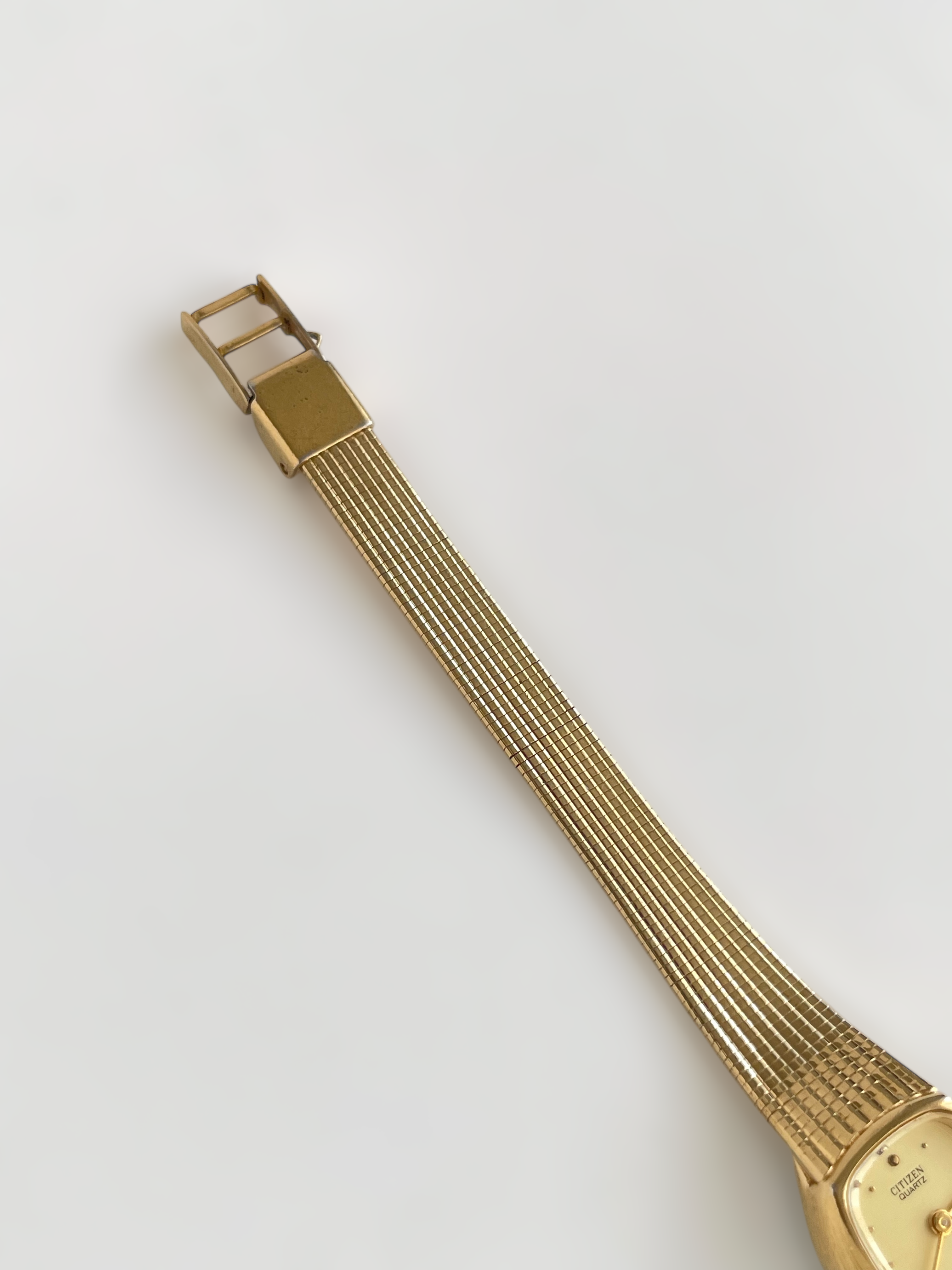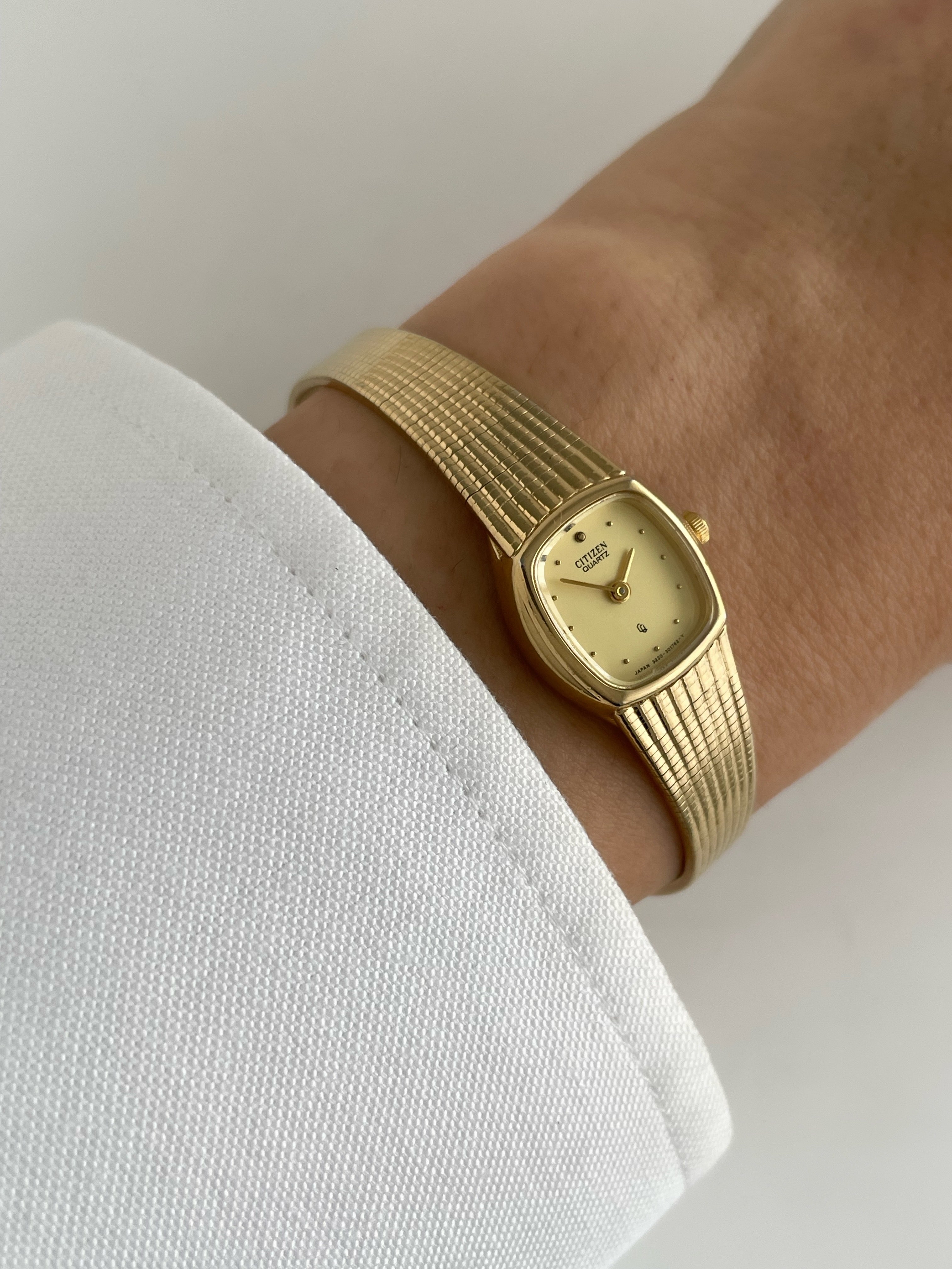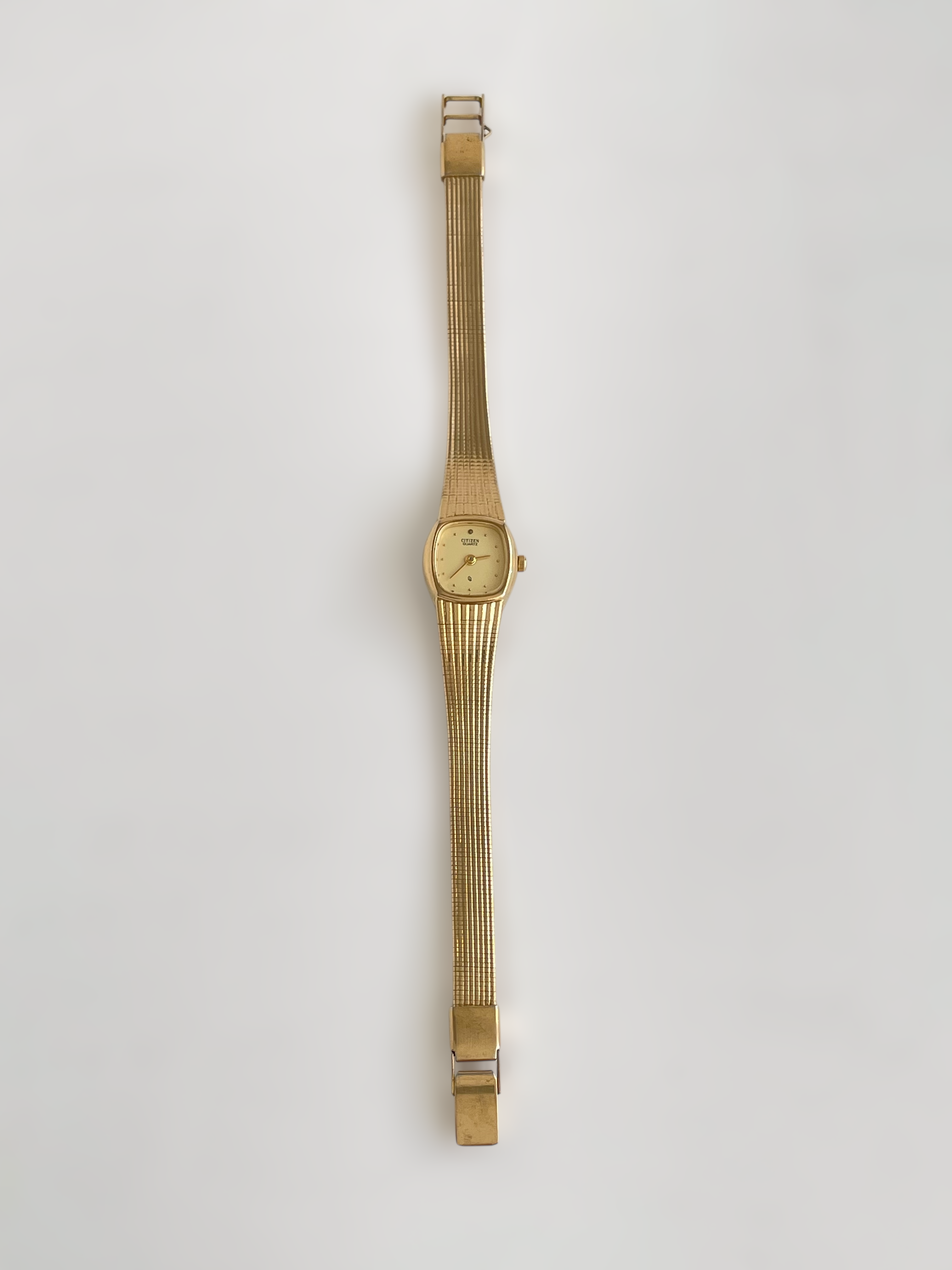 Beautiful vintage and gold plated Citizen watch with a flat bracelet design and a square case. Bracelet clasp closure.