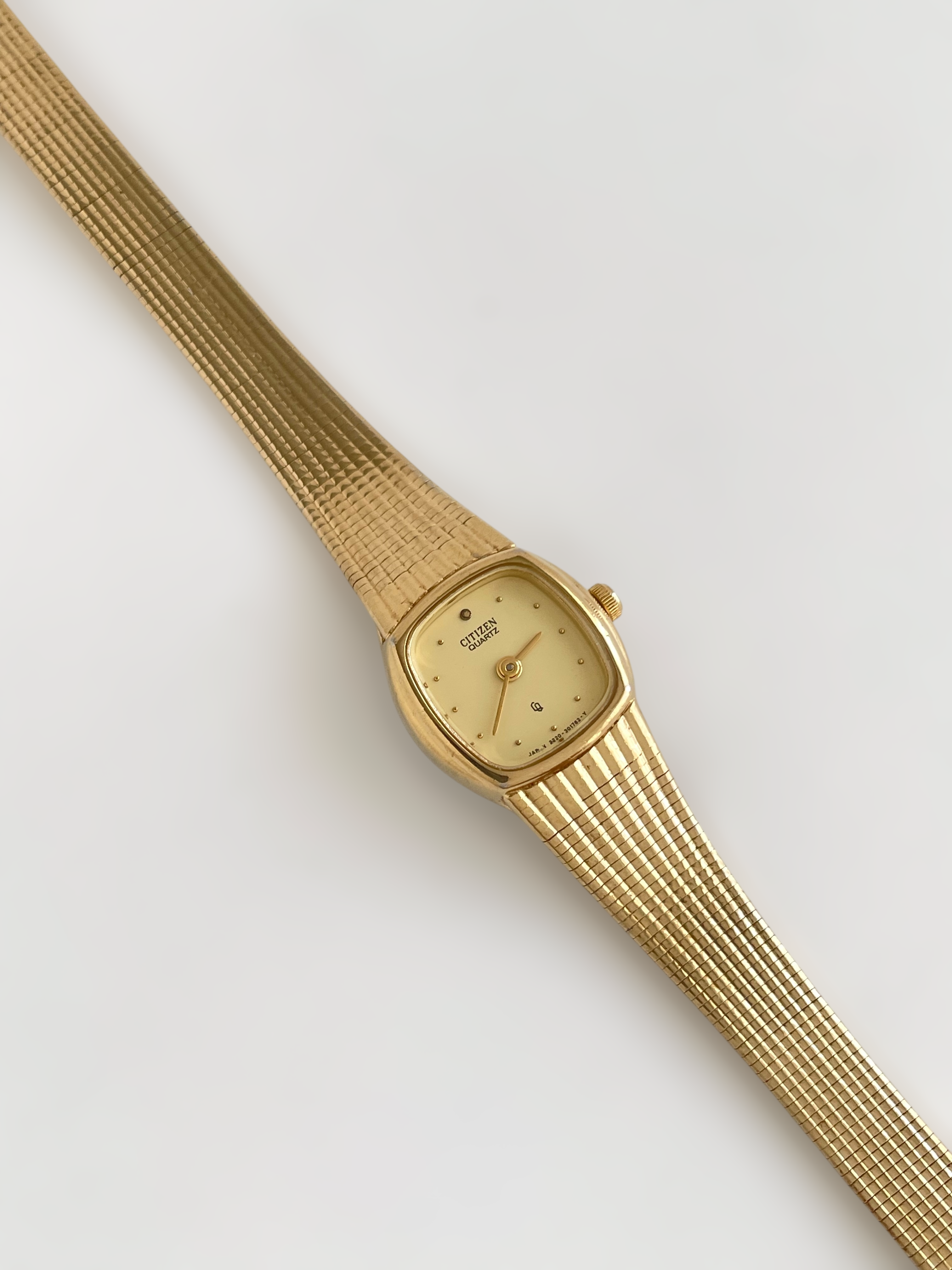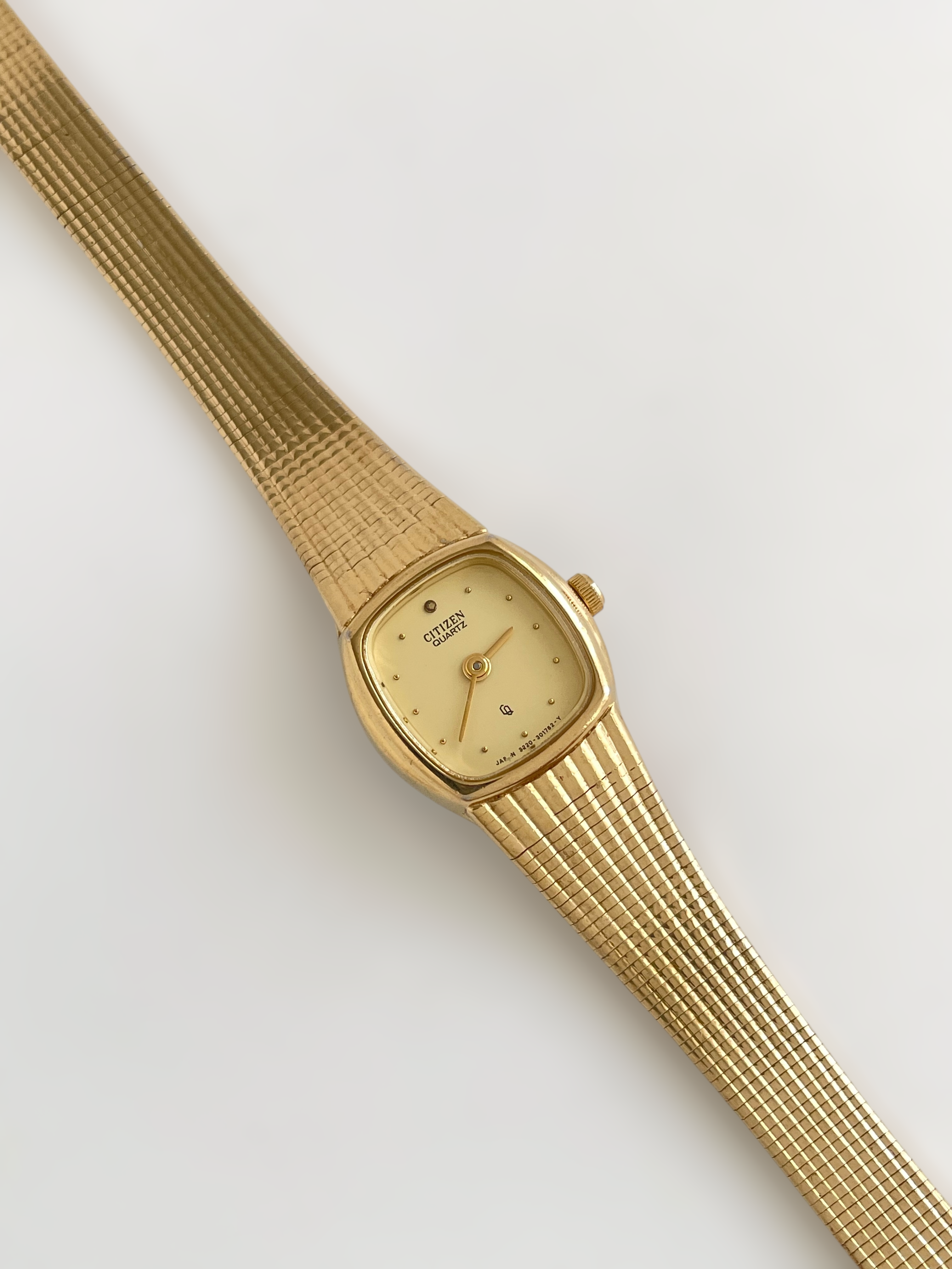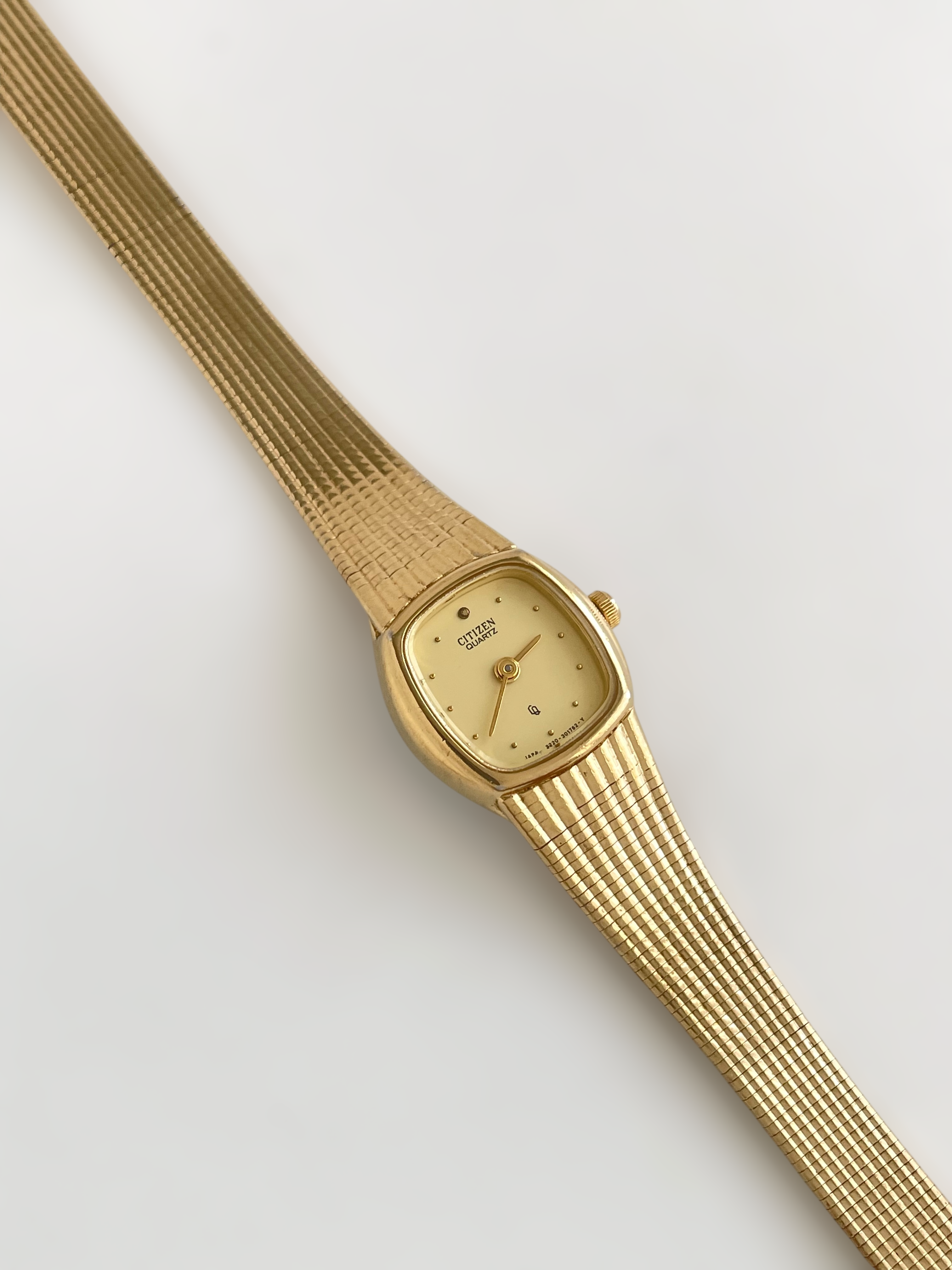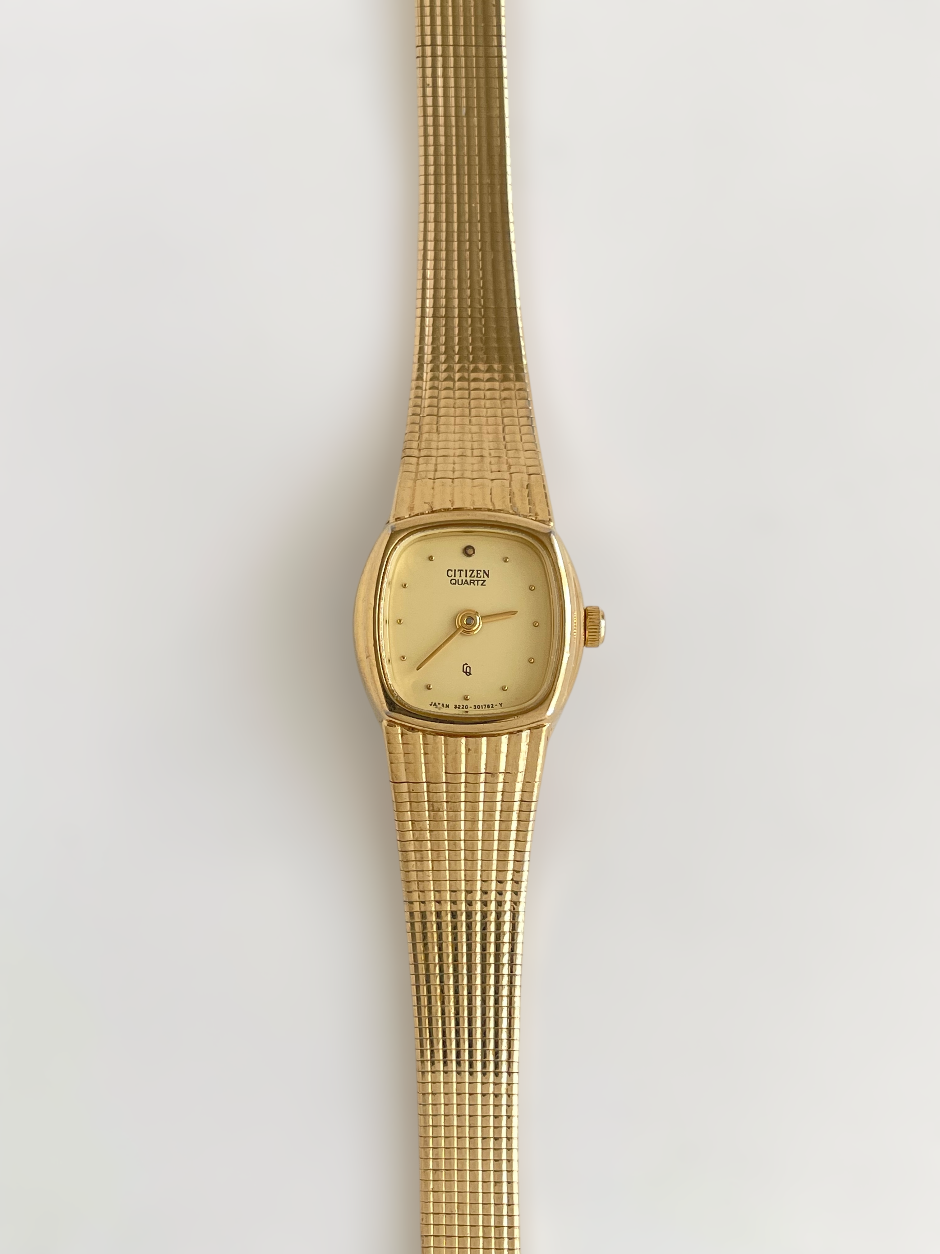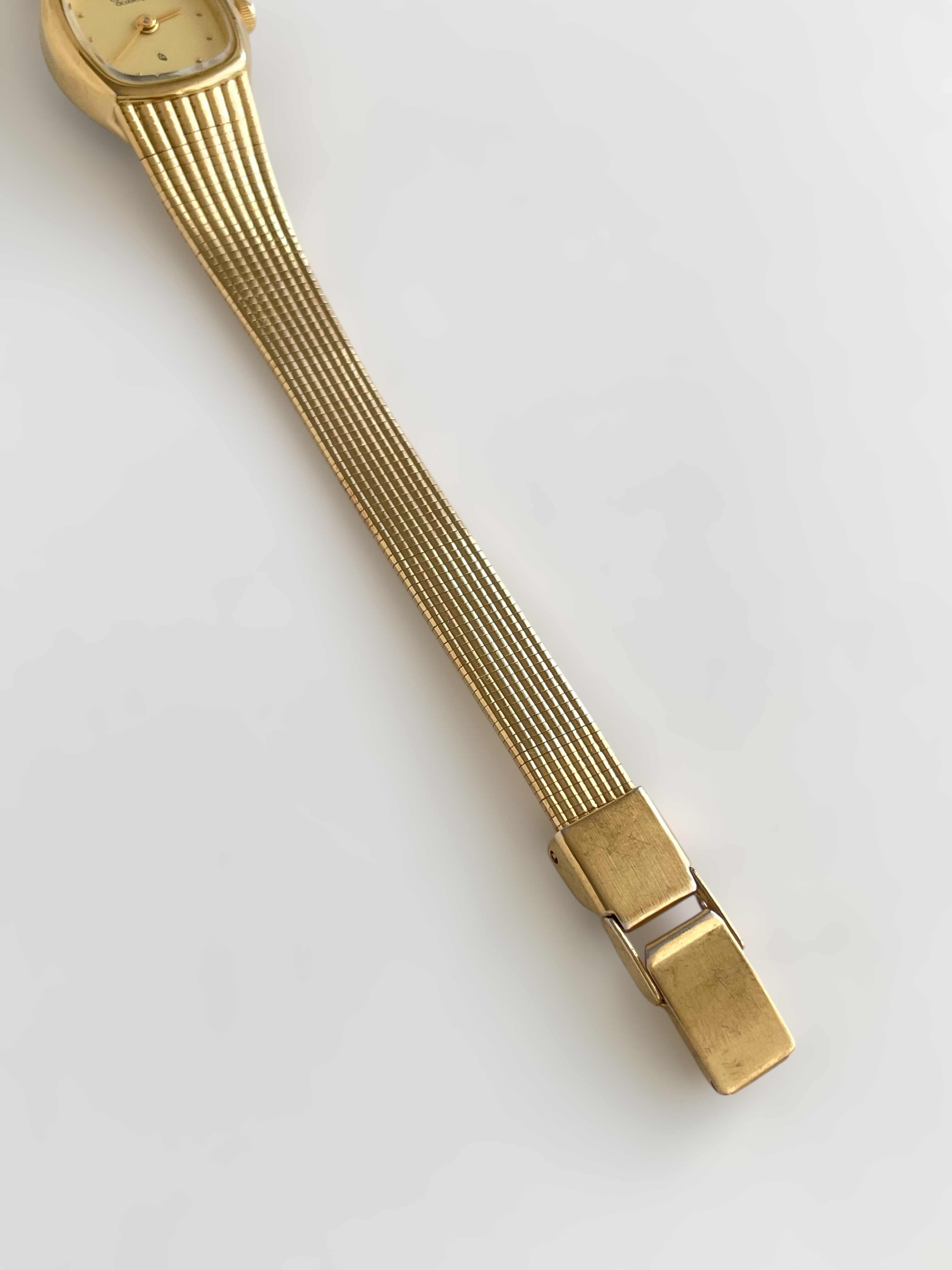 Beautiful vintage and gold plated Citizen watch with a flat bracelet design and a square case. Bracelet clasp closure.