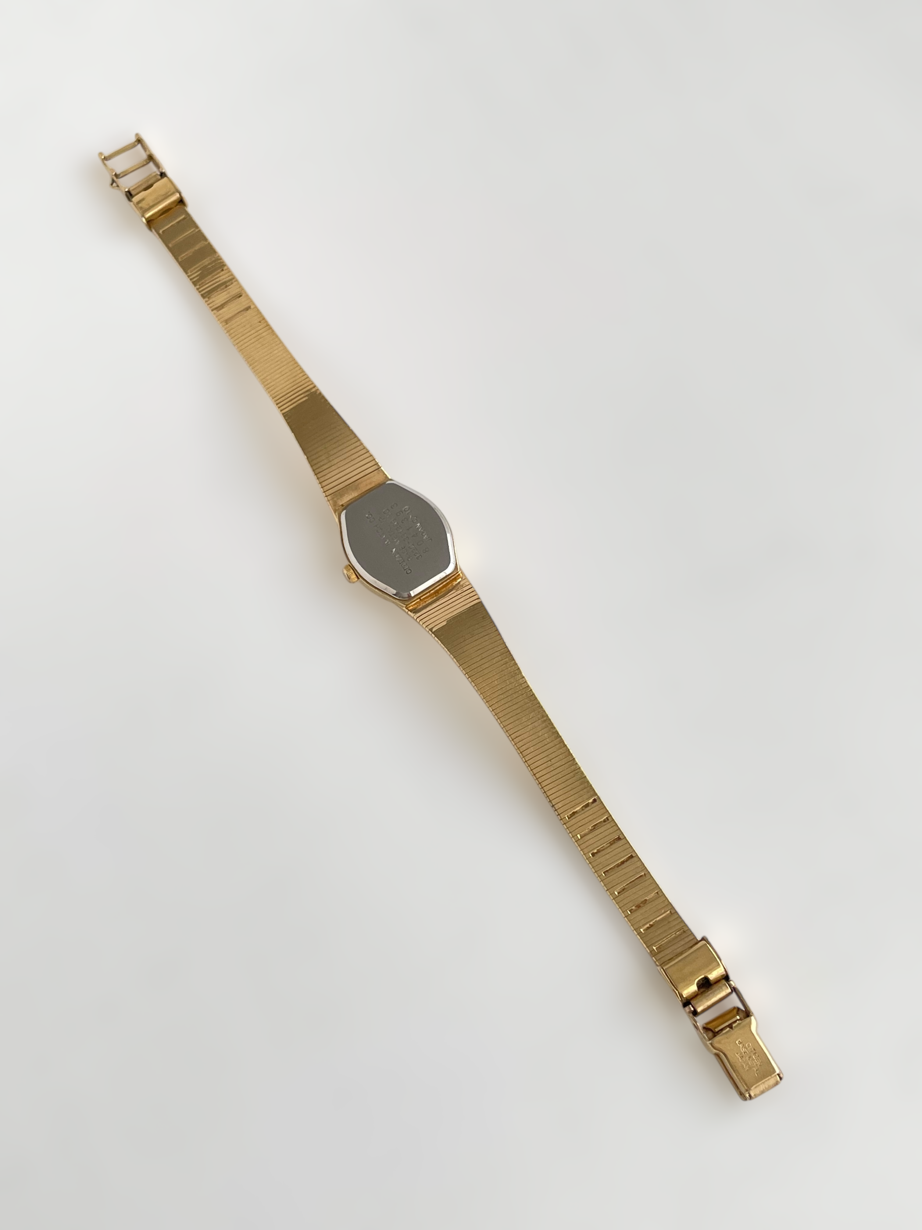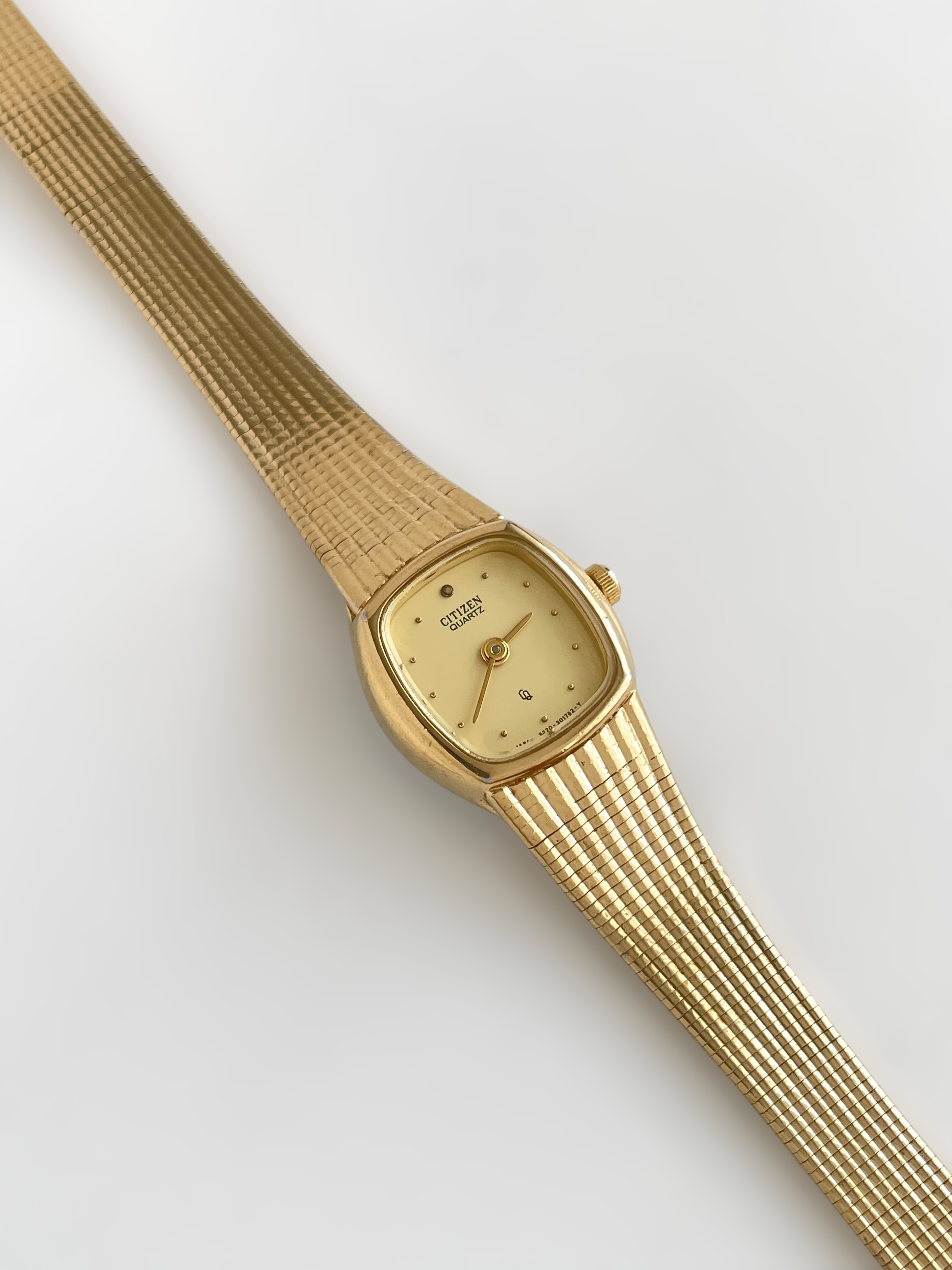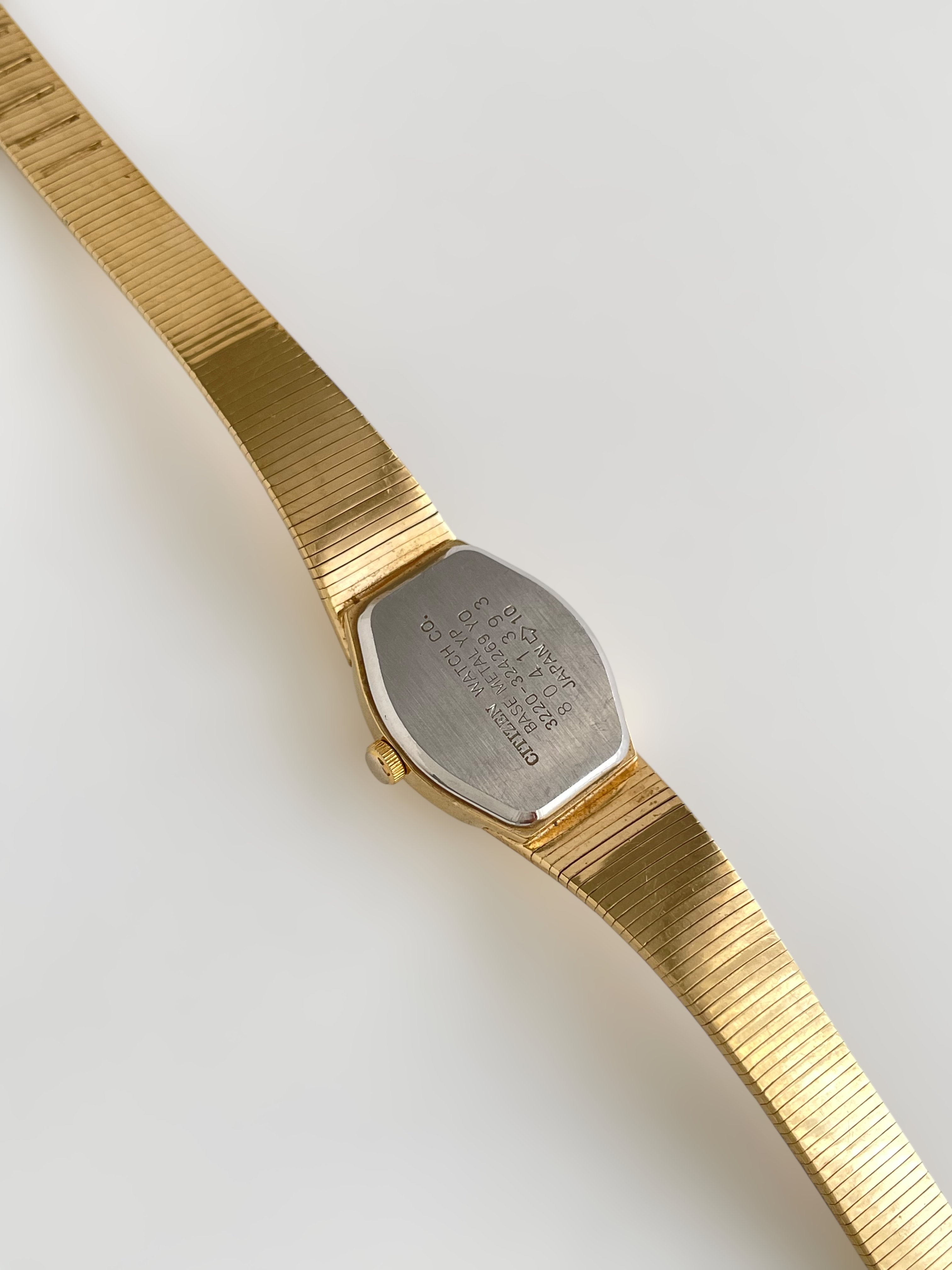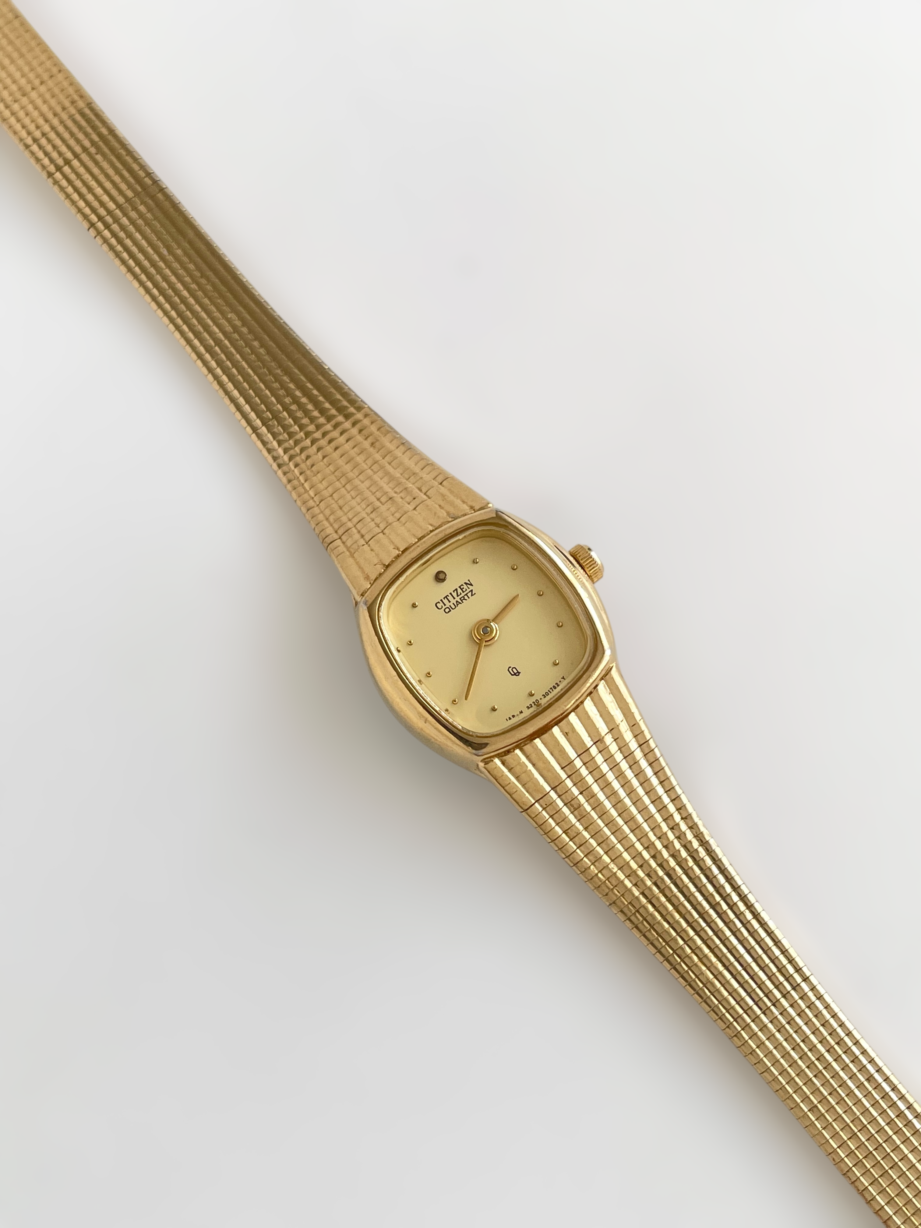Beautiful vintage and gold plated Citizen watch with a flat bracelet design and a square case. Bracelet clasp closure.