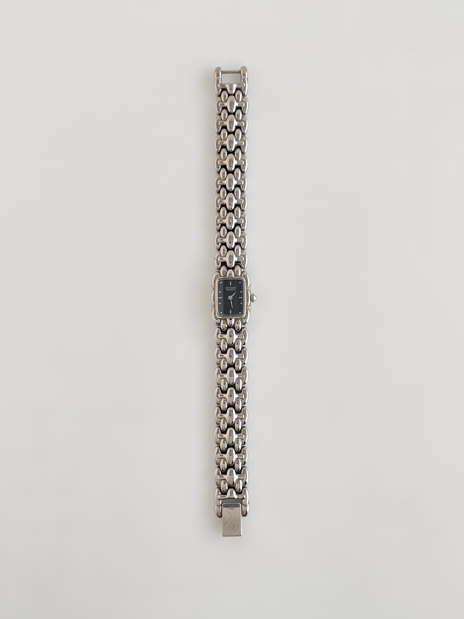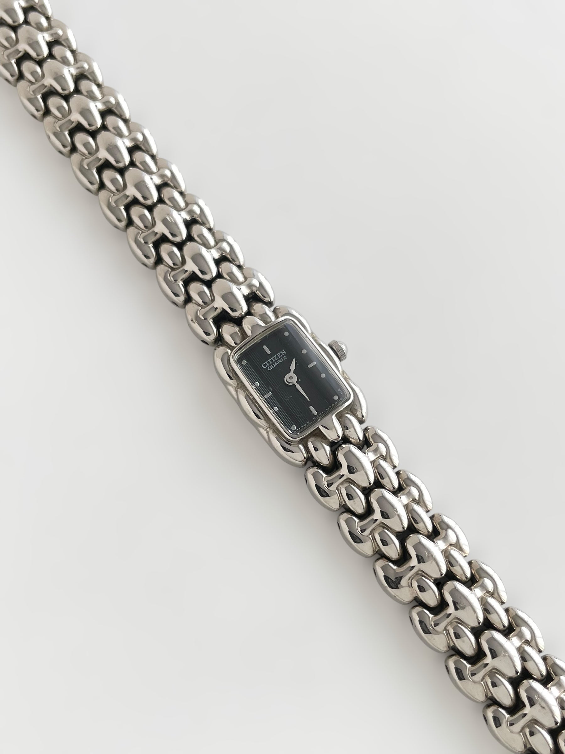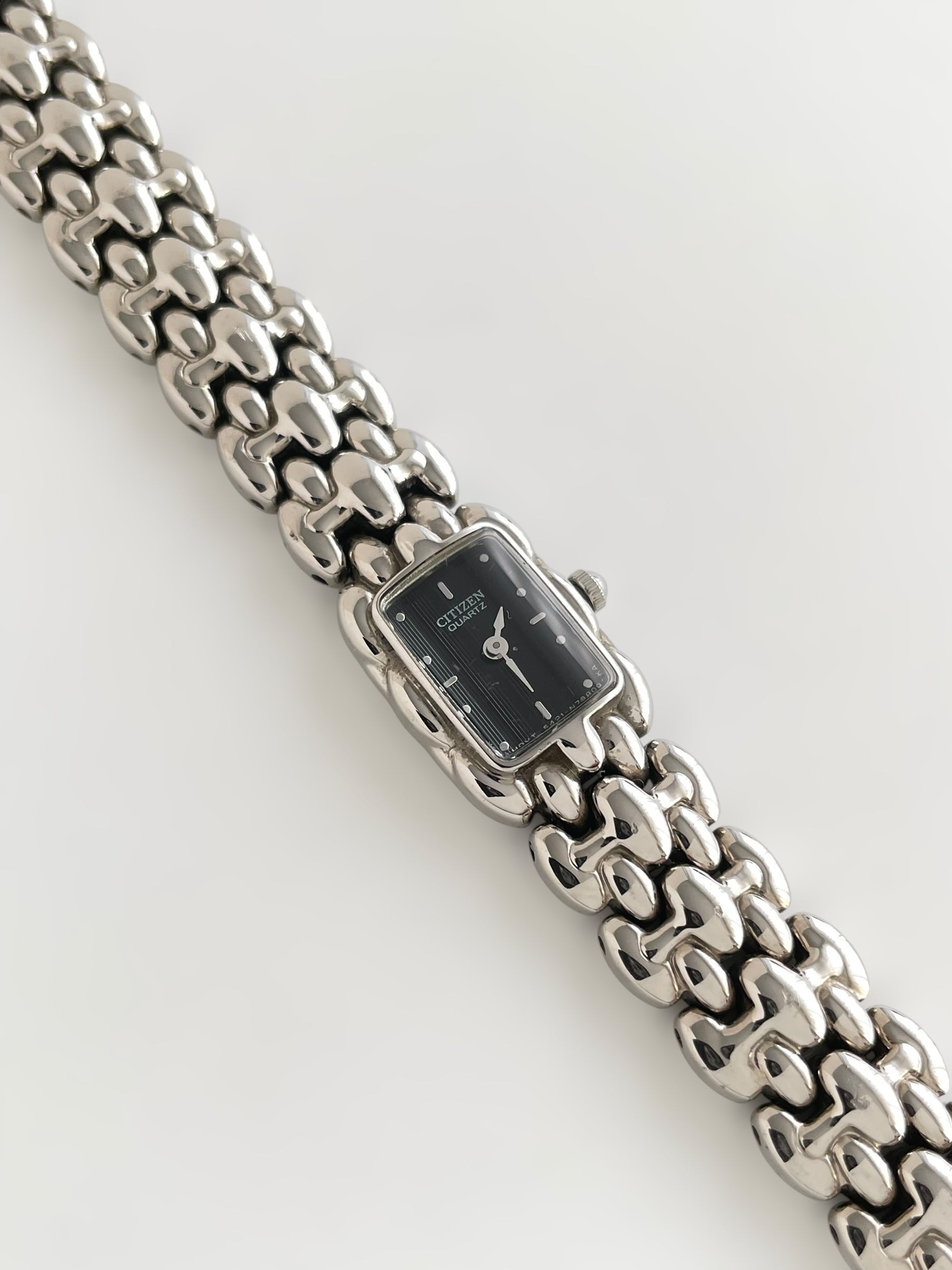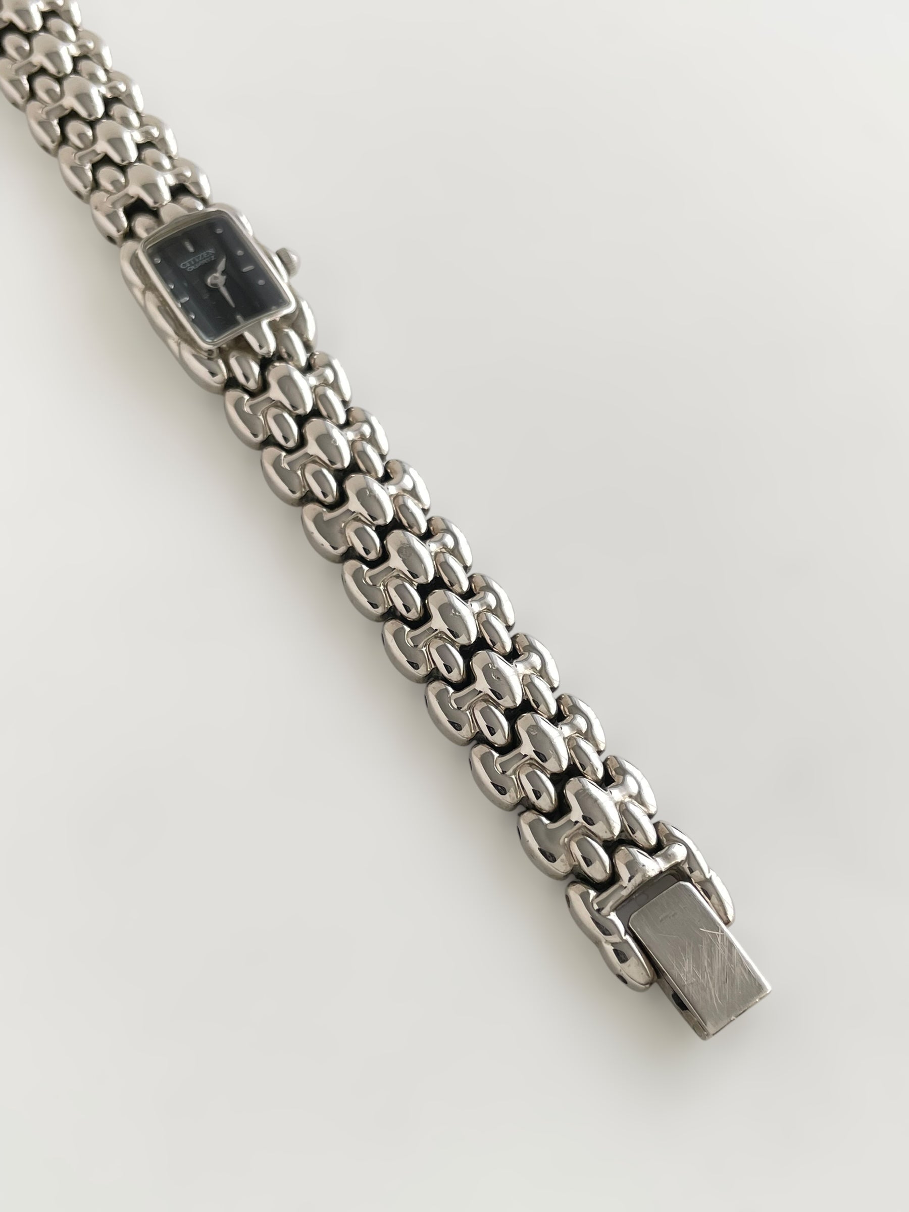 Gorgeous vintage and silver tone Citizen watch with a unique bracelet design and a petite case adorned with a black dial. Bracelet clasp closure.