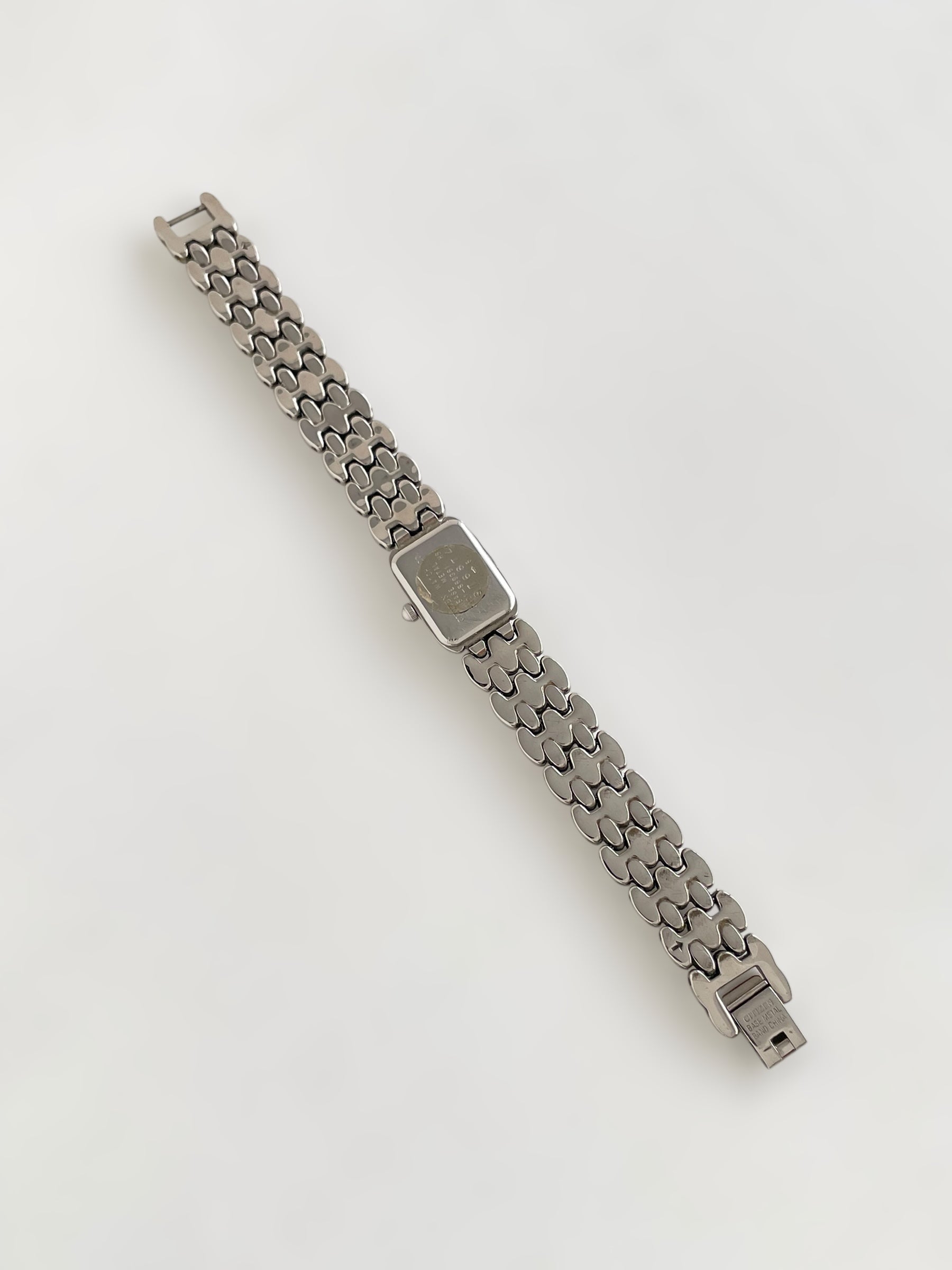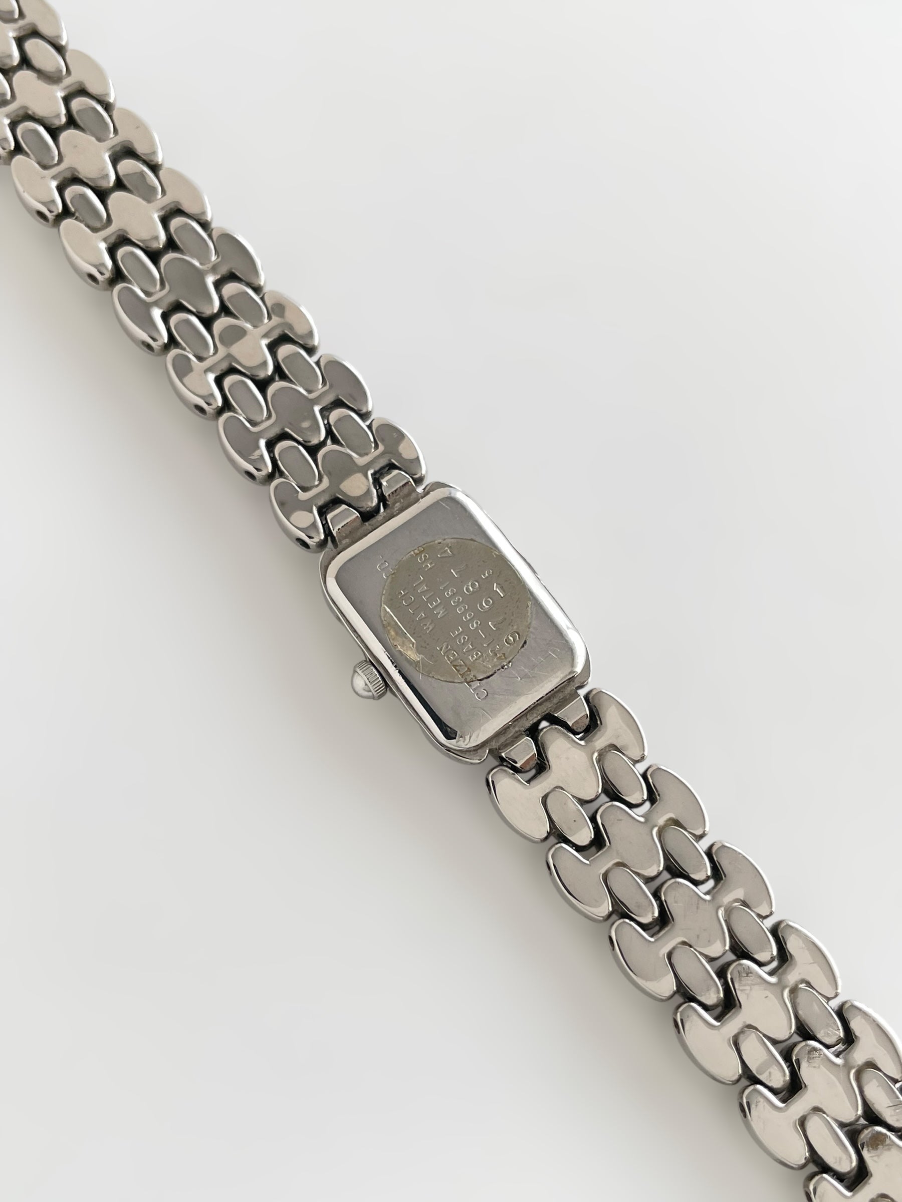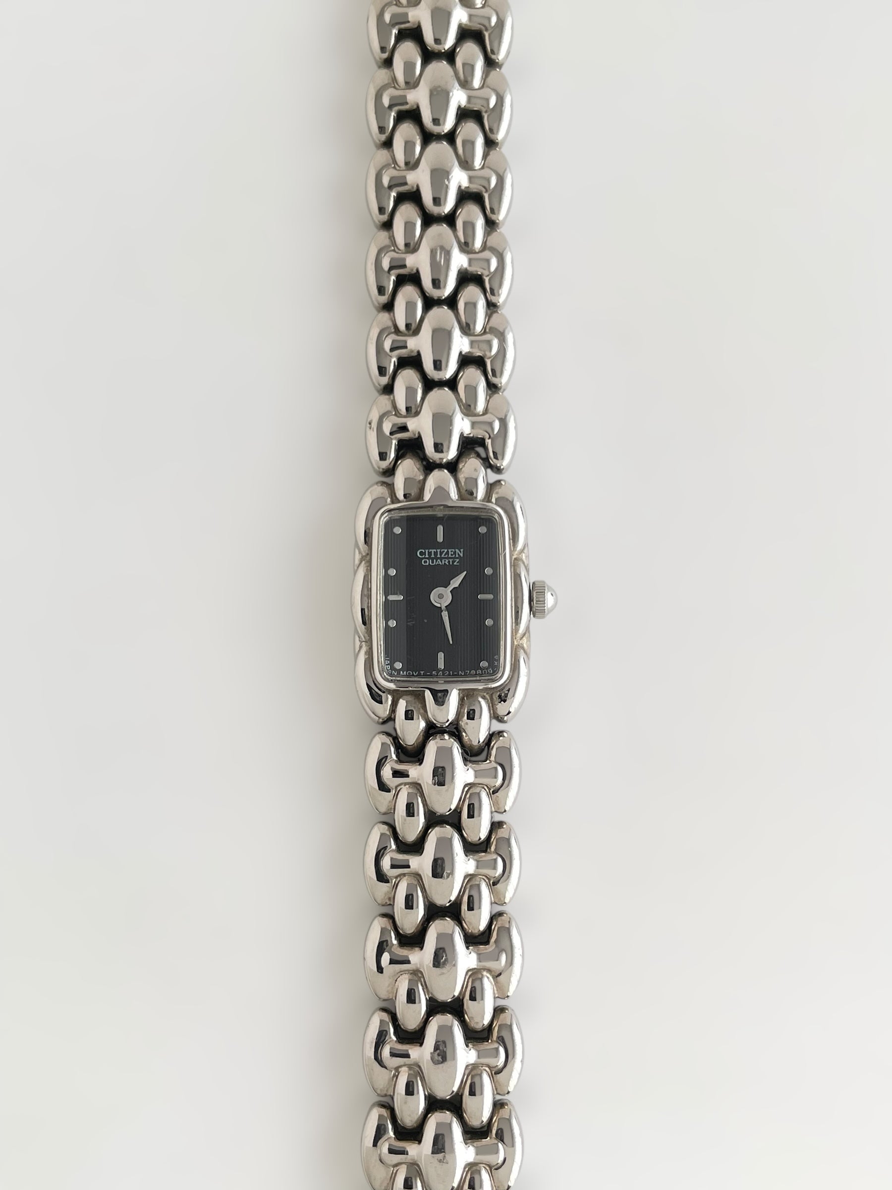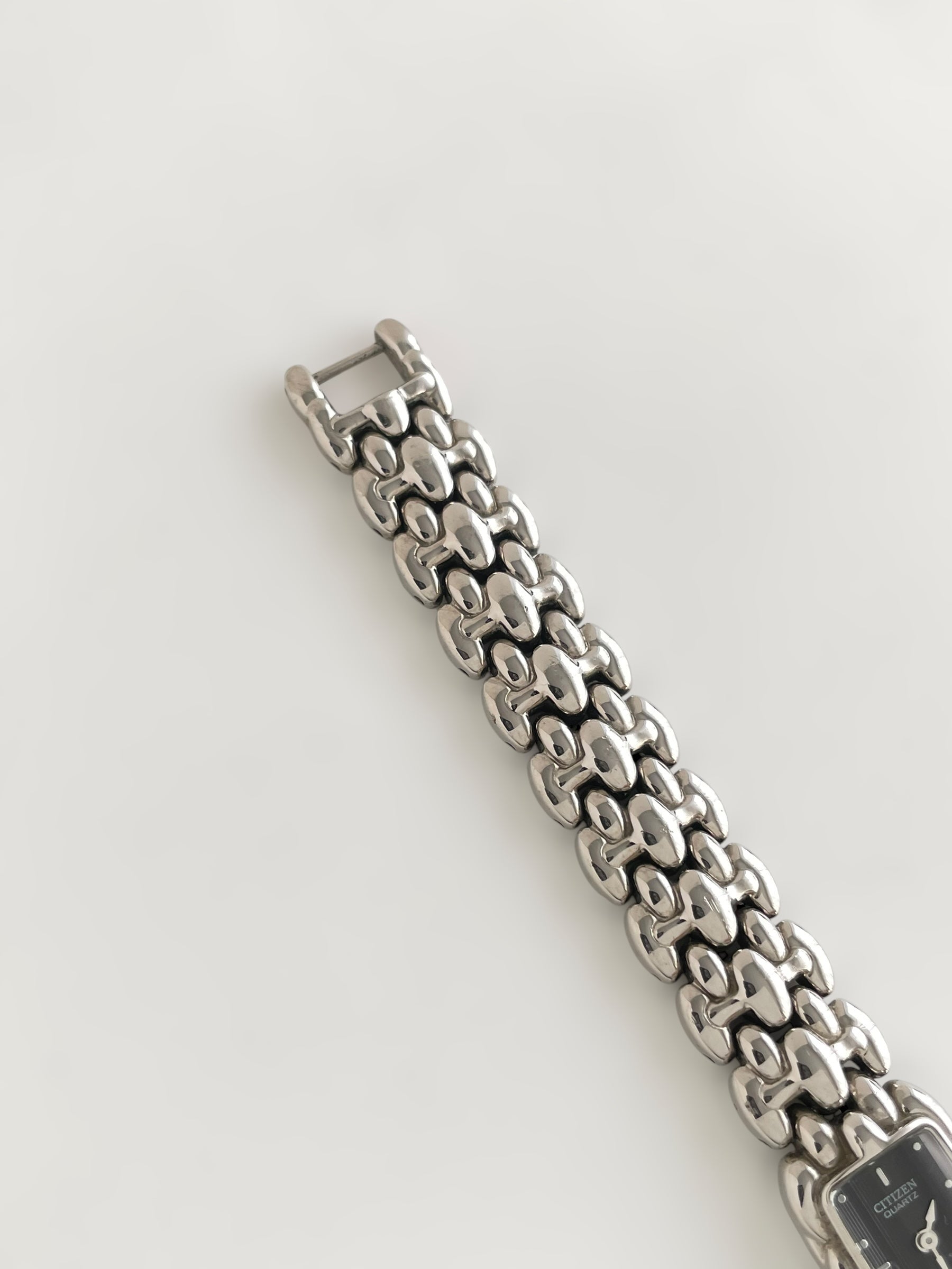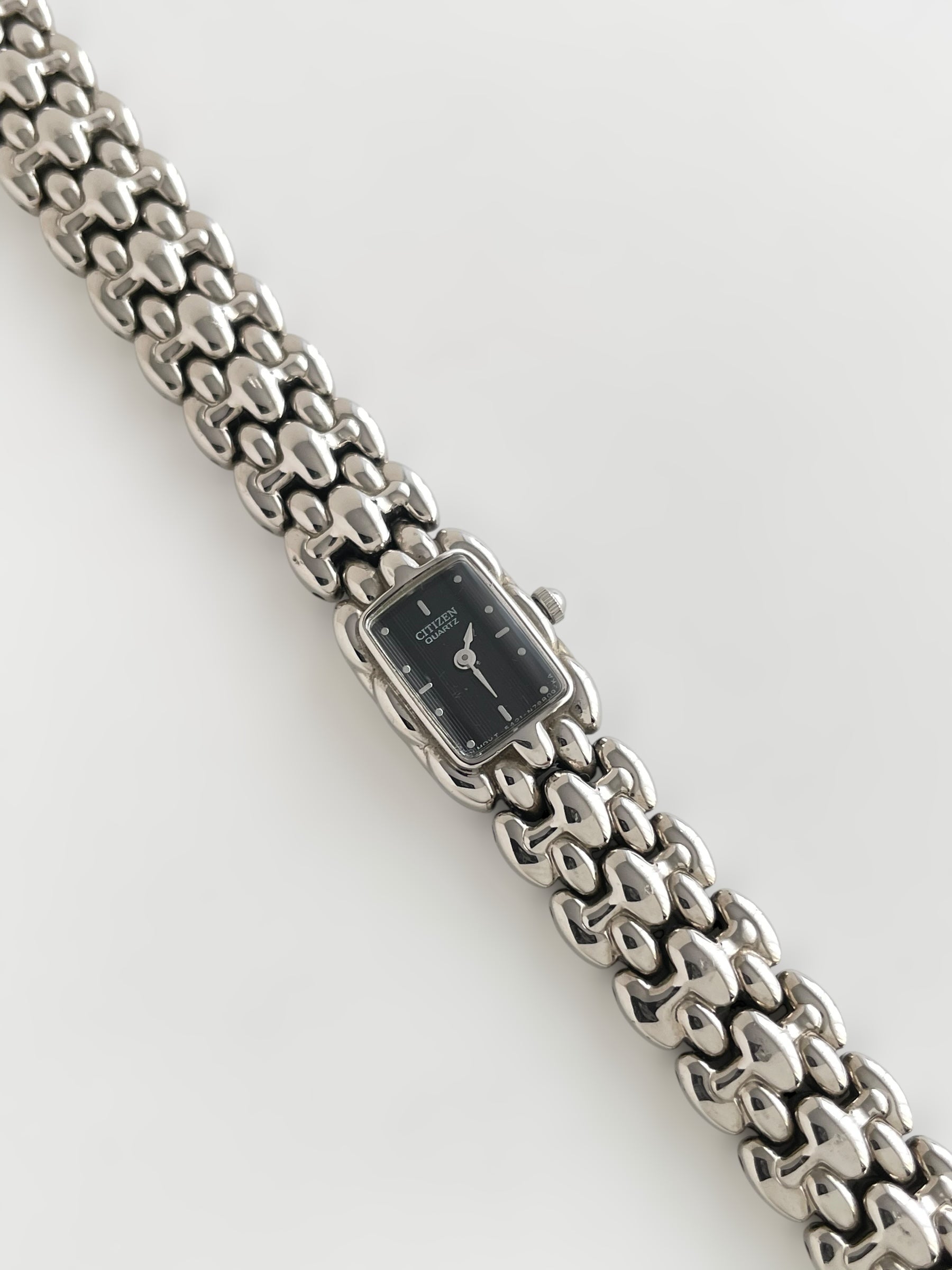 Gorgeous vintage and silver tone Citizen watch with a unique bracelet design and a petite case adorned with a black dial. Bracelet clasp closure.