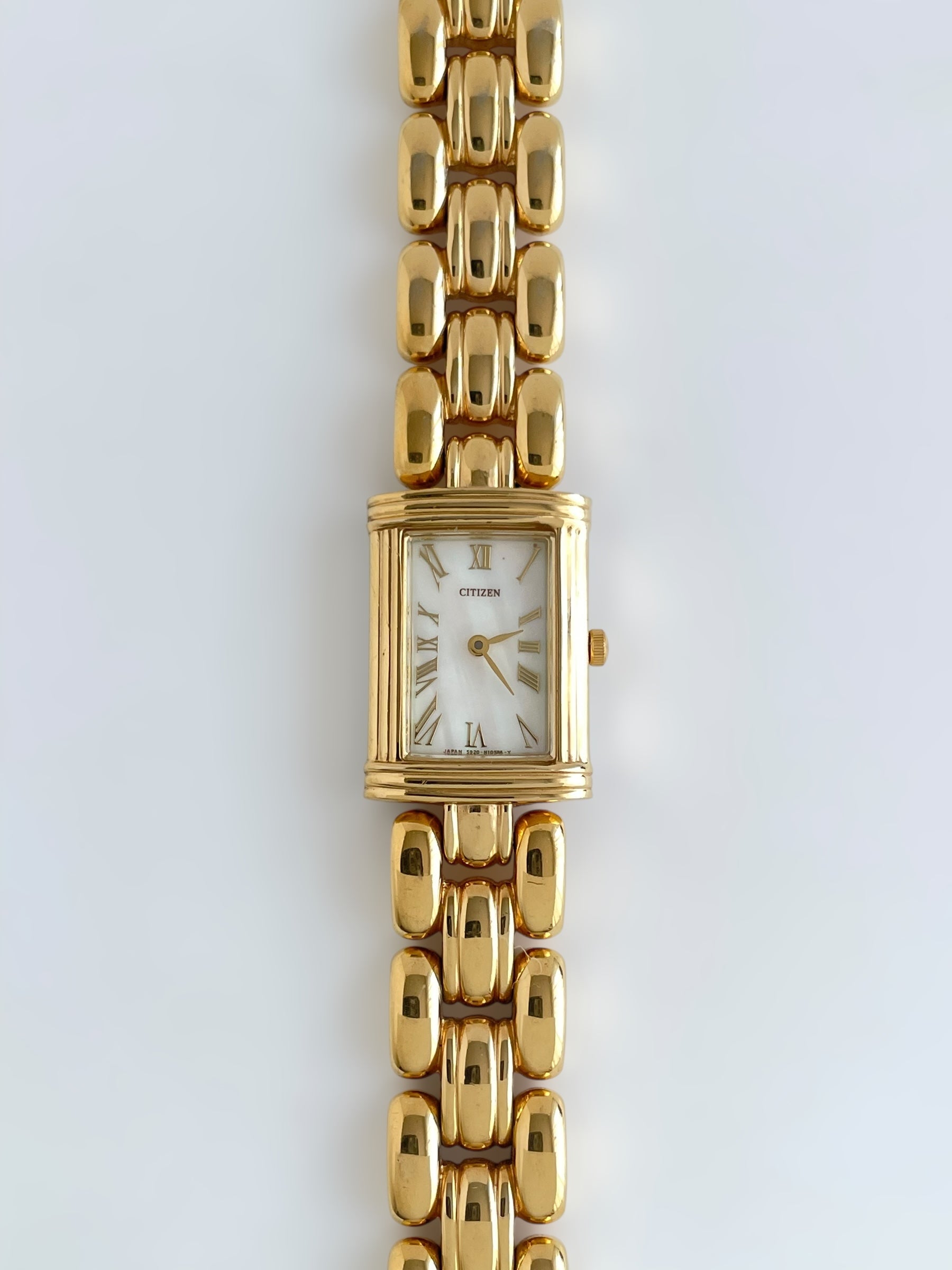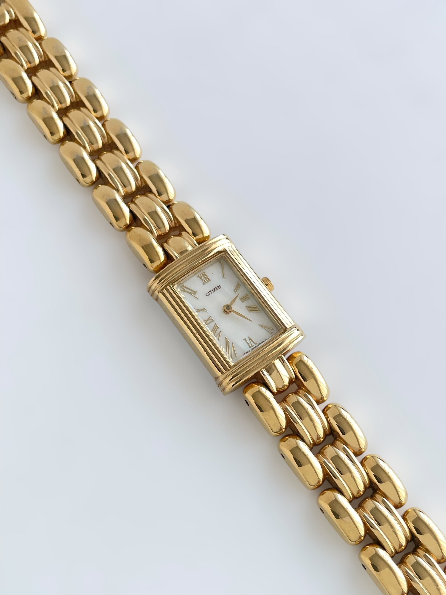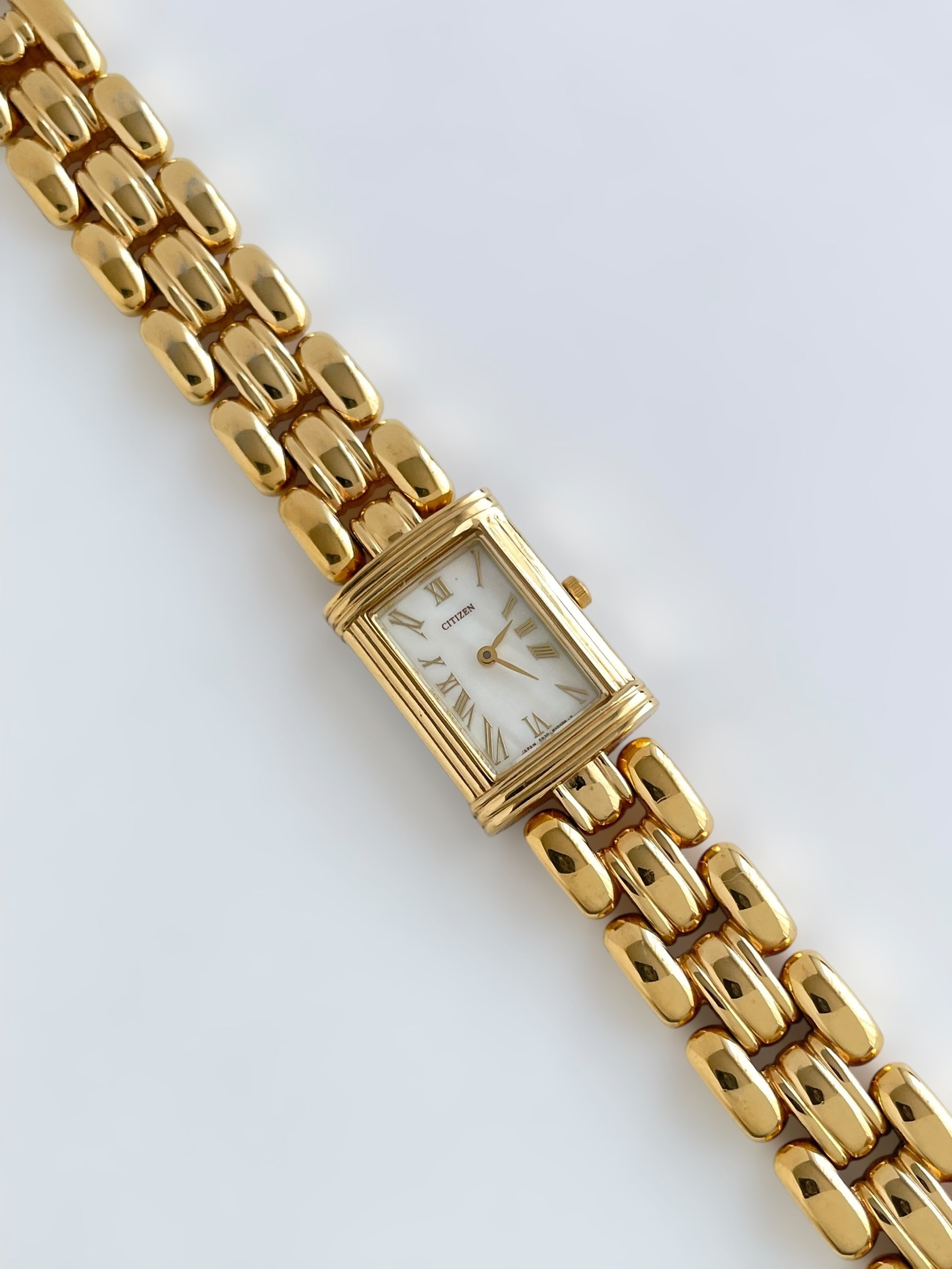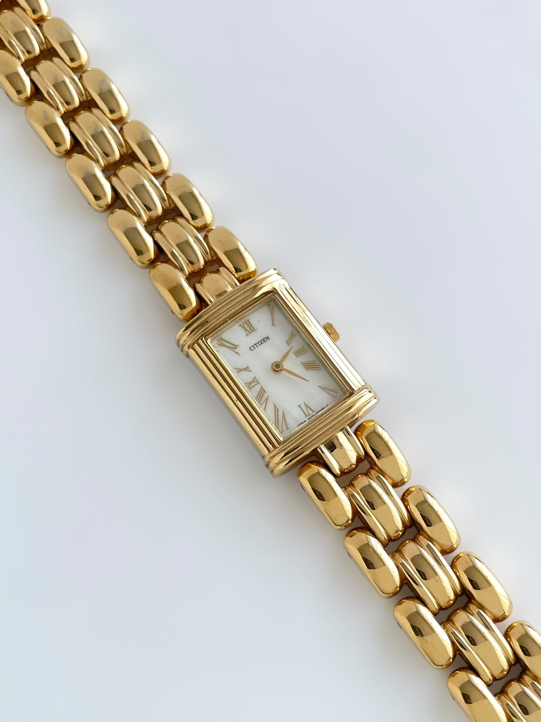 Gorgeous vintage and gold plated Citizen watch with a beautiful bracelet design and a tank case adorned with a mother of pearl face. Bracelet clasp closure.