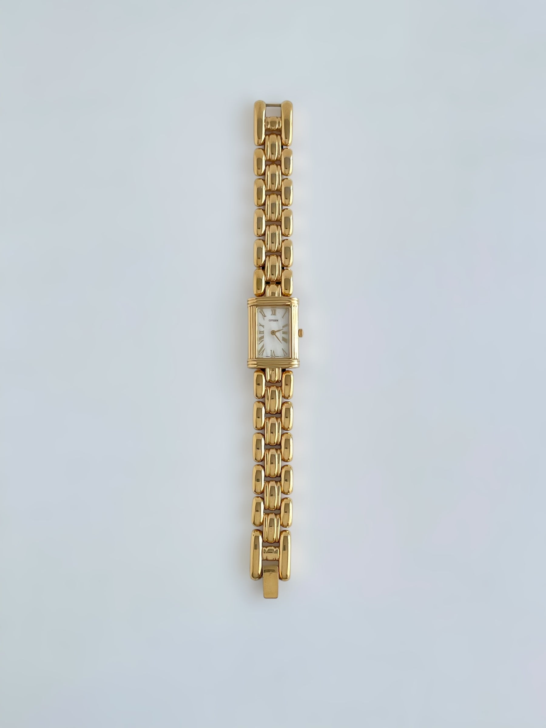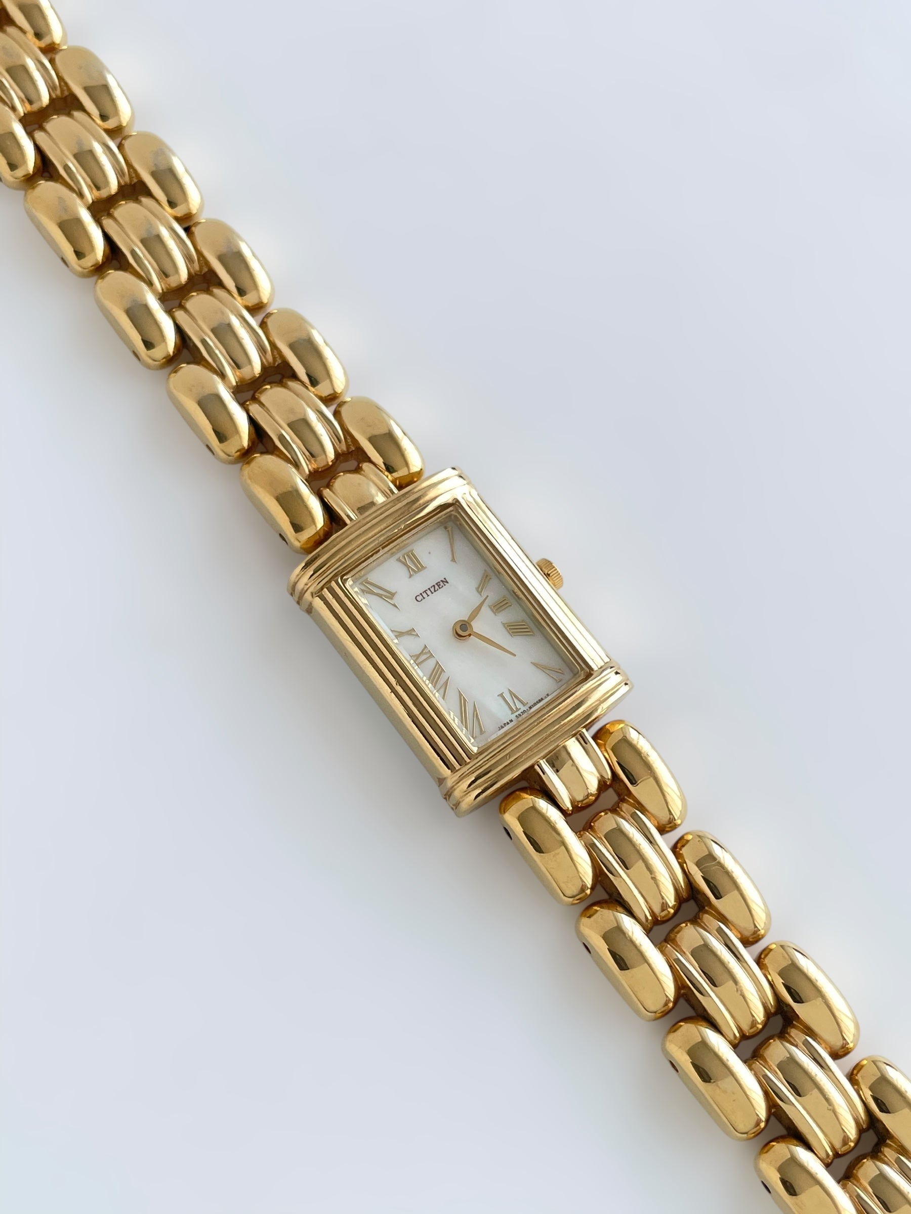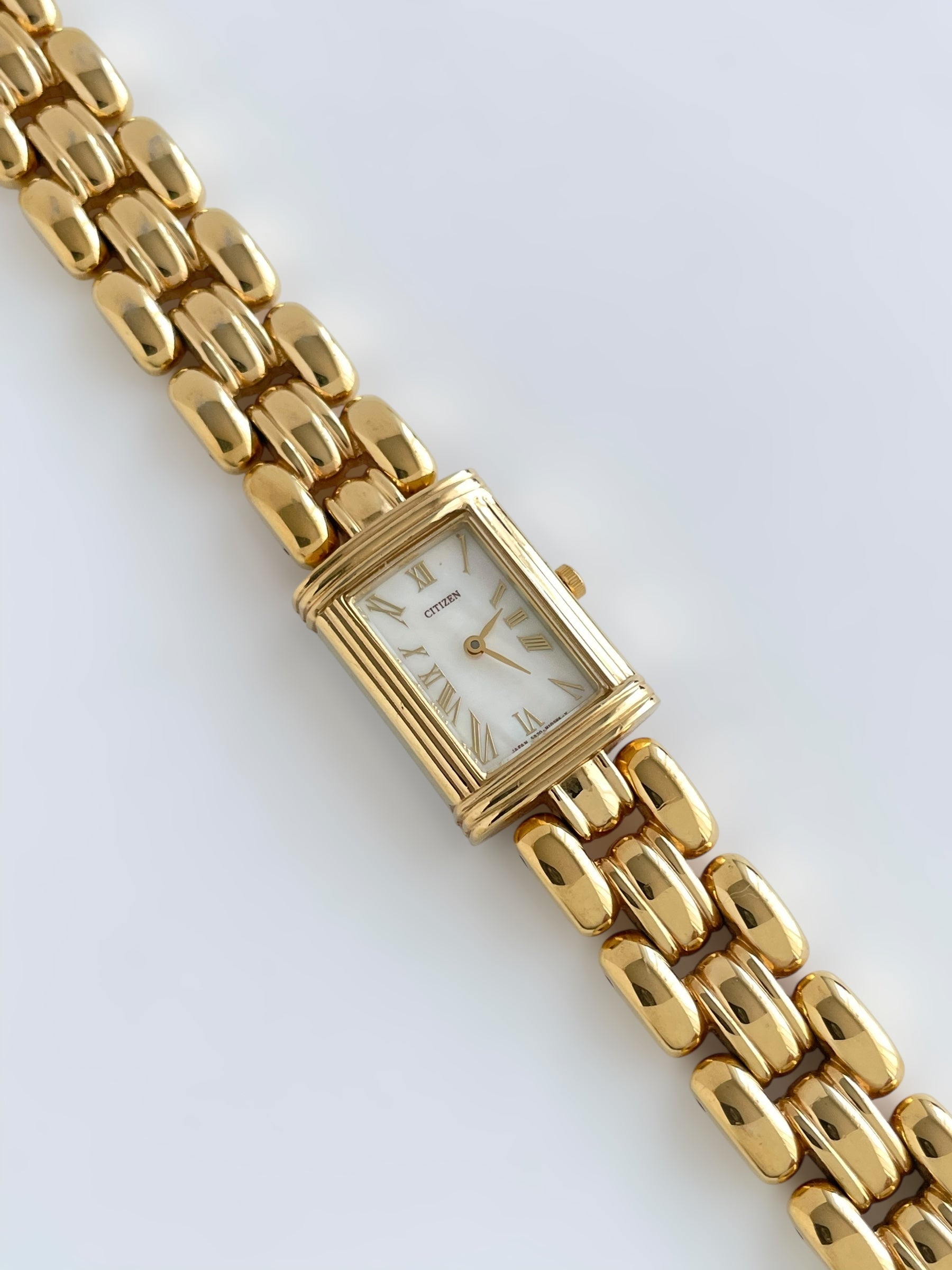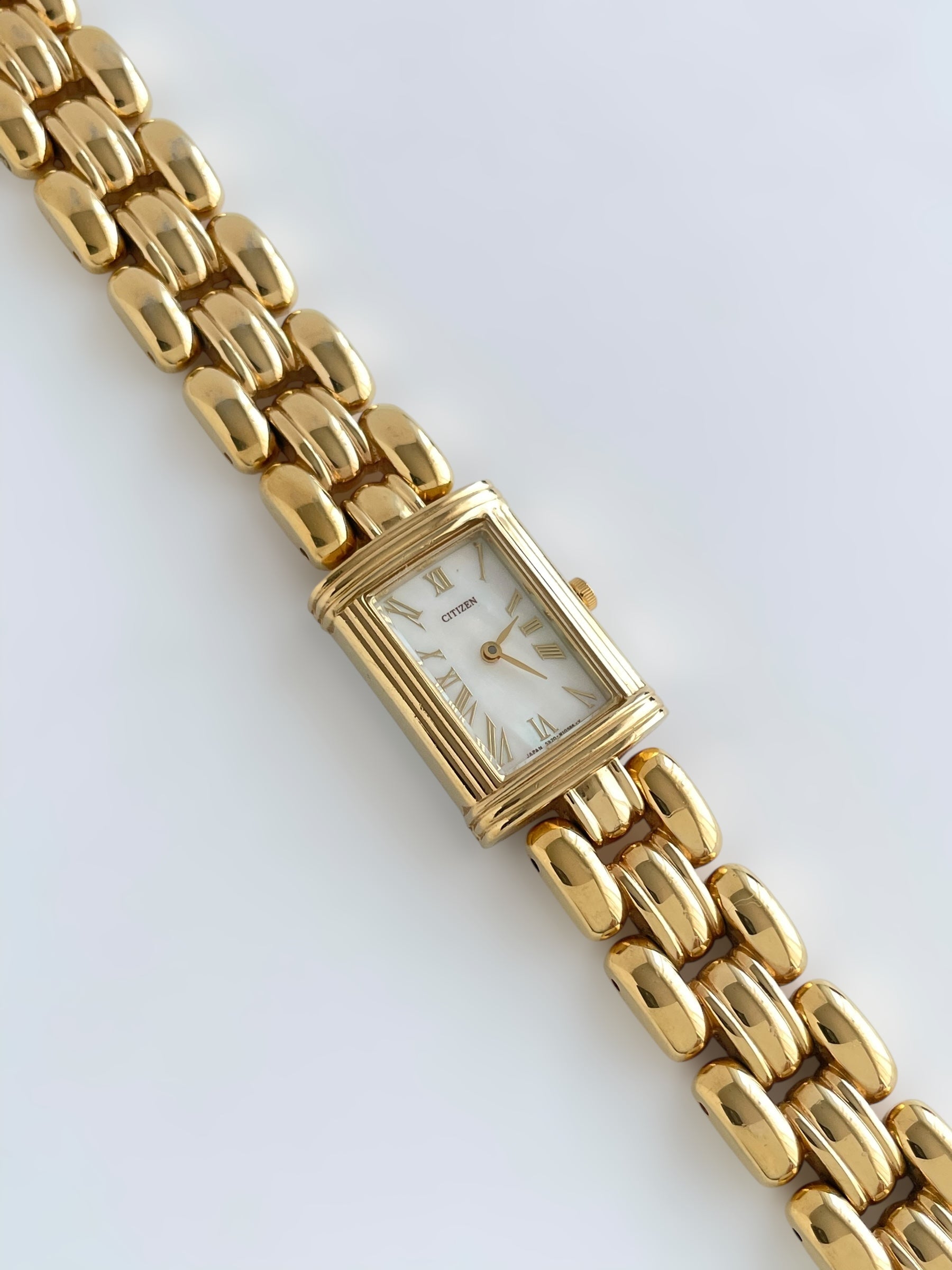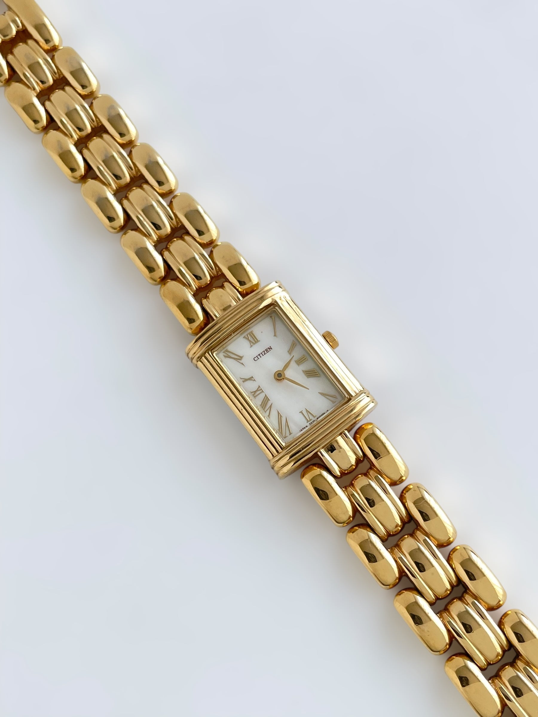 Gorgeous vintage and gold plated Citizen watch with a beautiful bracelet design and a tank case adorned with a mother of pearl face. Bracelet clasp closure.