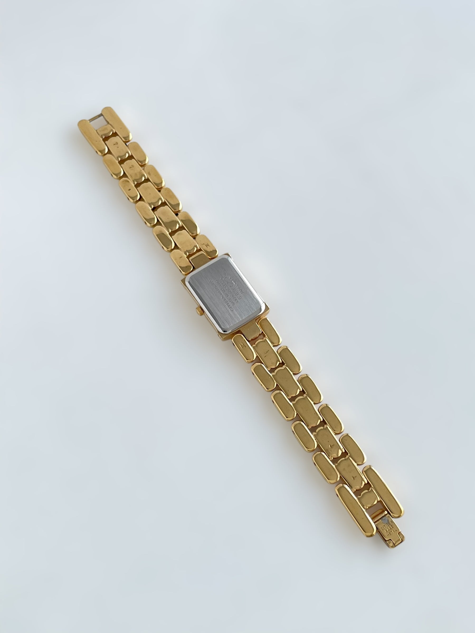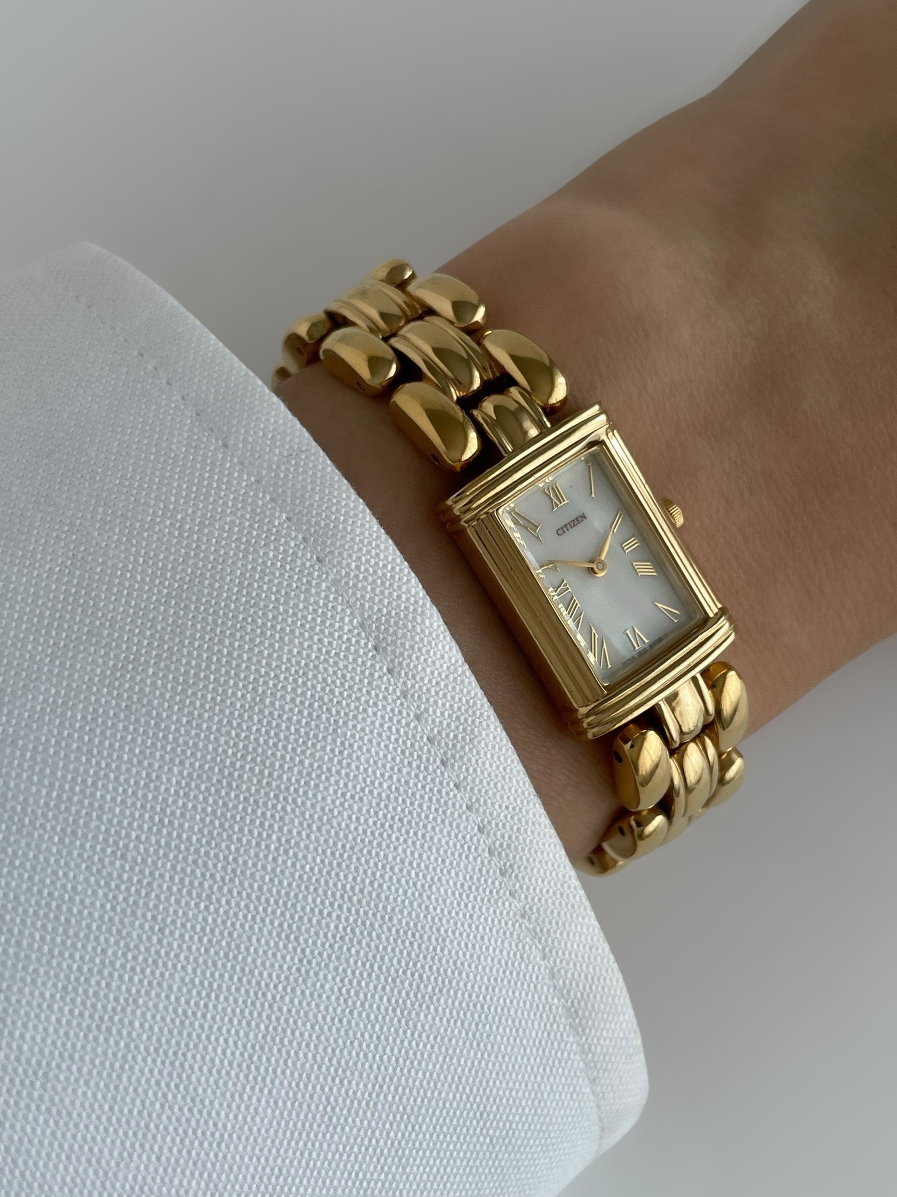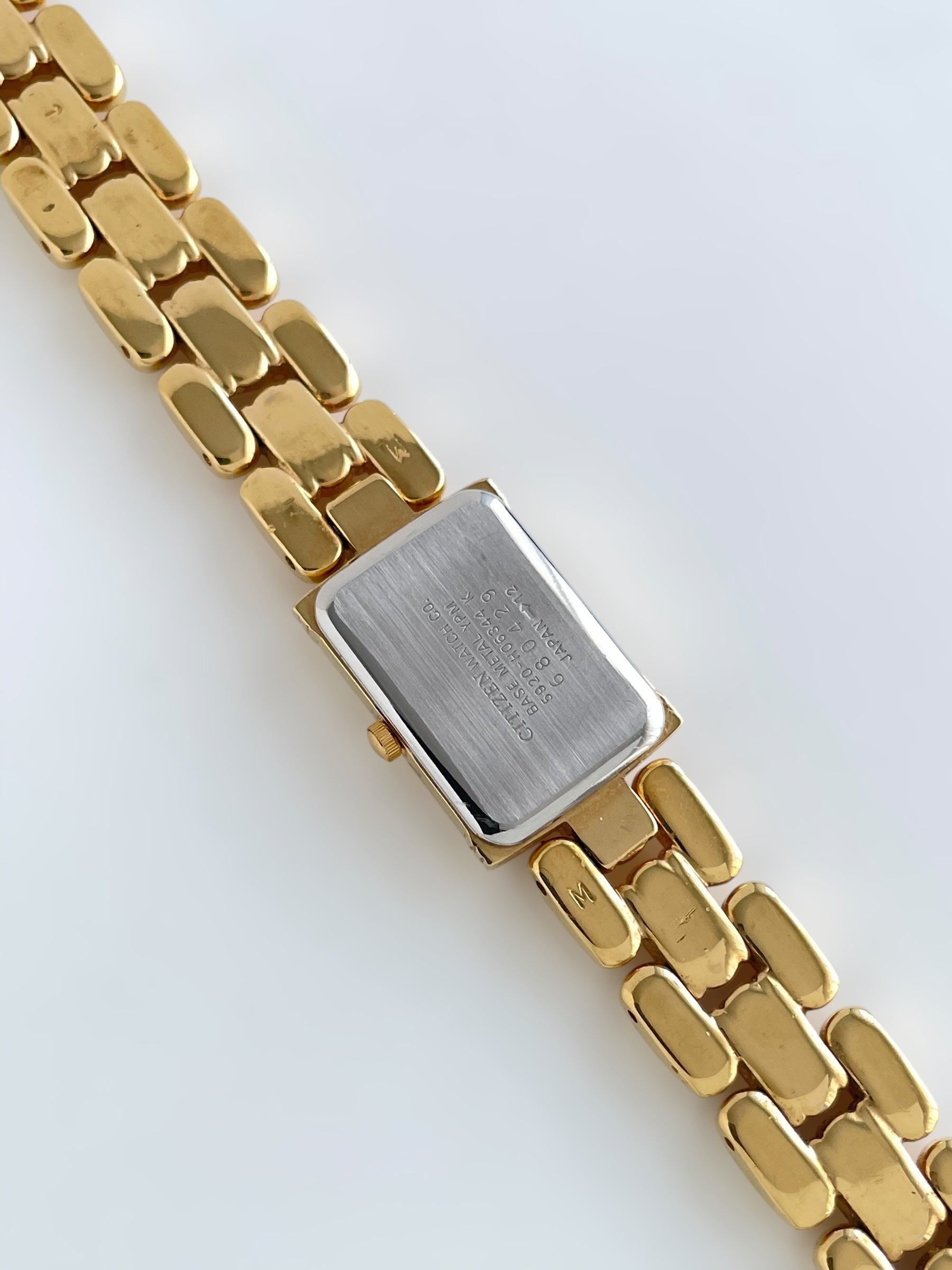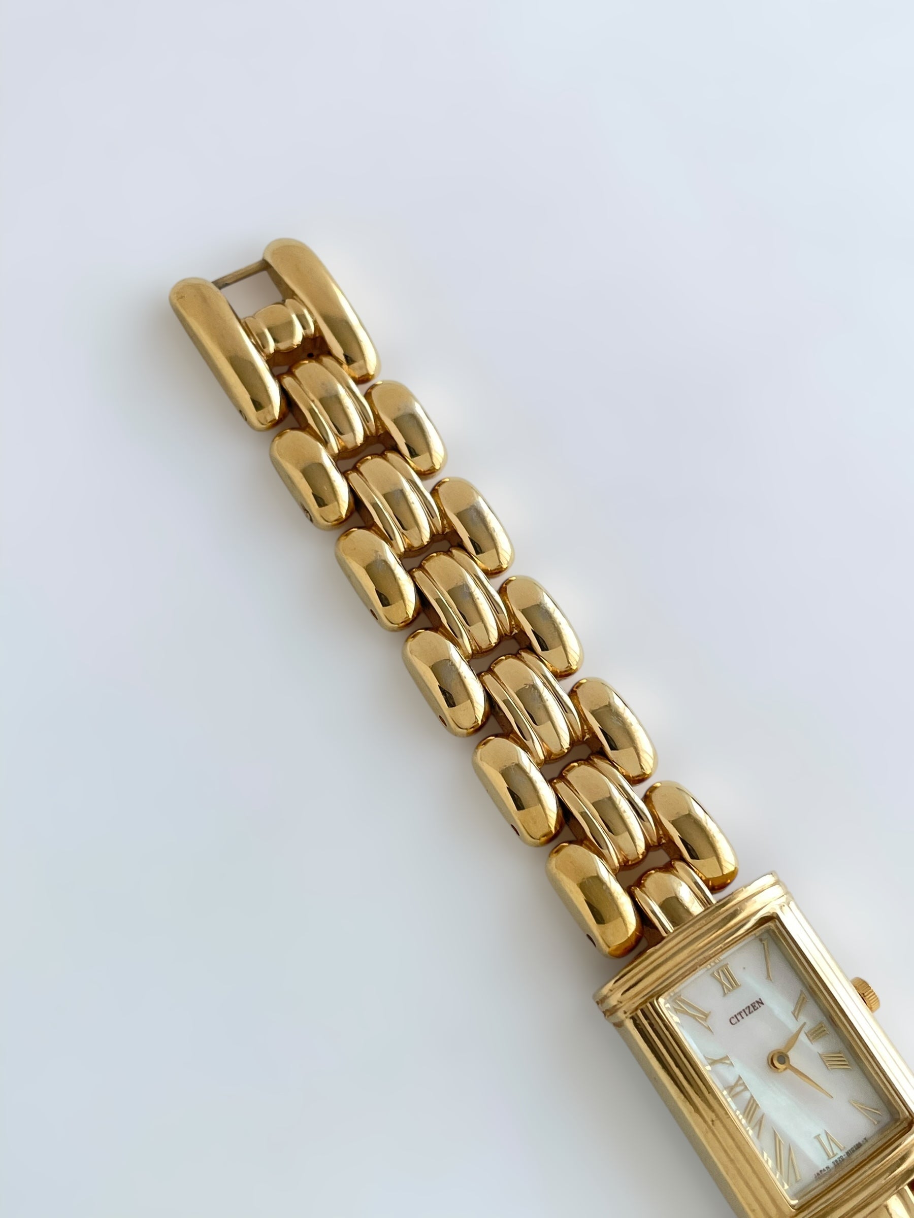 Gorgeous vintage and gold plated Citizen watch with a beautiful bracelet design and a tank case adorned with a mother of pearl face. Bracelet clasp closure.
