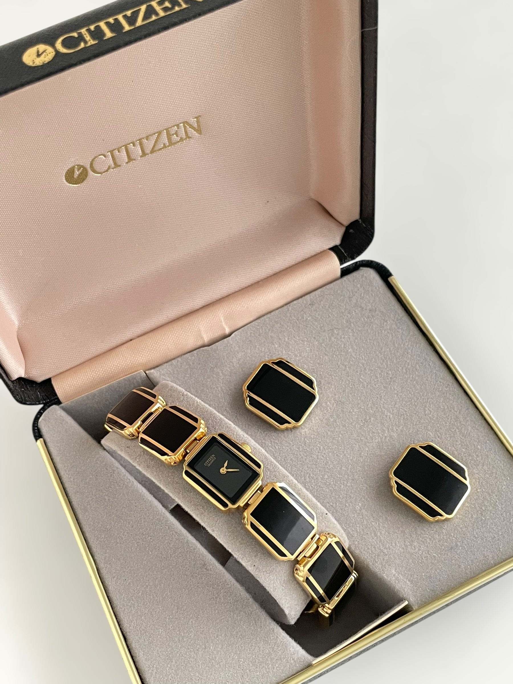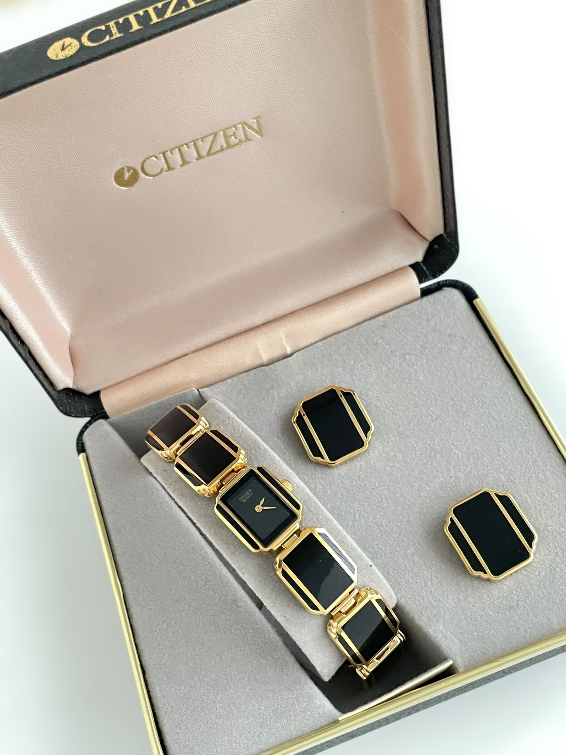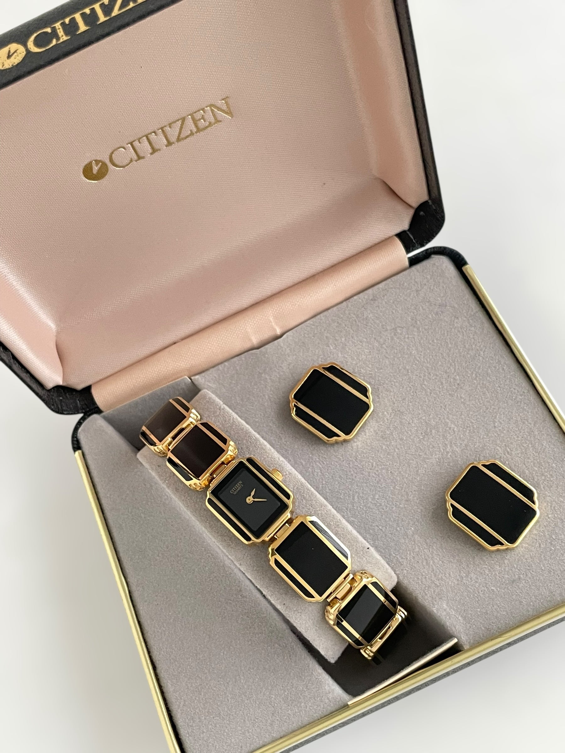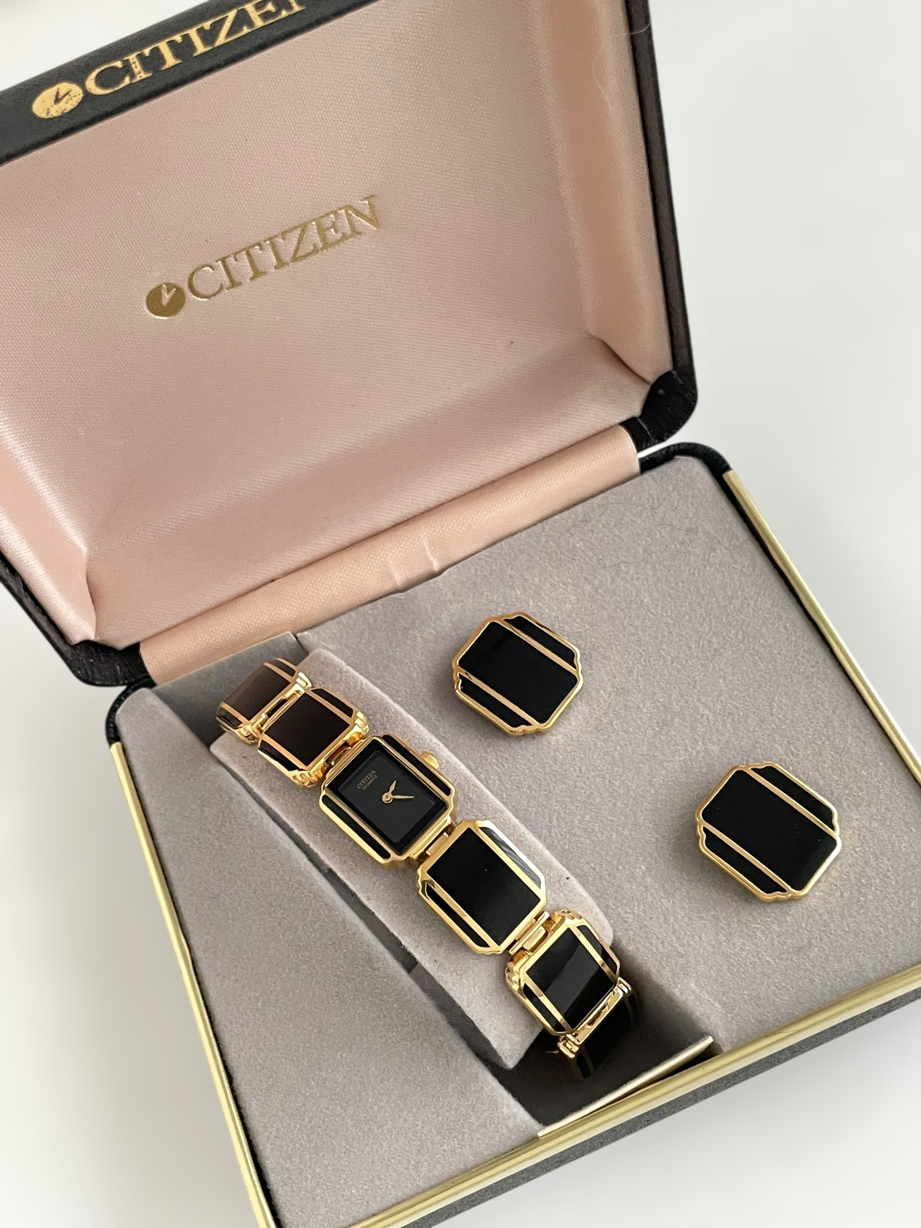 Incredible vintage and gold plated very rare Citizen watch and earring set with a gorgeous bracelet design and a petite case on the watch. Bracelet clasp closure.