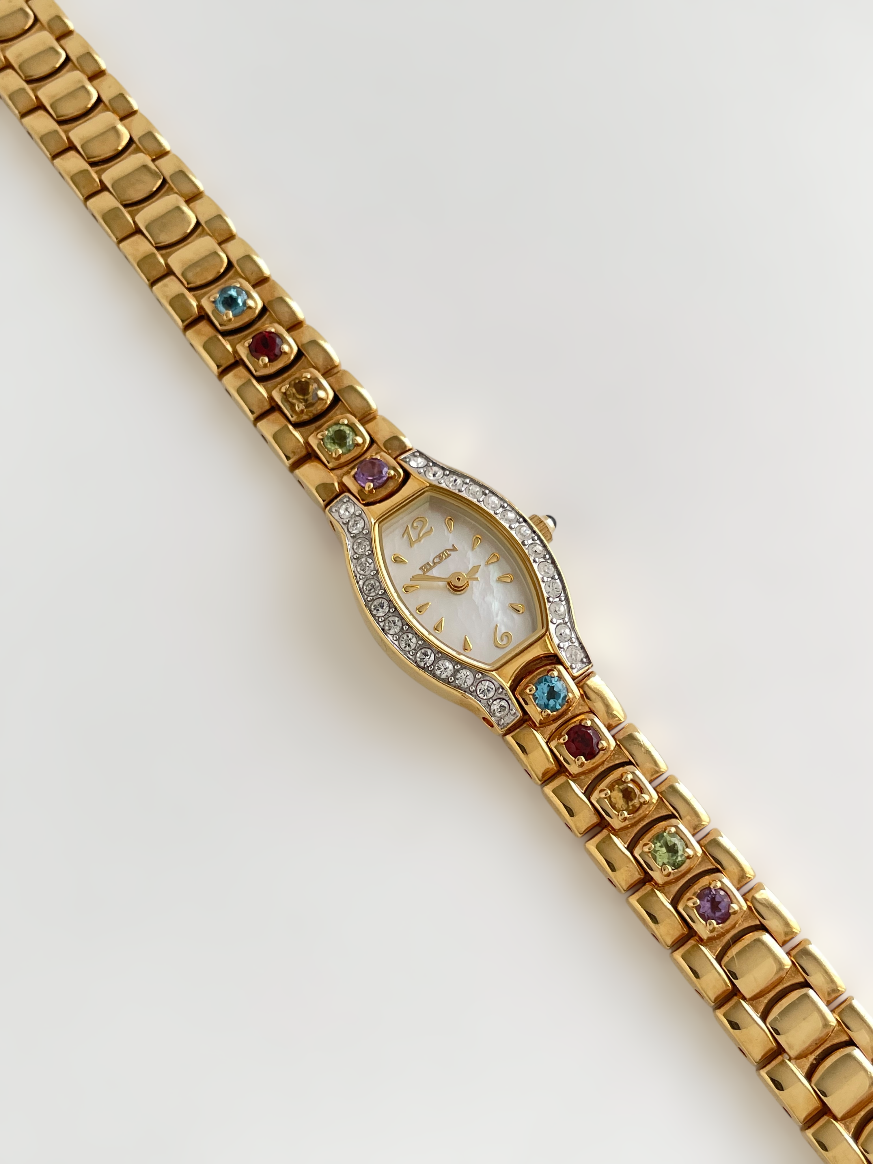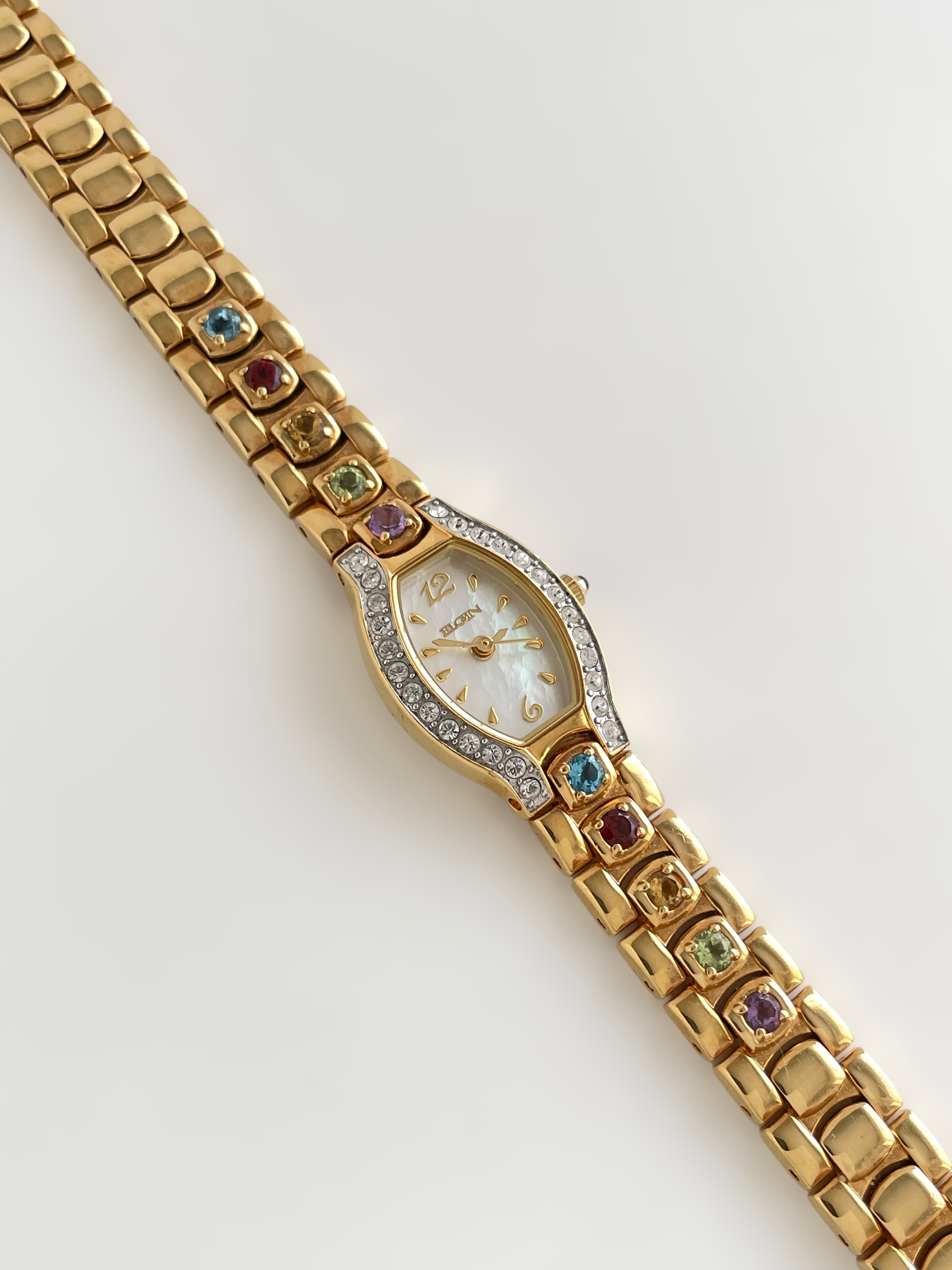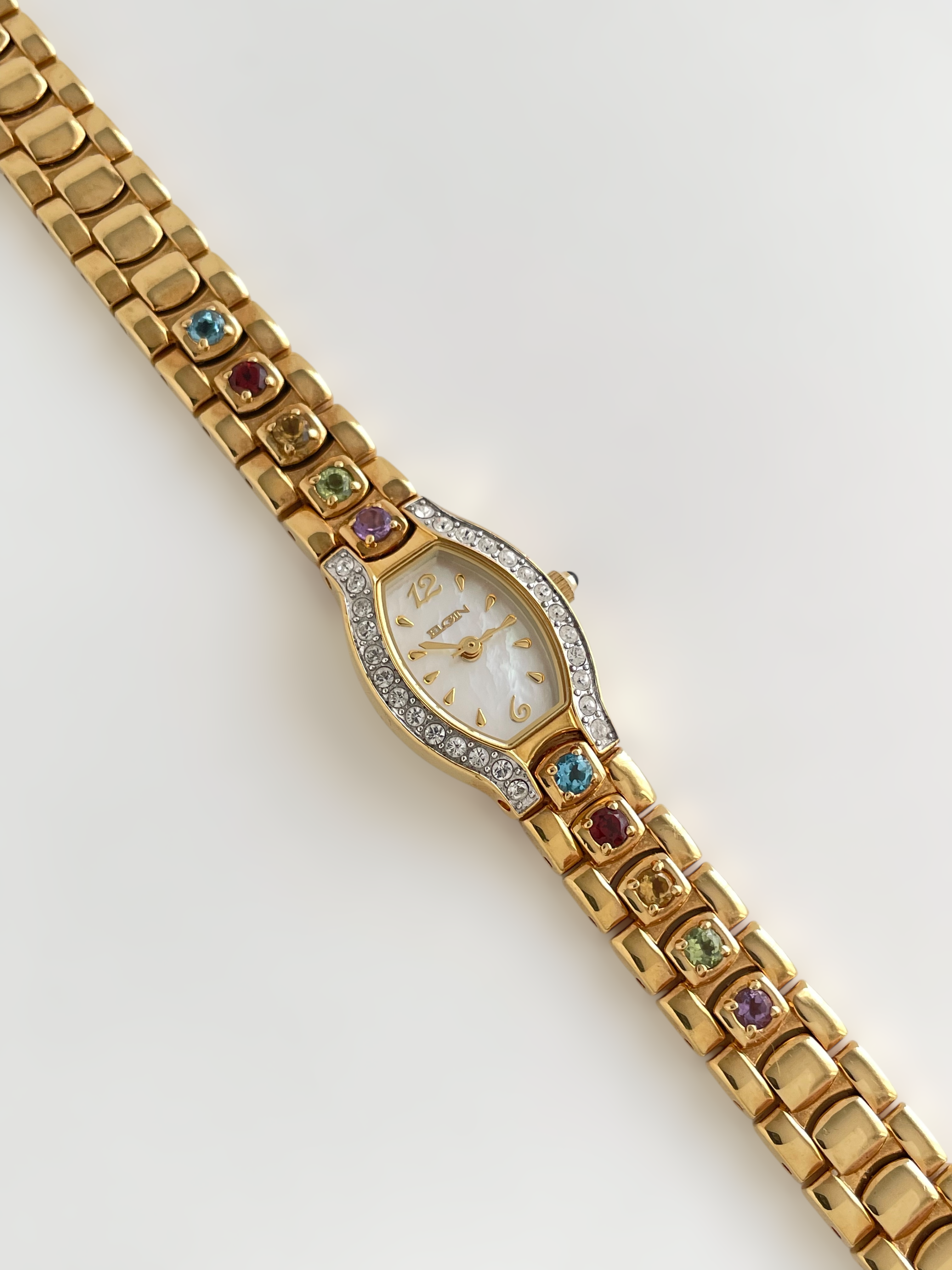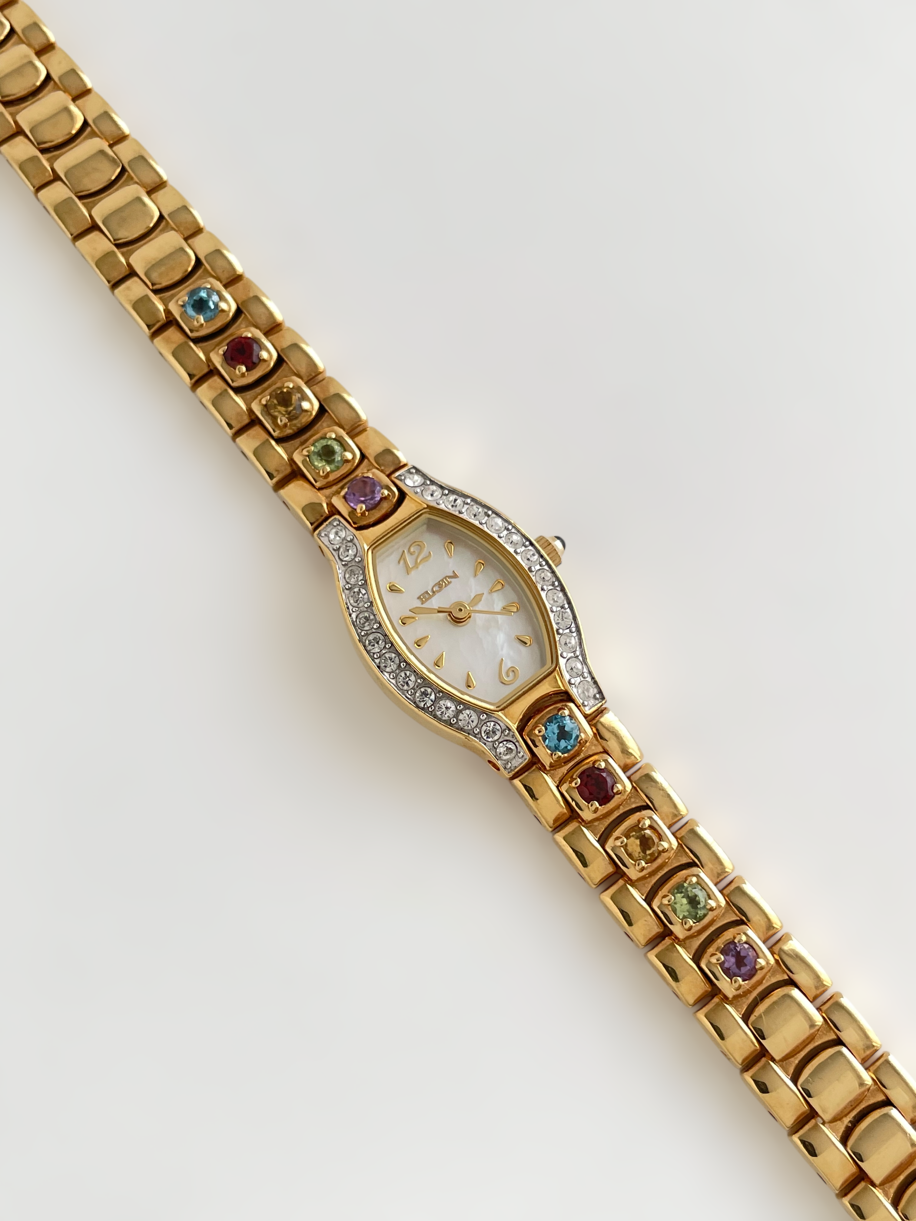 Beautiful vintage and gold plated Elgin watch with a unique bracelet design adorned with stones and a face adorned with mother of pearl. Bracelet clasp closure.