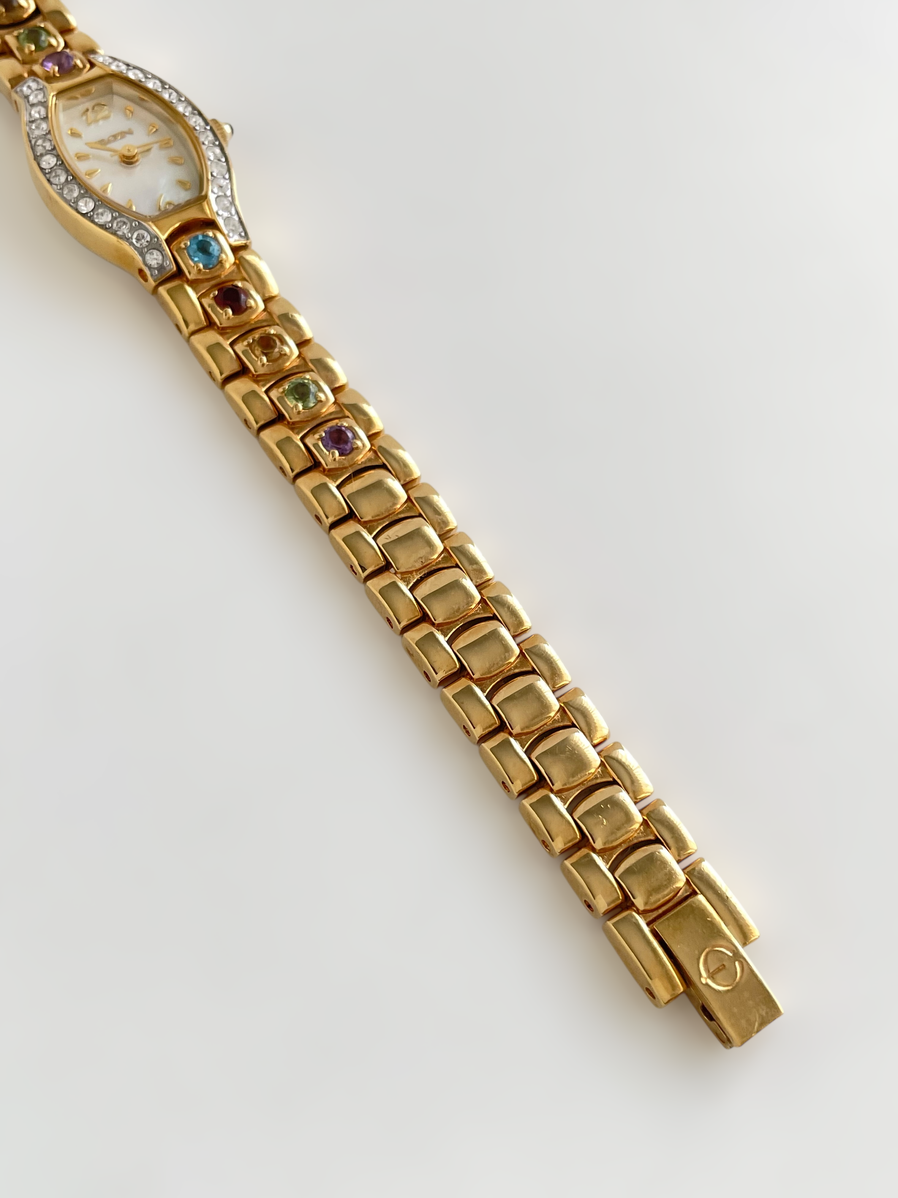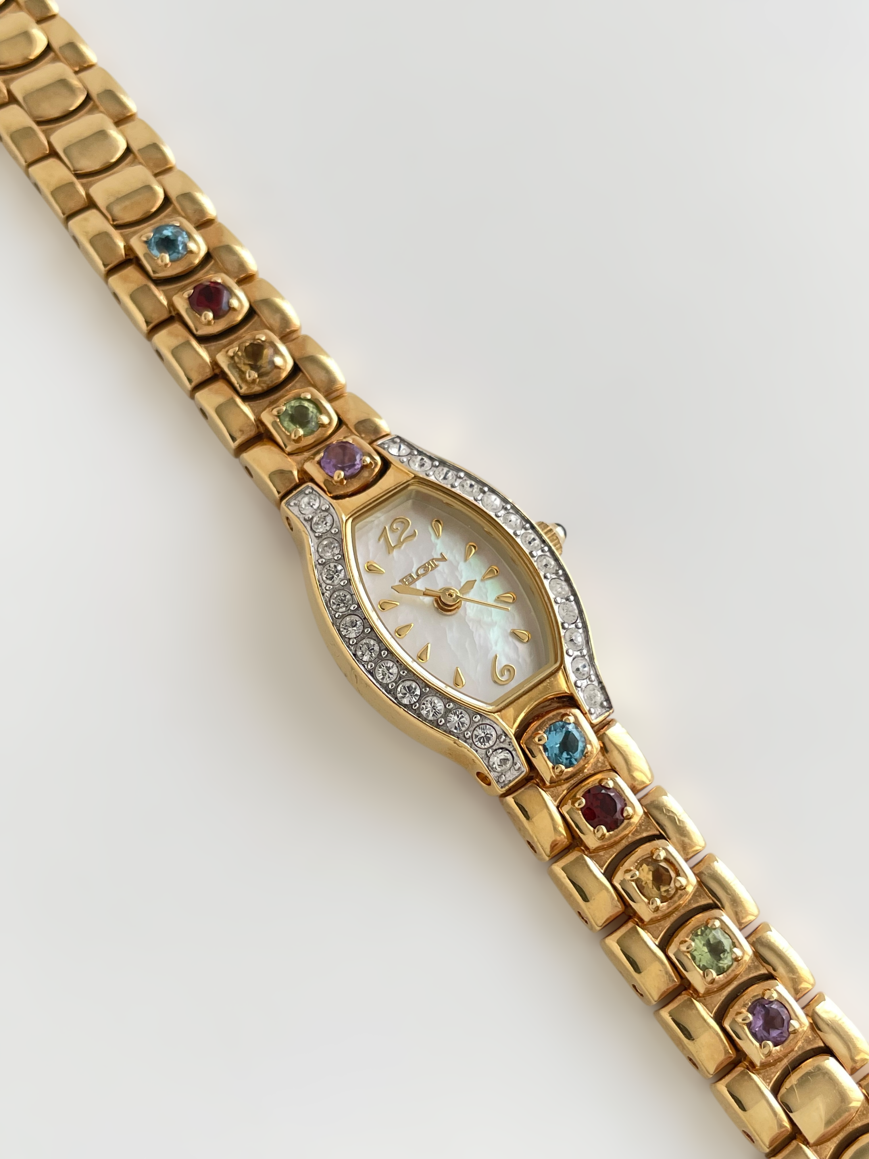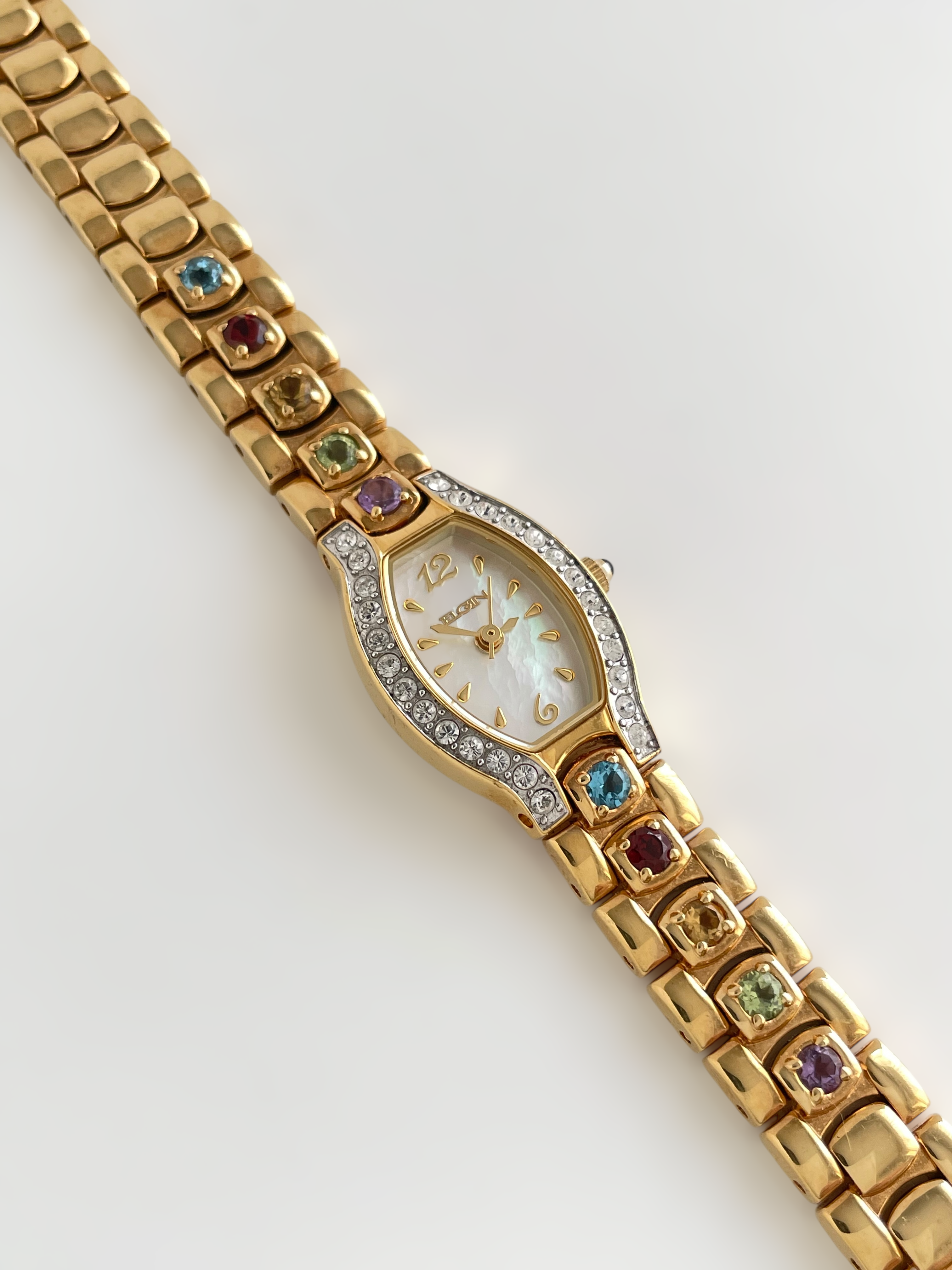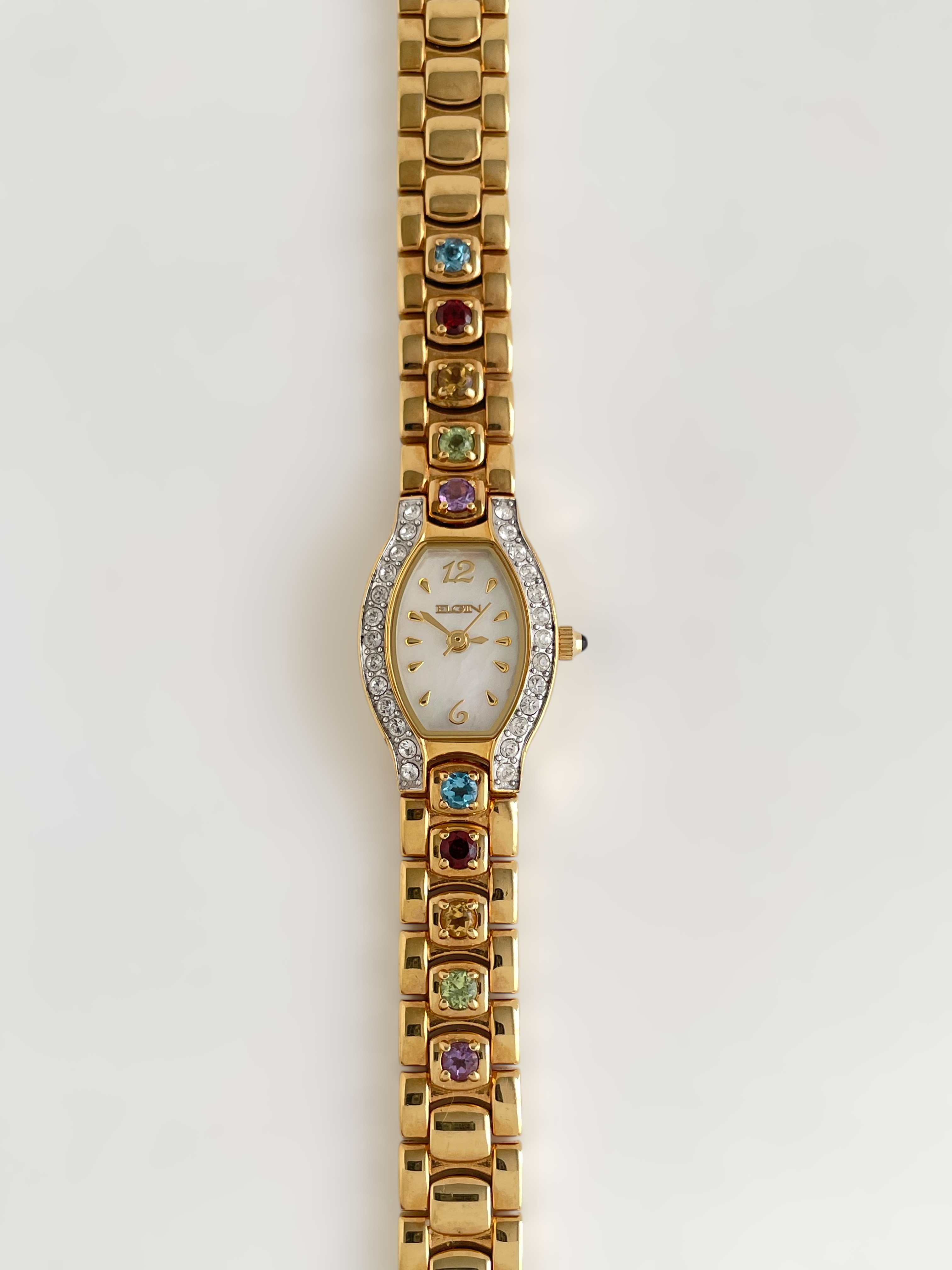 Beautiful vintage and gold plated Elgin watch with a unique bracelet design adorned with stones and a face adorned with mother of pearl. Bracelet clasp closure.