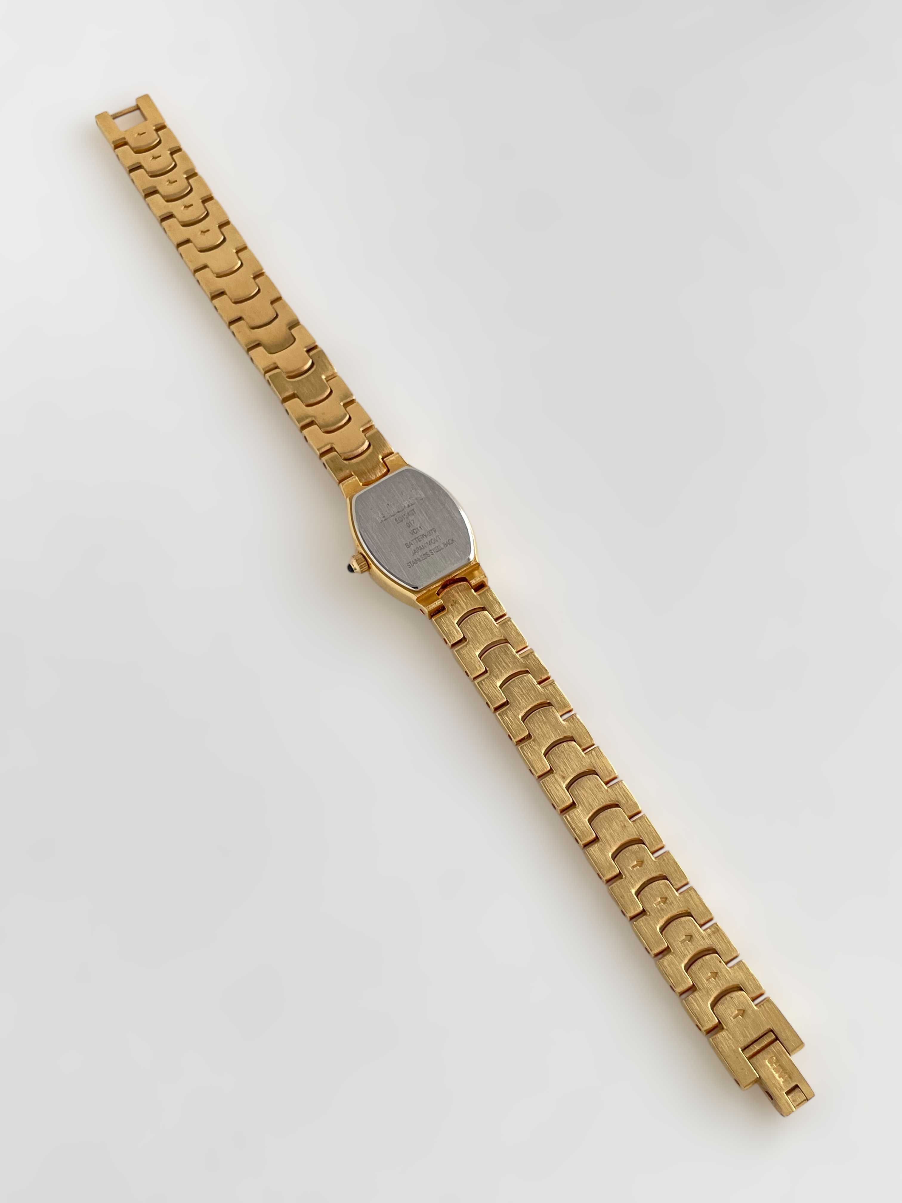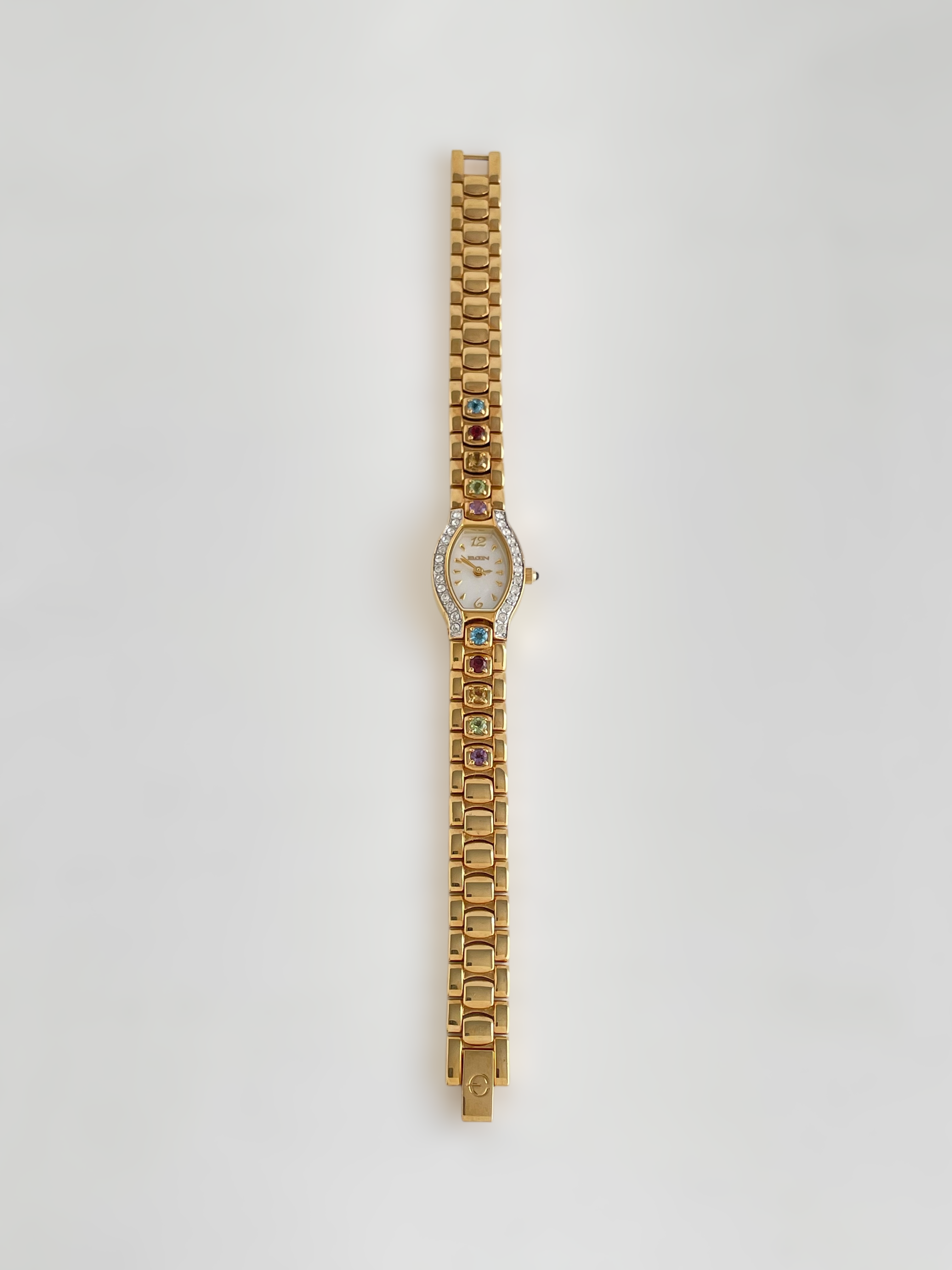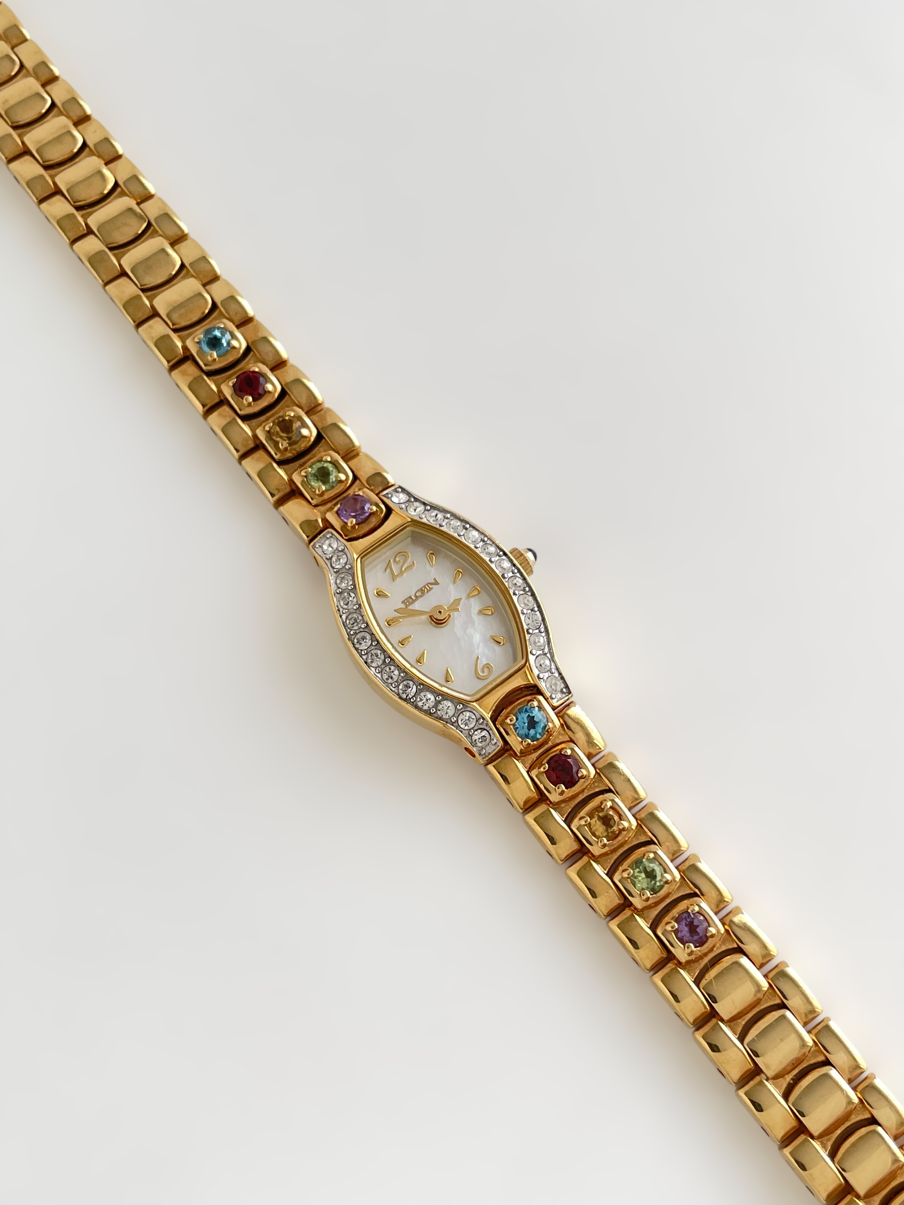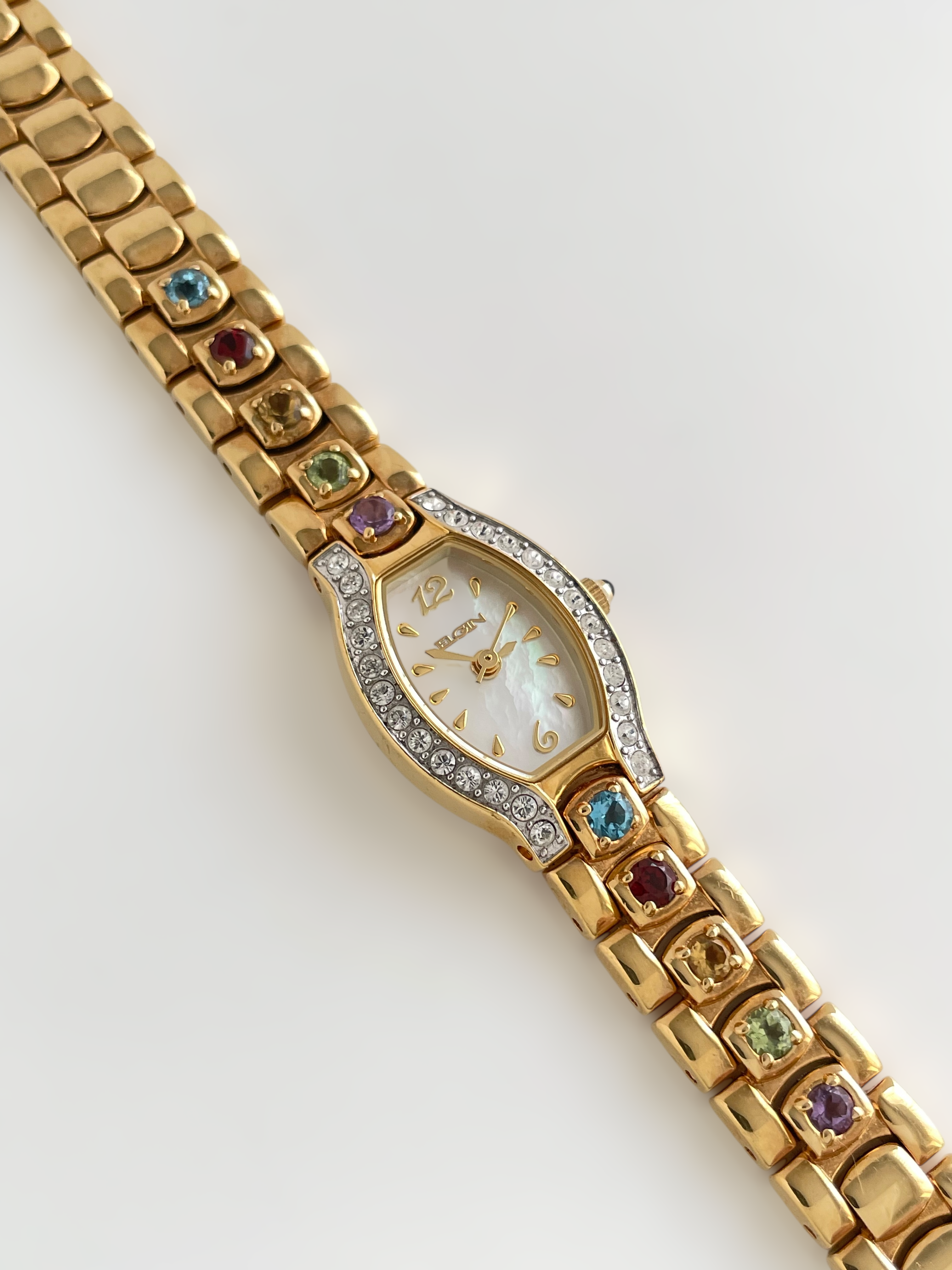 Beautiful vintage and gold plated Elgin watch with a unique bracelet design adorned with stones and a face adorned with mother of pearl. Bracelet clasp closure.