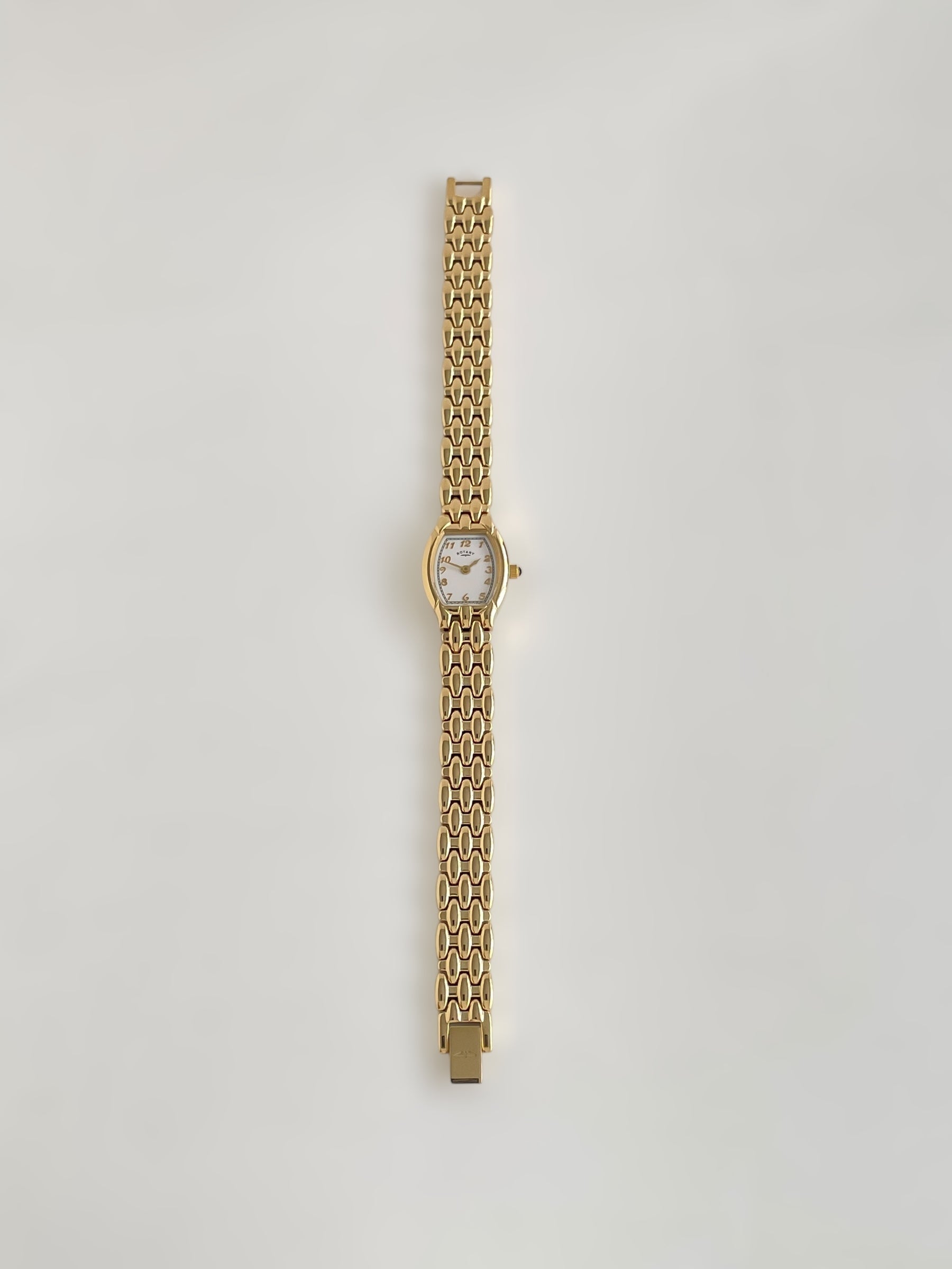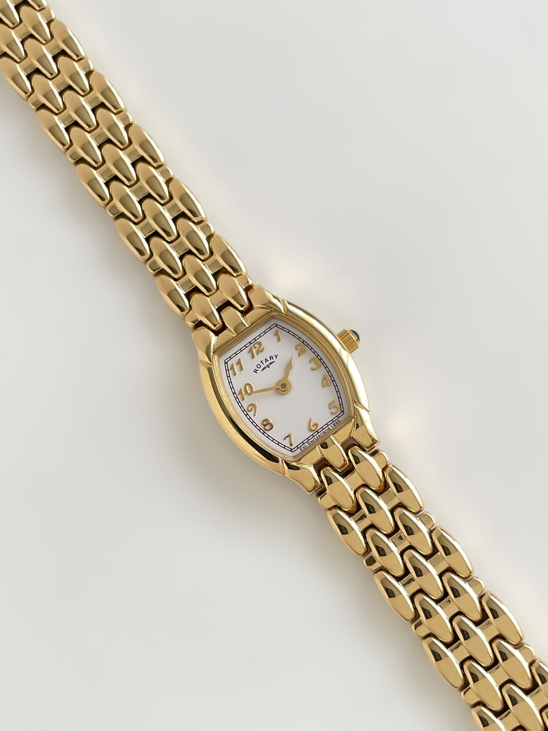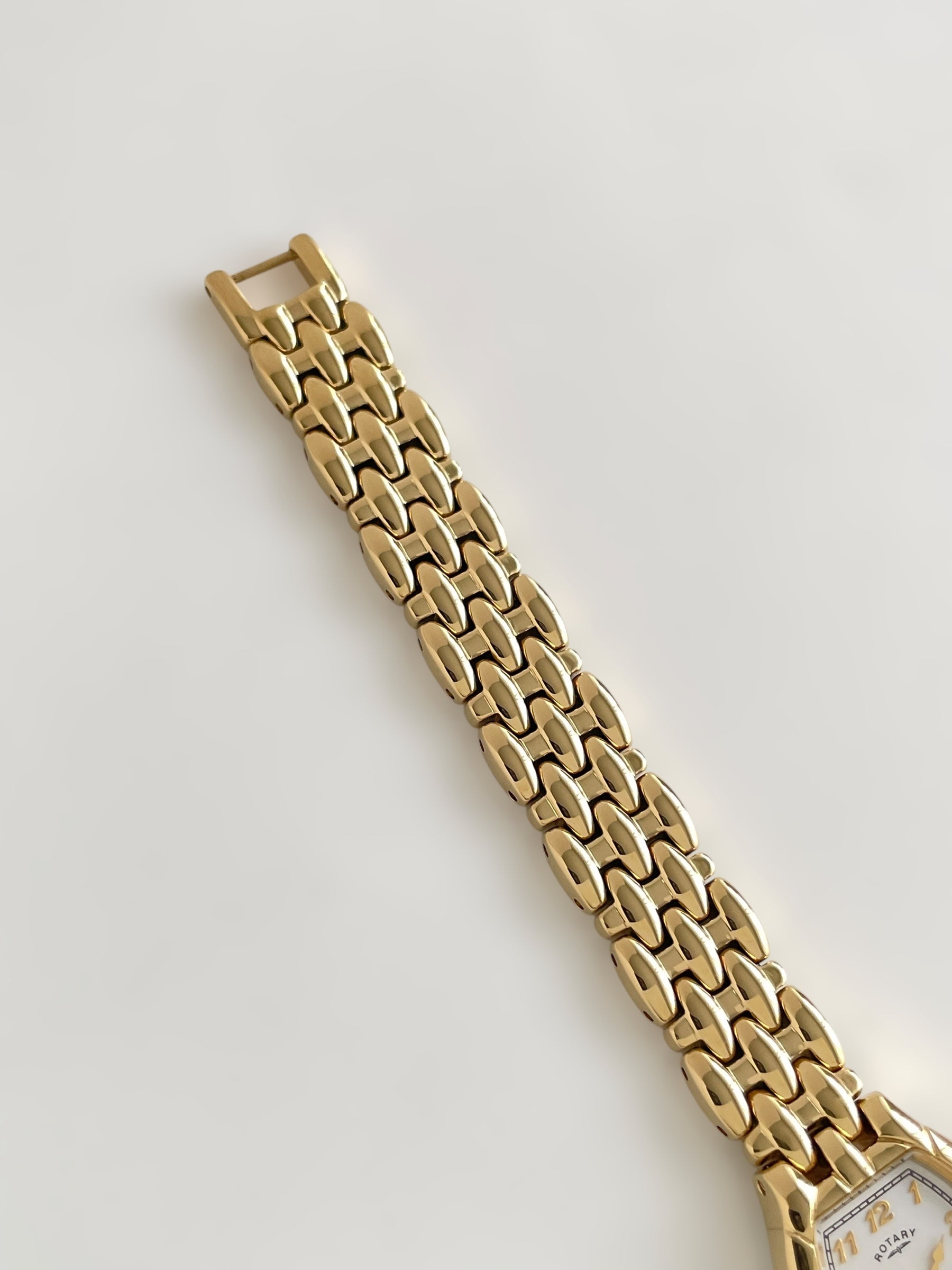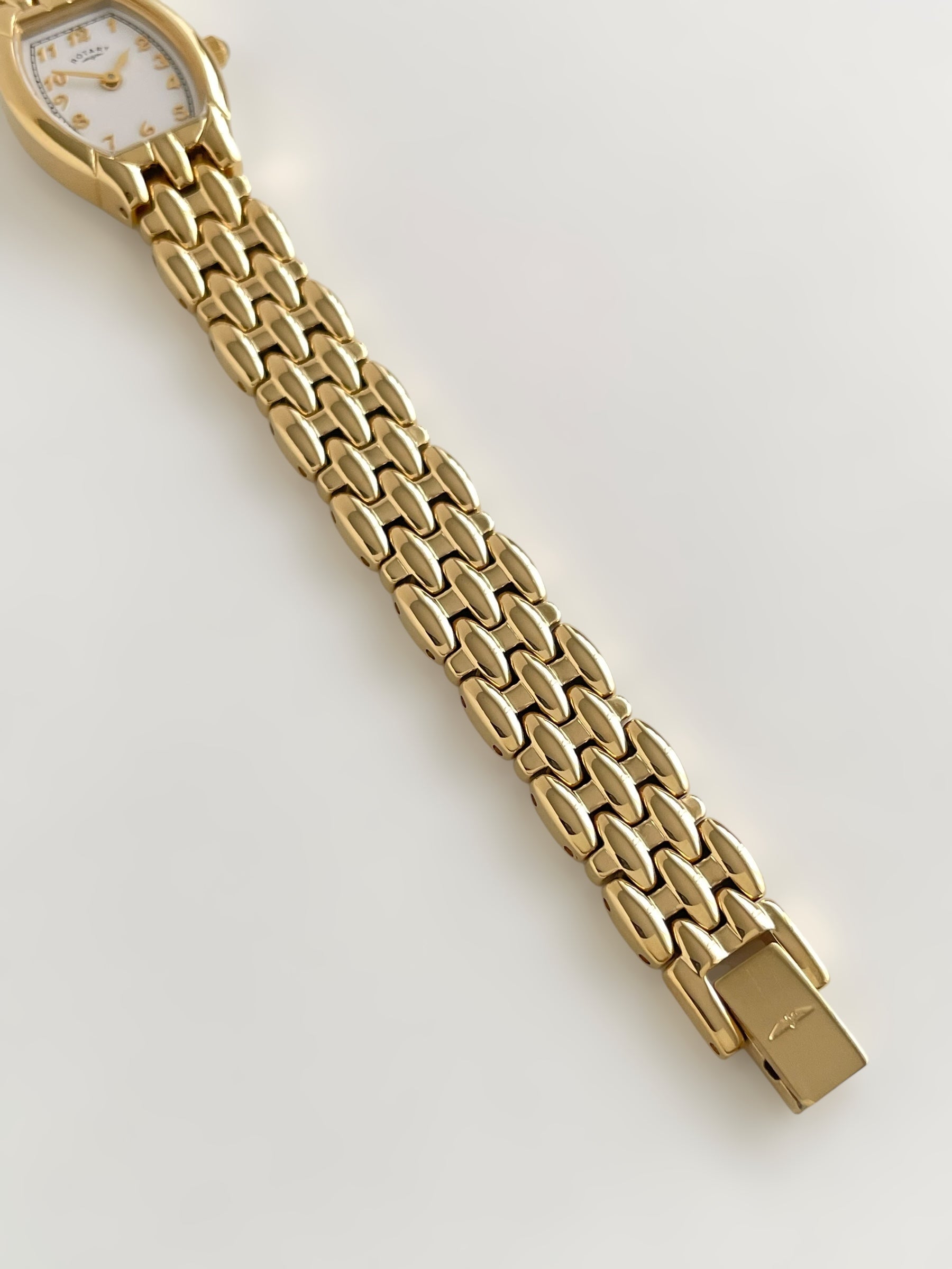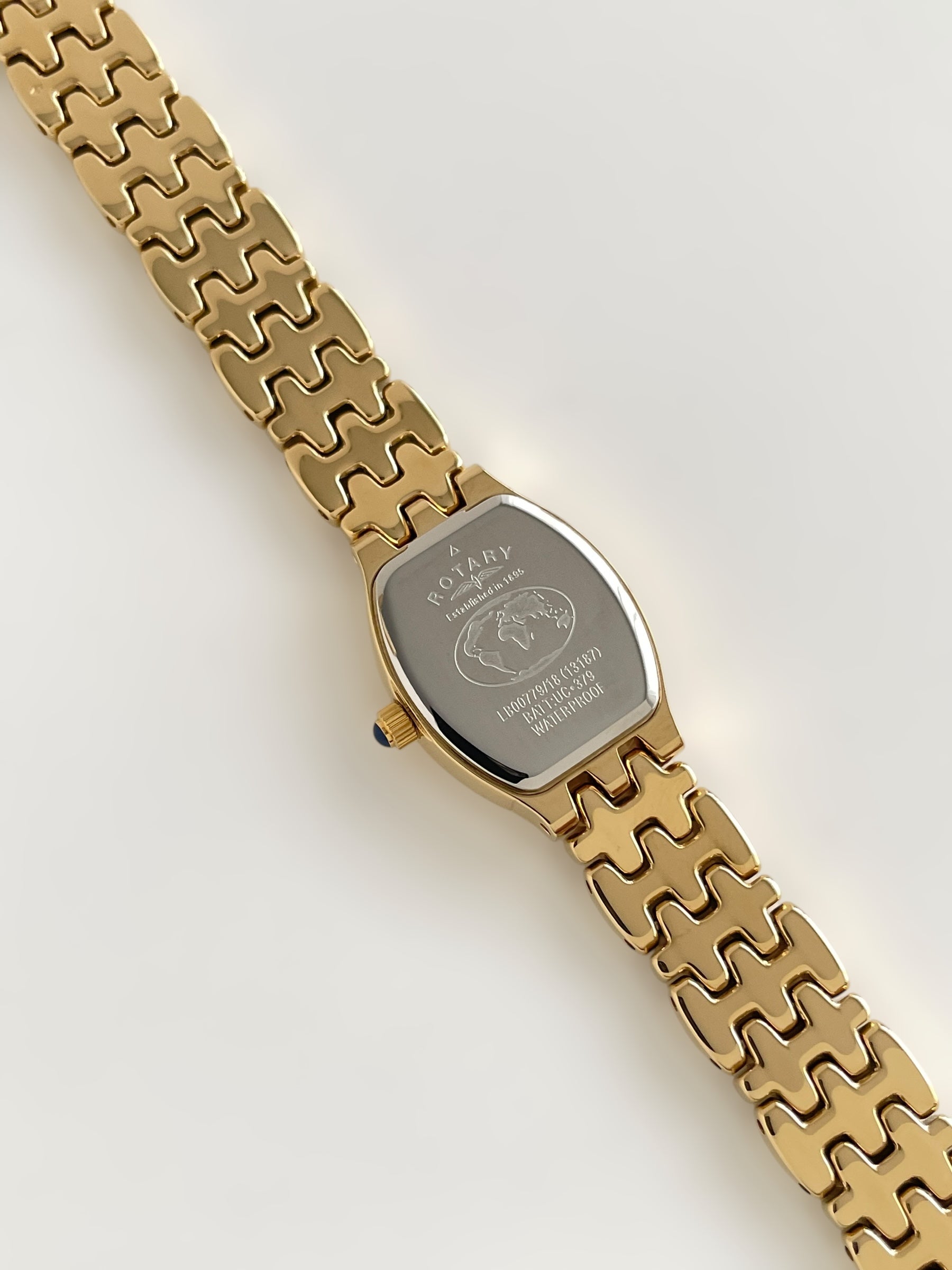 Gorgeous vintage and gold plated Rotary watch with a beautiful bracelet design and a unique case. Bracelet clasp closure.