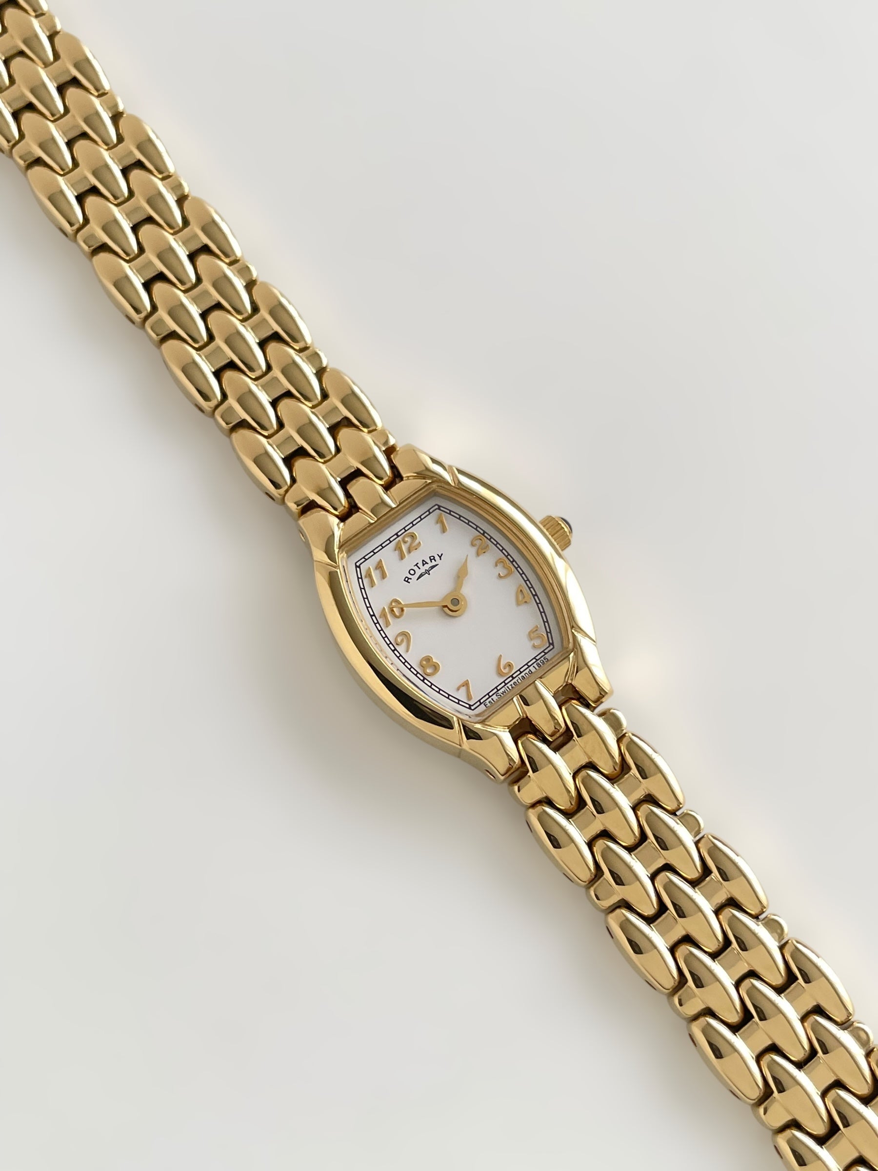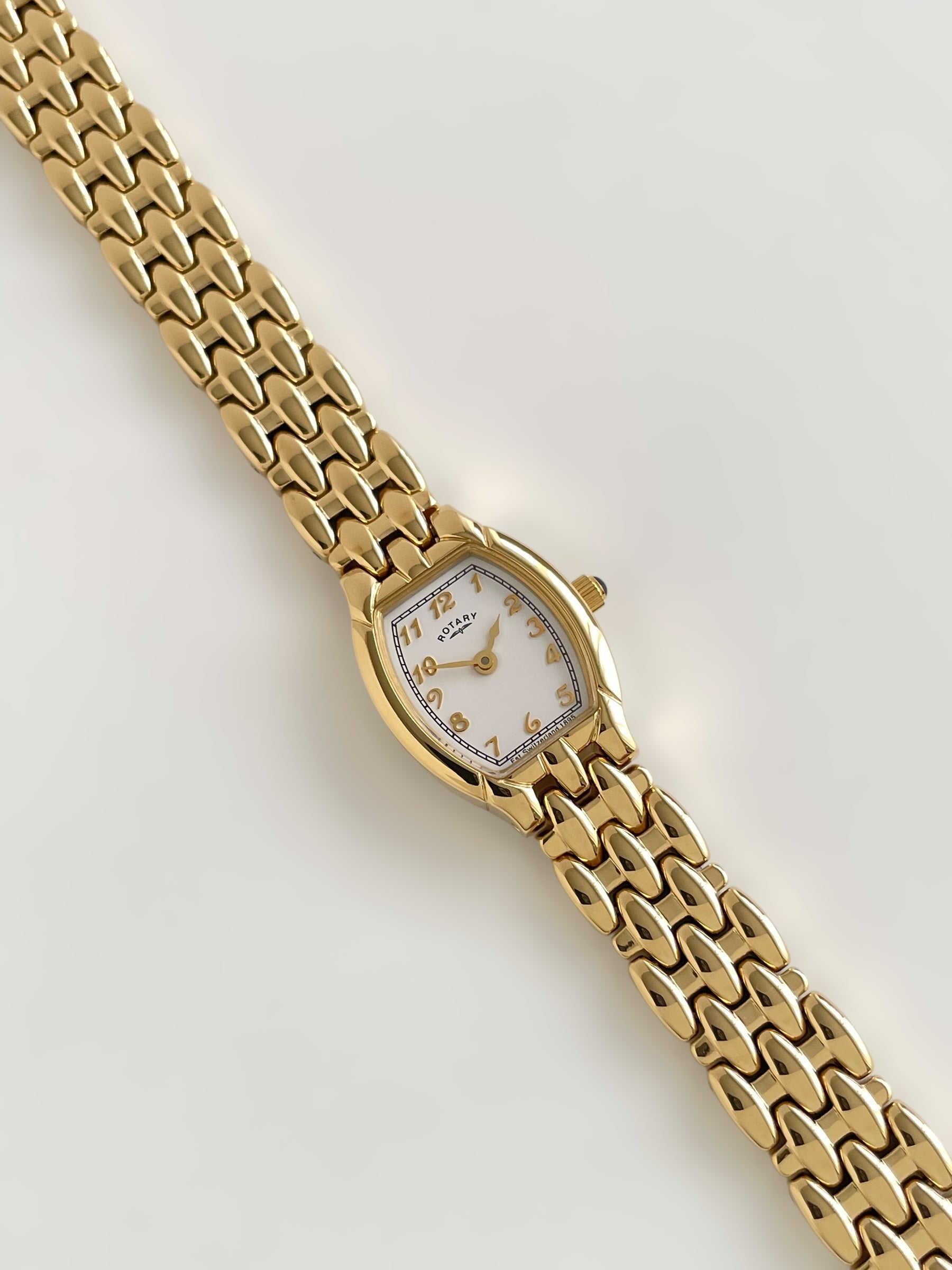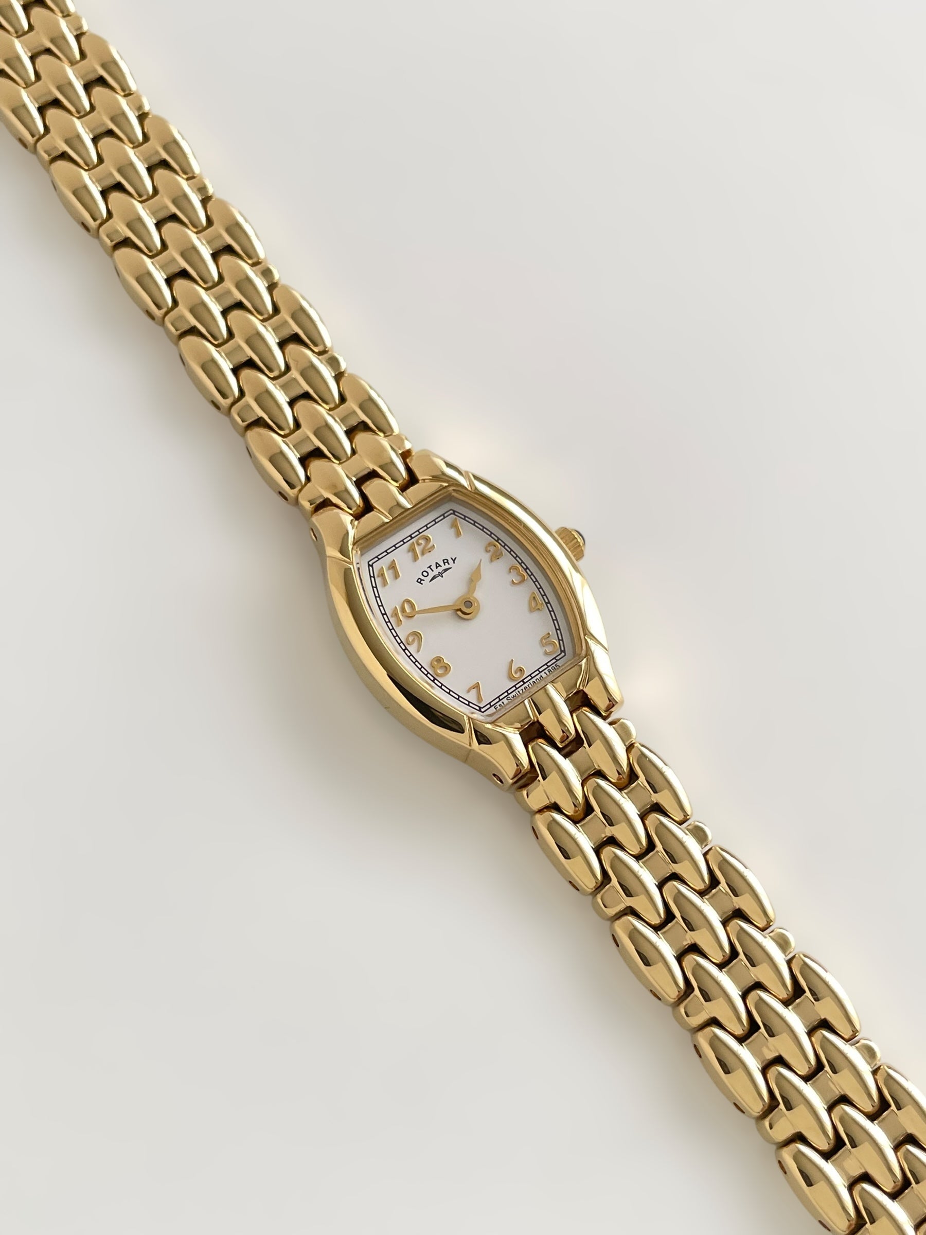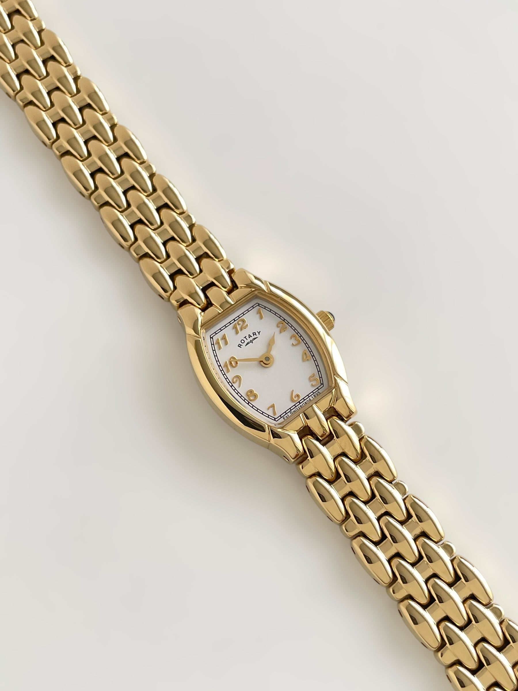 Gorgeous vintage and gold plated Rotary watch with a beautiful bracelet design and a unique case. Bracelet clasp closure.