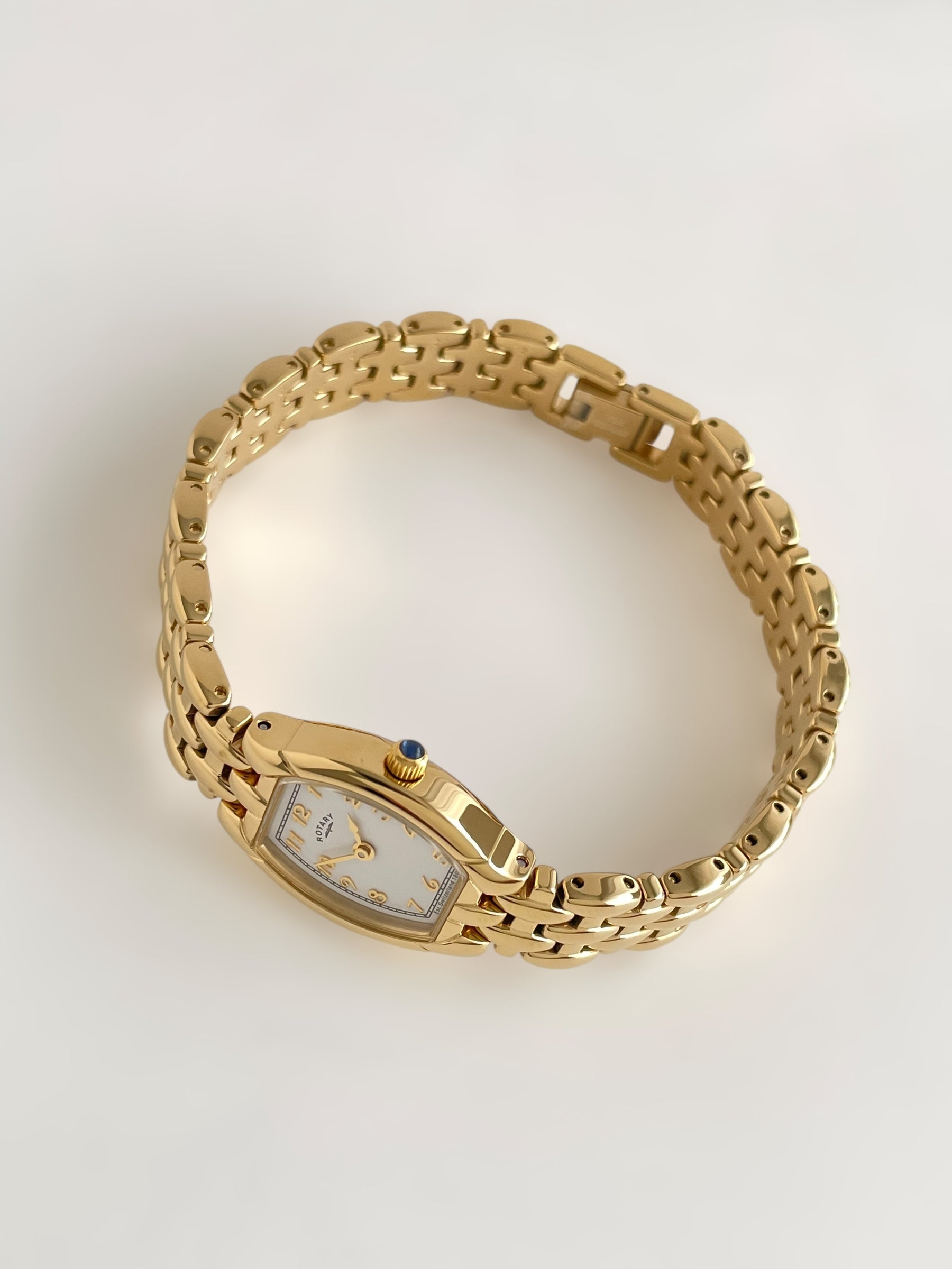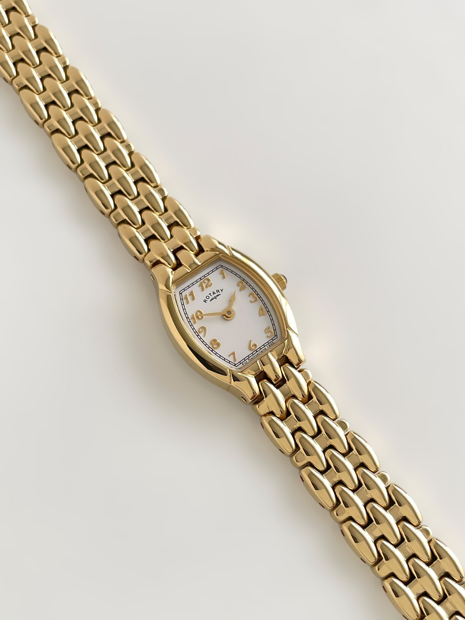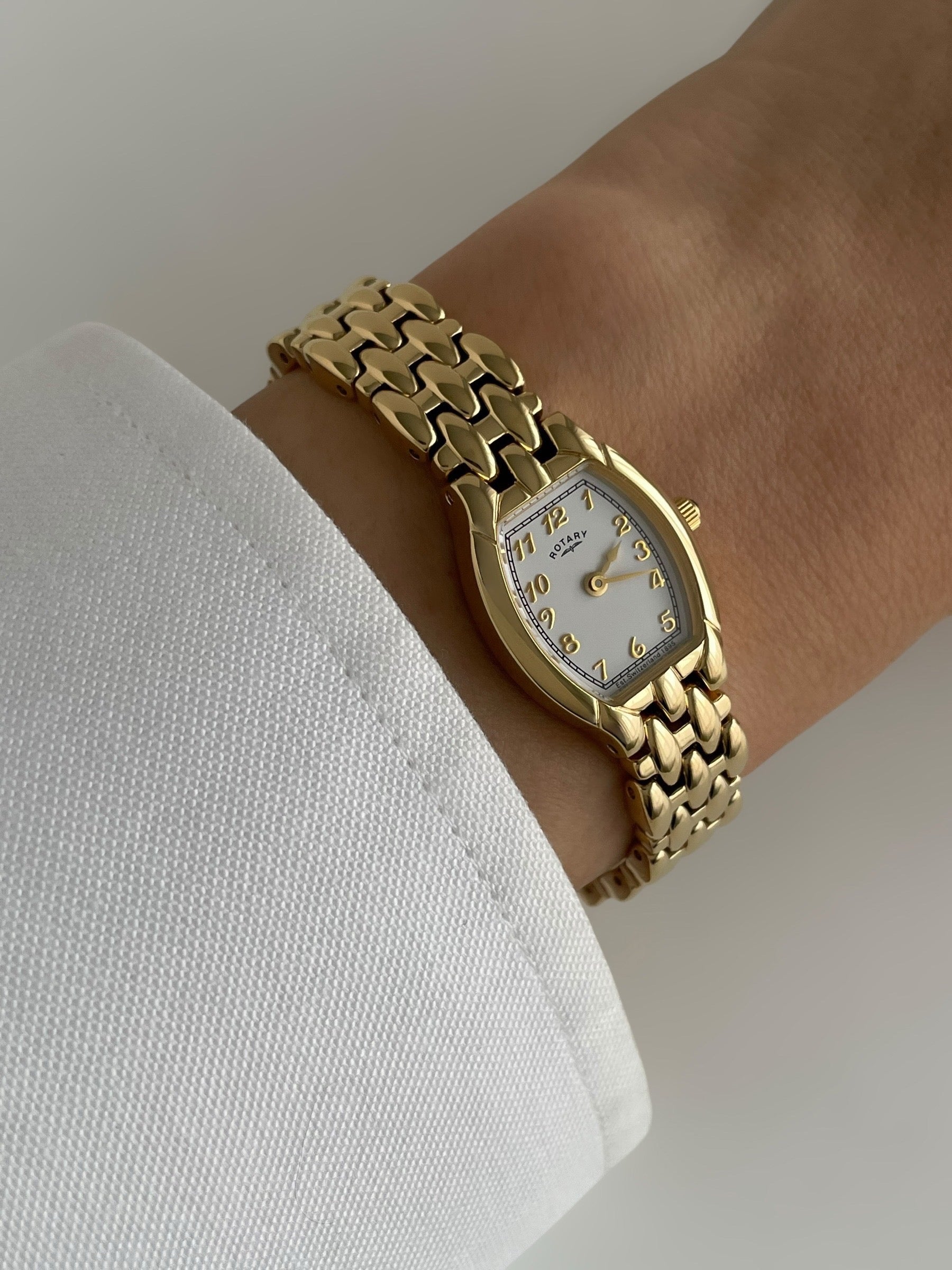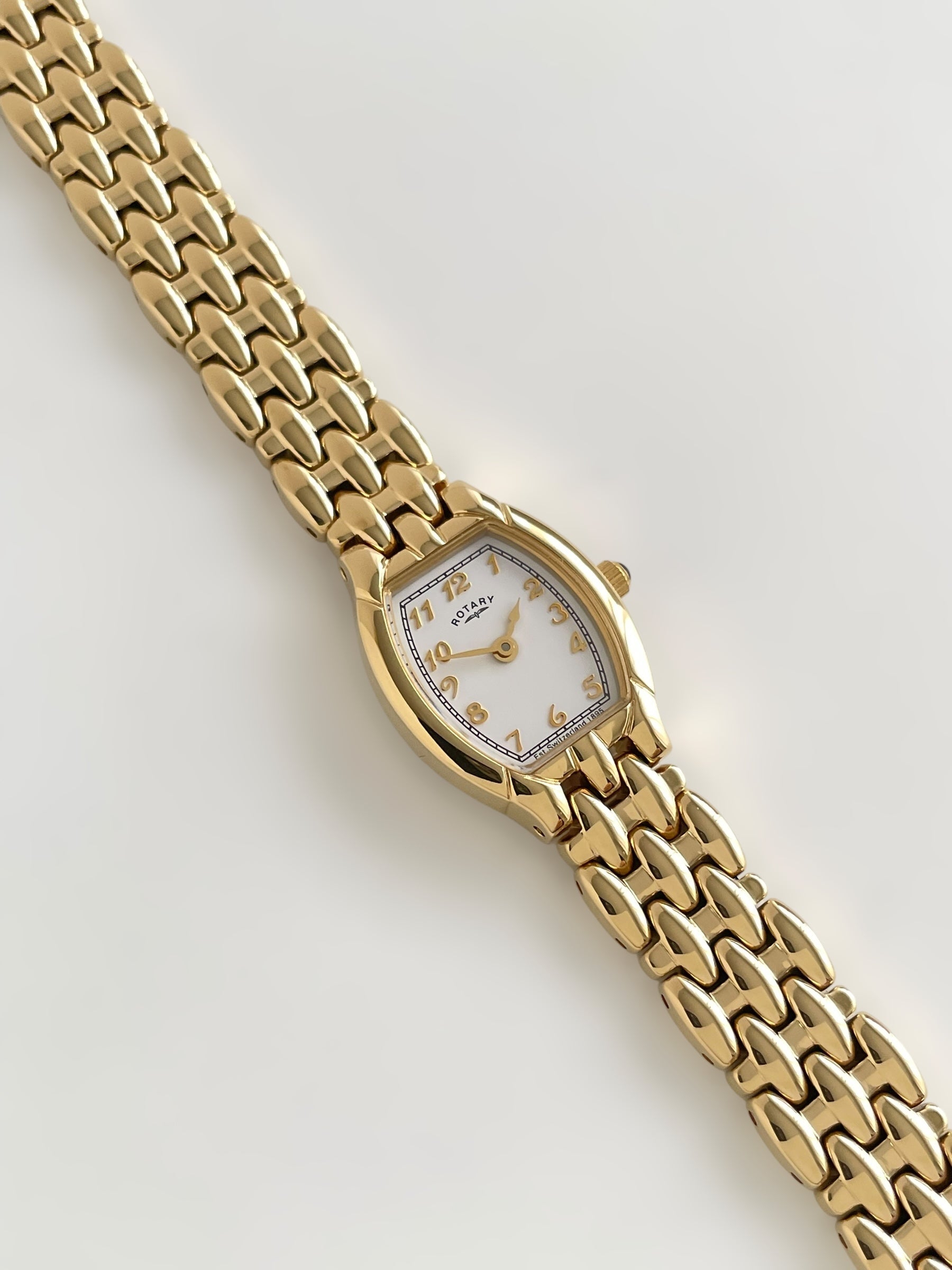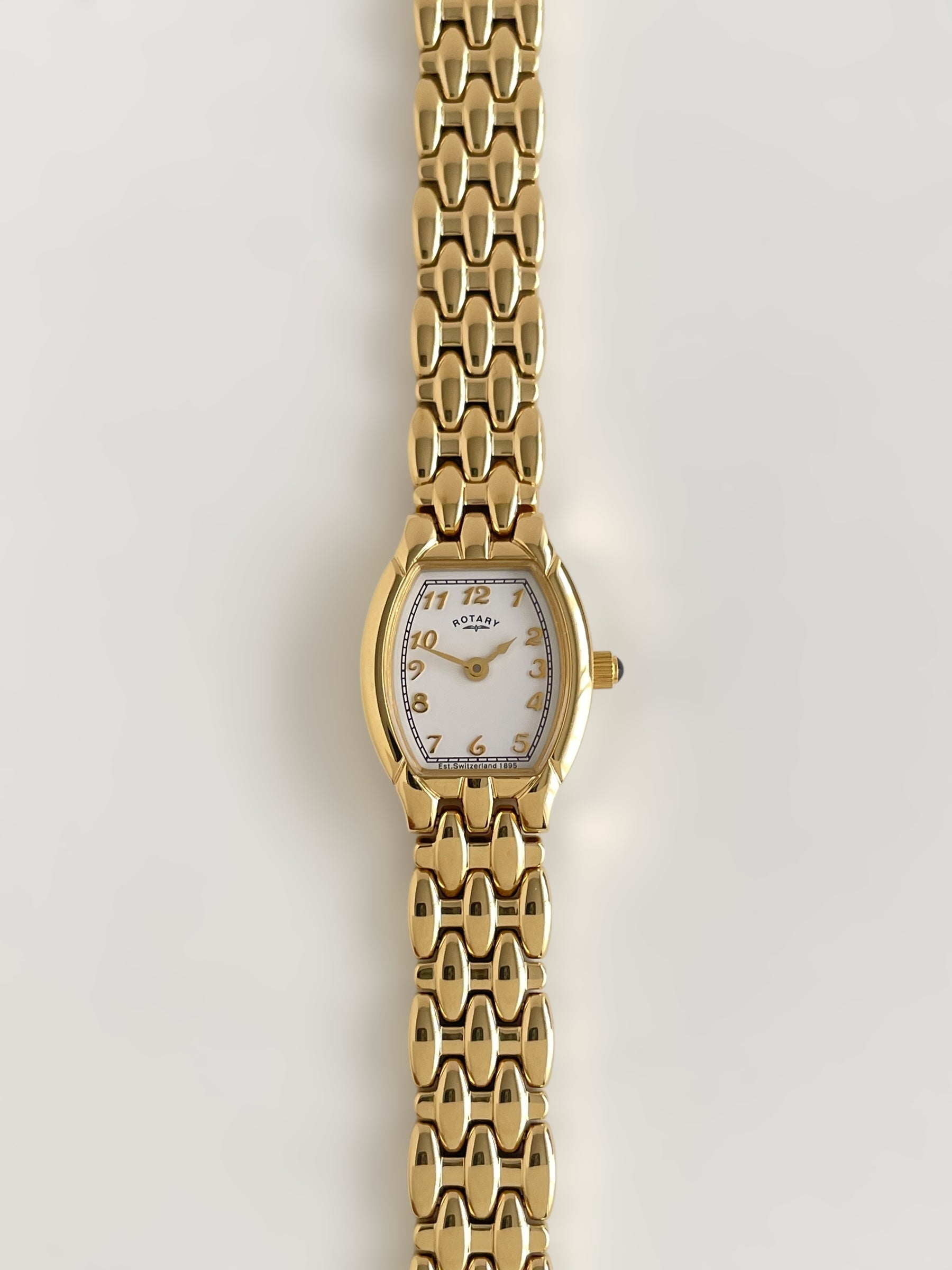 Gorgeous vintage and gold plated Rotary watch with a beautiful bracelet design and a unique case. Bracelet clasp closure.