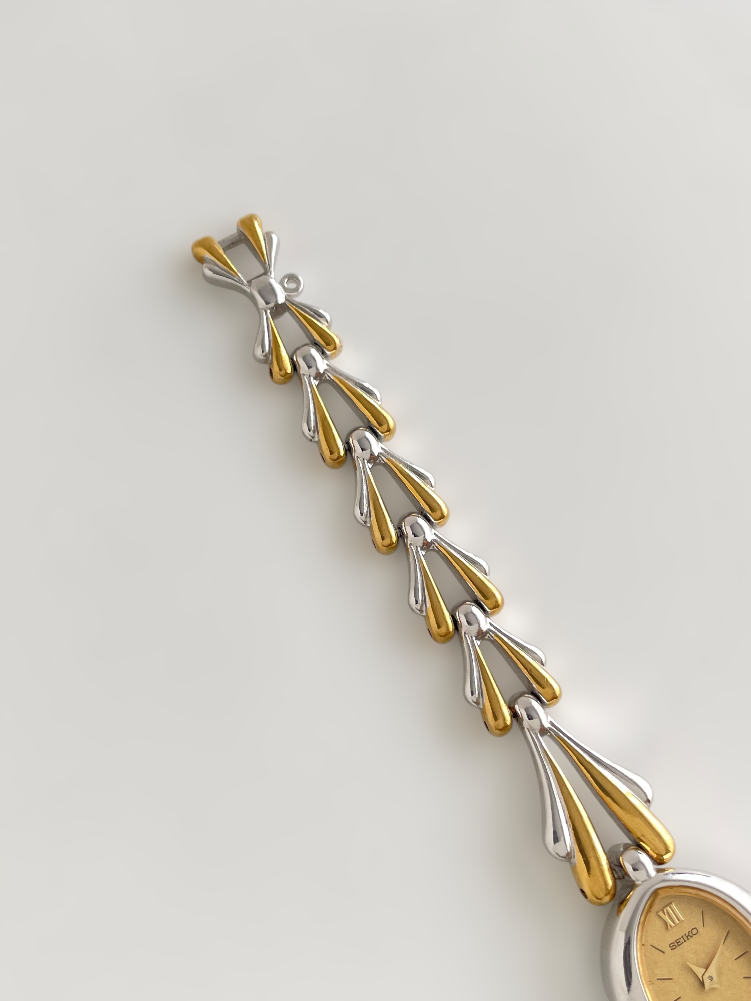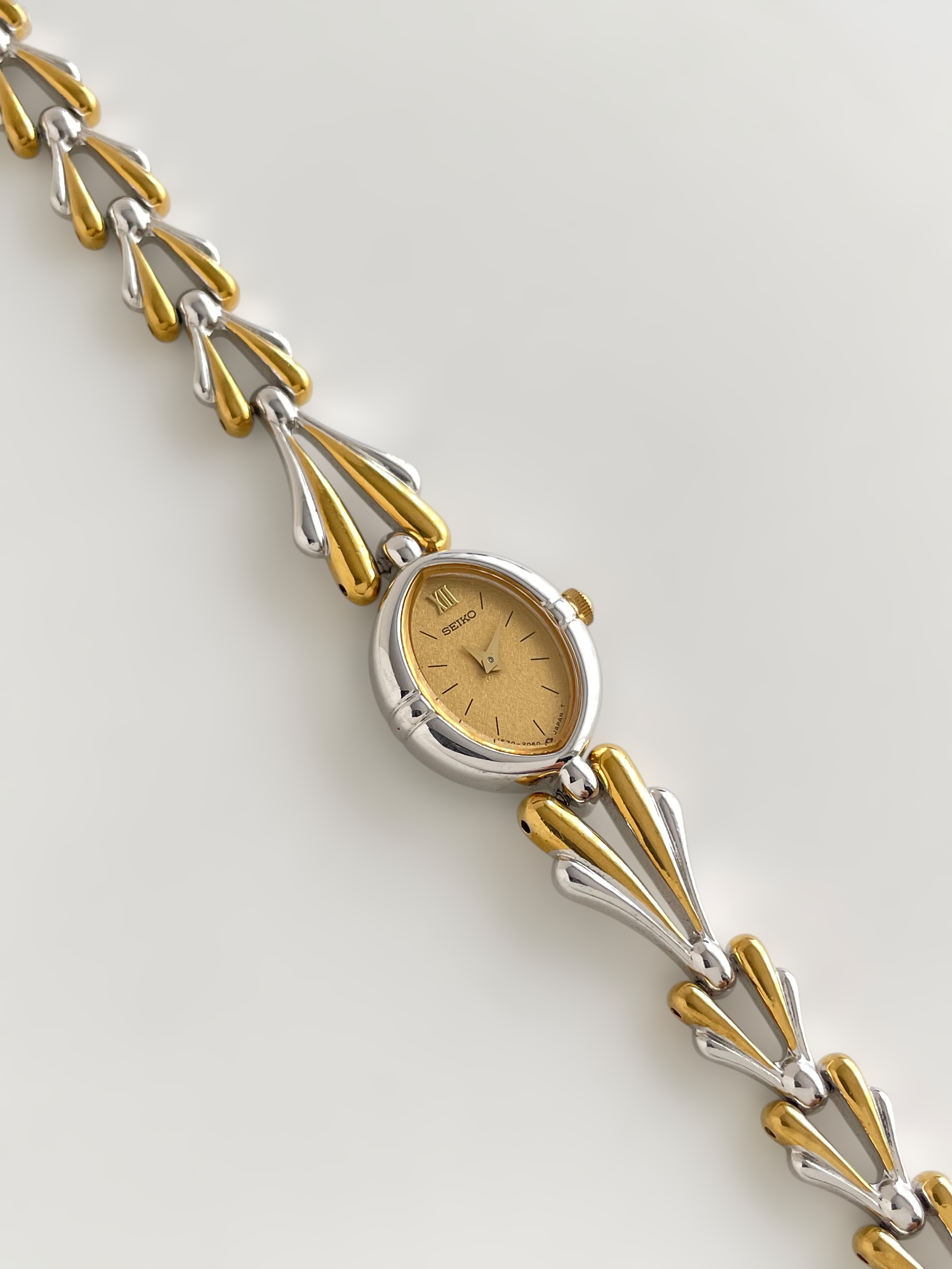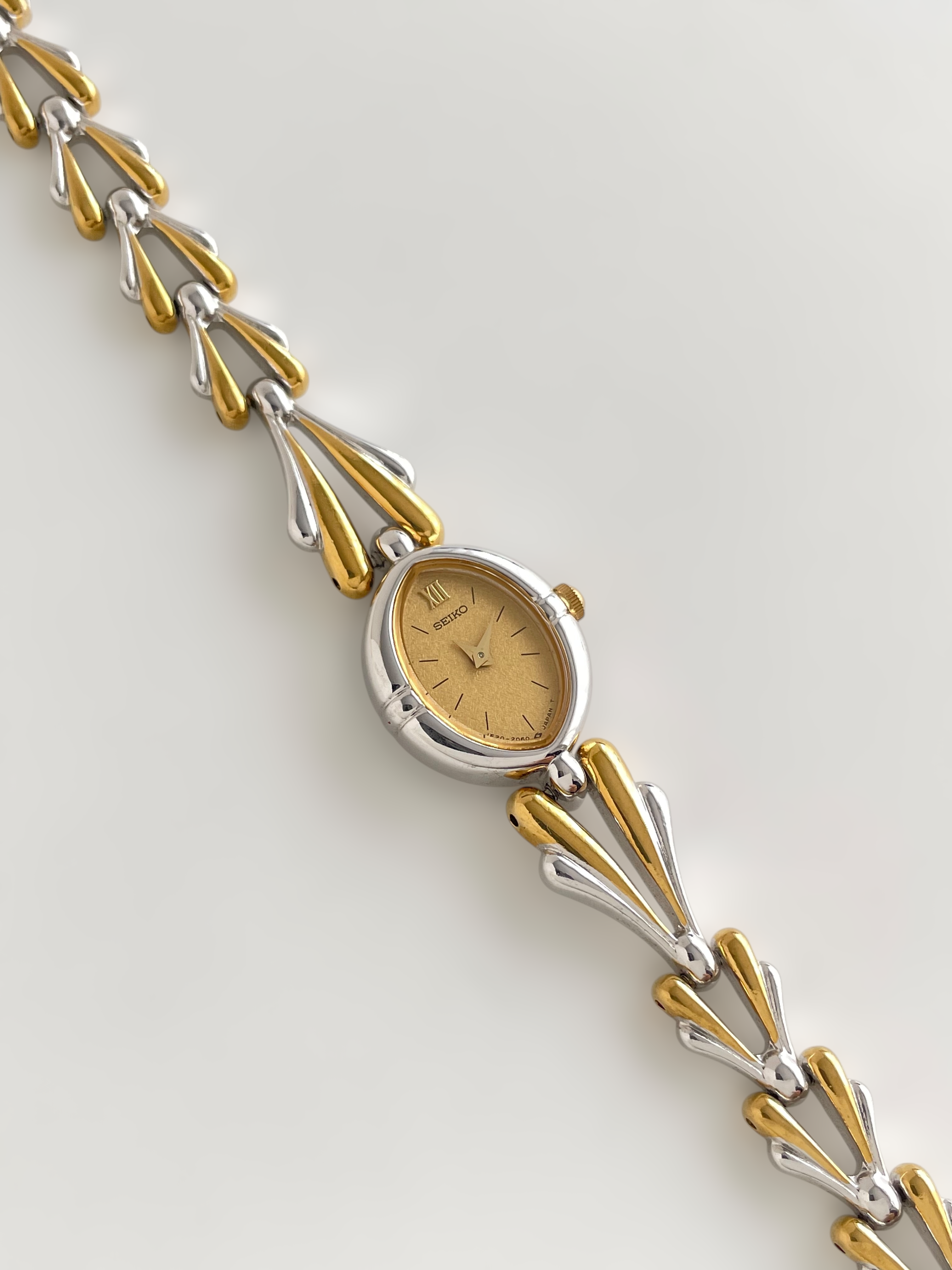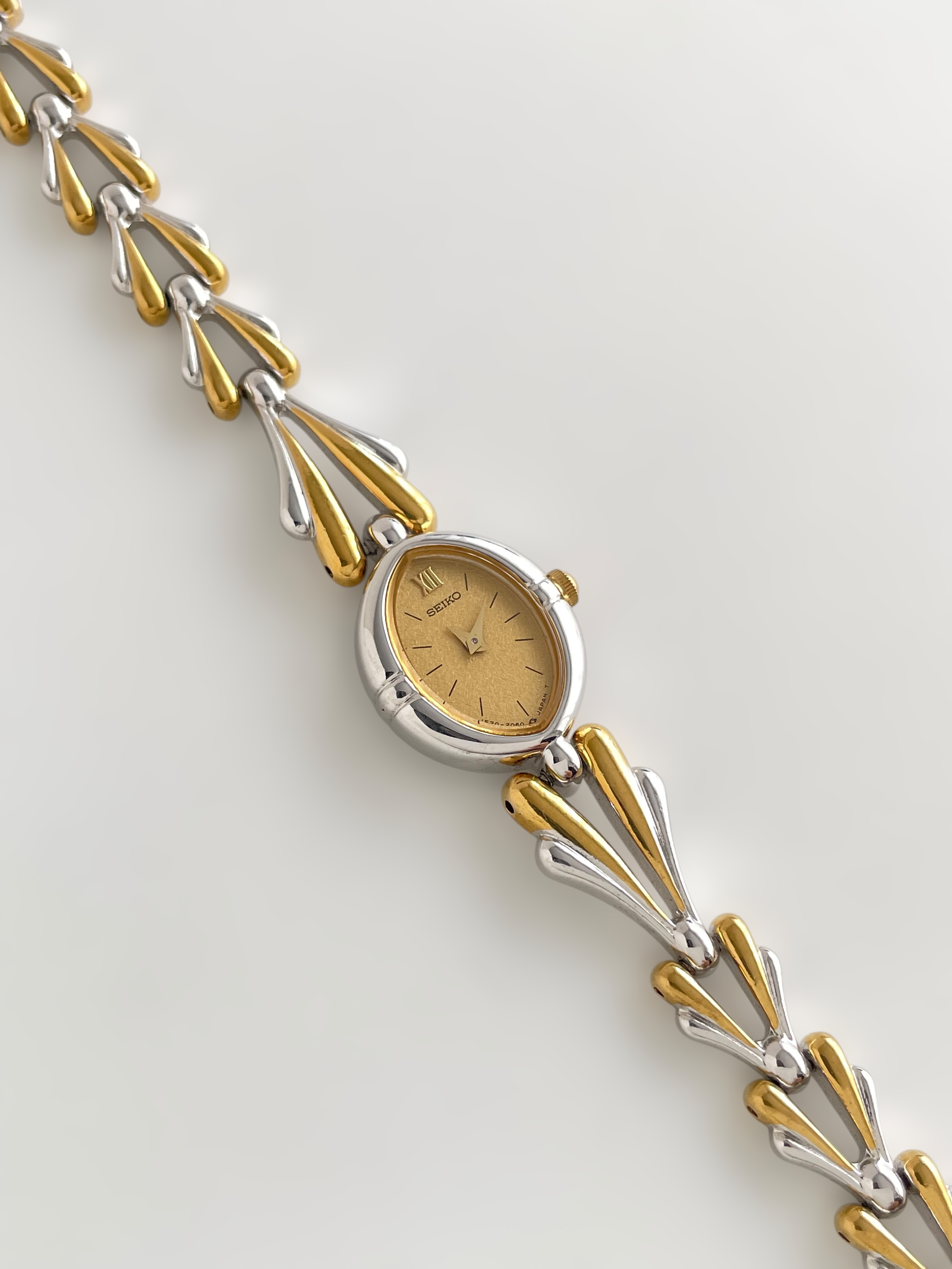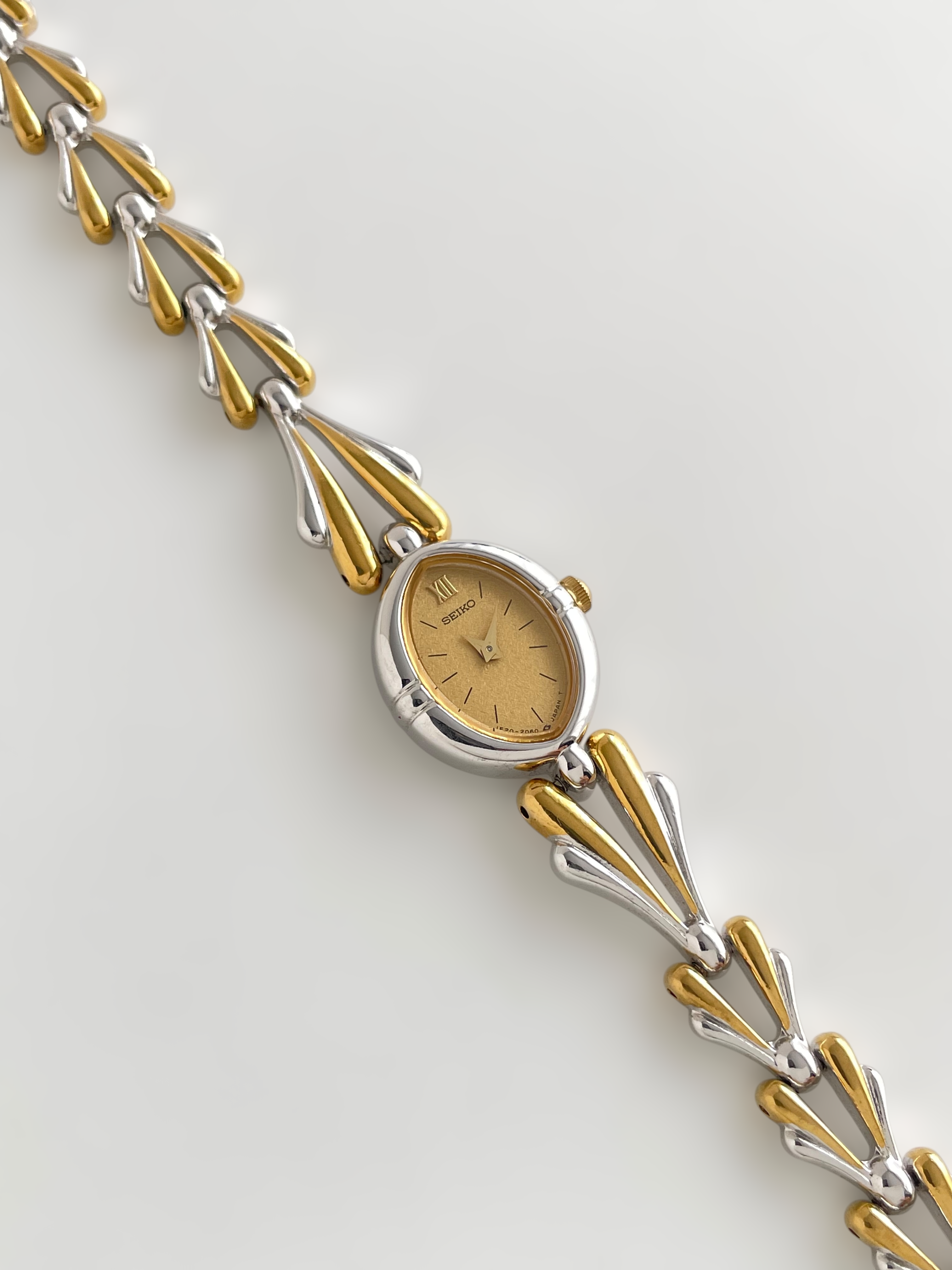 Gorgeous vintage and gold plated duotone Seiko watch with an incredible bracelet design and a petite oval case. Bracelet clasp closure with removable security chain.