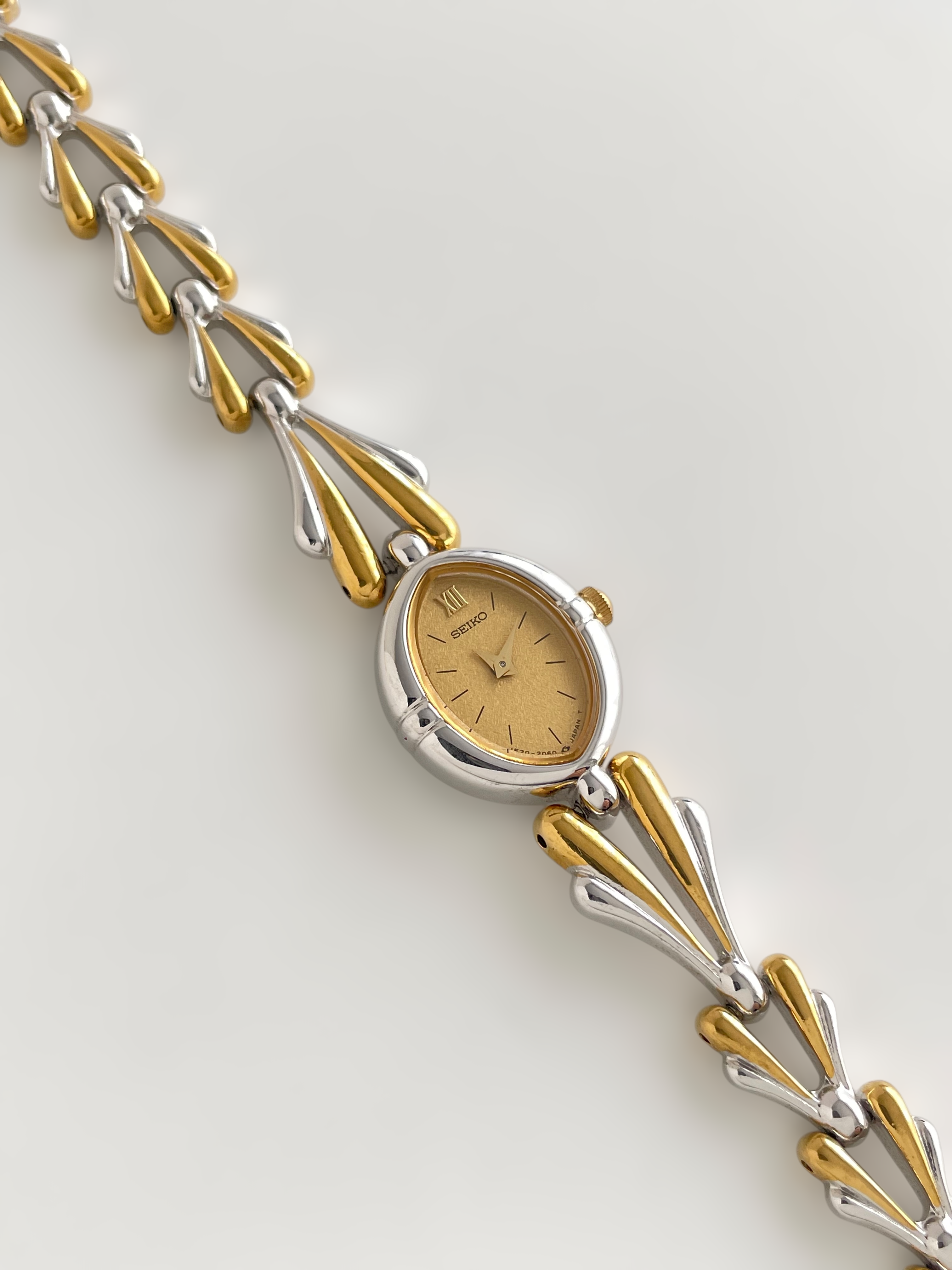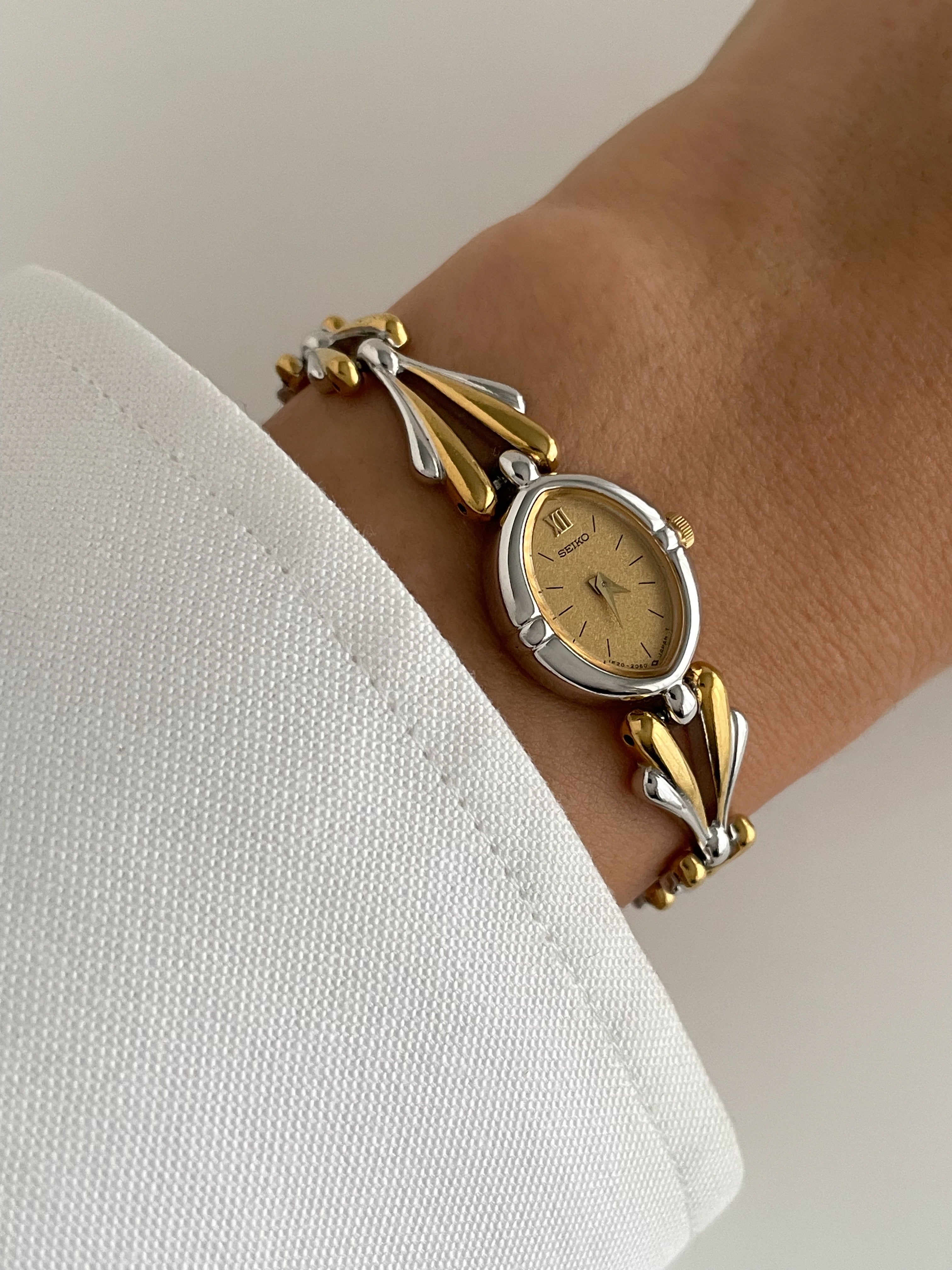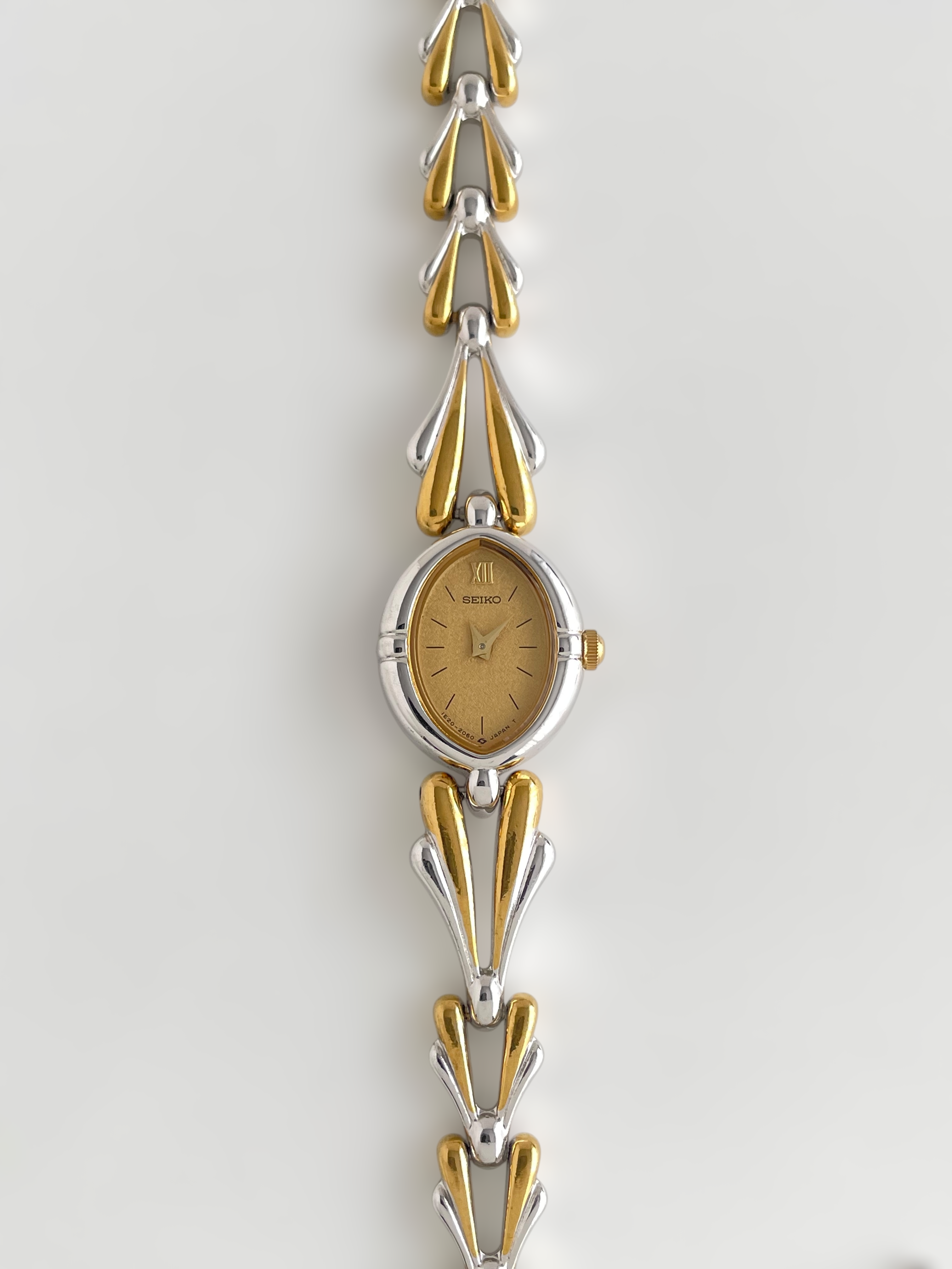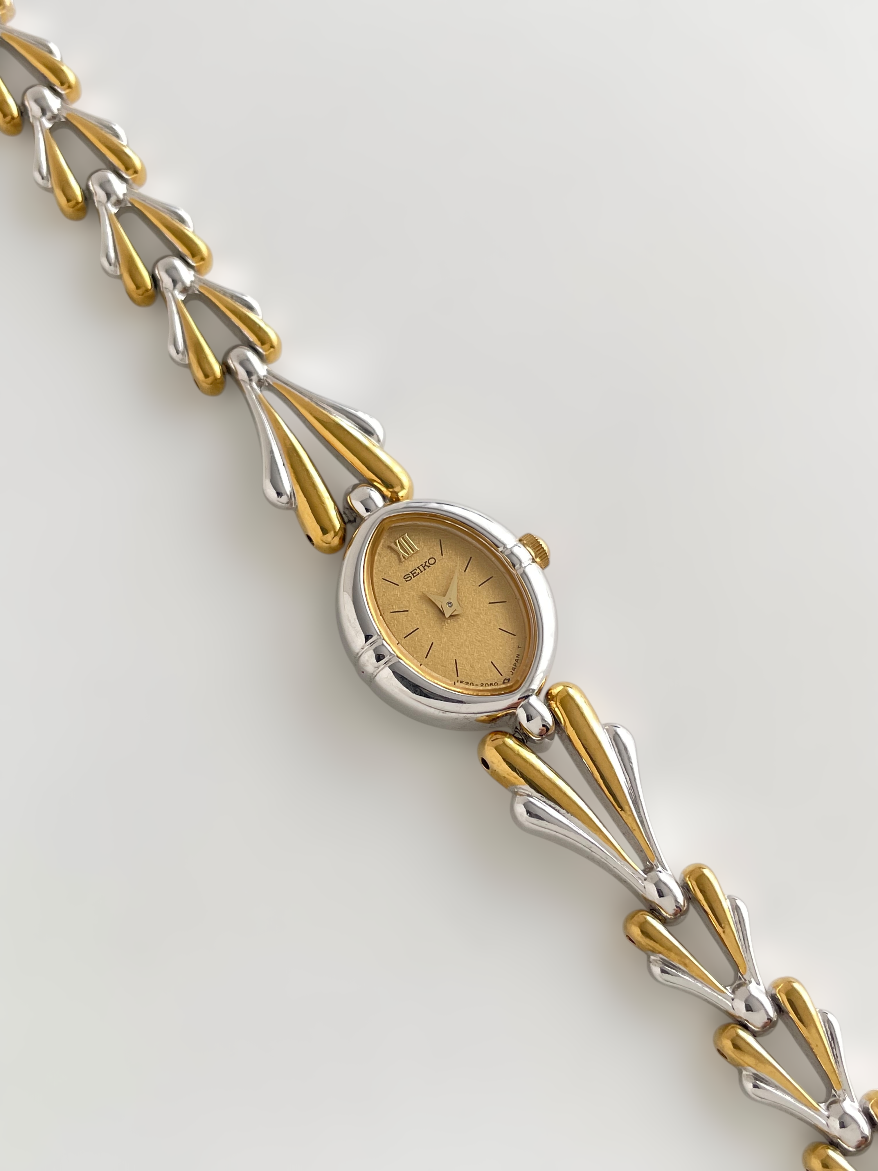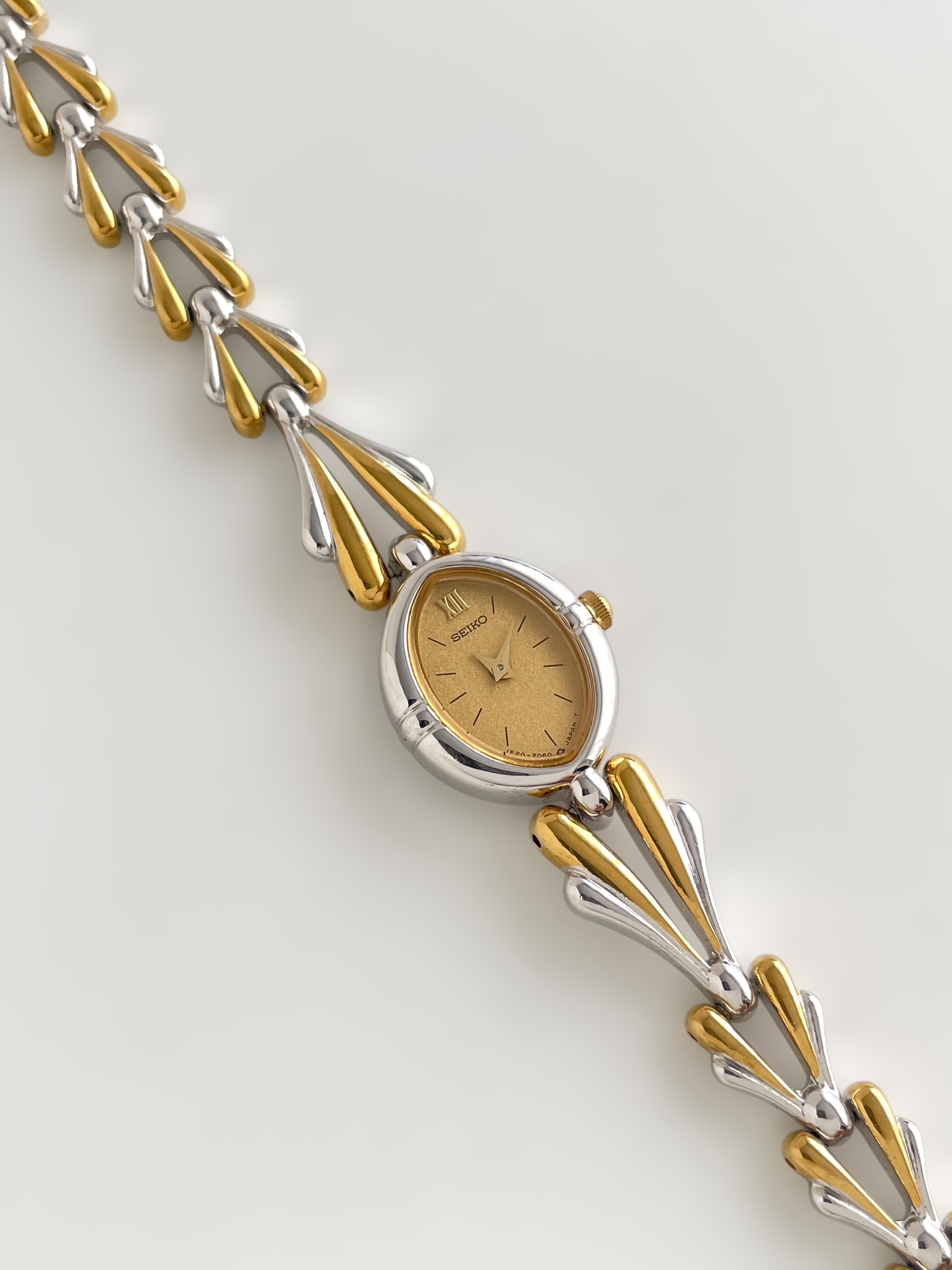 Gorgeous vintage and gold plated duotone Seiko watch with an incredible bracelet design and a petite oval case. Bracelet clasp closure with removable security chain.