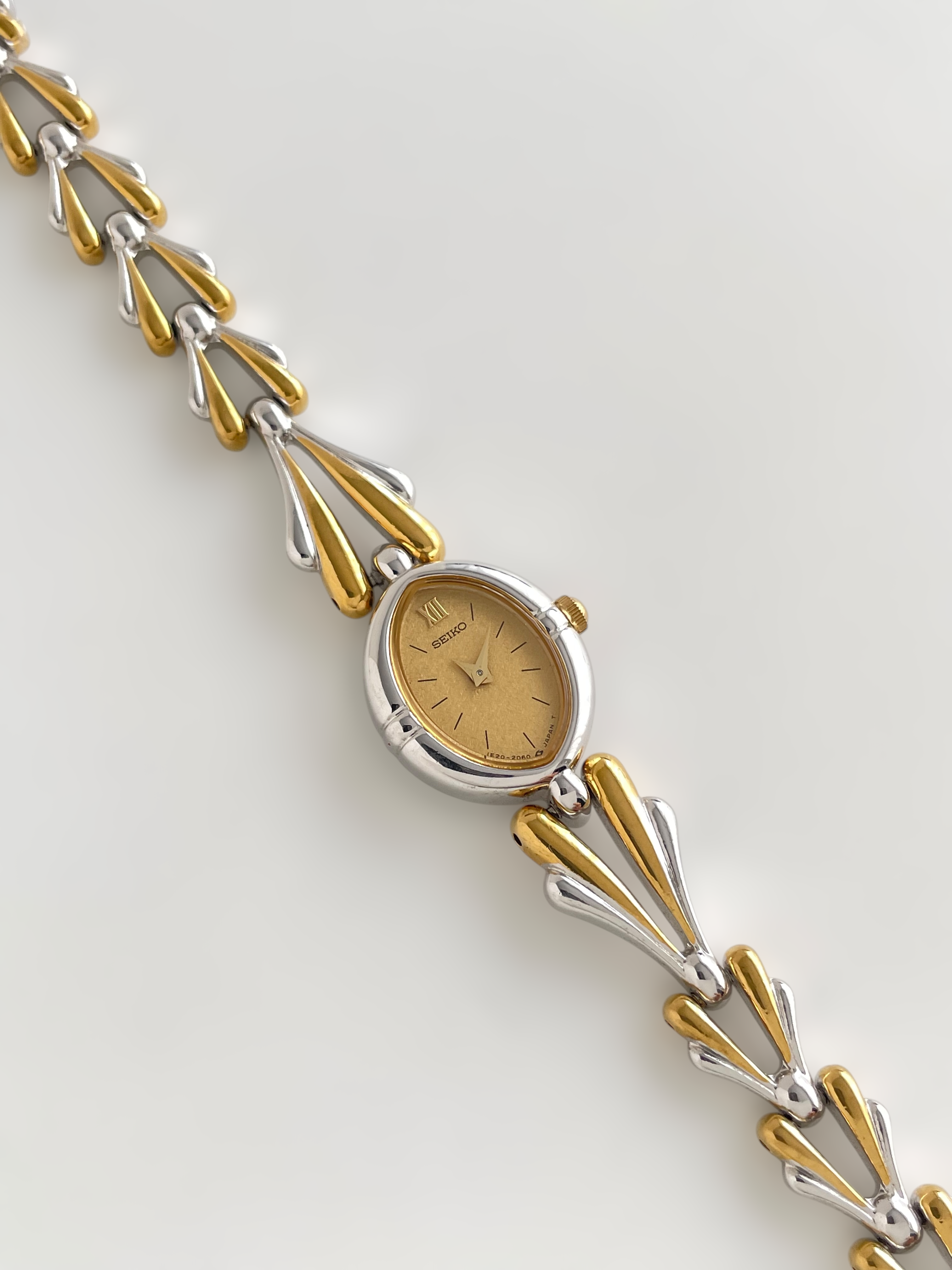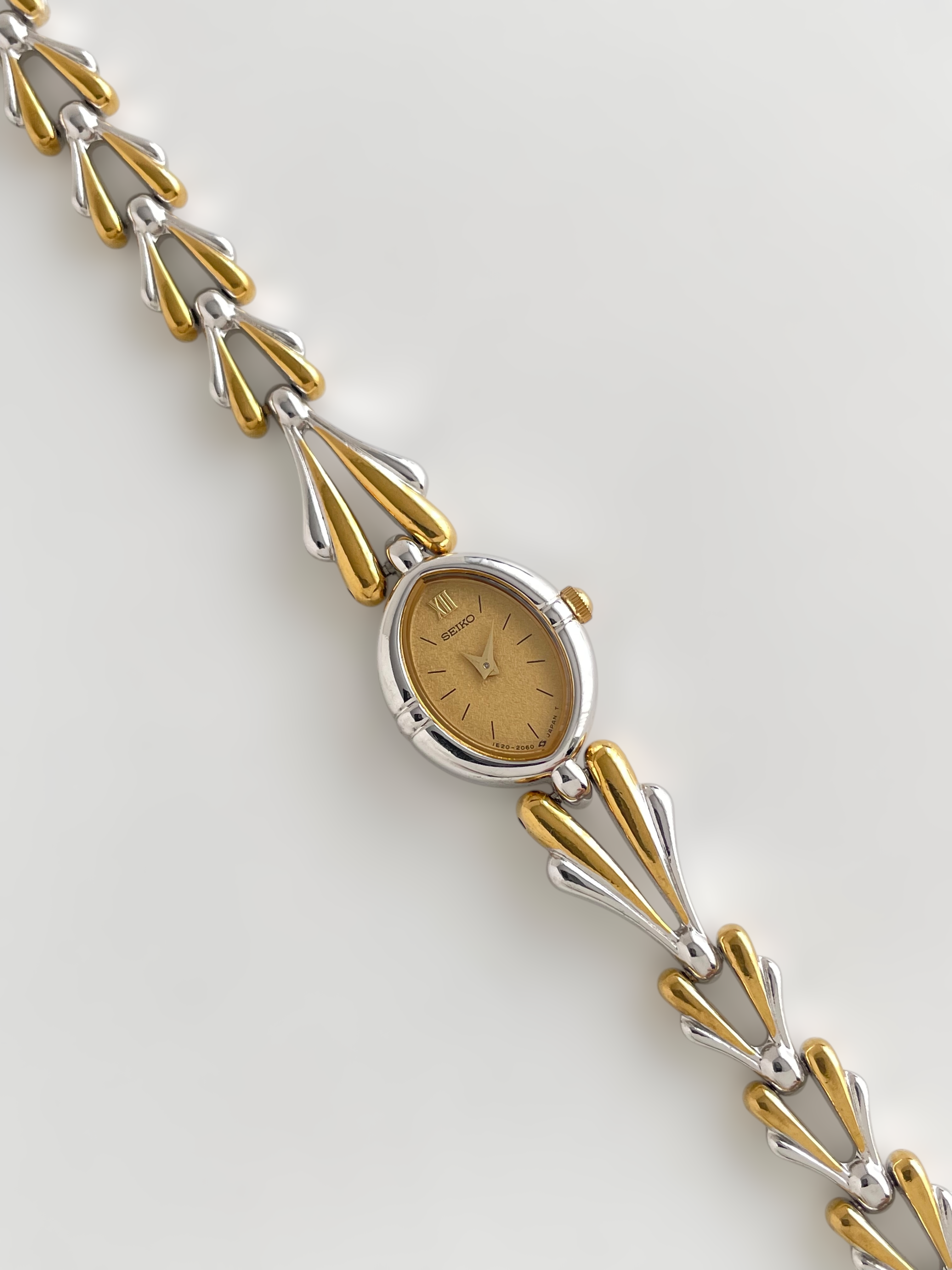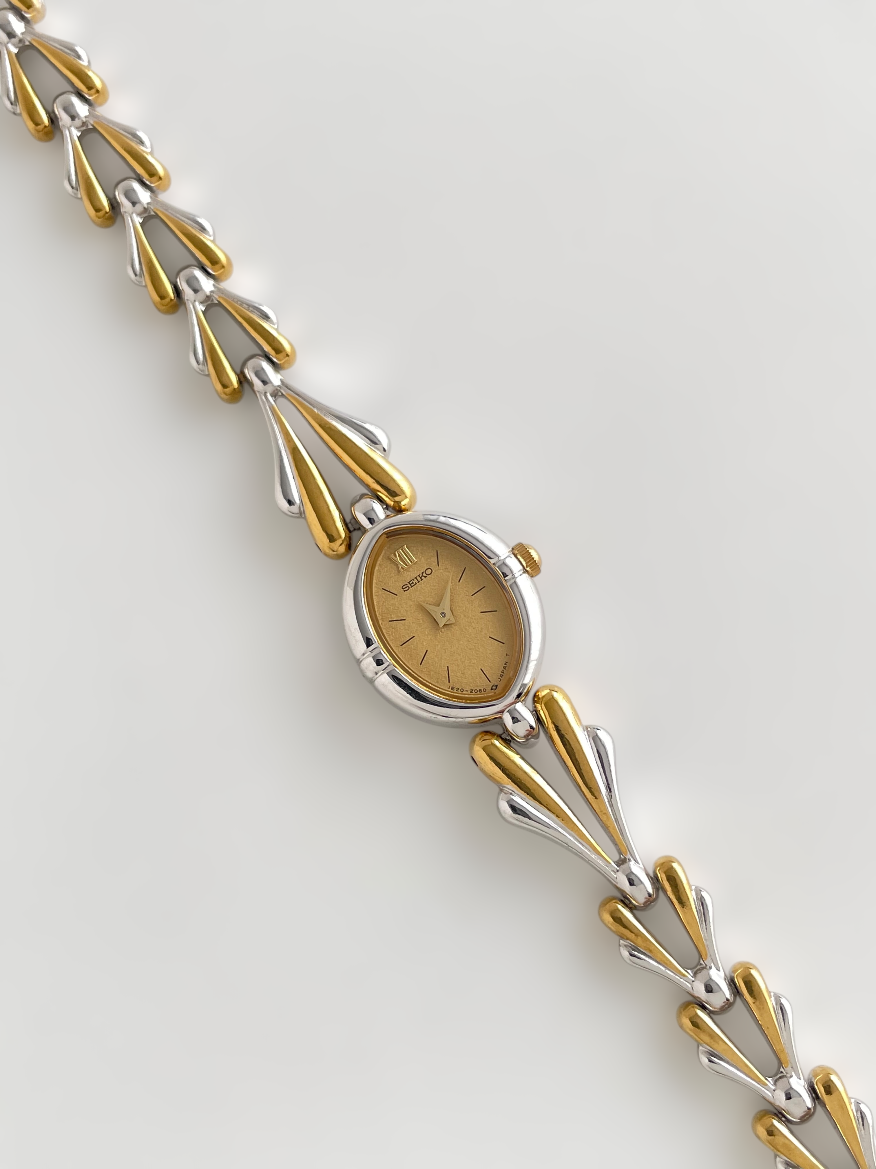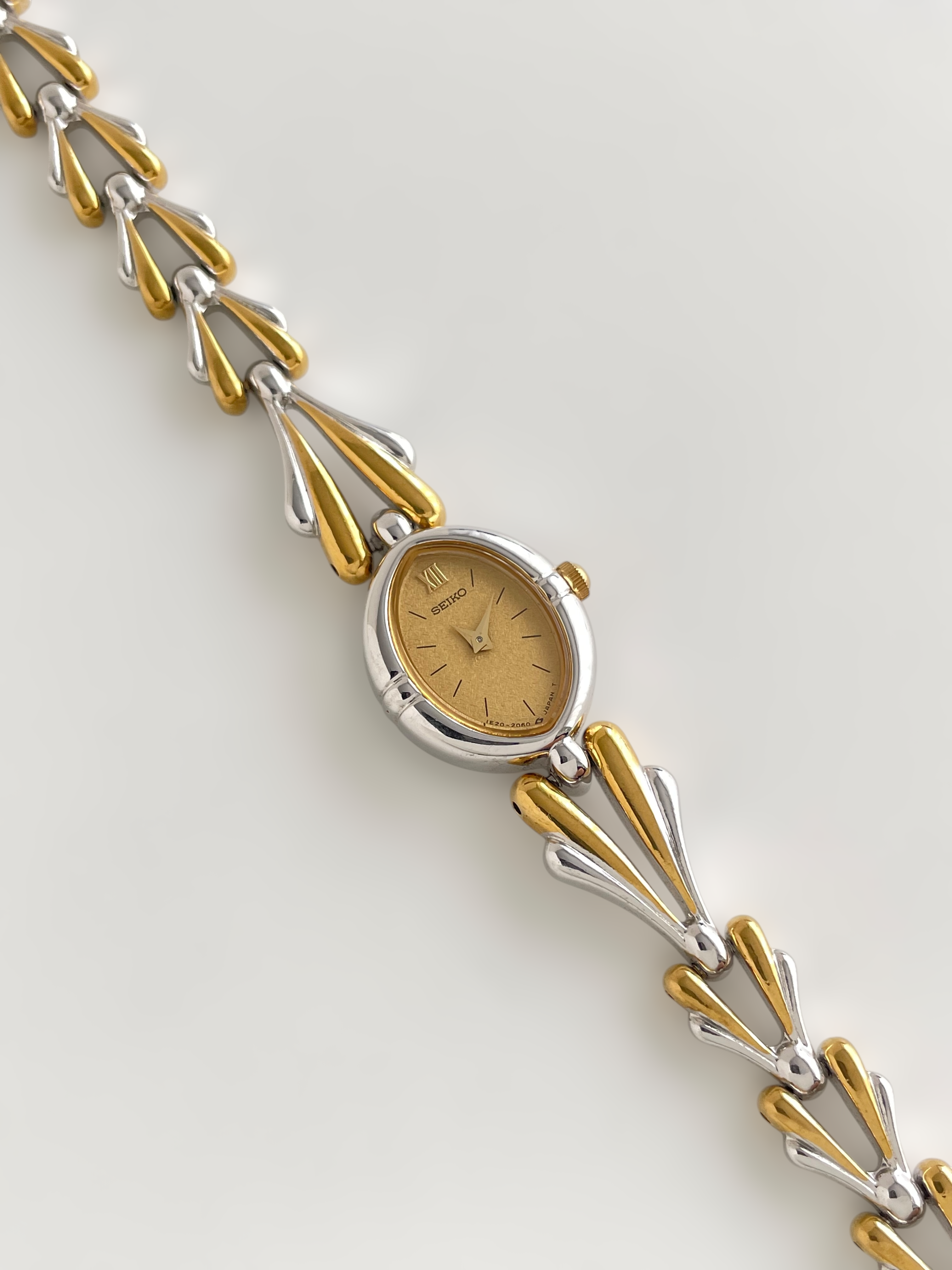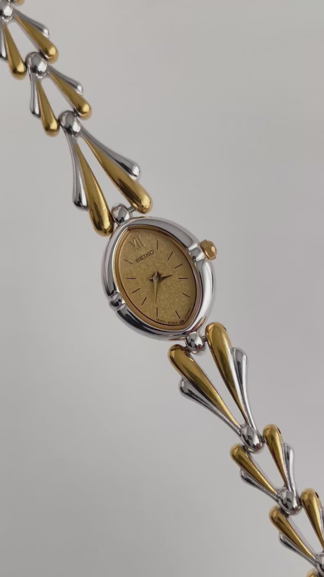 Gorgeous vintage and gold plated duotone Seiko watch with an incredible bracelet design and a petite oval case. Bracelet clasp closure with removable security chain.