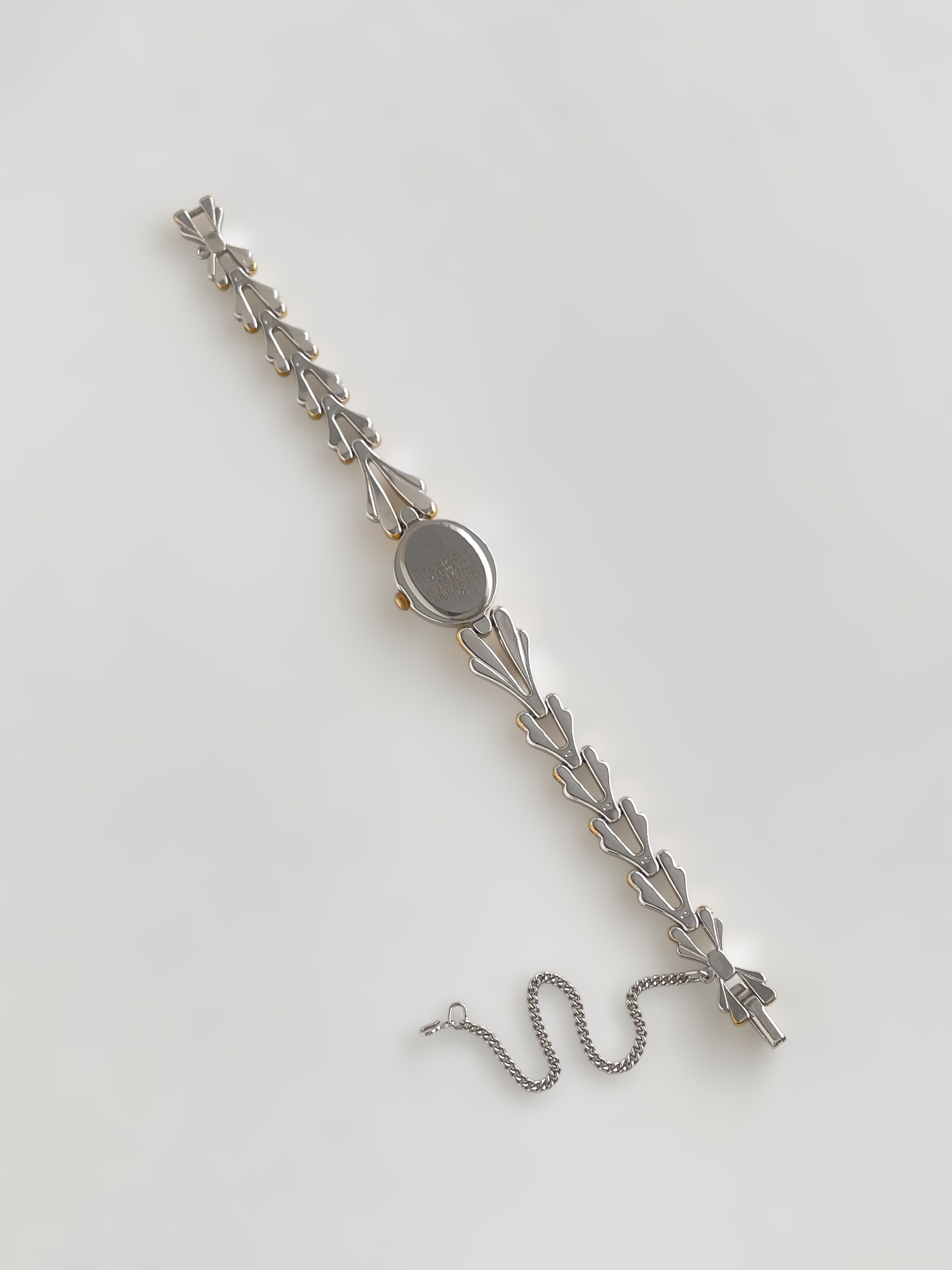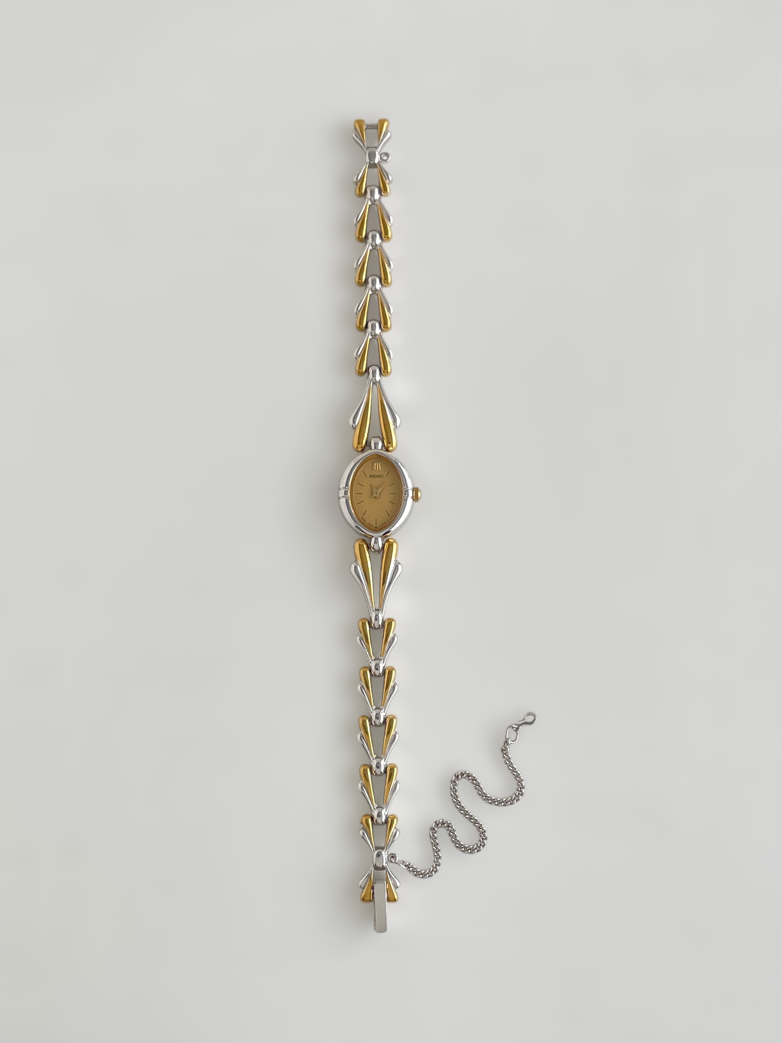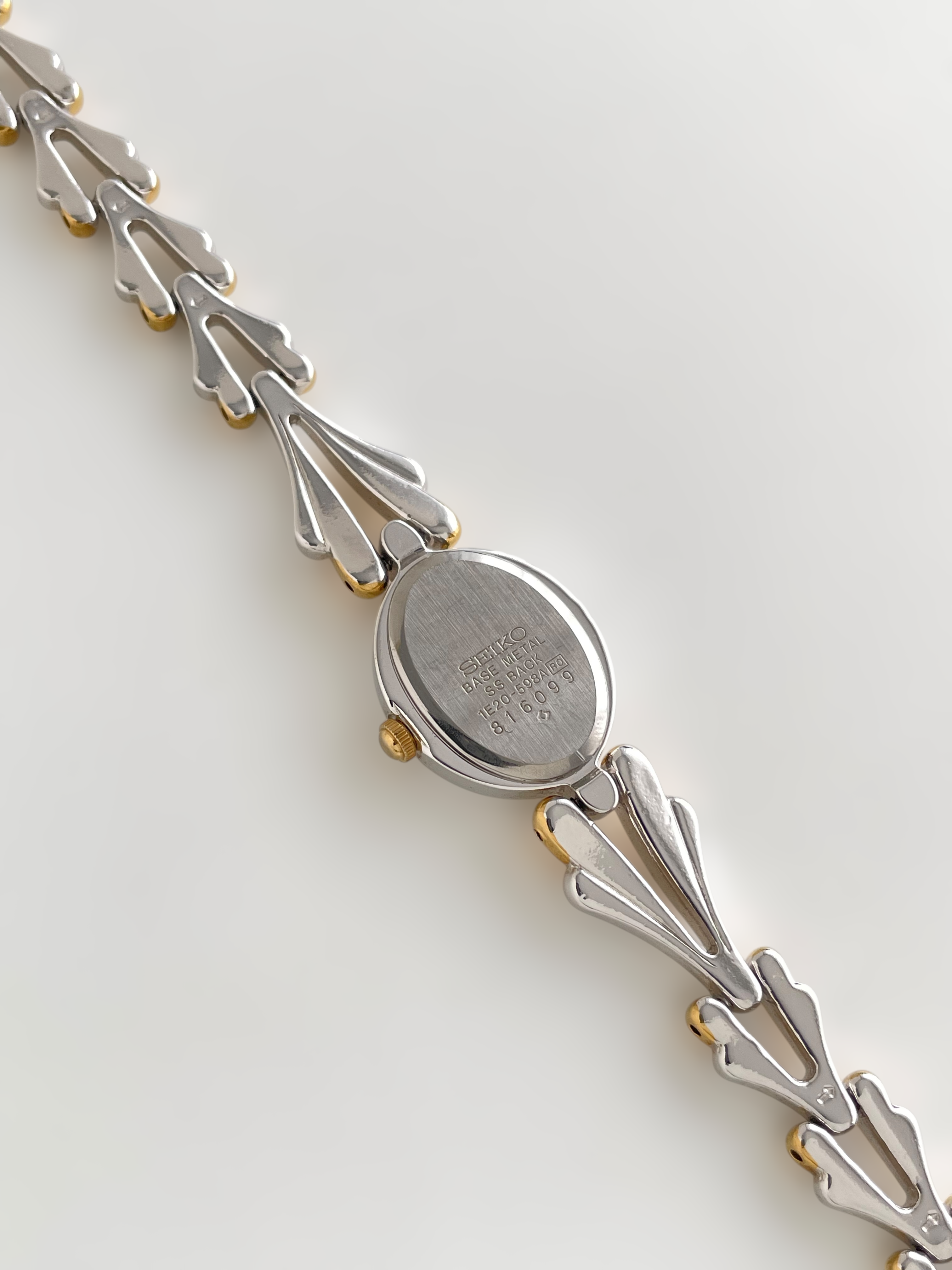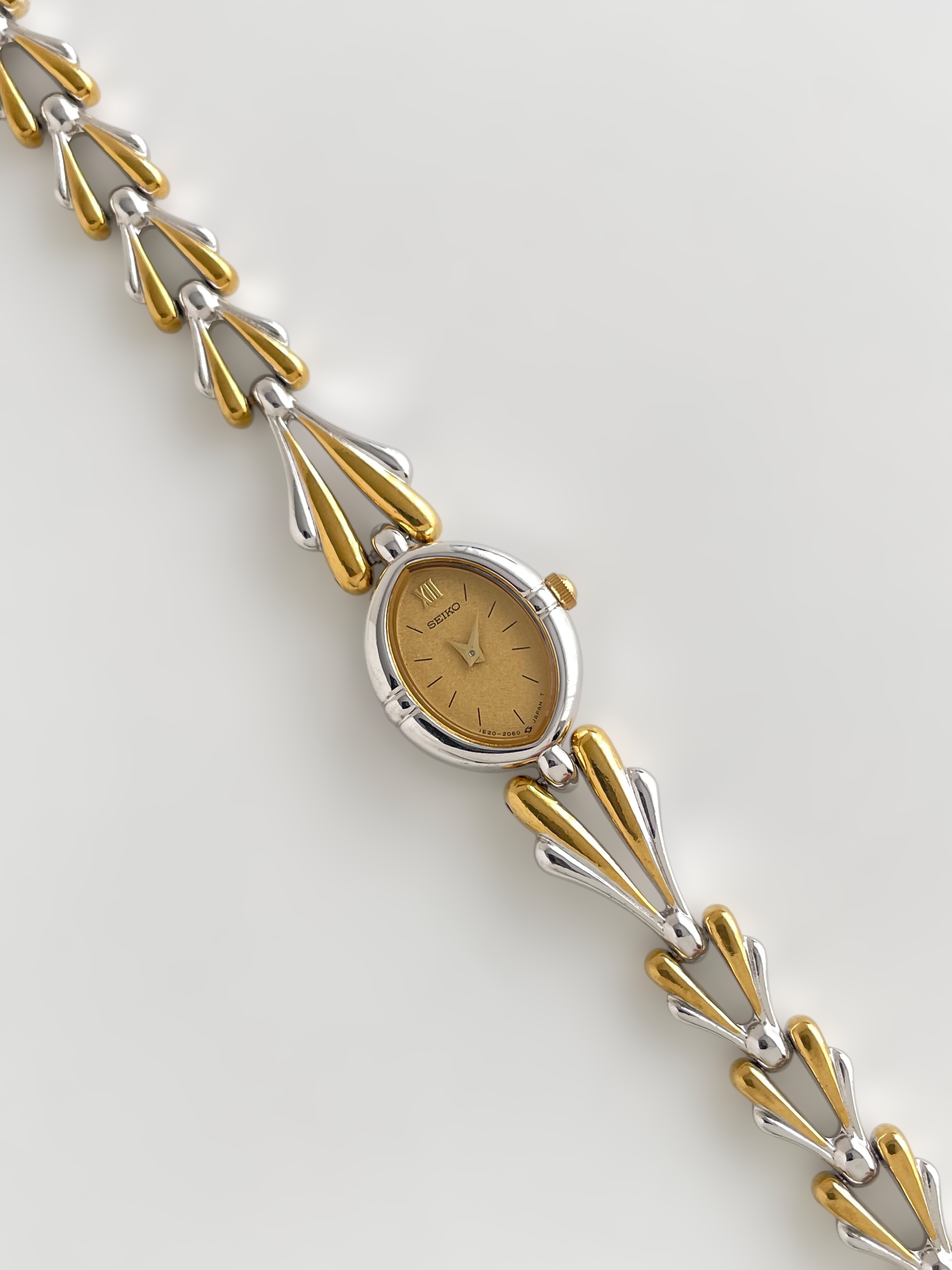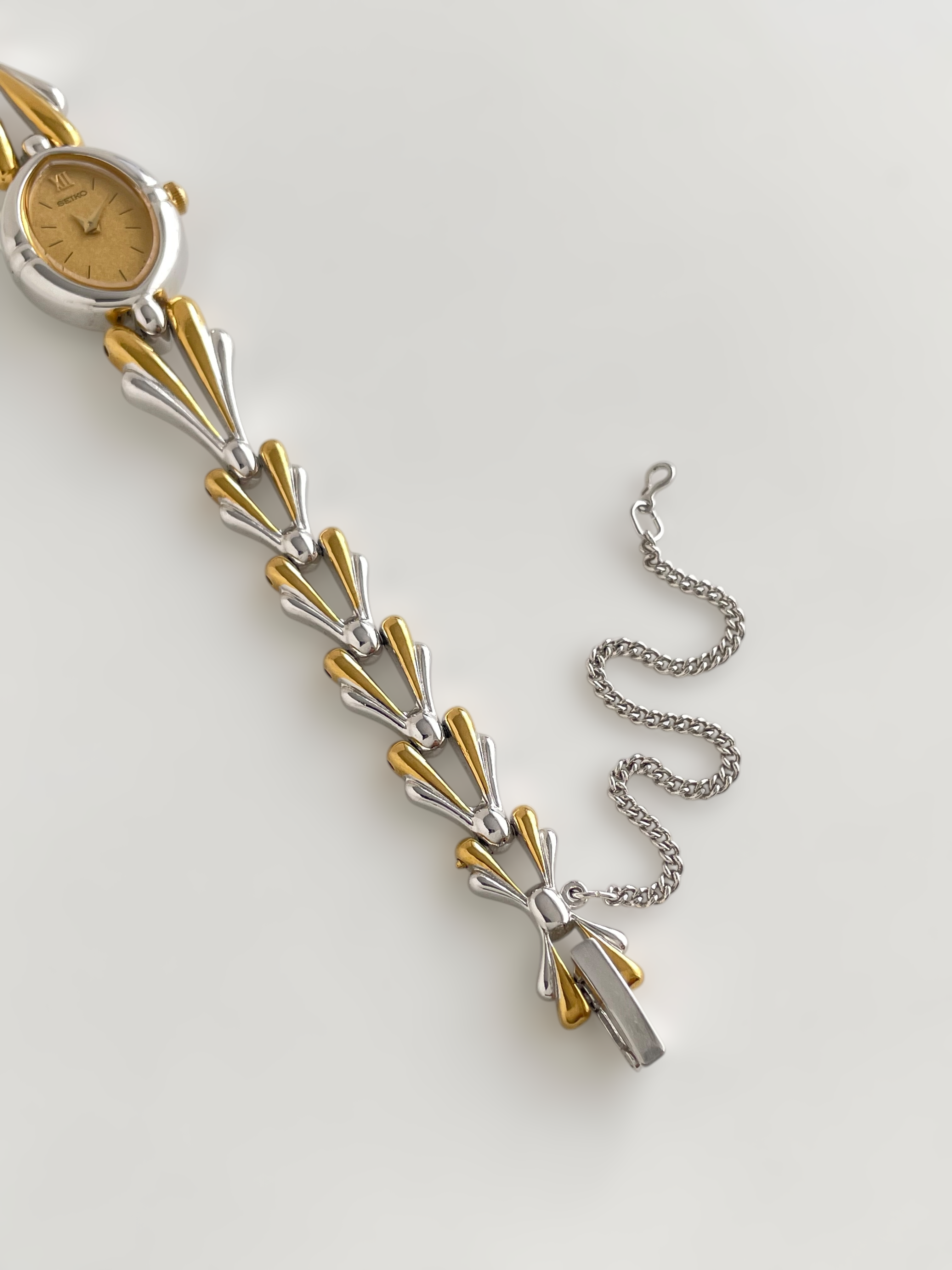 Gorgeous vintage and gold plated duotone Seiko watch with an incredible bracelet design and a petite oval case. Bracelet clasp closure with removable security chain.