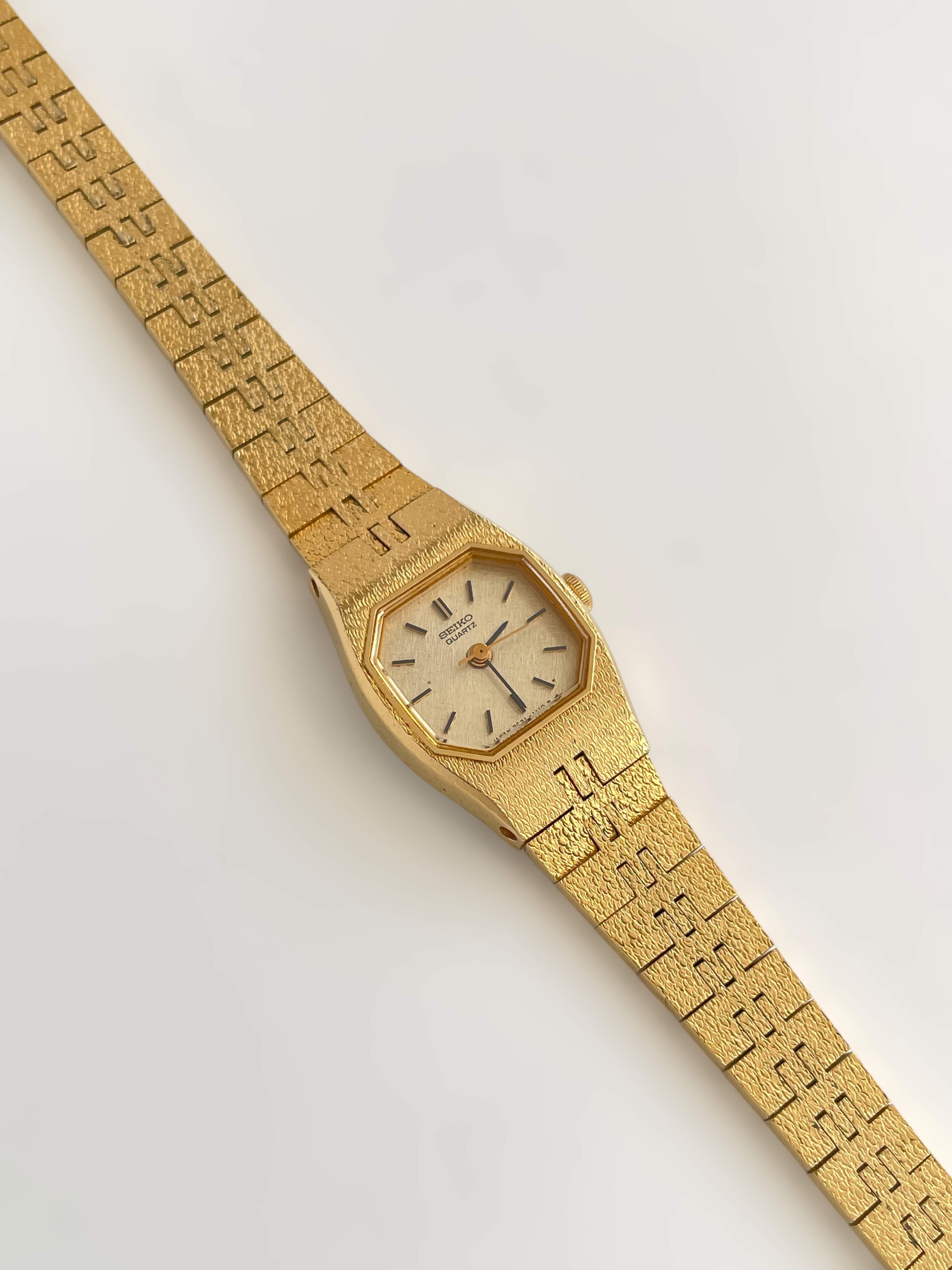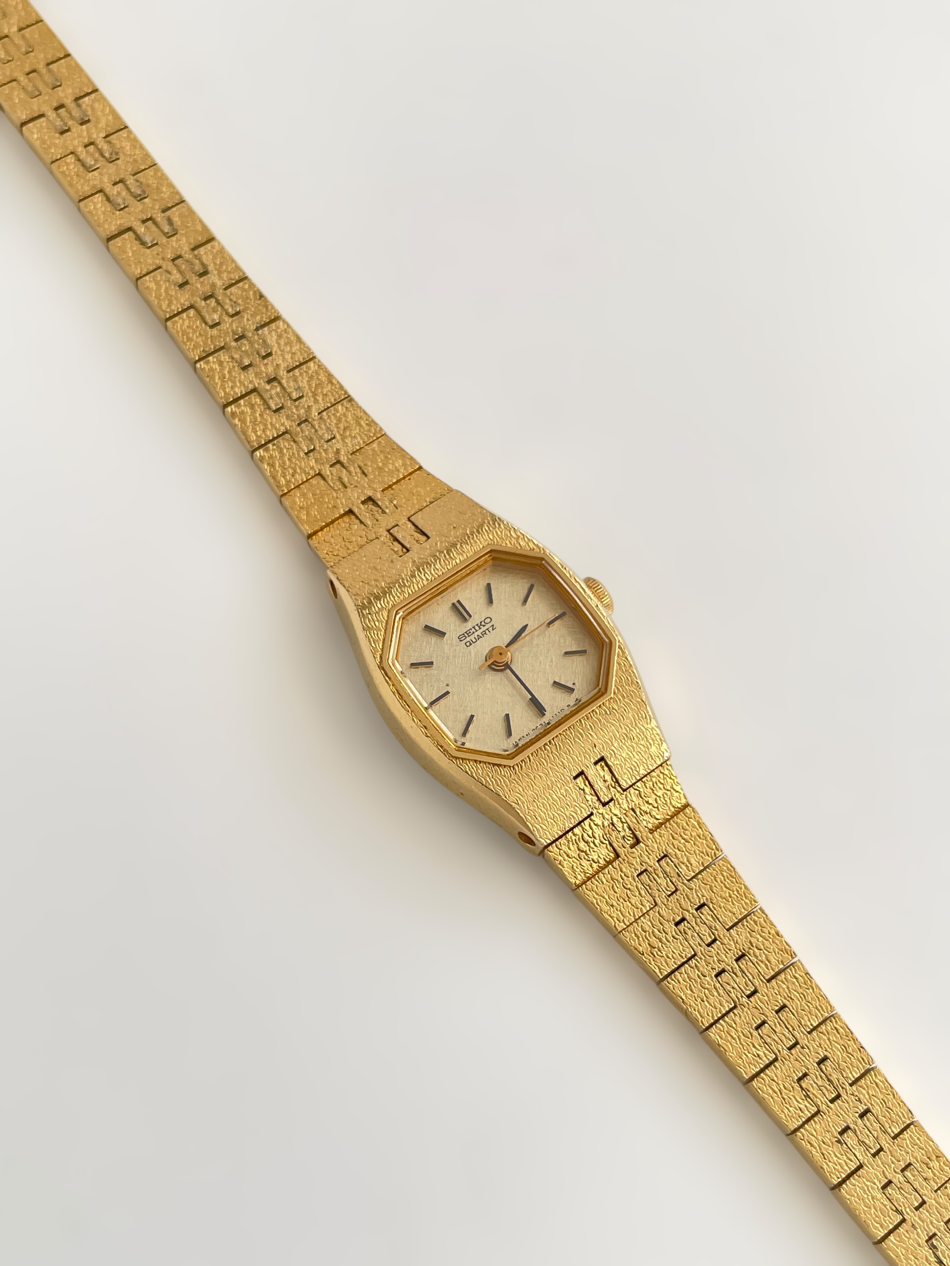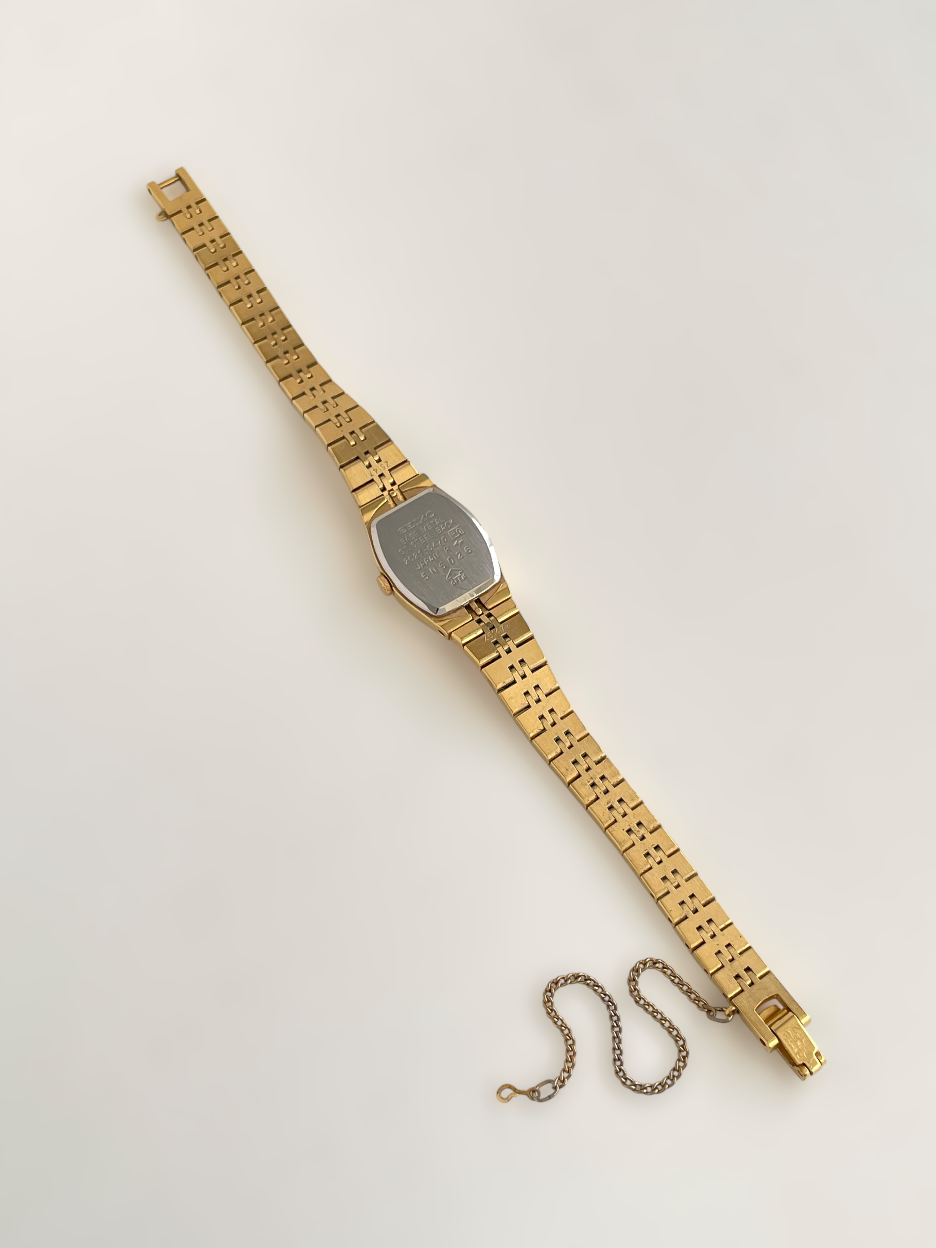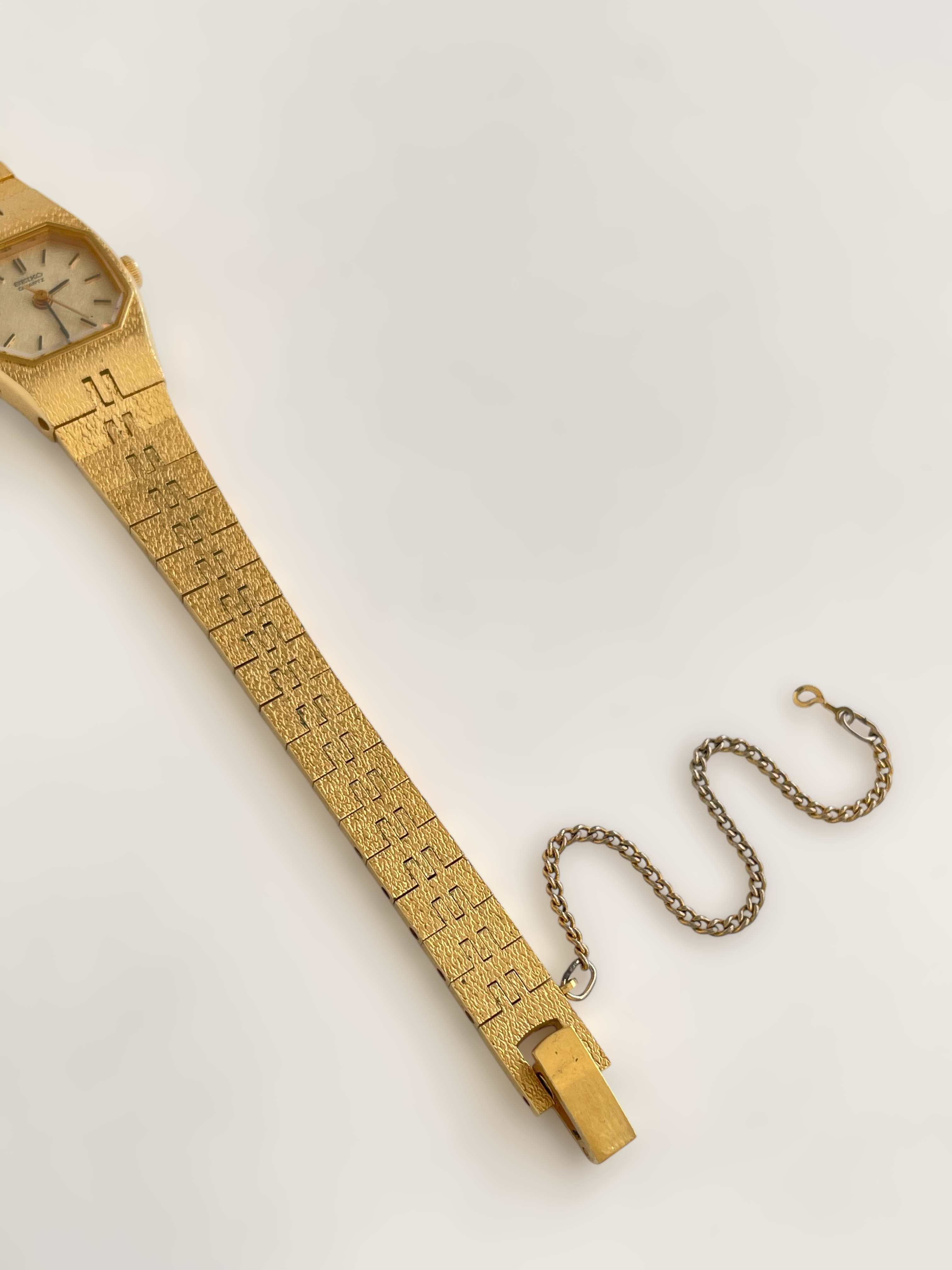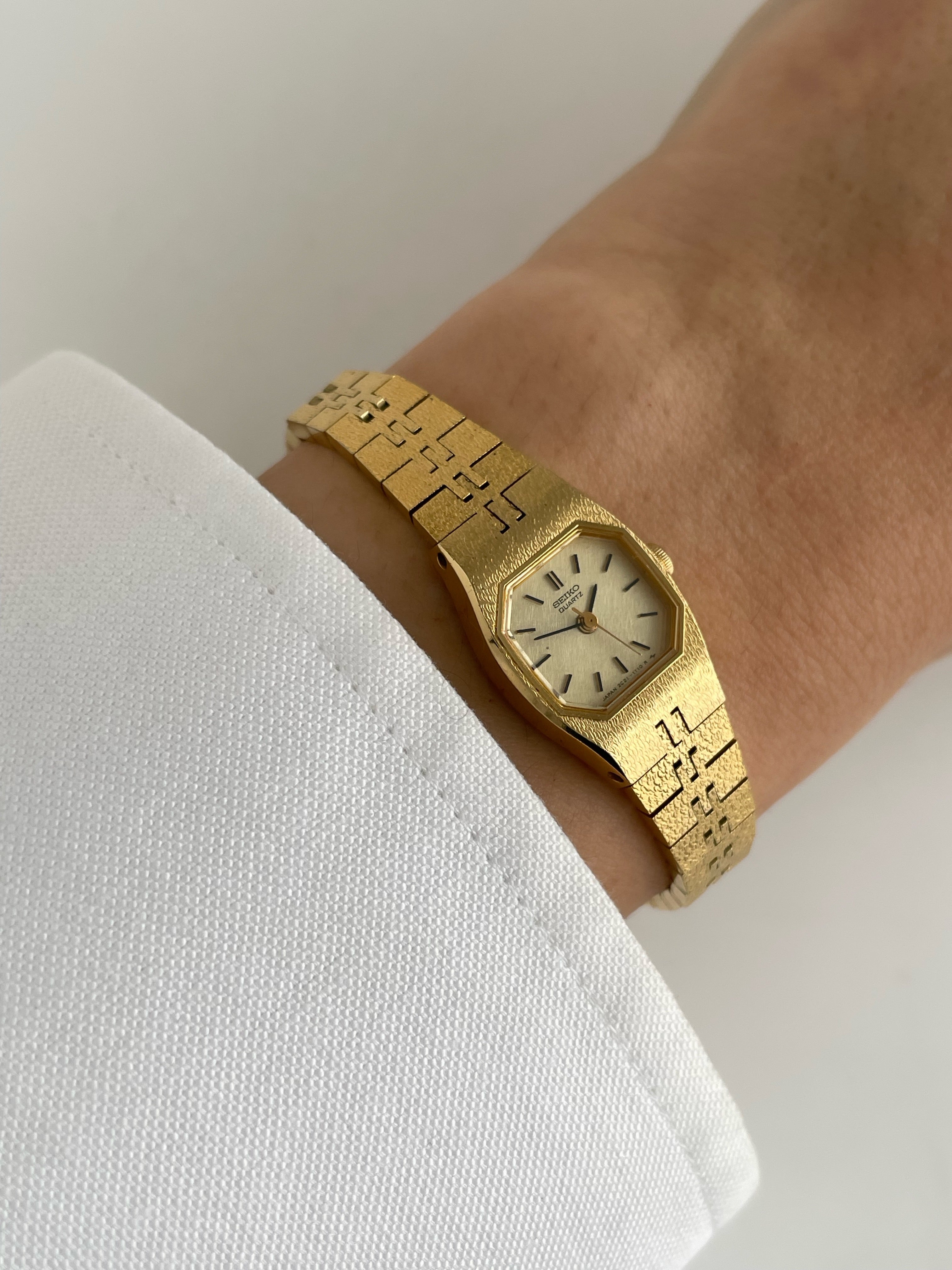 Beautiful vintage and gold plated Seiko watch with a uniqe bracelet design and a petite case. Bracelet clasp closure with removable security chain.