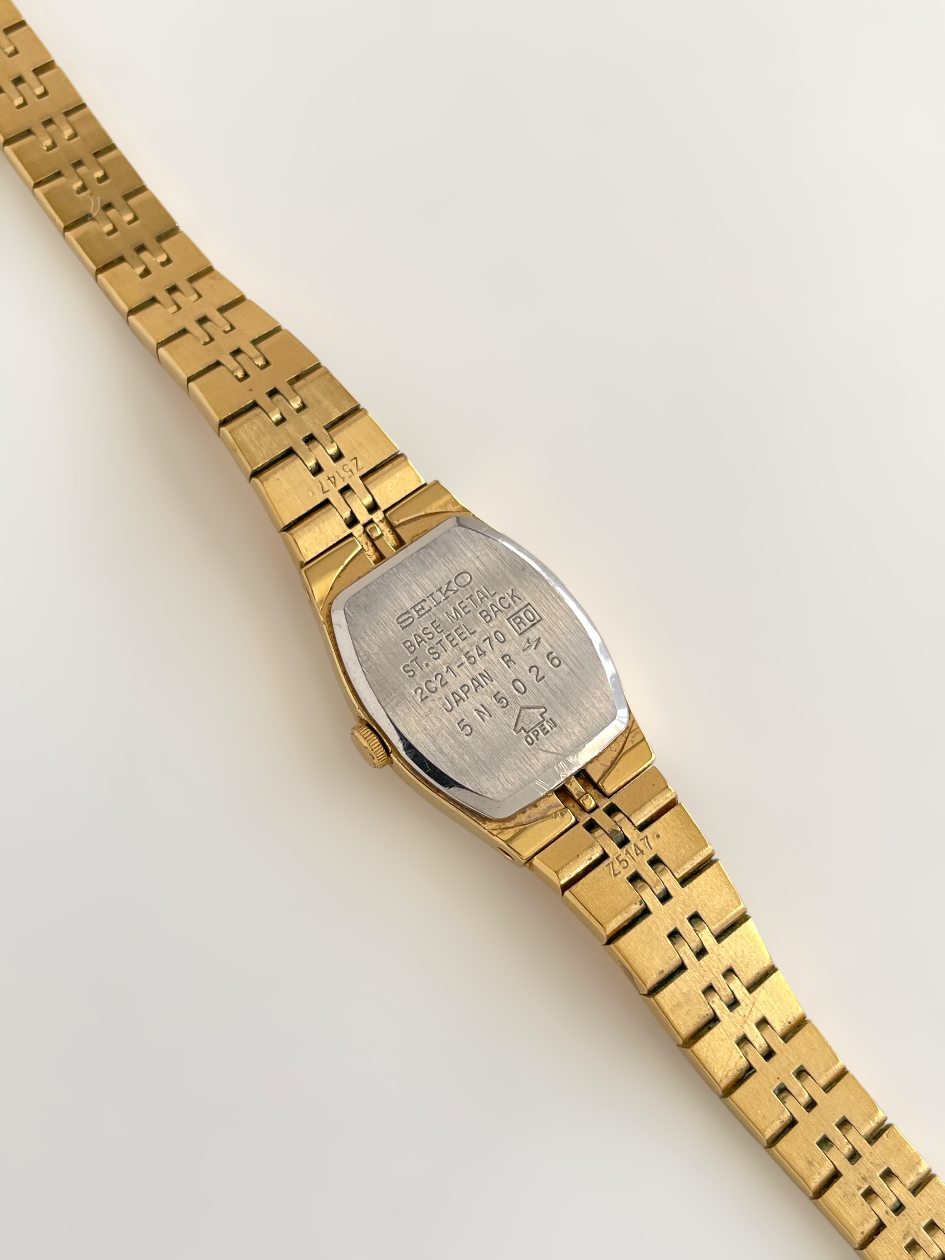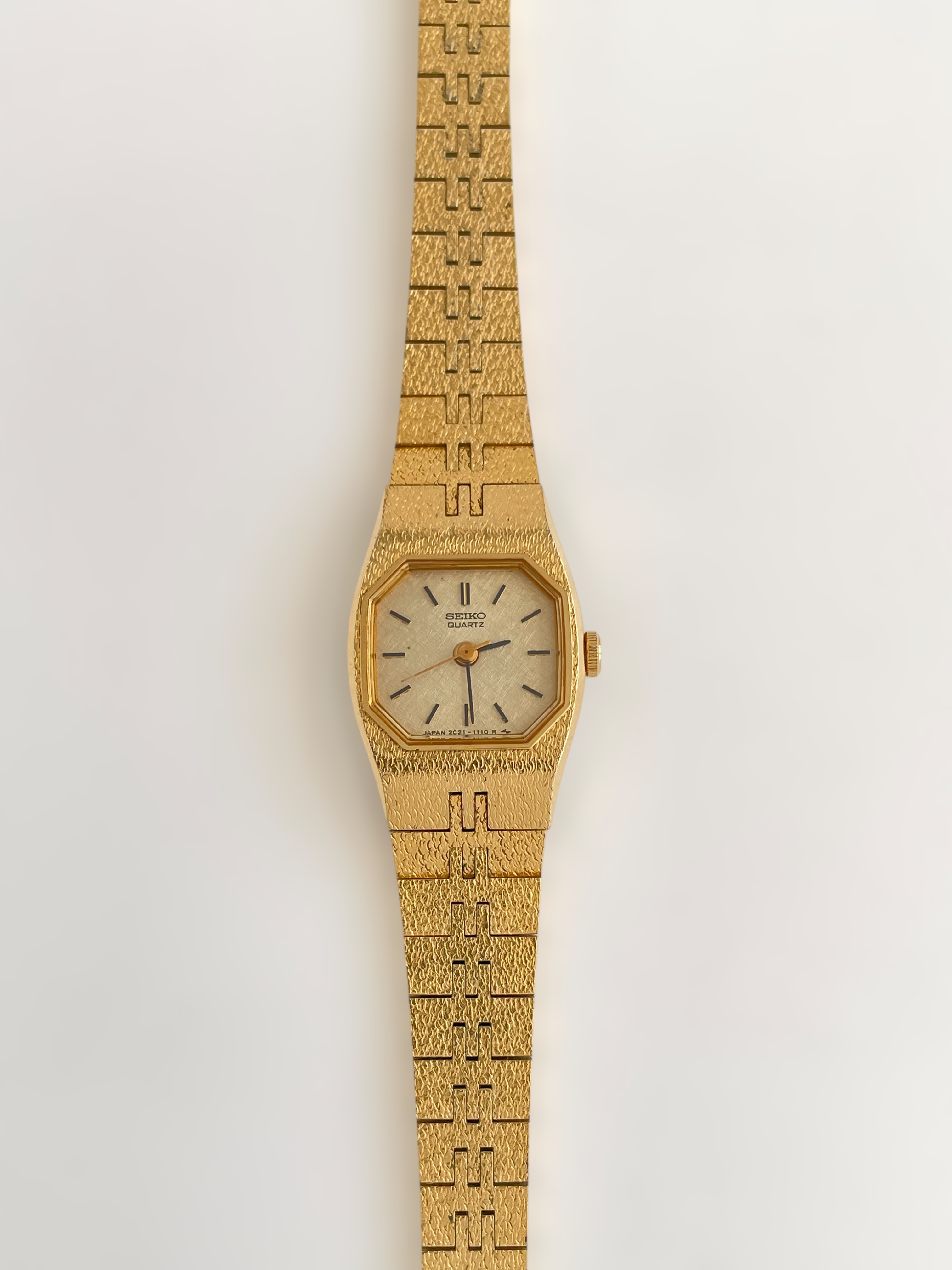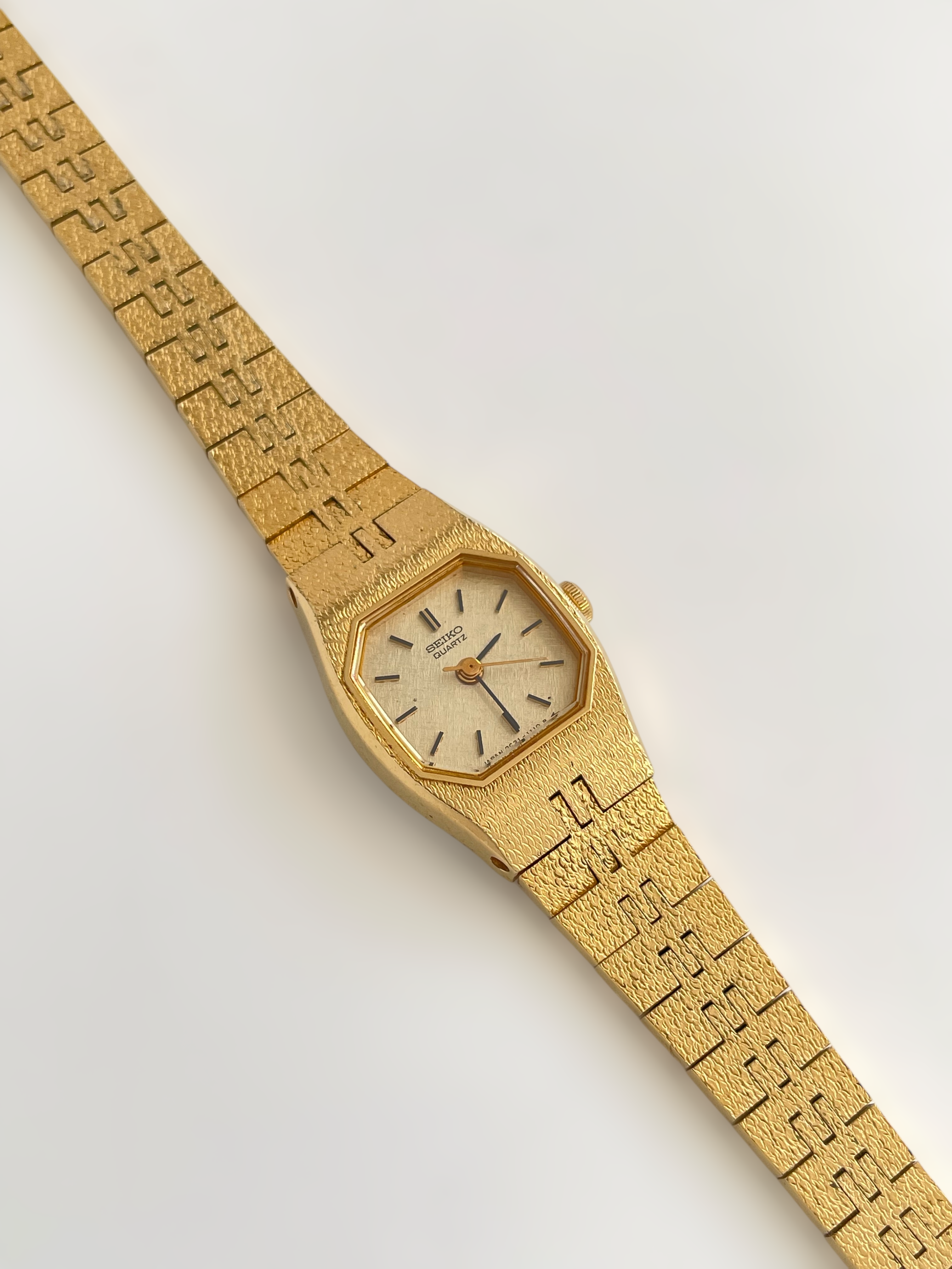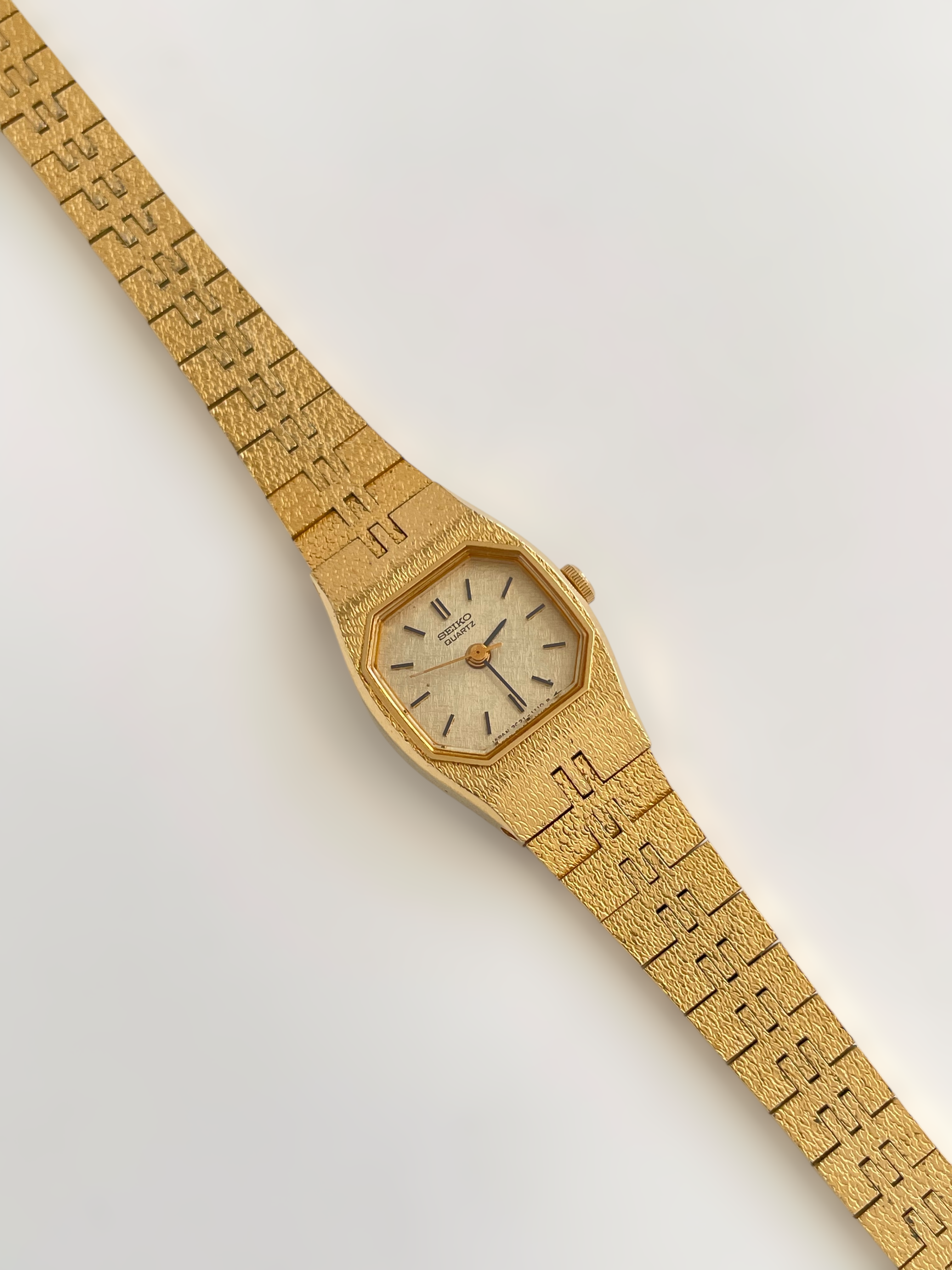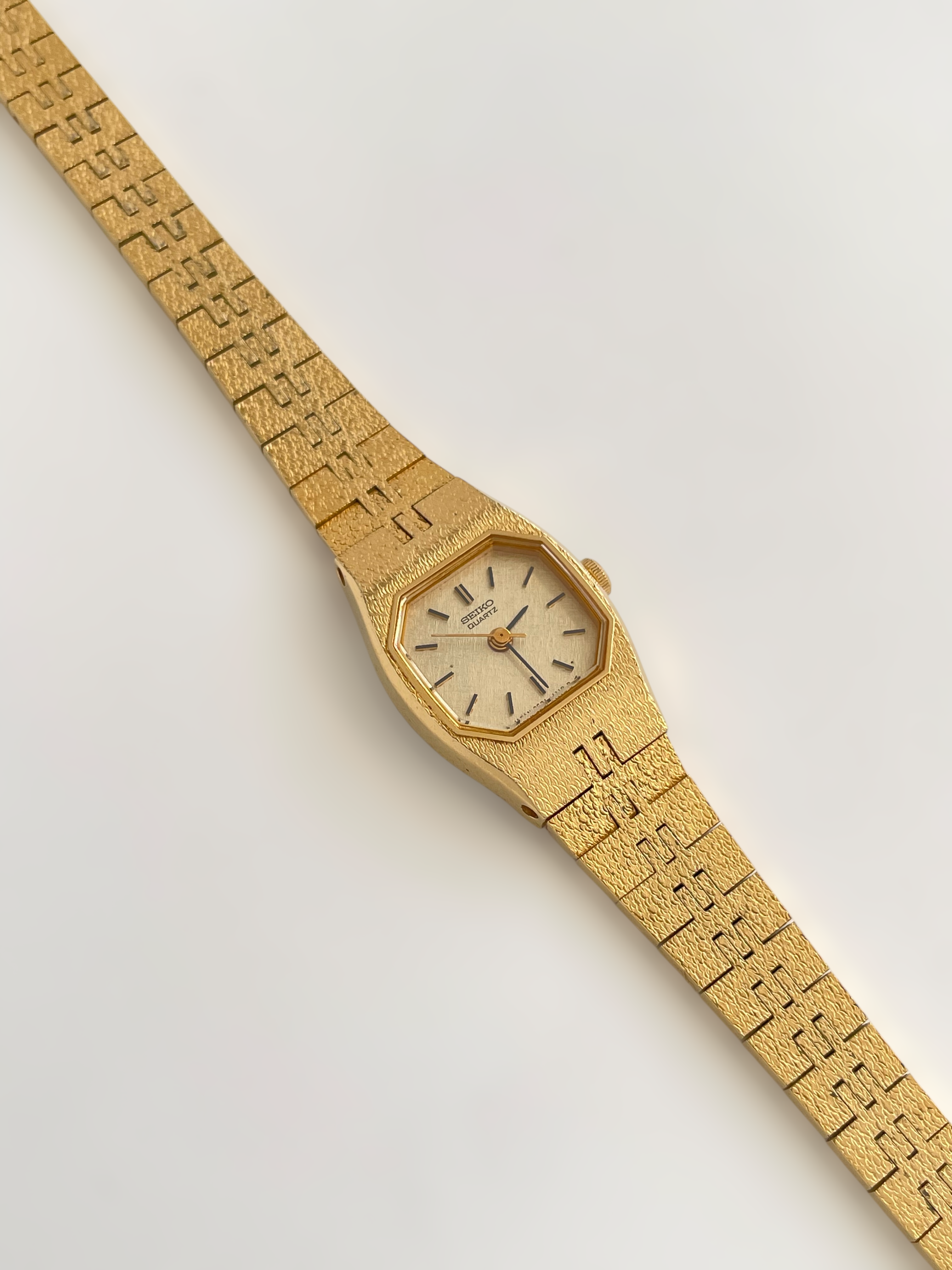 Beautiful vintage and gold plated Seiko watch with a uniqe bracelet design and a petite case. Bracelet clasp closure with removable security chain.