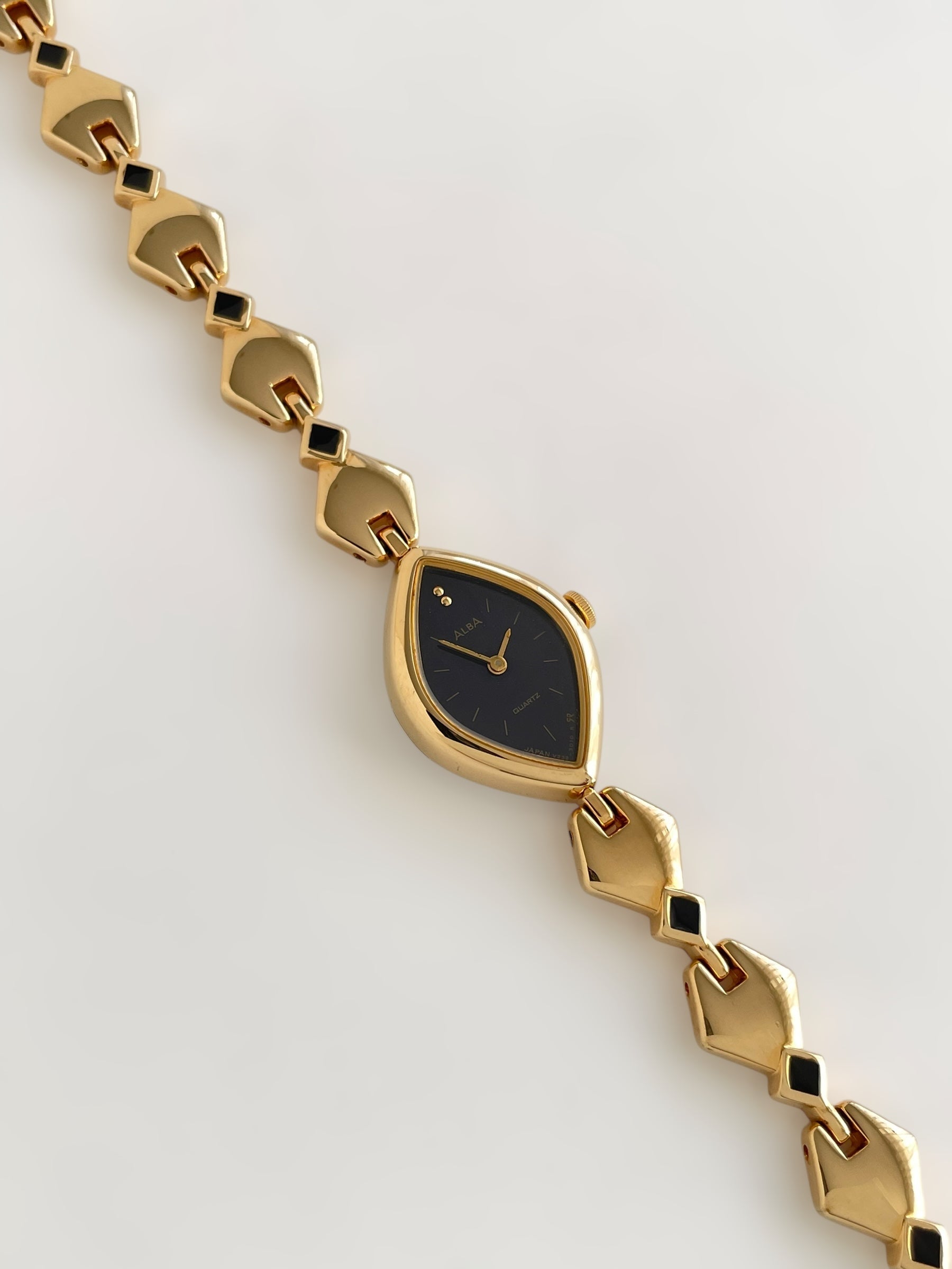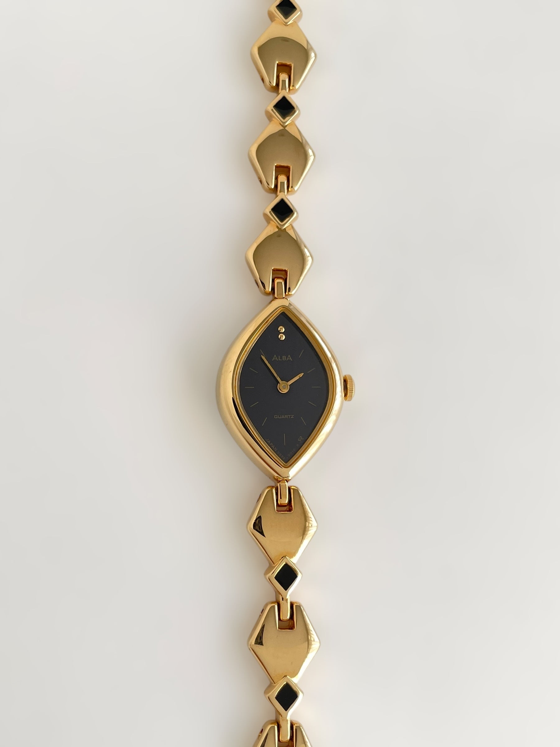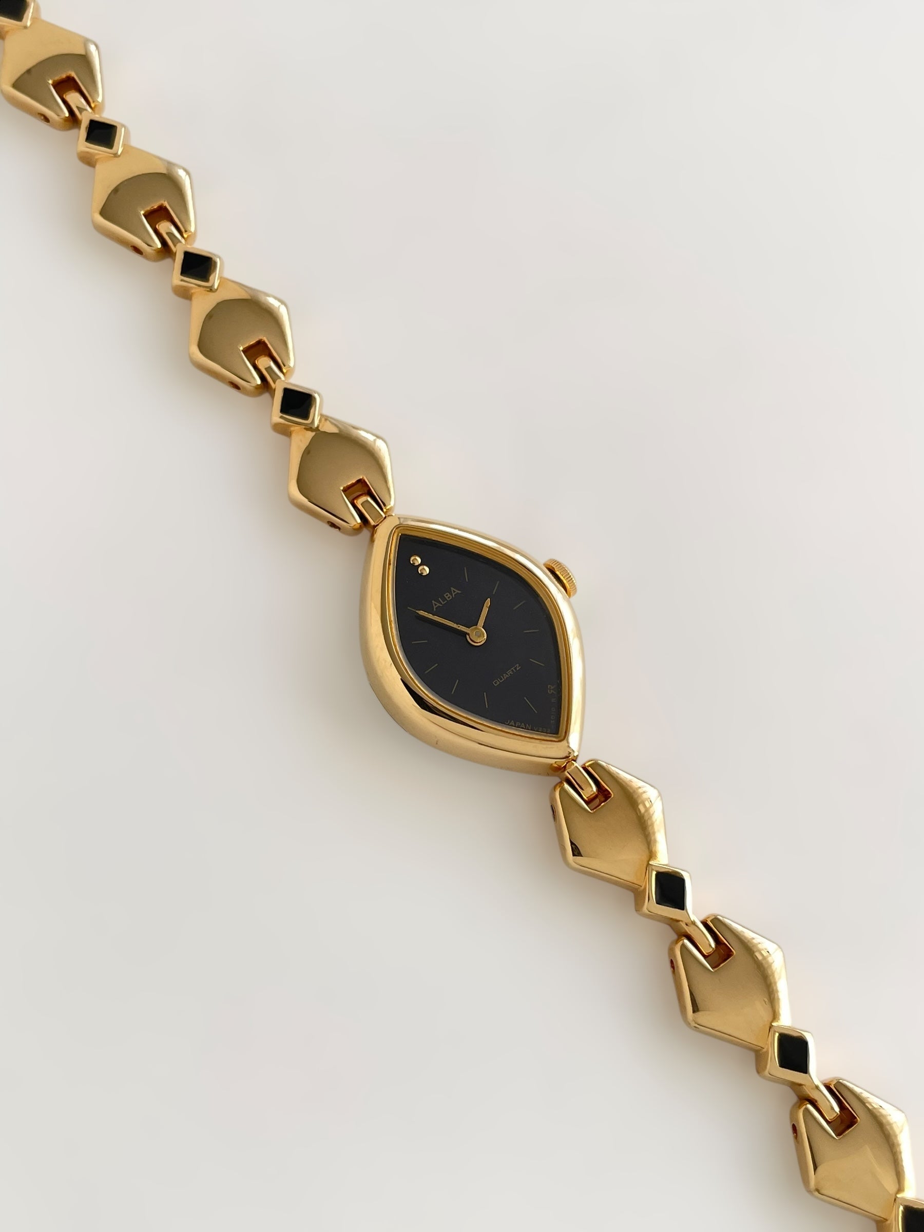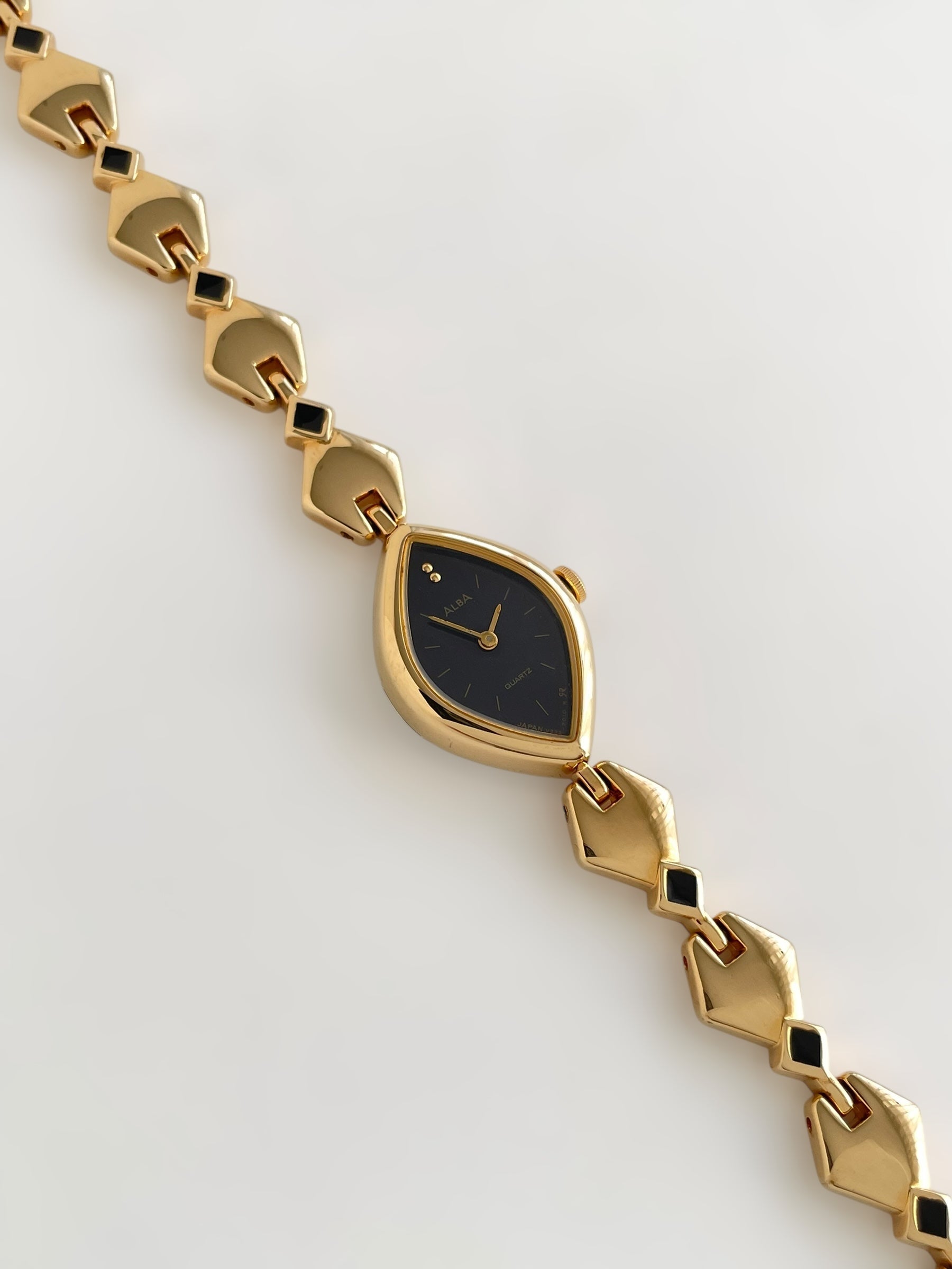 Gorgeous vintage and gold plated Seiko Alba watch with a unique bracelet design adorned with black enamel and a beautiful case adorned with a black dial. Bracelet clasp closure with removable security chain.