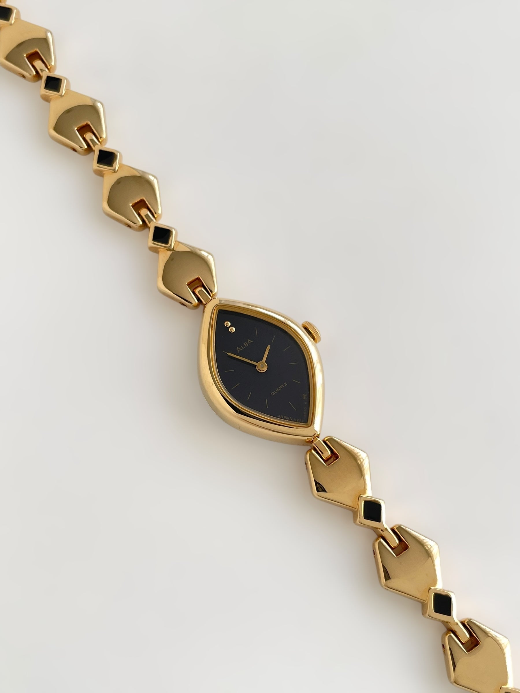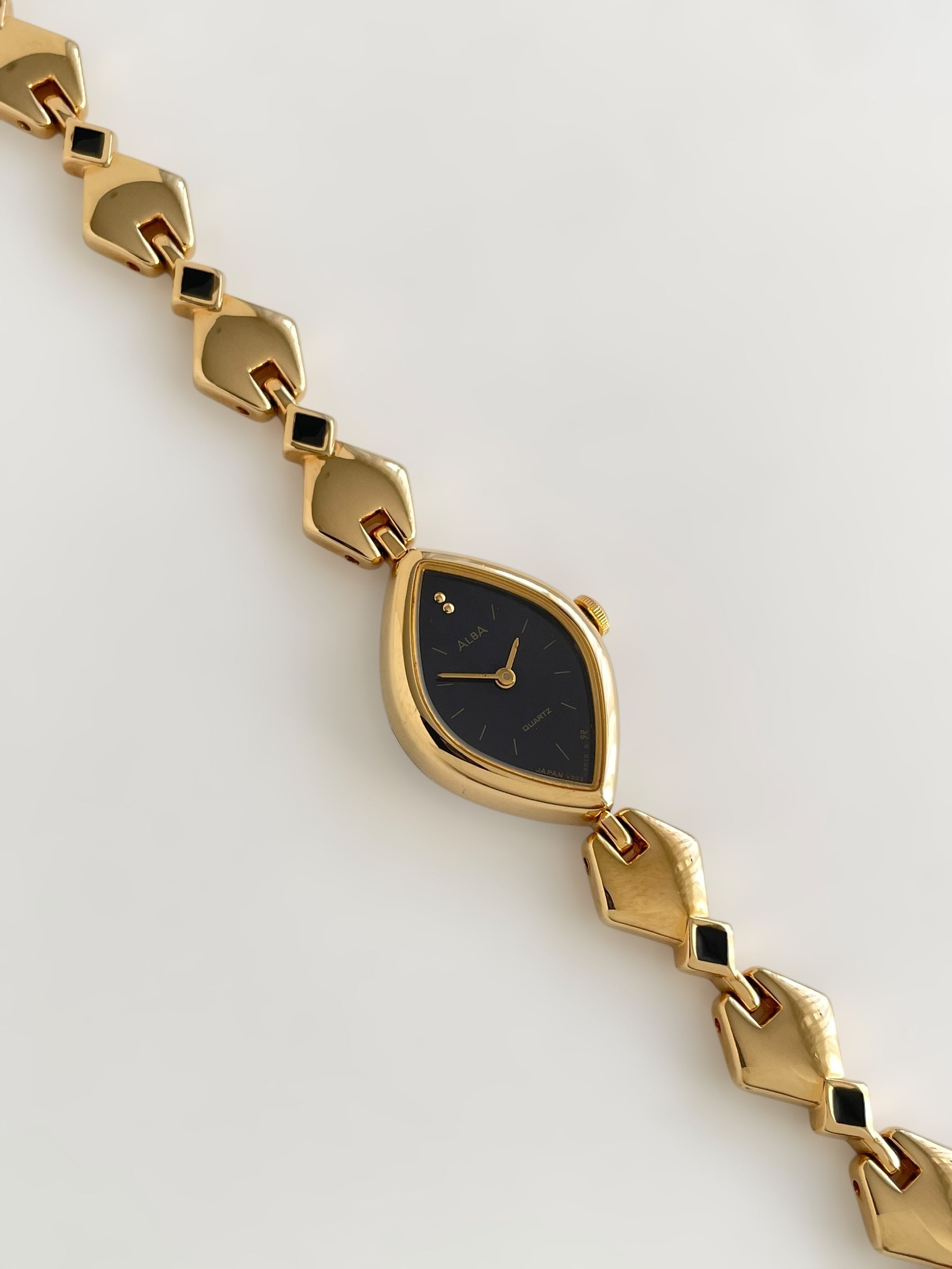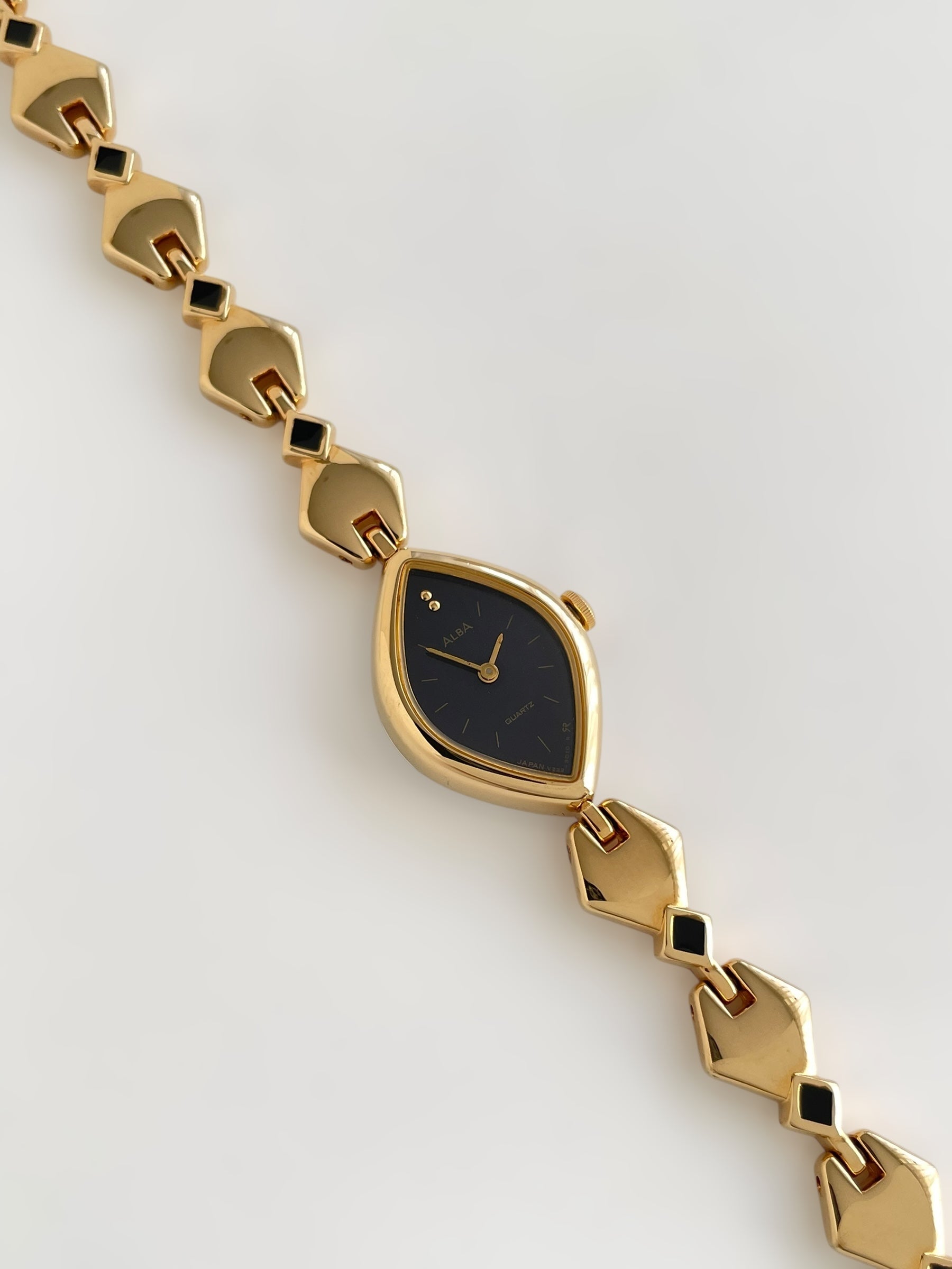 Gorgeous vintage and gold plated Seiko Alba watch with a unique bracelet design adorned with black enamel and a beautiful case adorned with a black dial. Bracelet clasp closure with removable security chain.