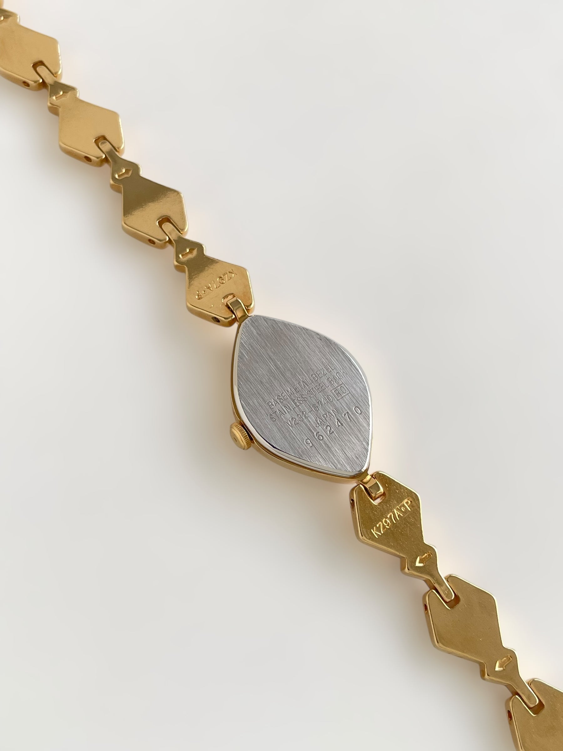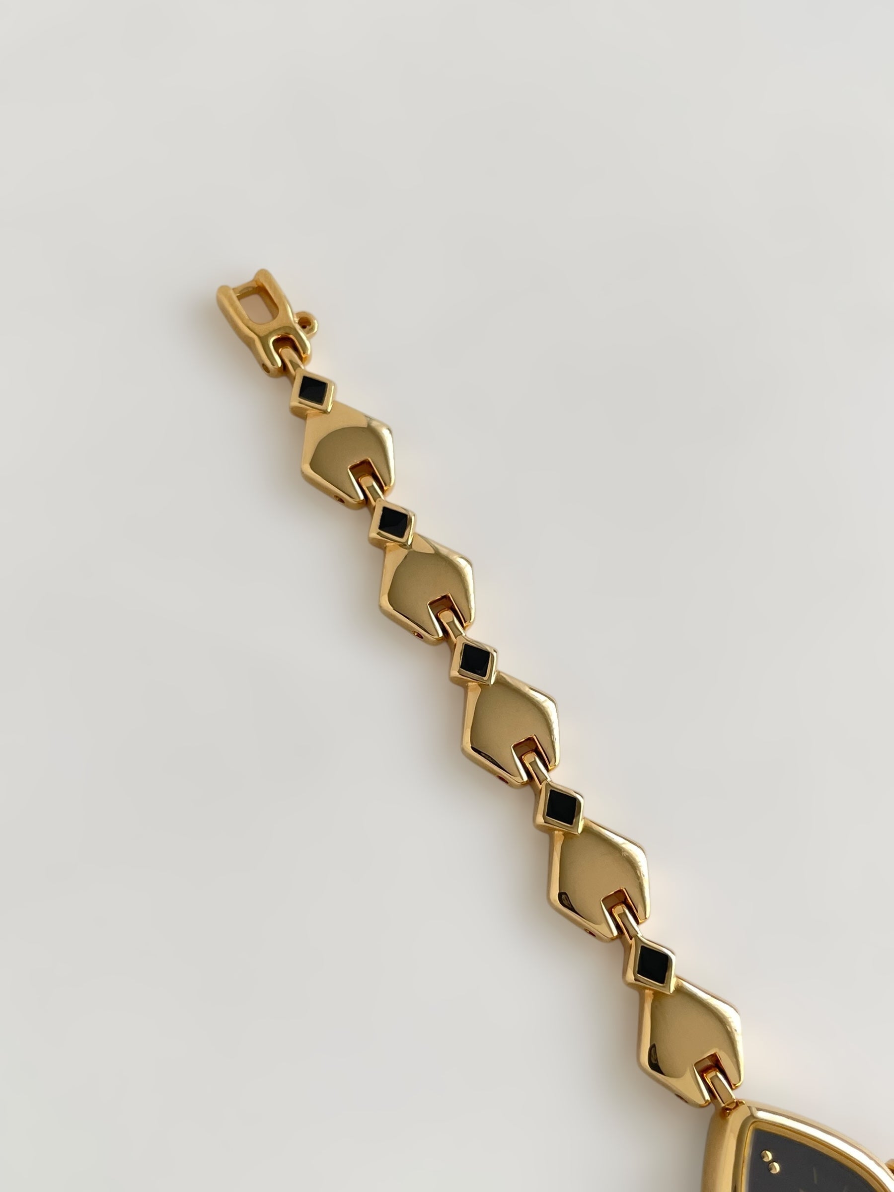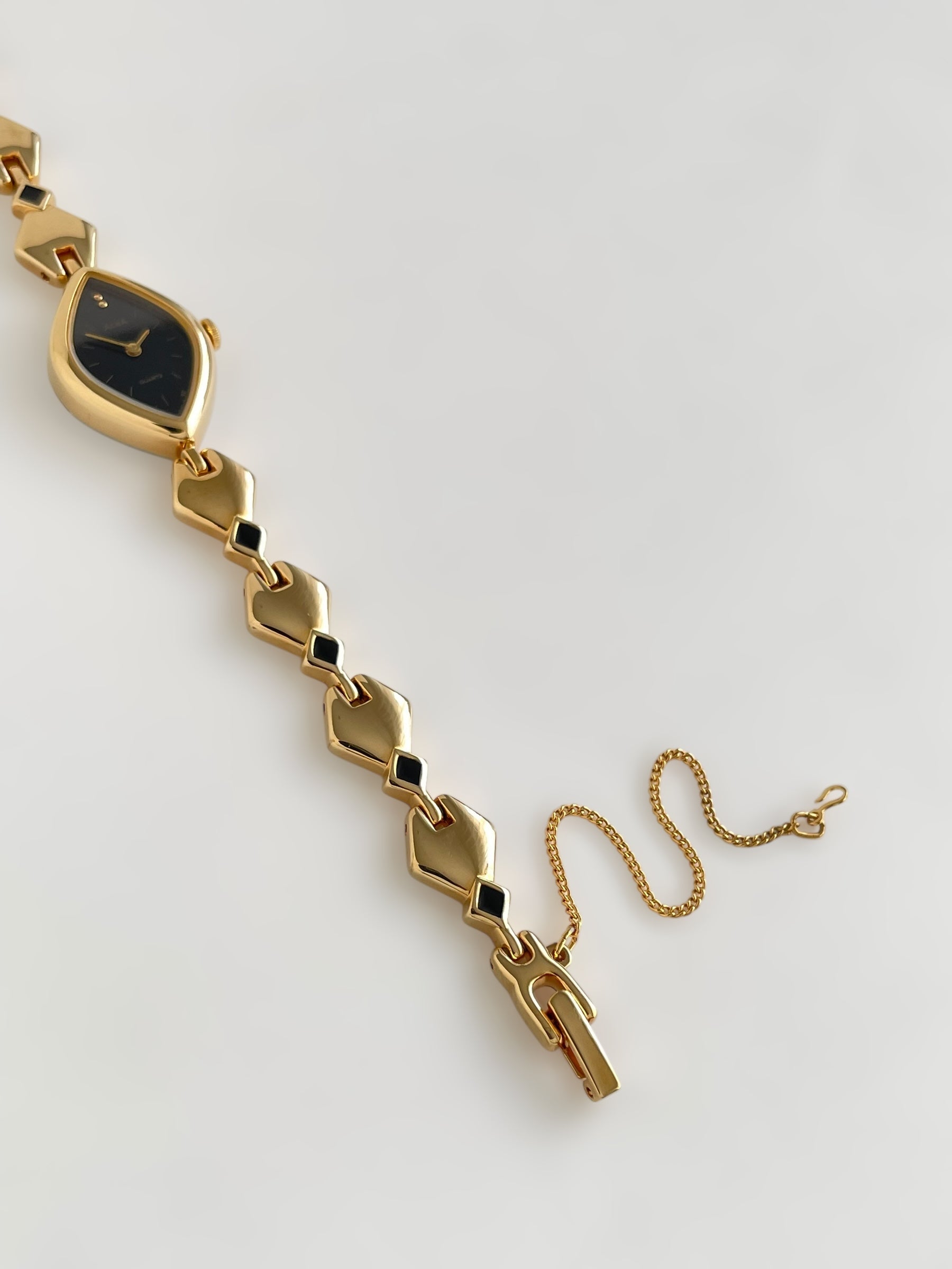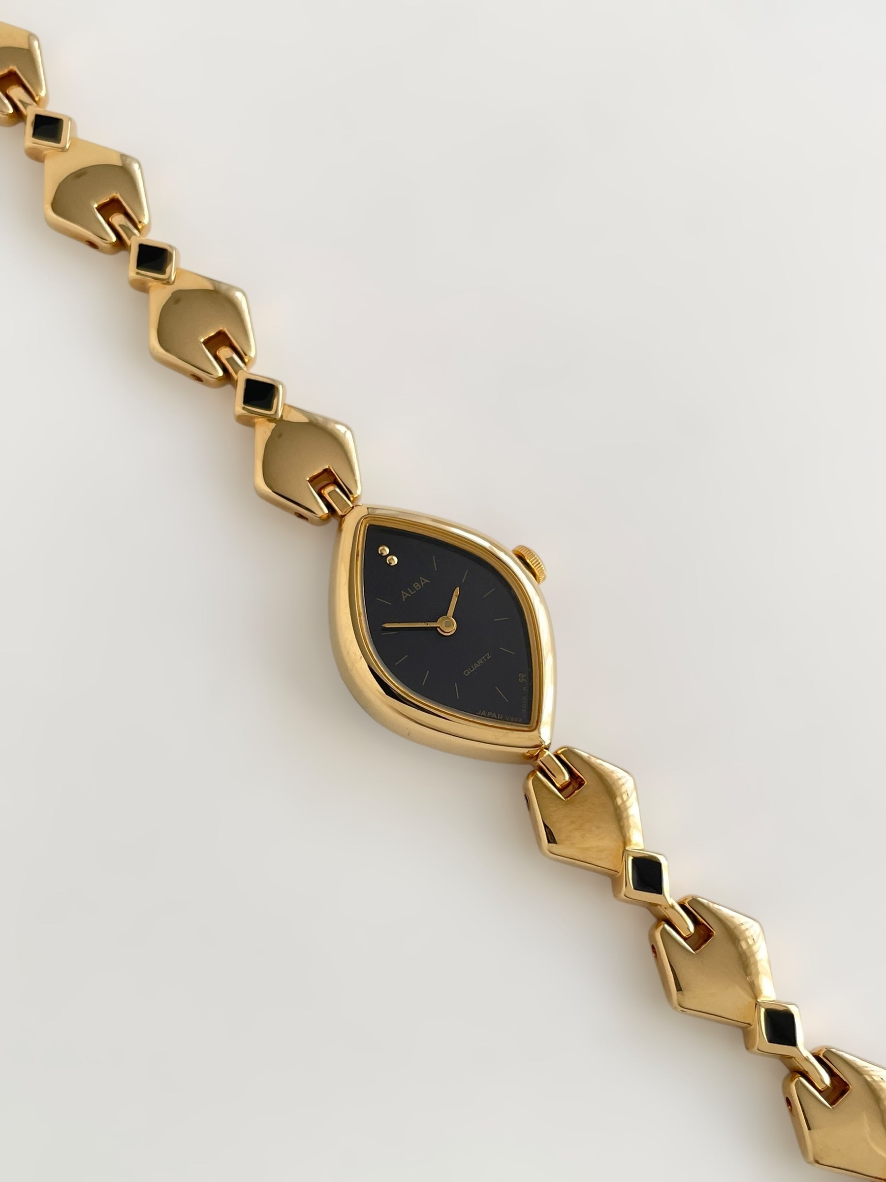 Gorgeous vintage and gold plated Seiko Alba watch with a unique bracelet design adorned with black enamel and a beautiful case adorned with a black dial. Bracelet clasp closure with removable security chain.