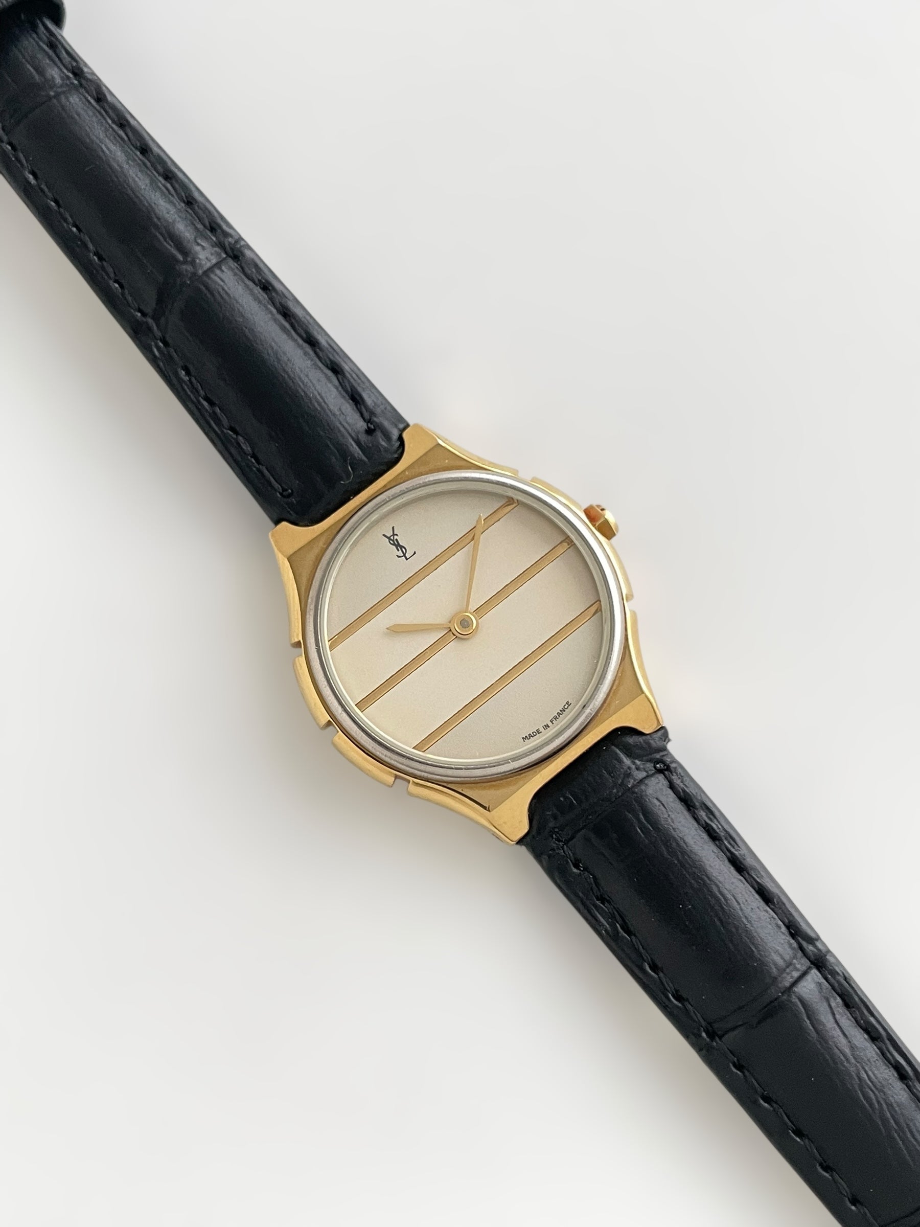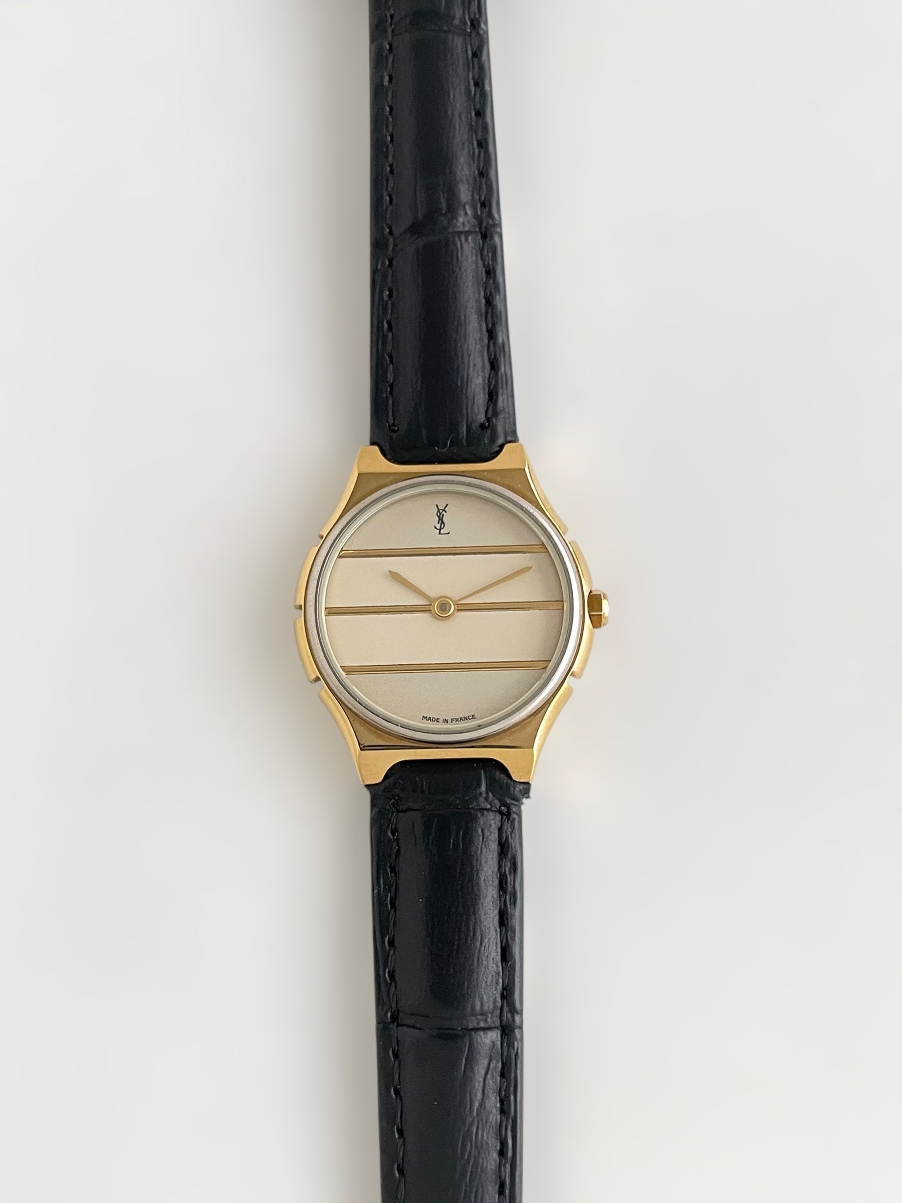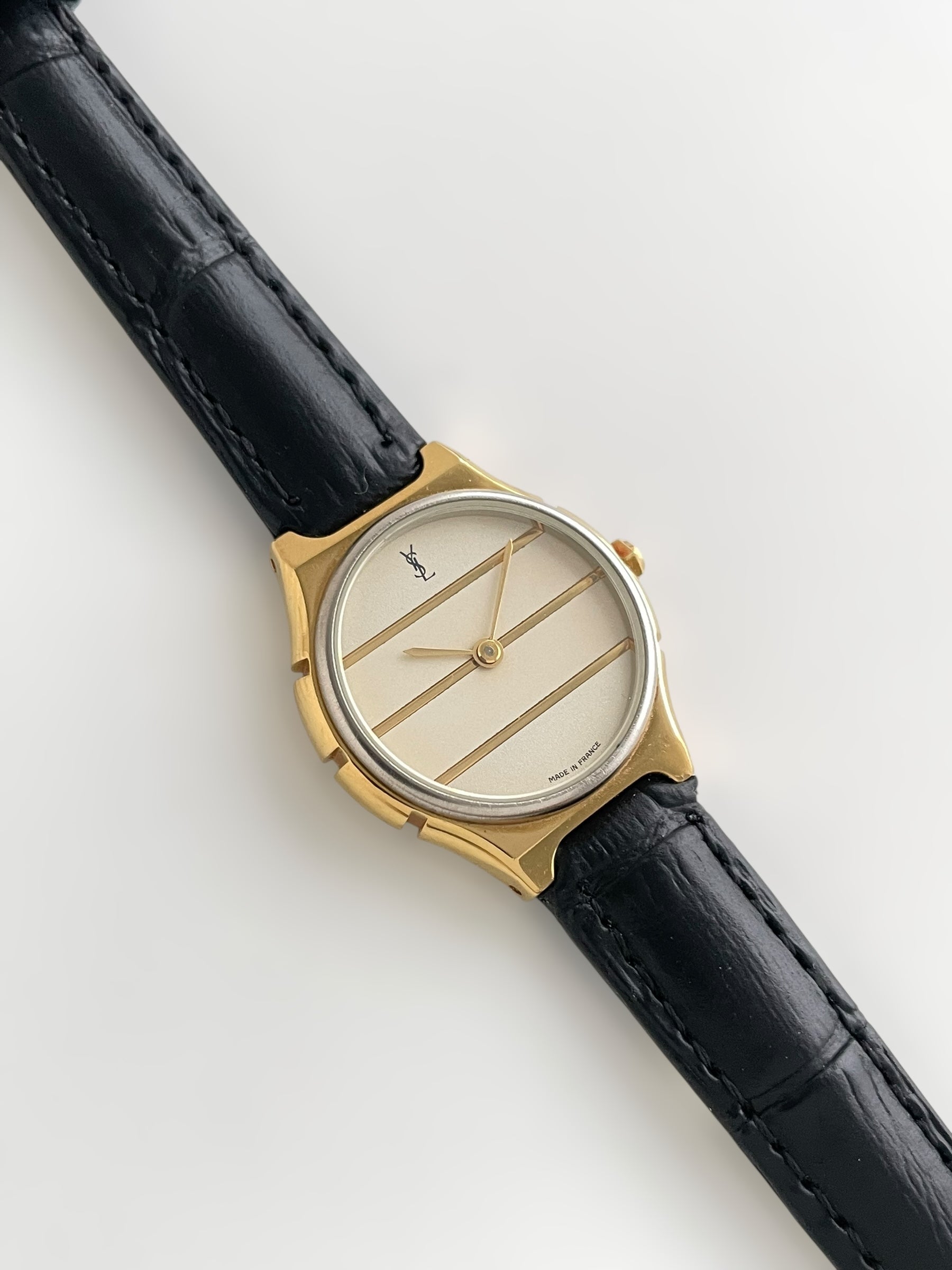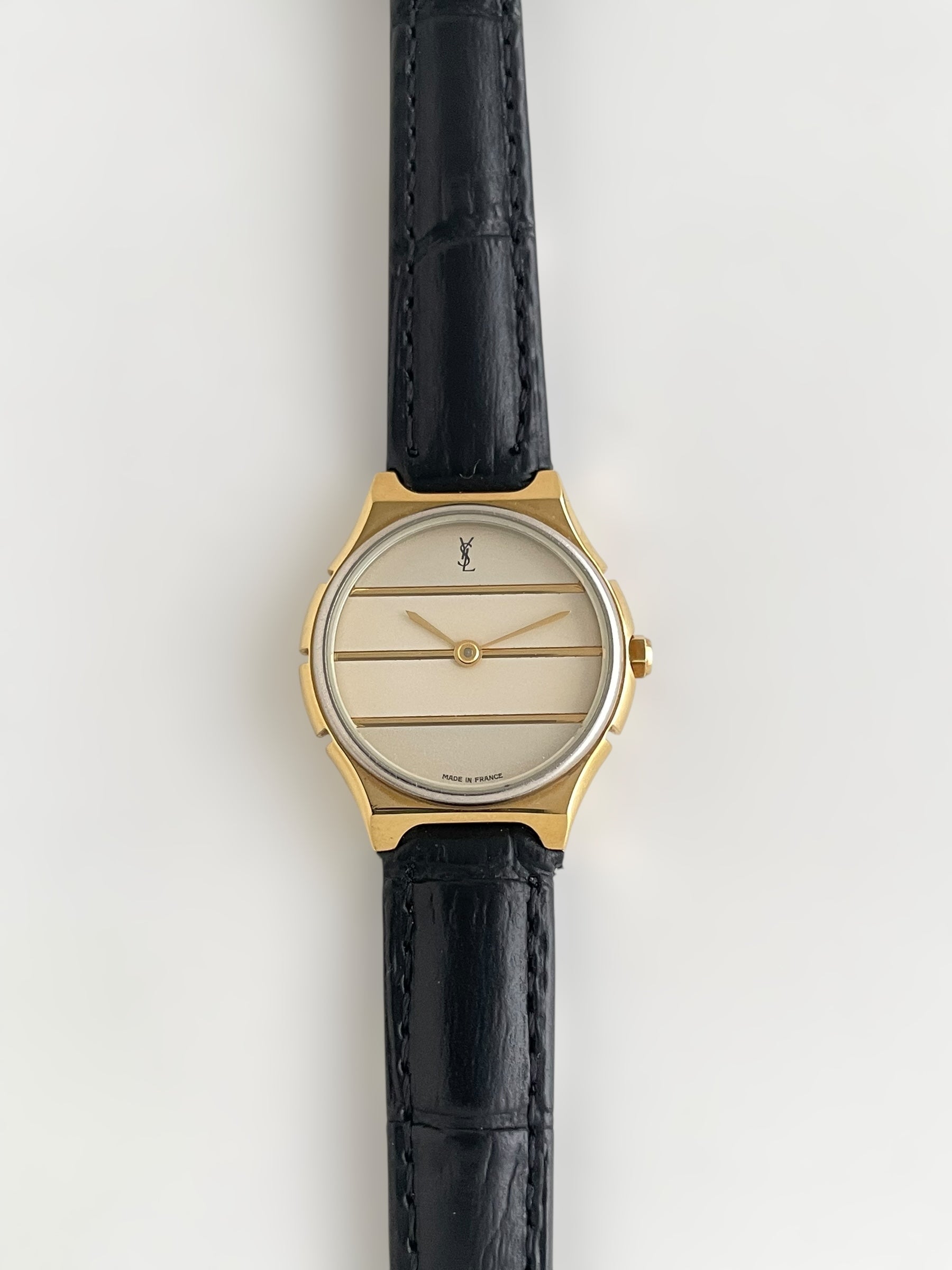 Gorgeous vintage and gold plated Yves Saint Laurent watch with newly fitted croc straps and a round dial adorned with a contrast striped face.