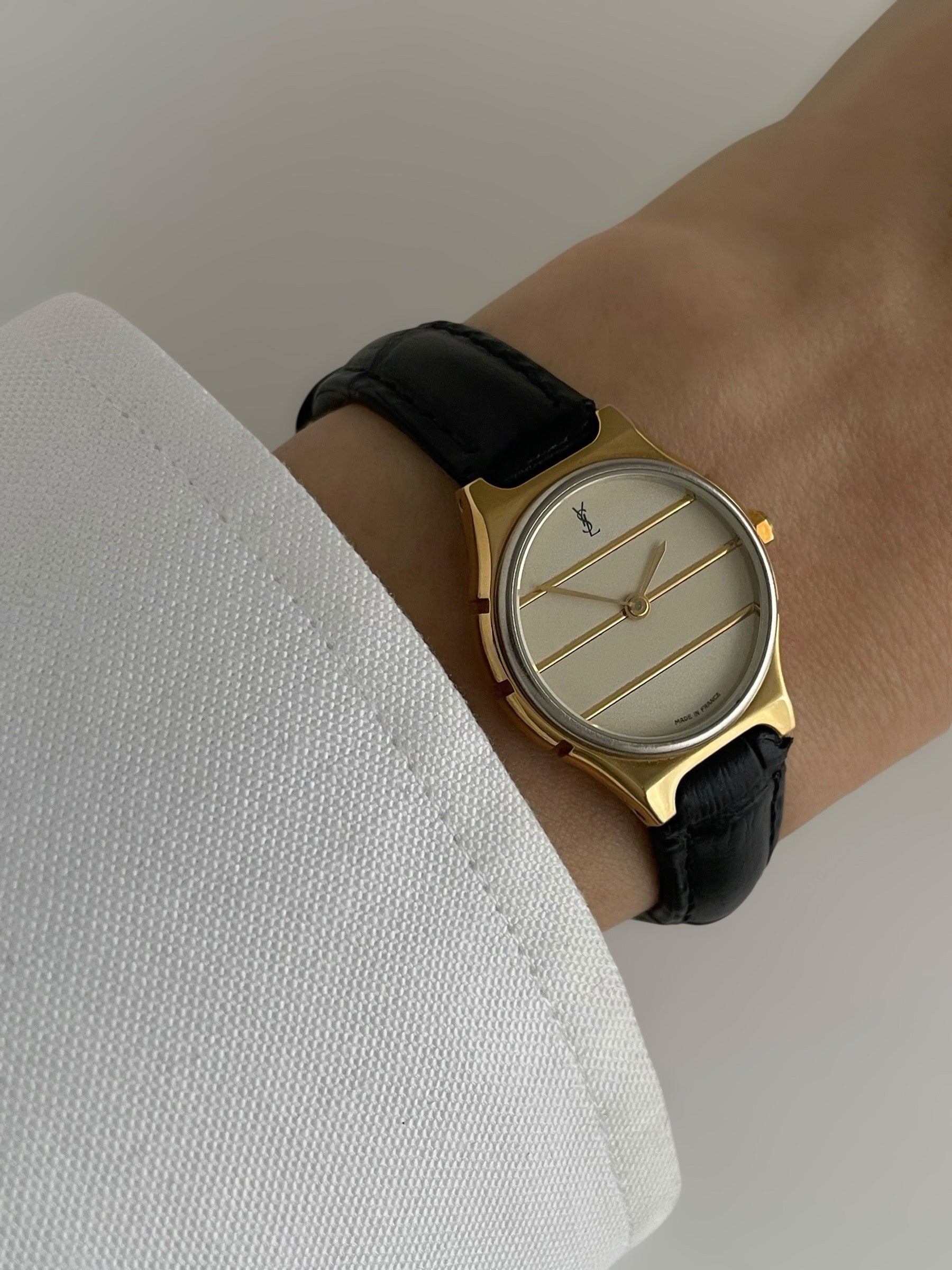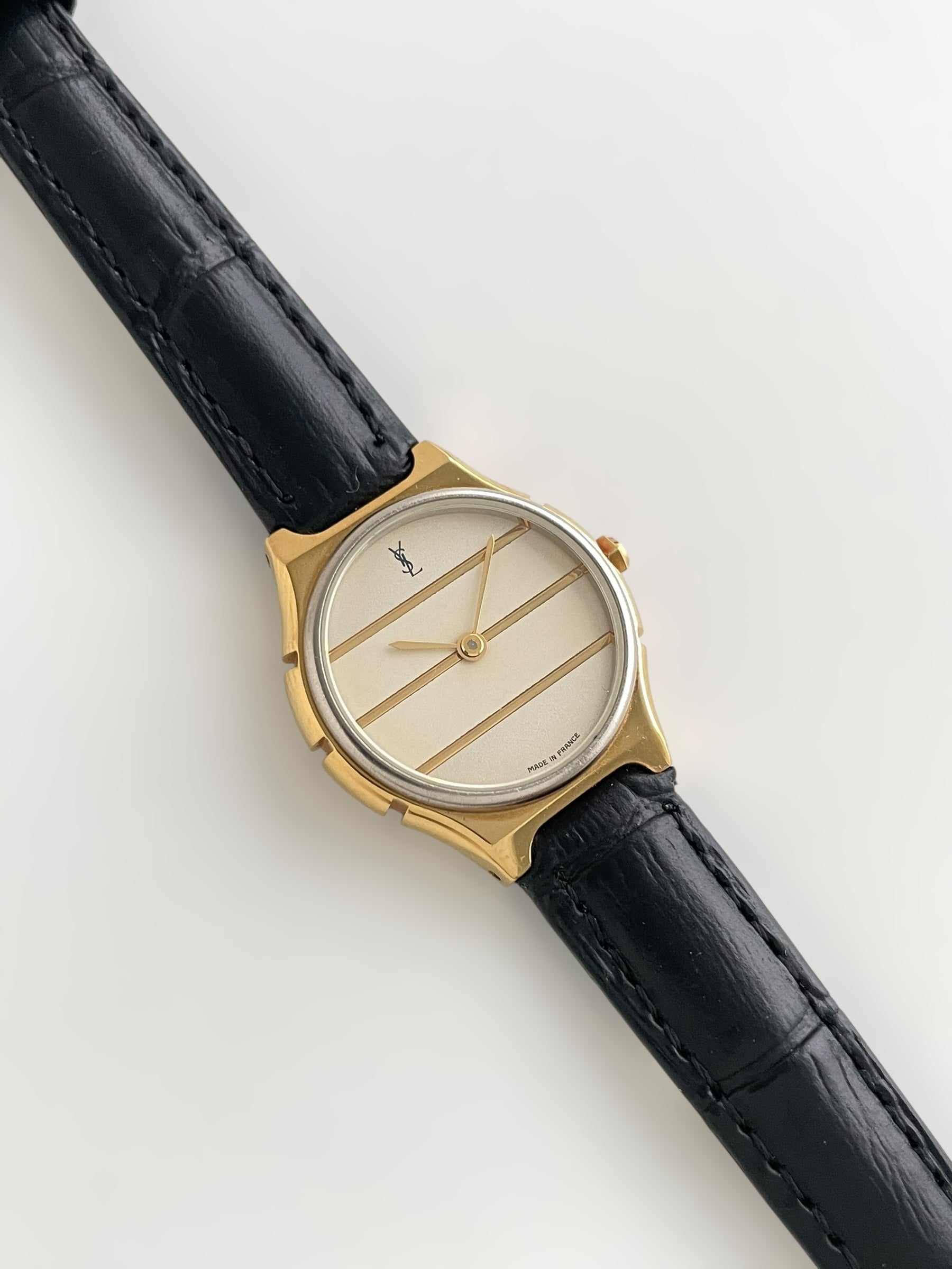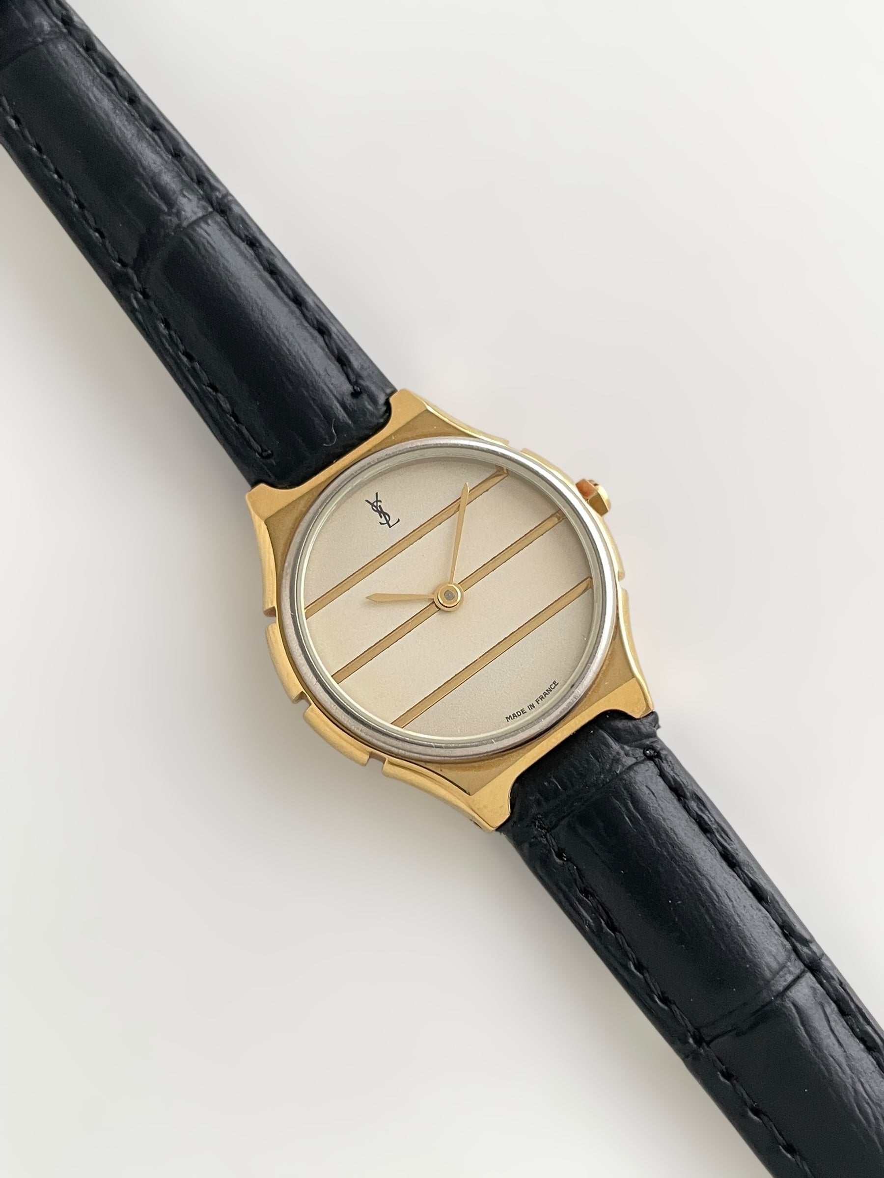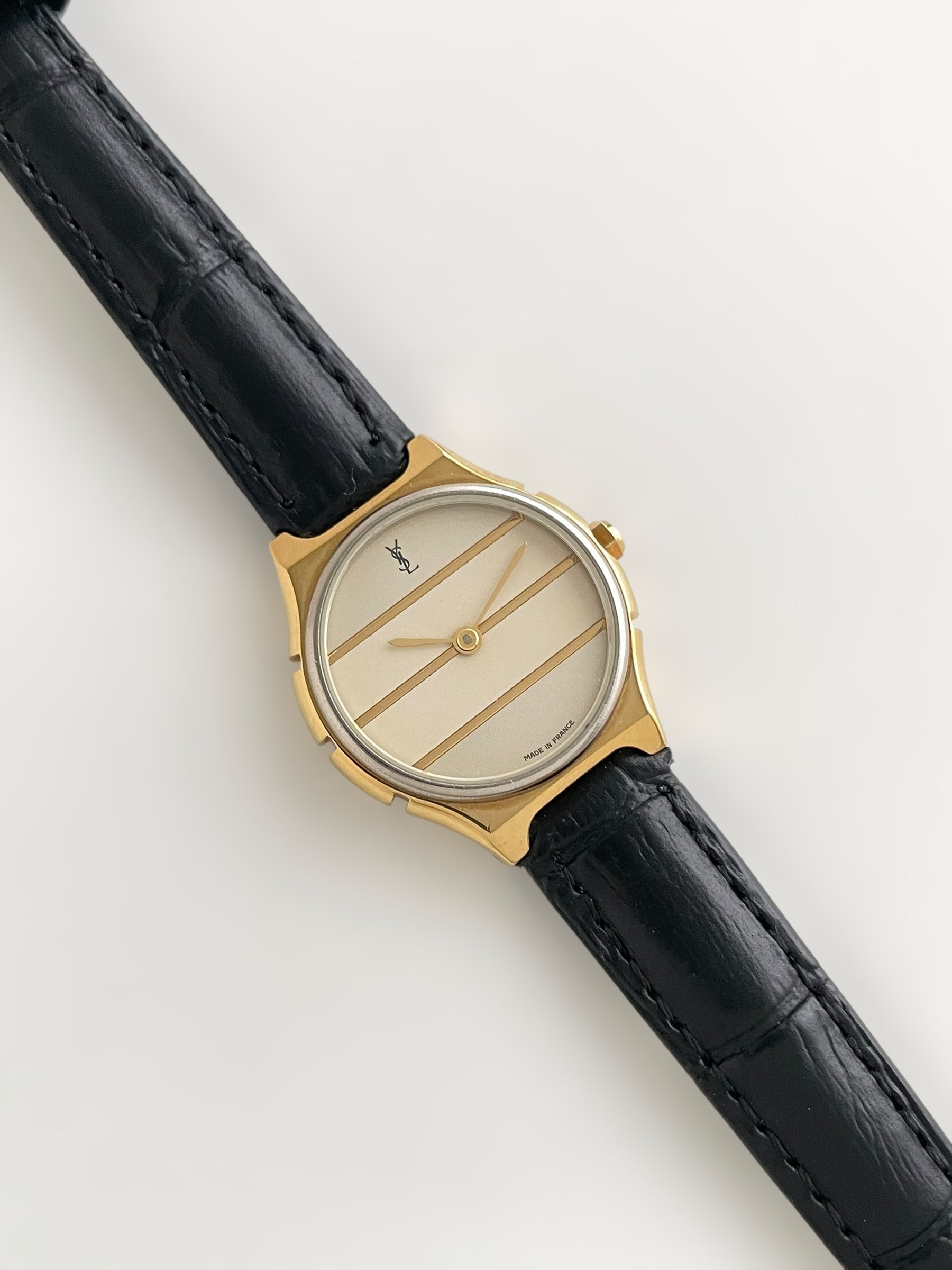 Gorgeous vintage and gold plated Yves Saint Laurent watch with newly fitted croc straps and a round dial adorned with a contrast striped face.