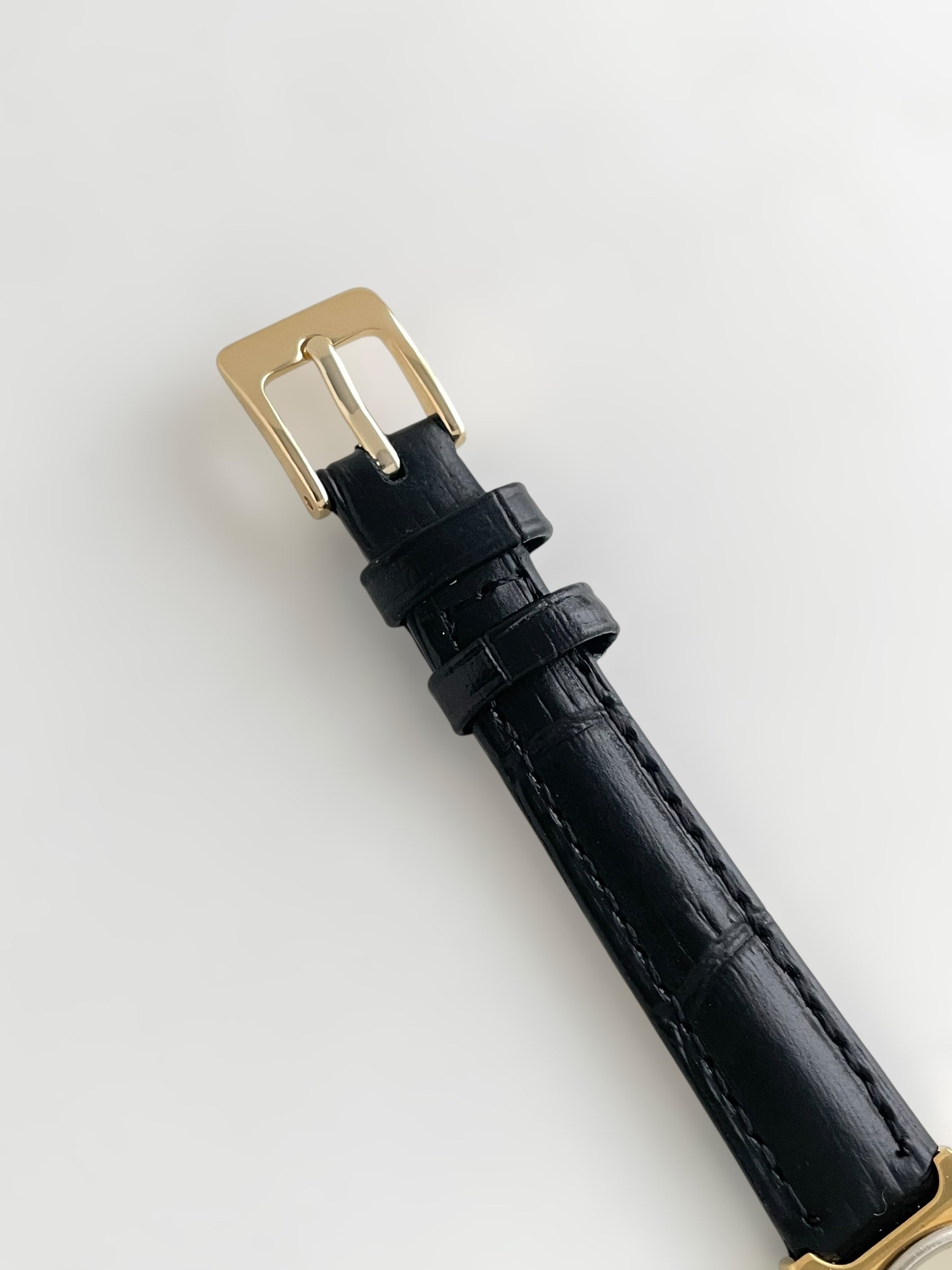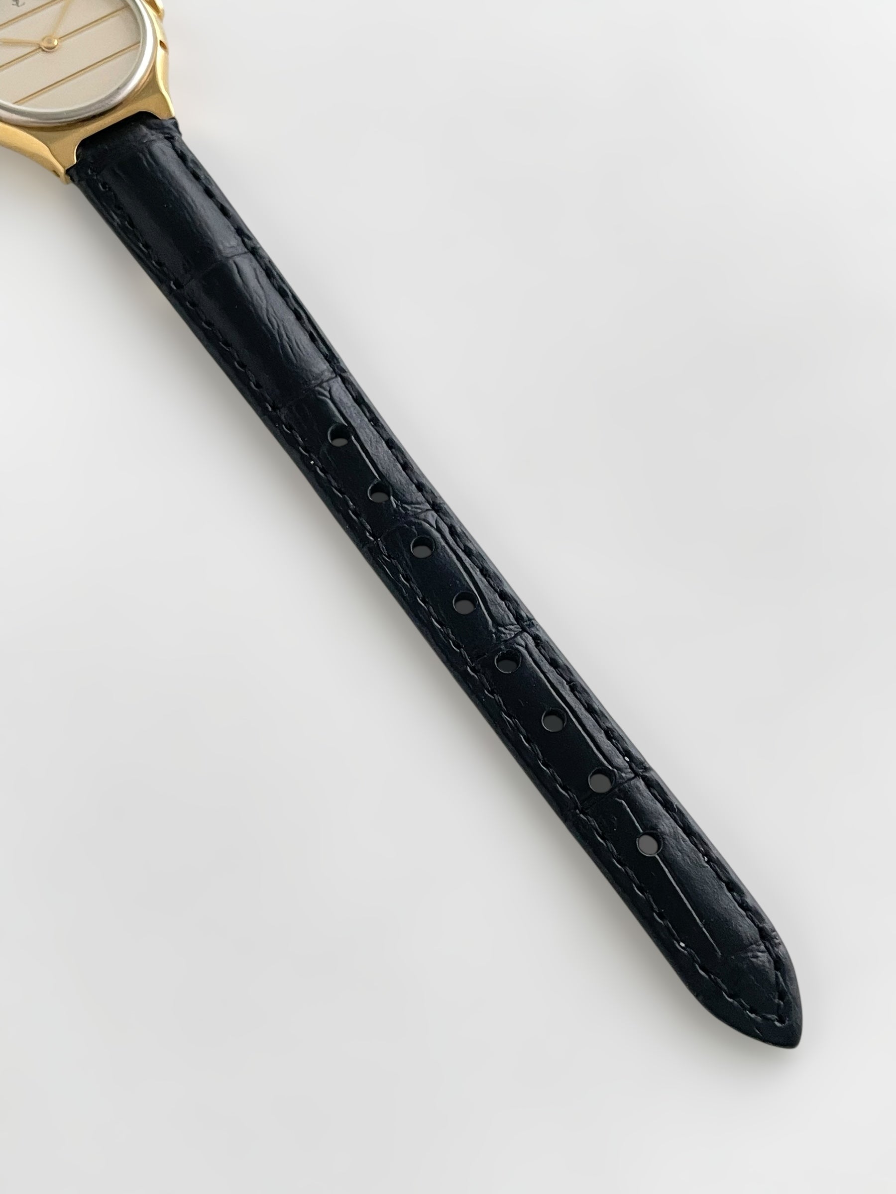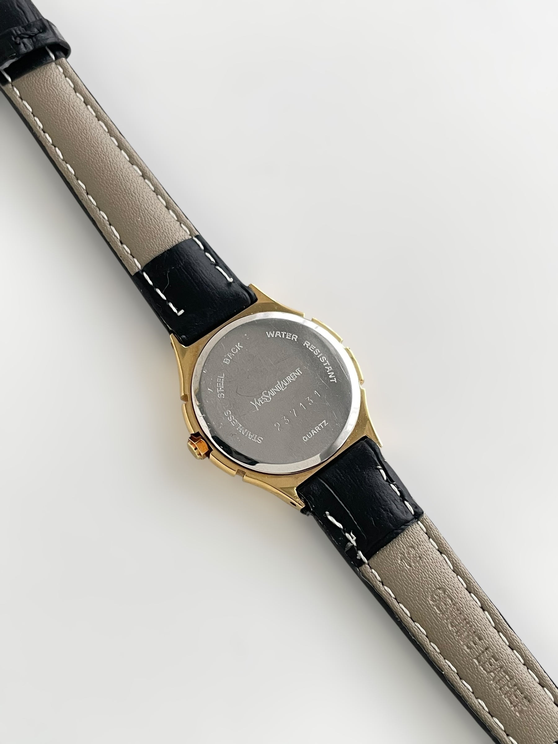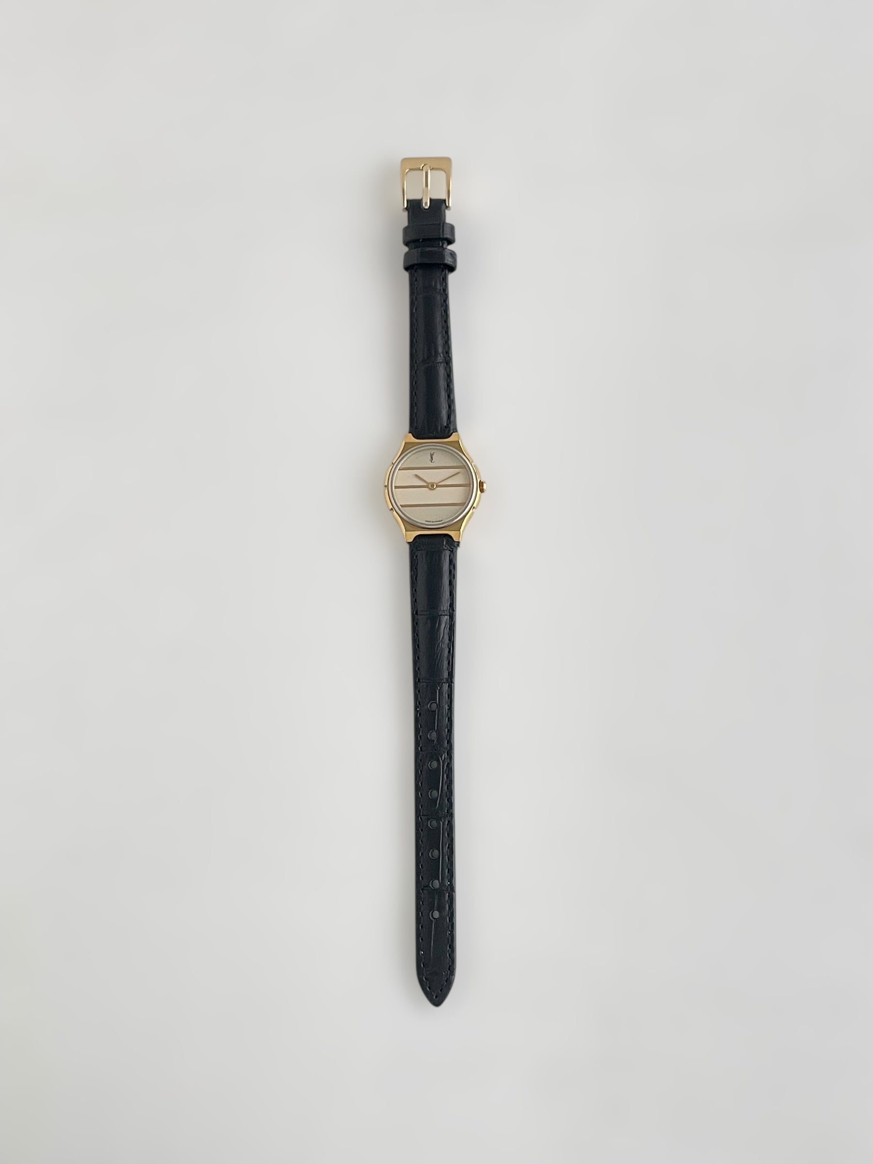 Gorgeous vintage and gold plated Yves Saint Laurent watch with newly fitted croc straps and a round dial adorned with a contrast striped face.