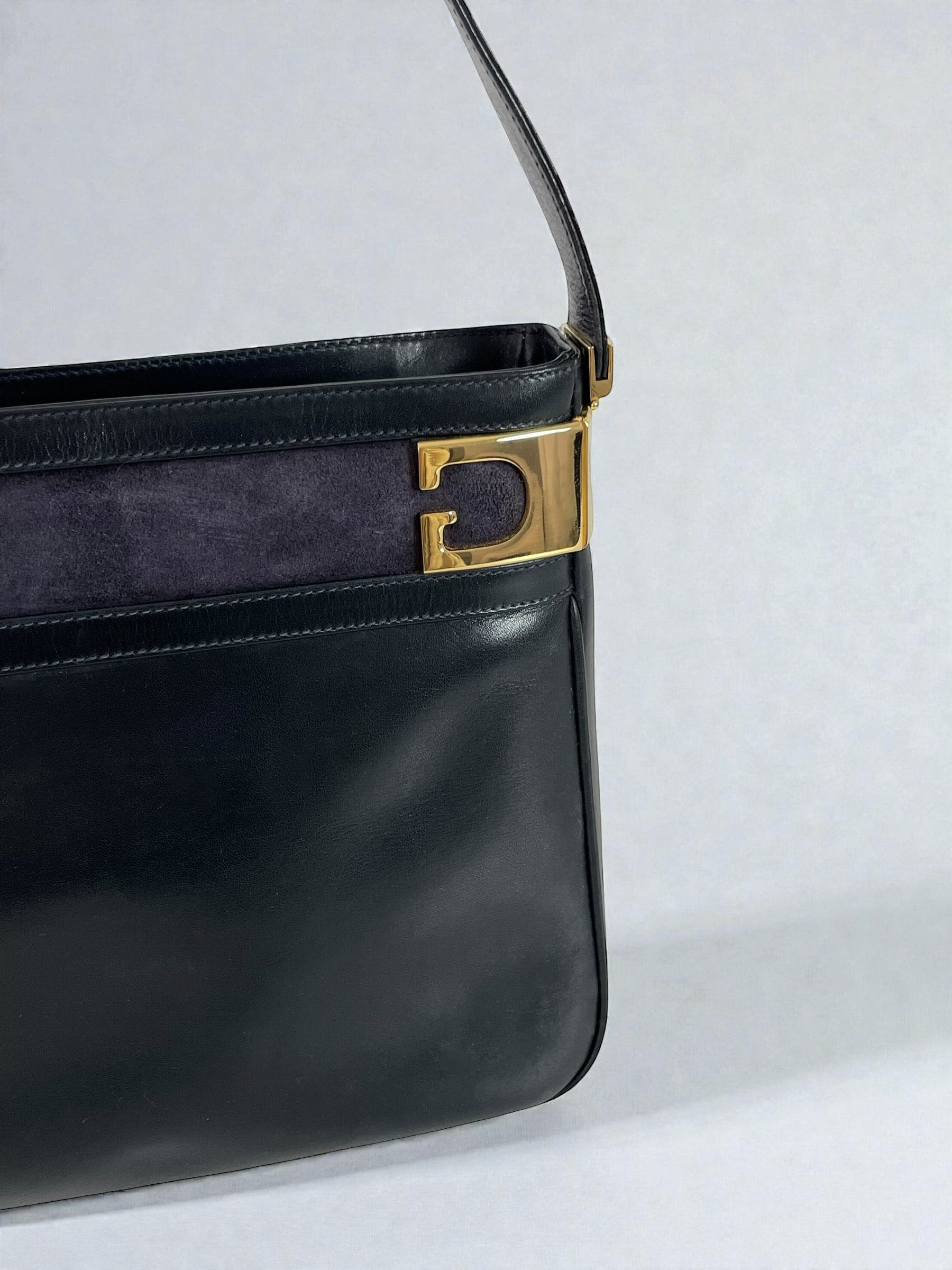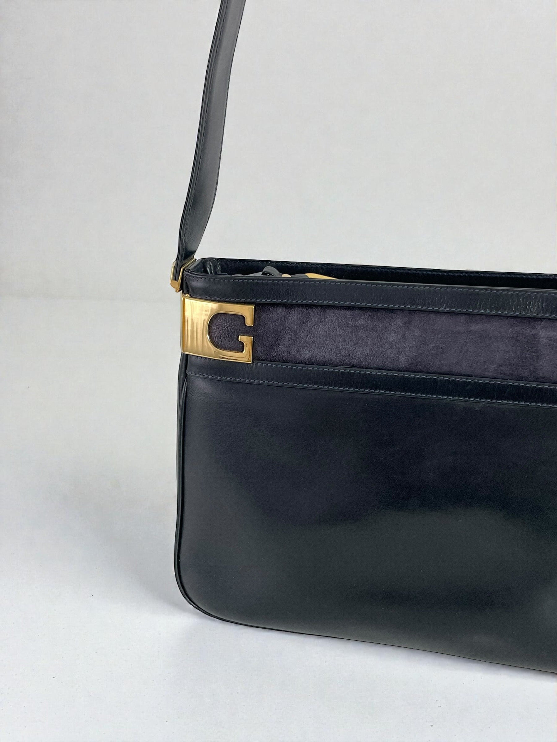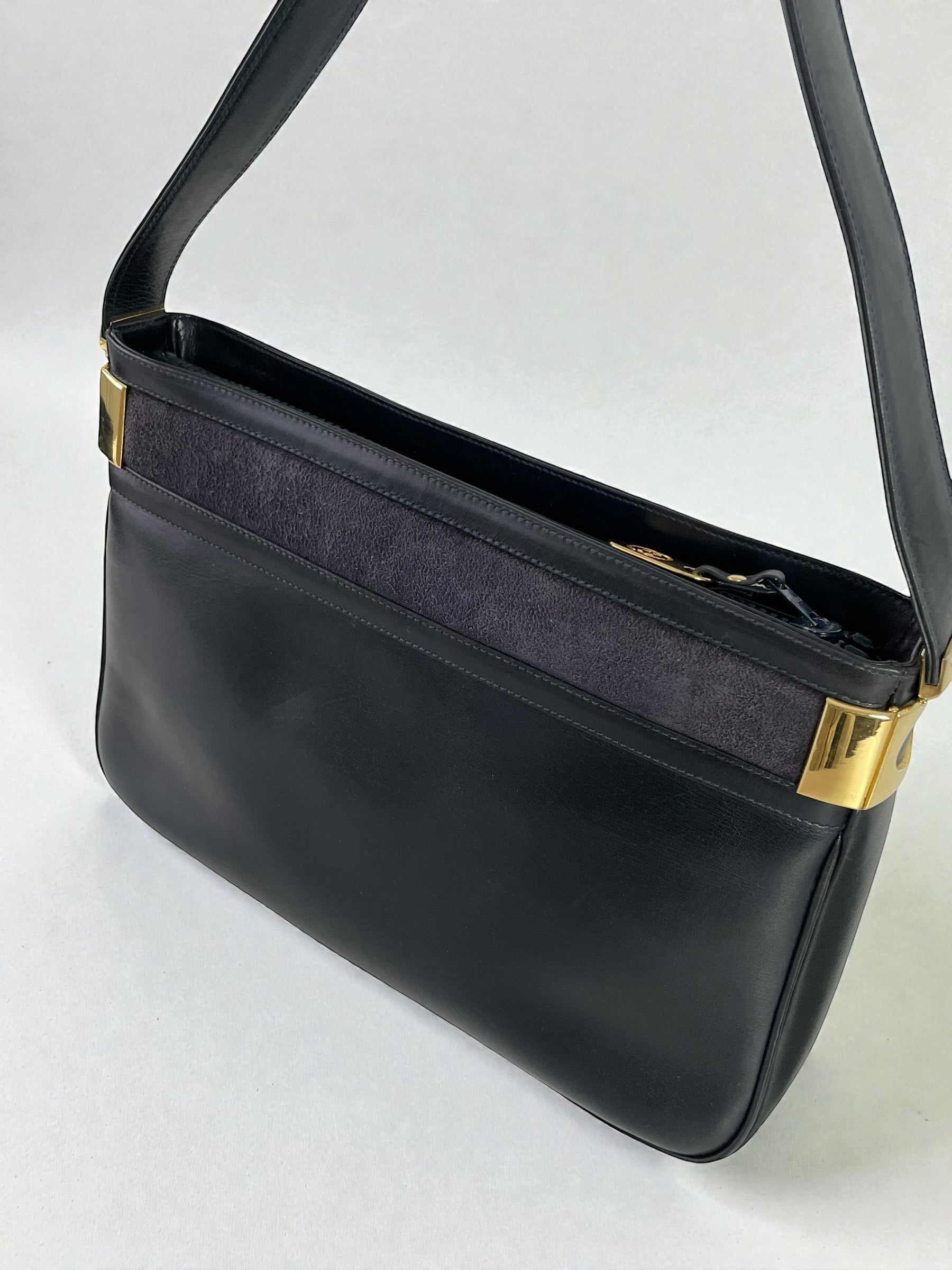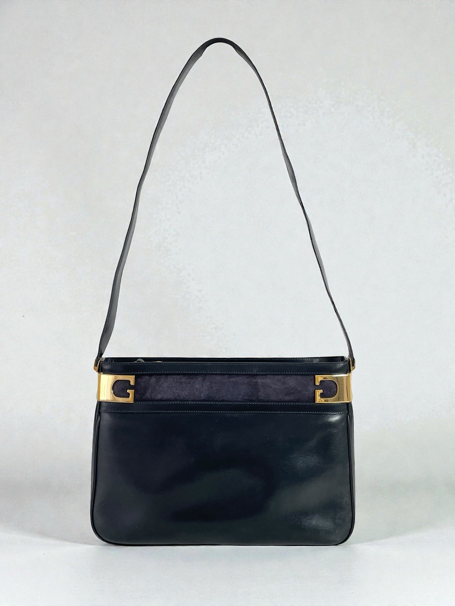 Beautiful vintage Gucci shoulder bag in navy leather and suede with gold plated buckles.