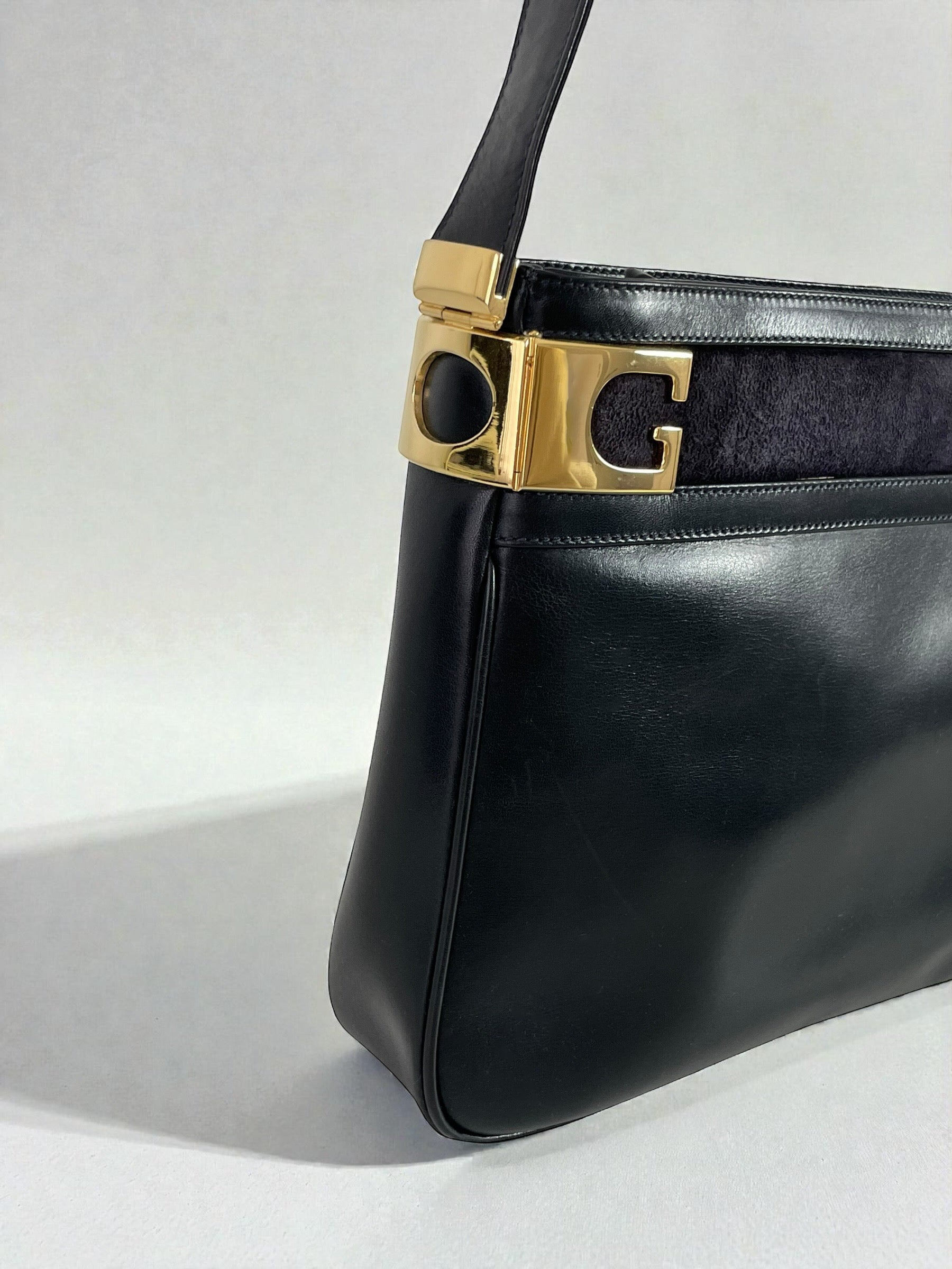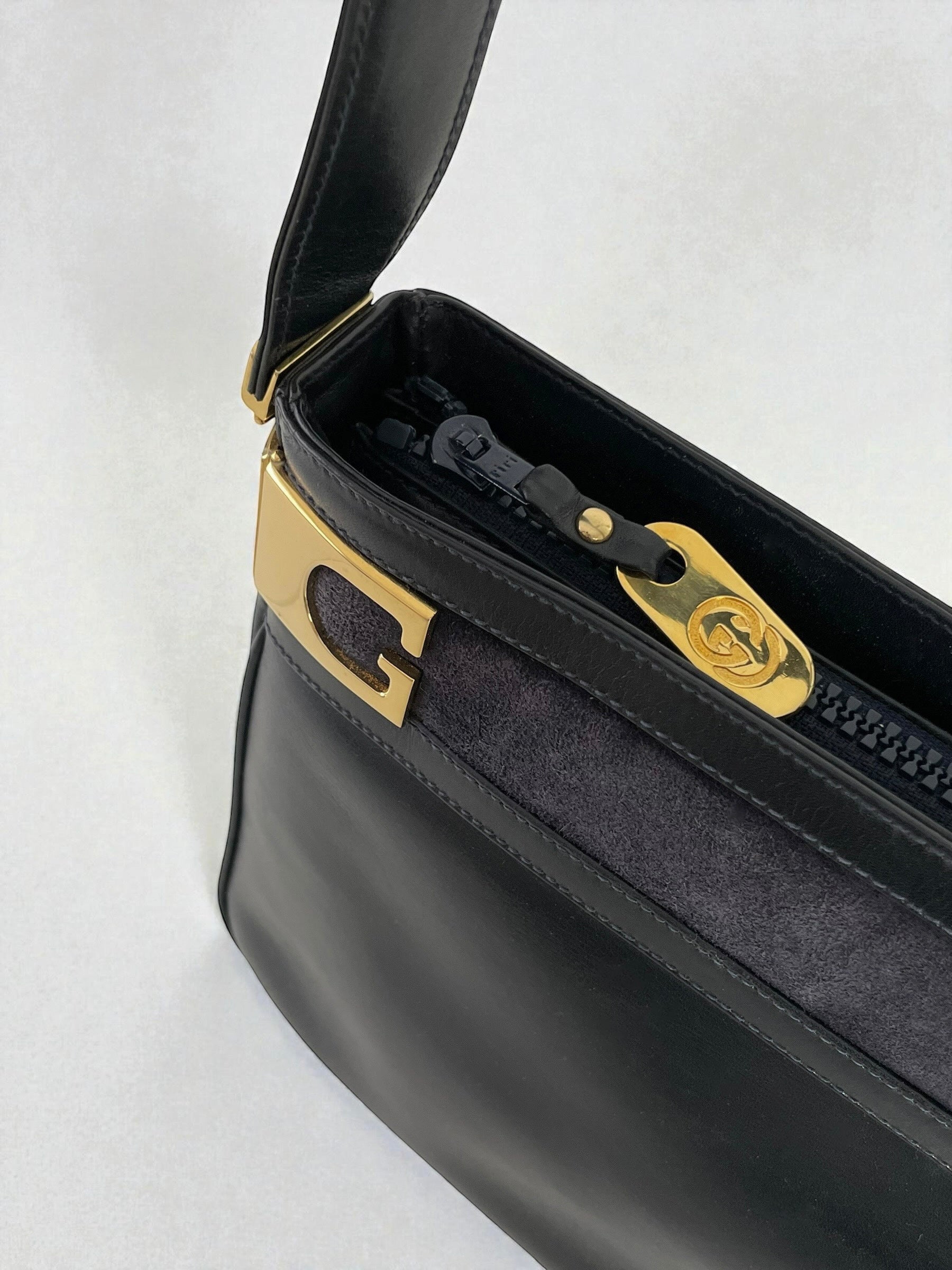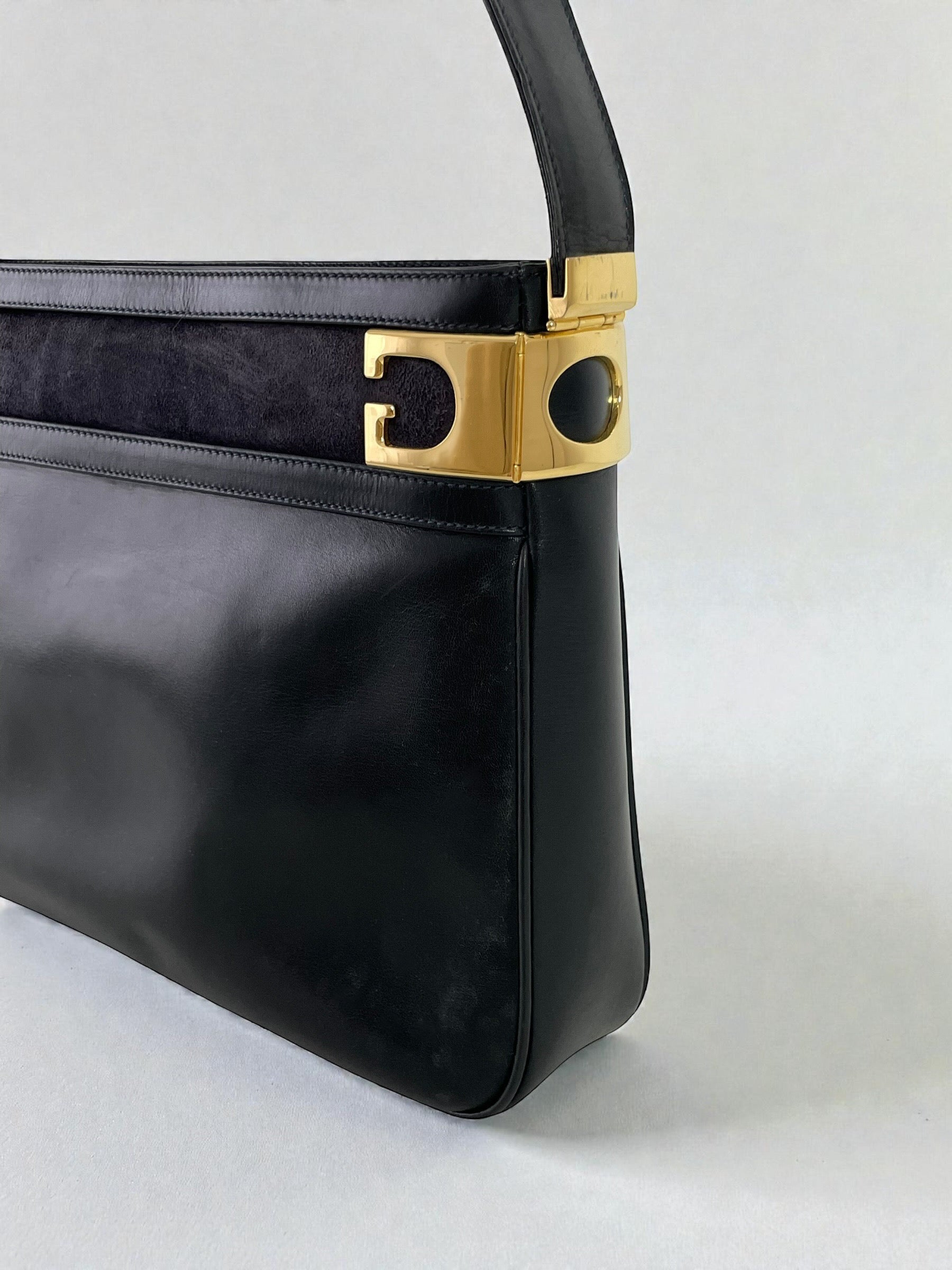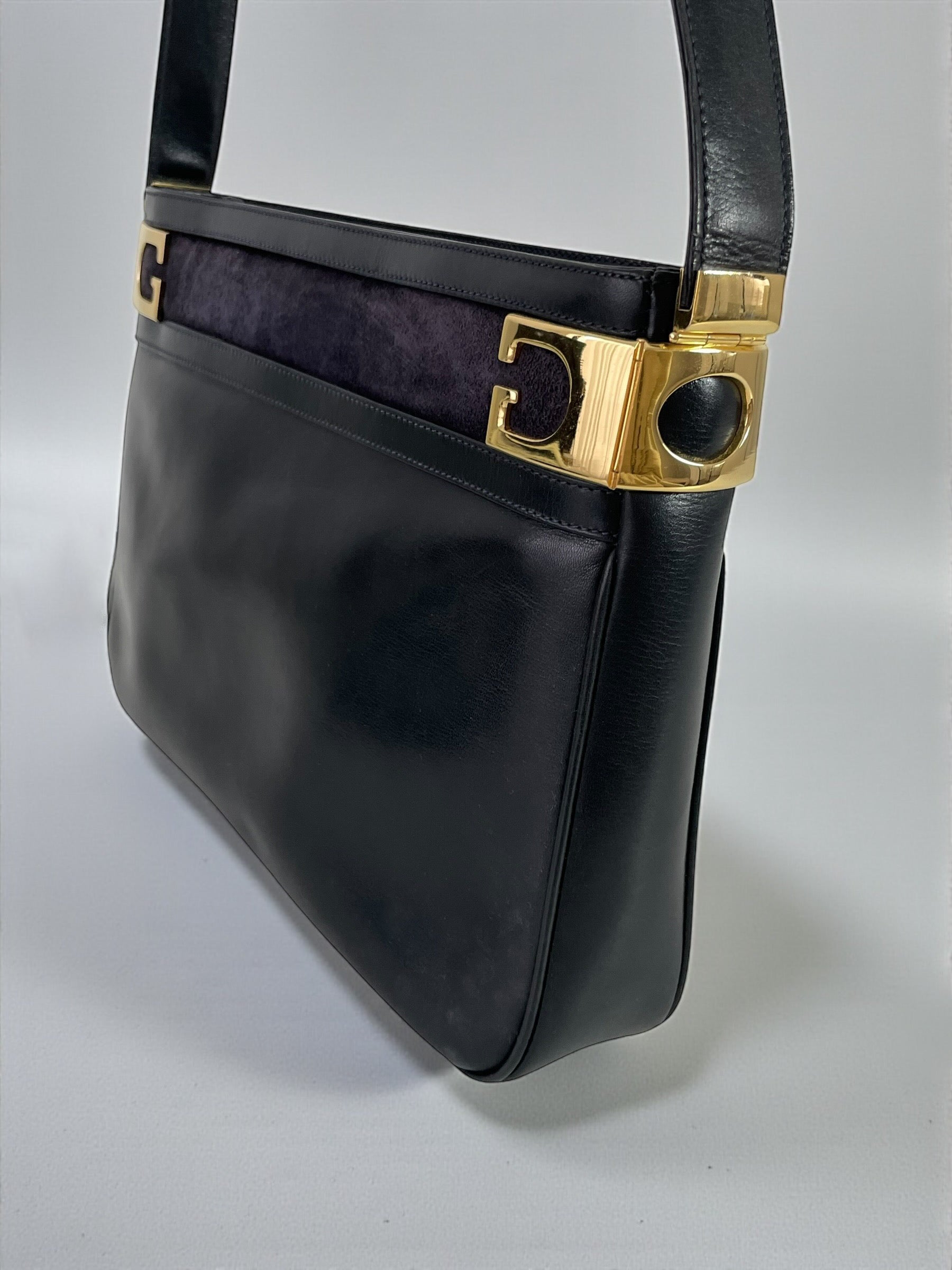Beautiful vintage Gucci shoulder bag in navy leather and suede with gold plated buckles.