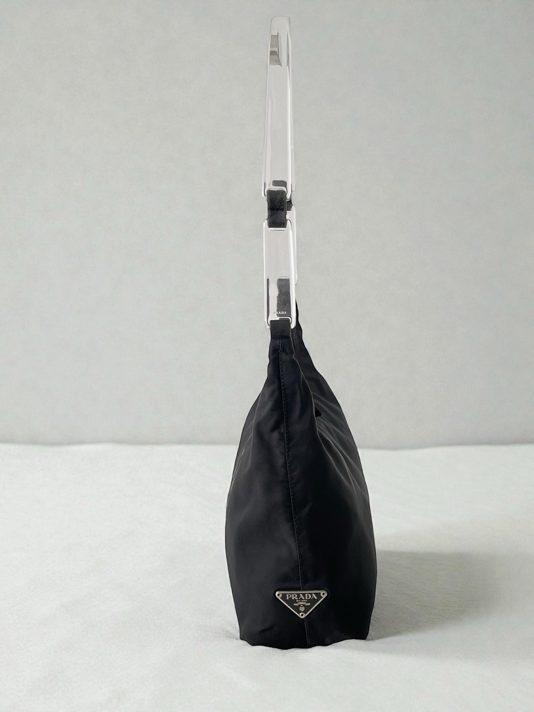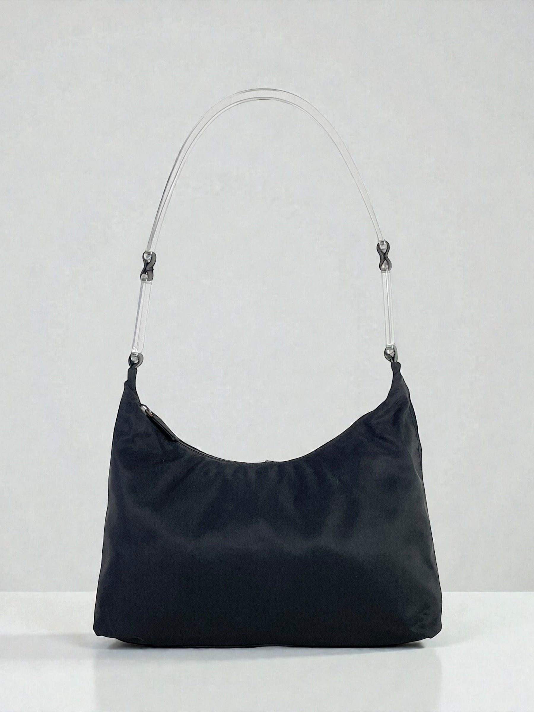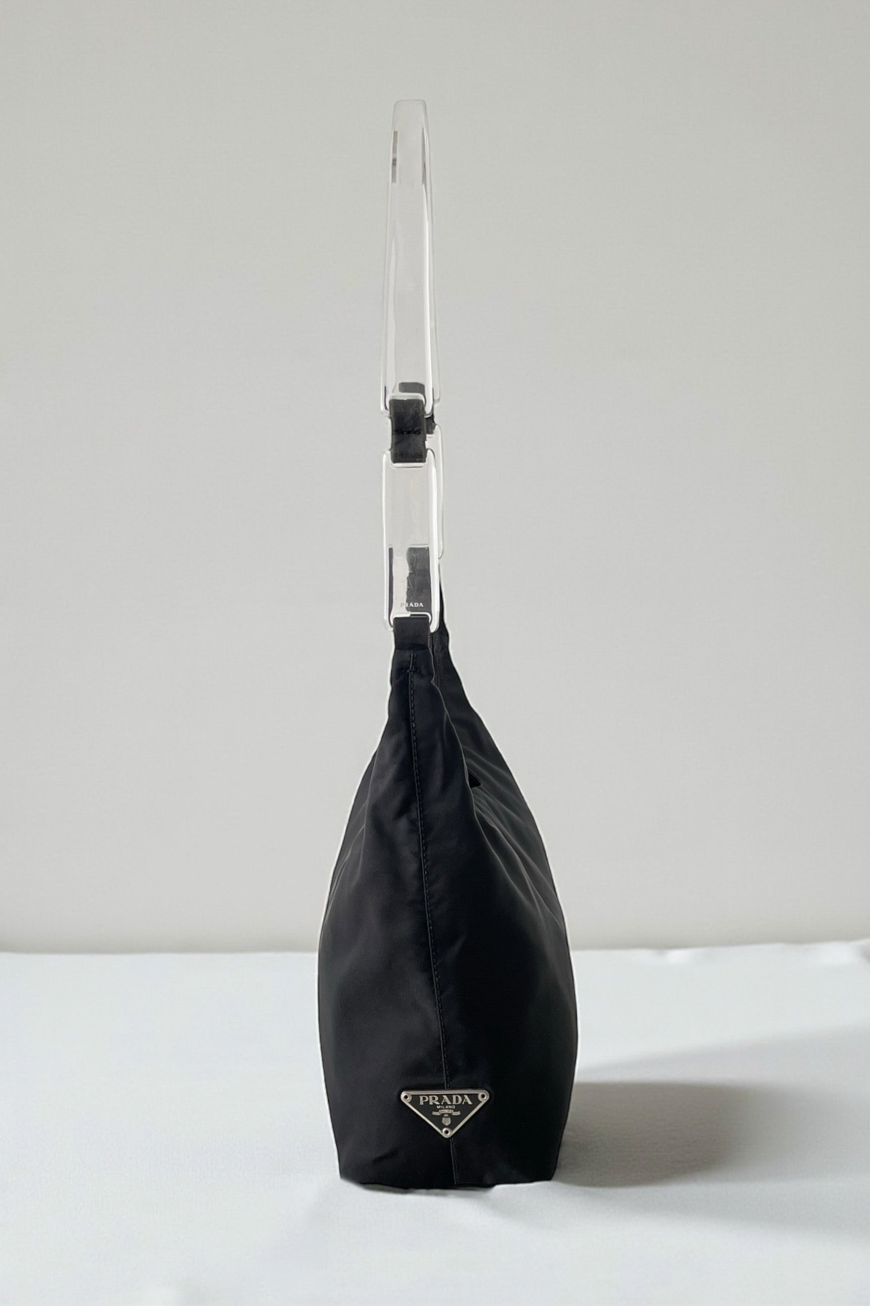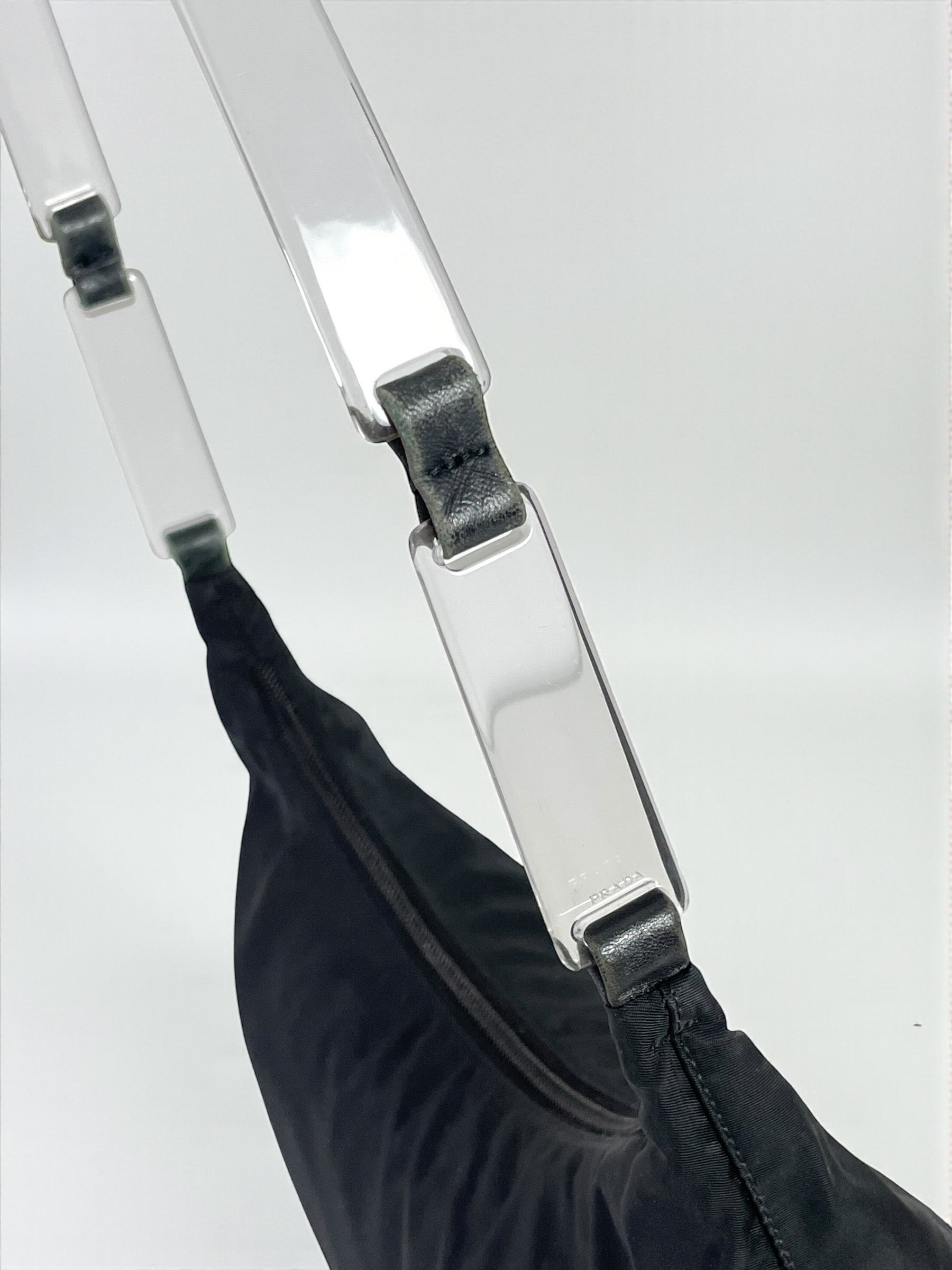 Beautiful vintage Prada nylon bag with transparent handles. Iconic brand logo on the side.