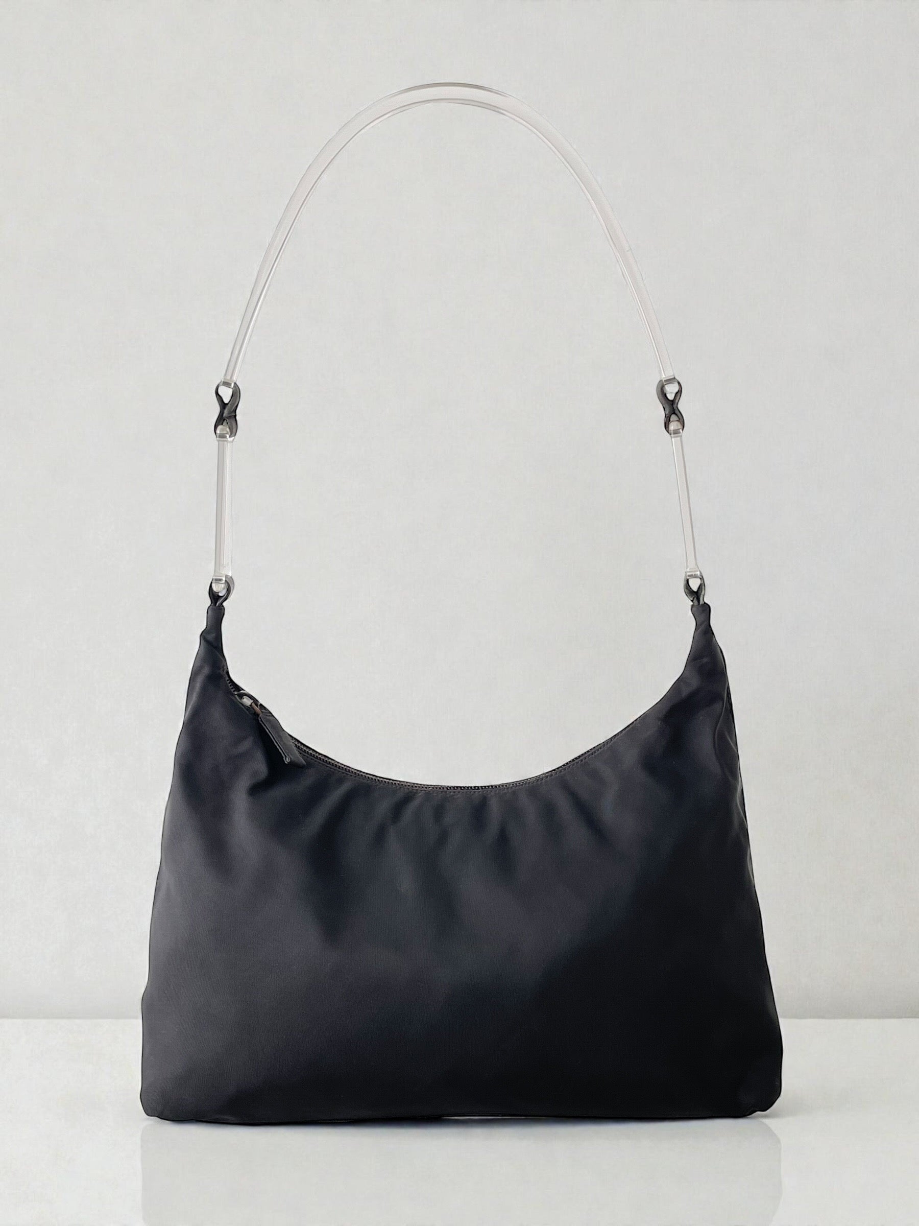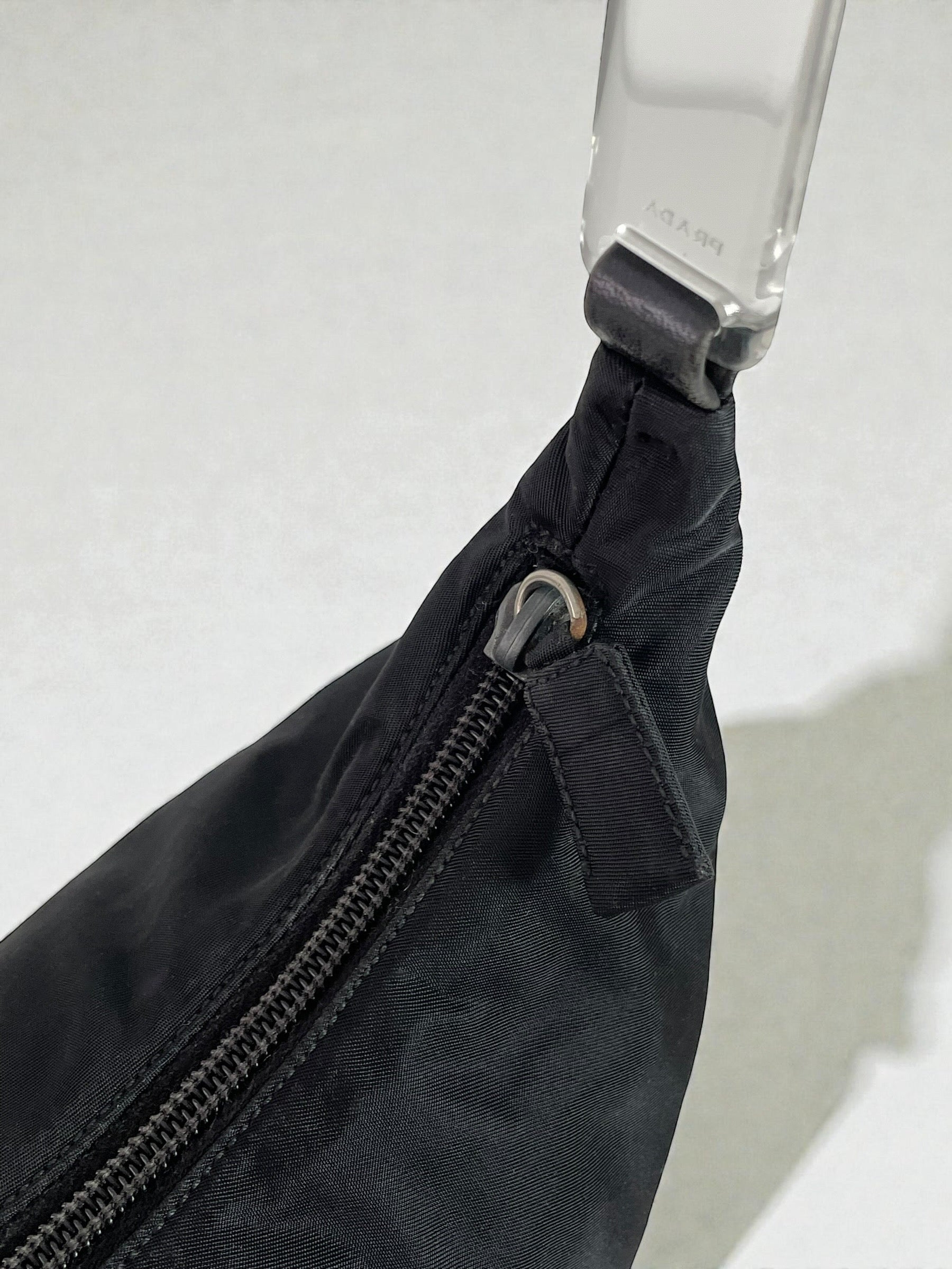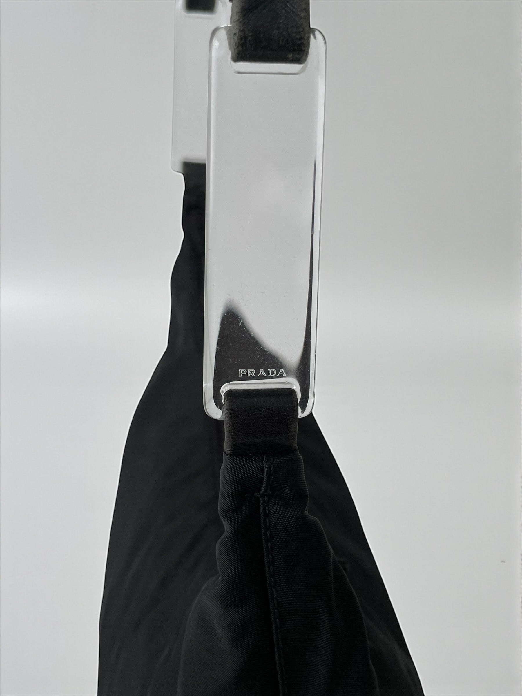 Beautiful vintage Prada nylon bag with transparent handles. Iconic brand logo on the side.