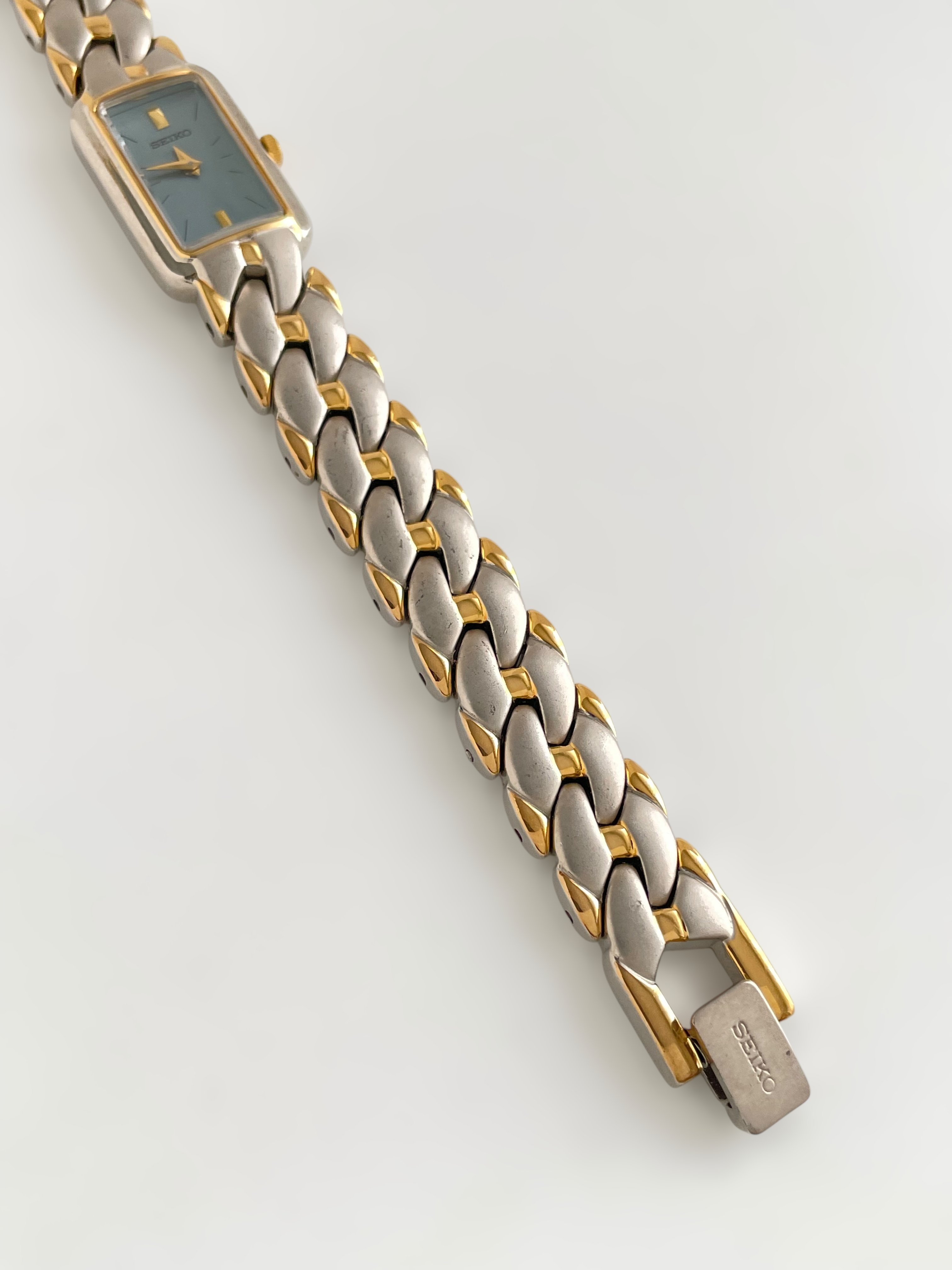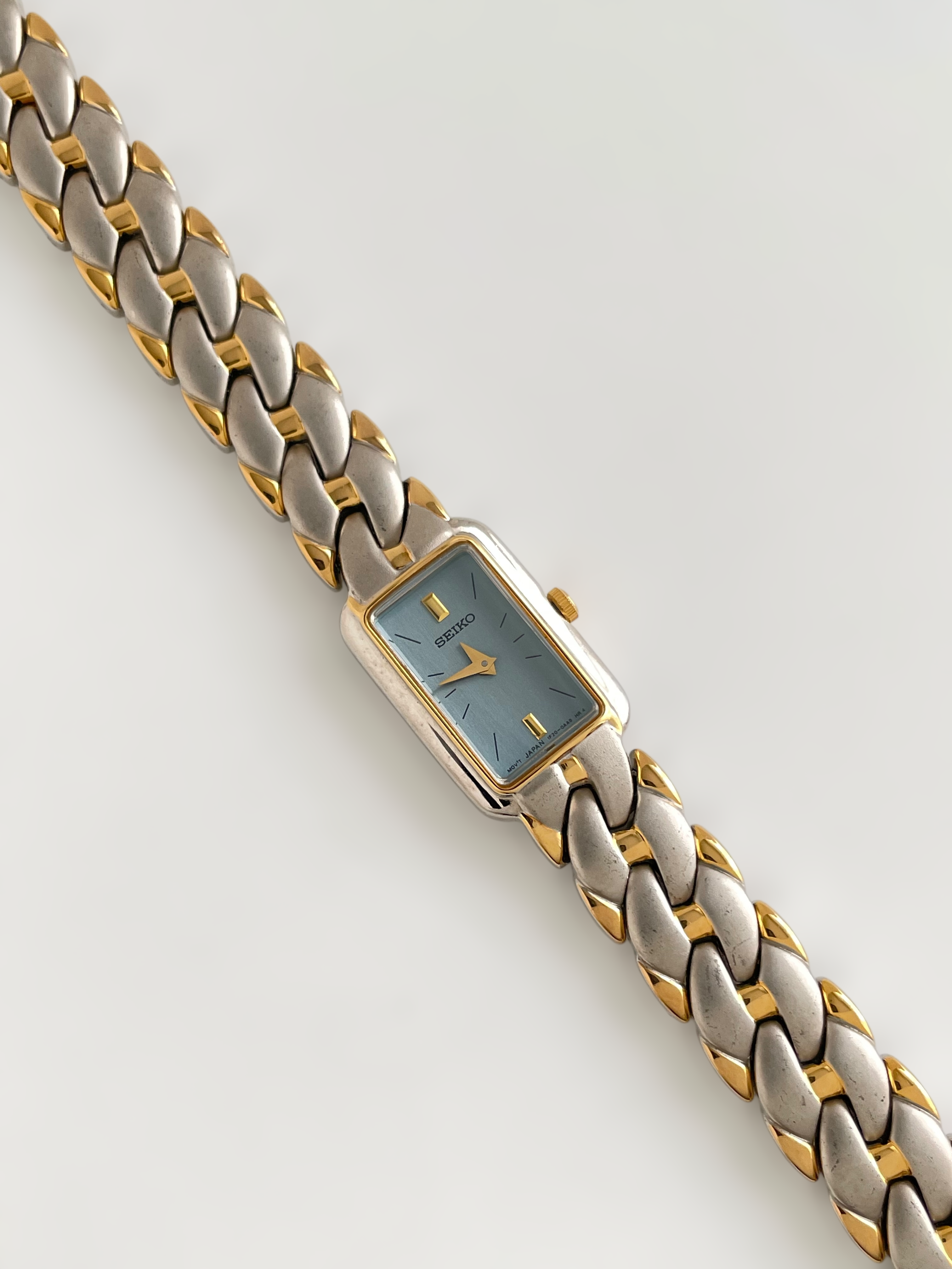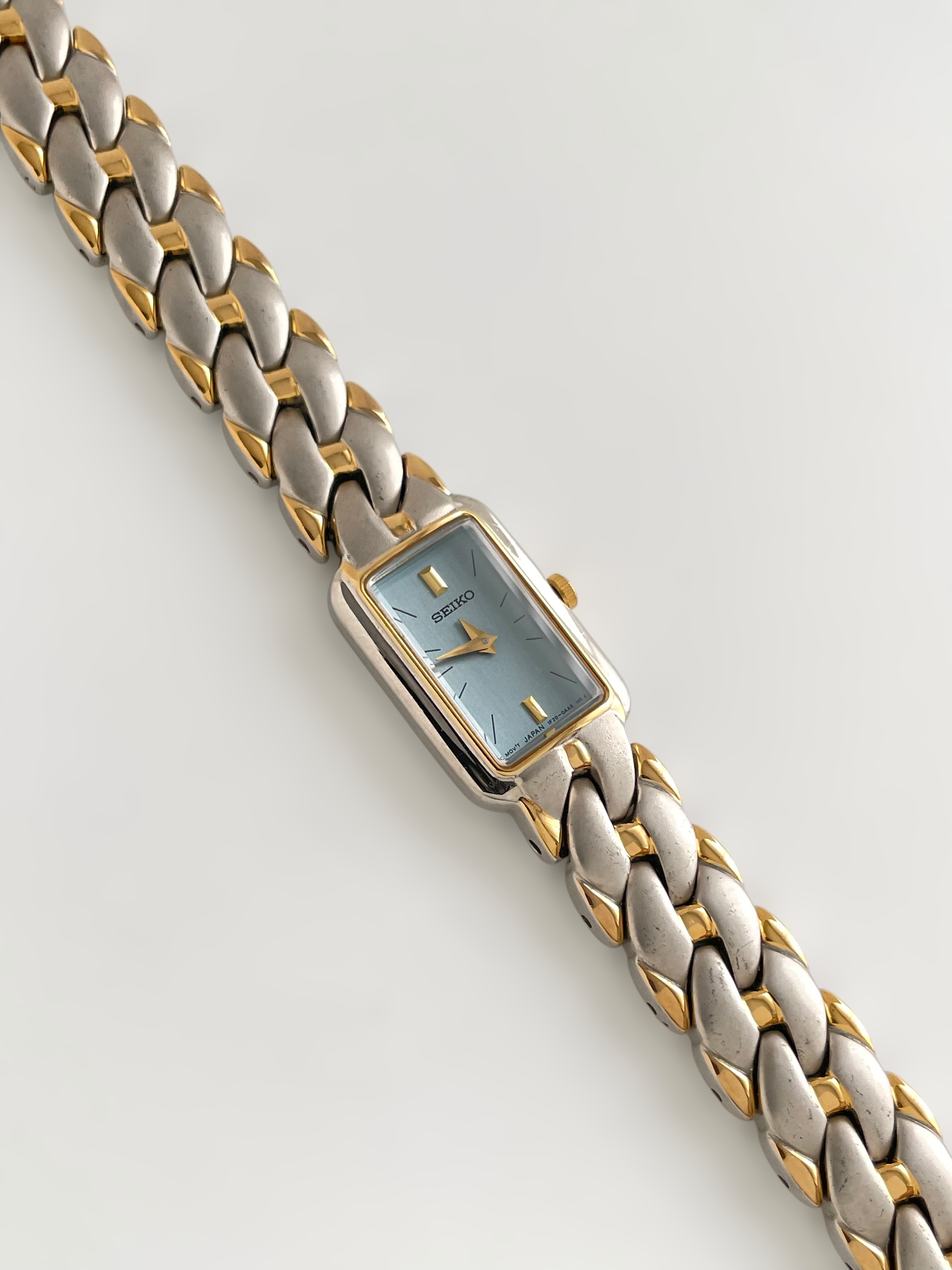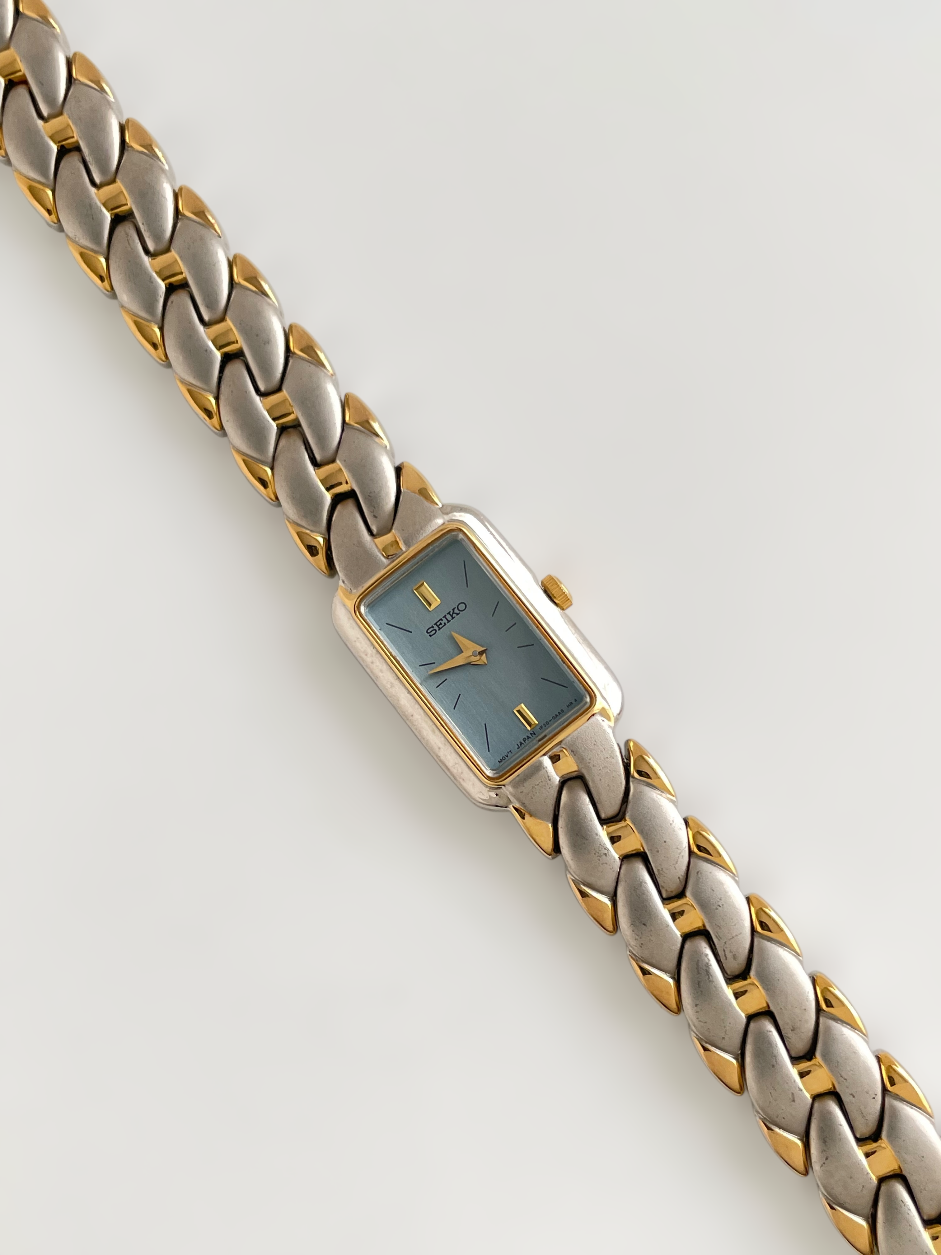Gorgeous vintage and rare duotone Seiko watch with a unique bracelet design and a gorgeous blue face. Bracelet clasp closure.