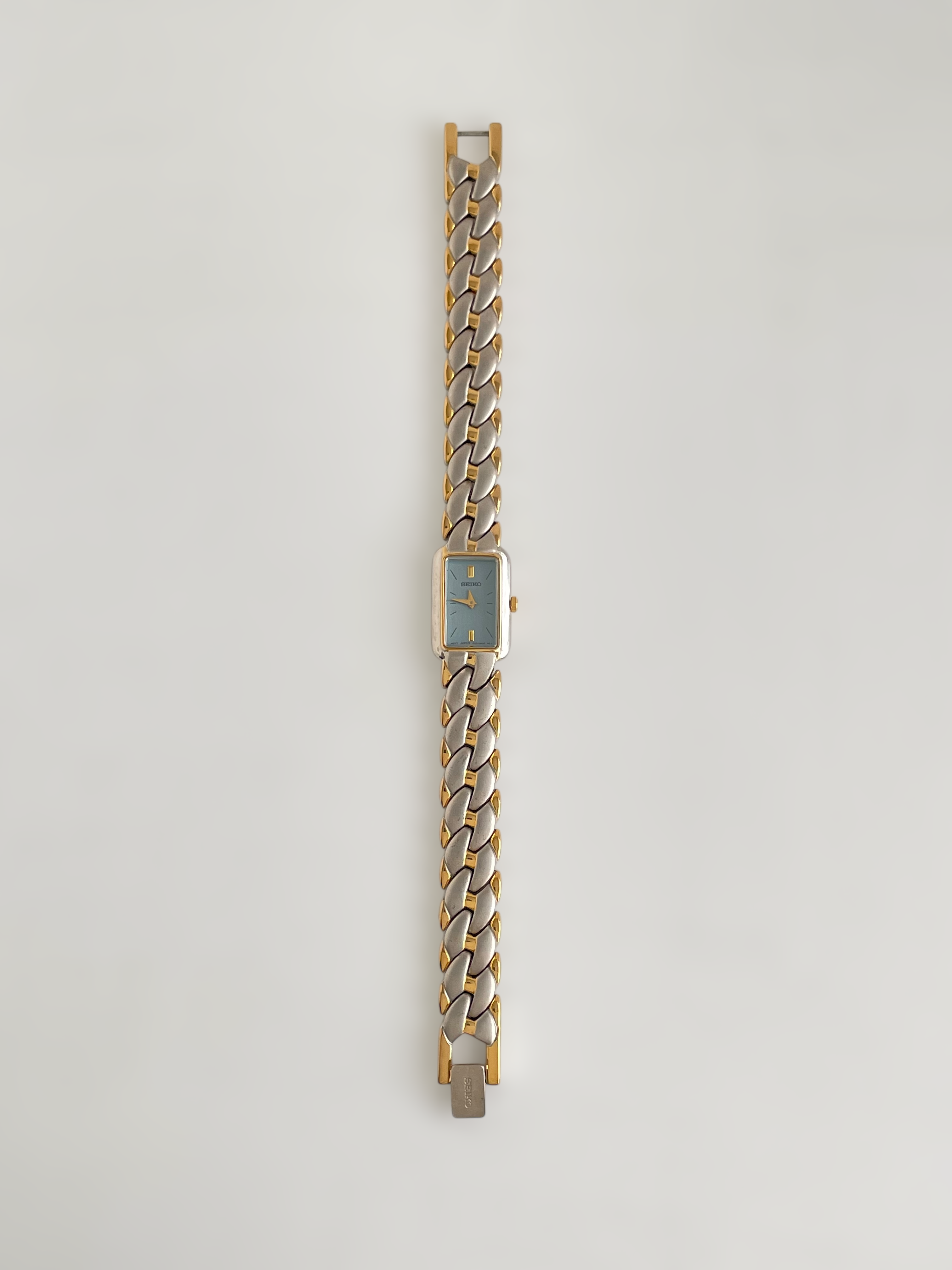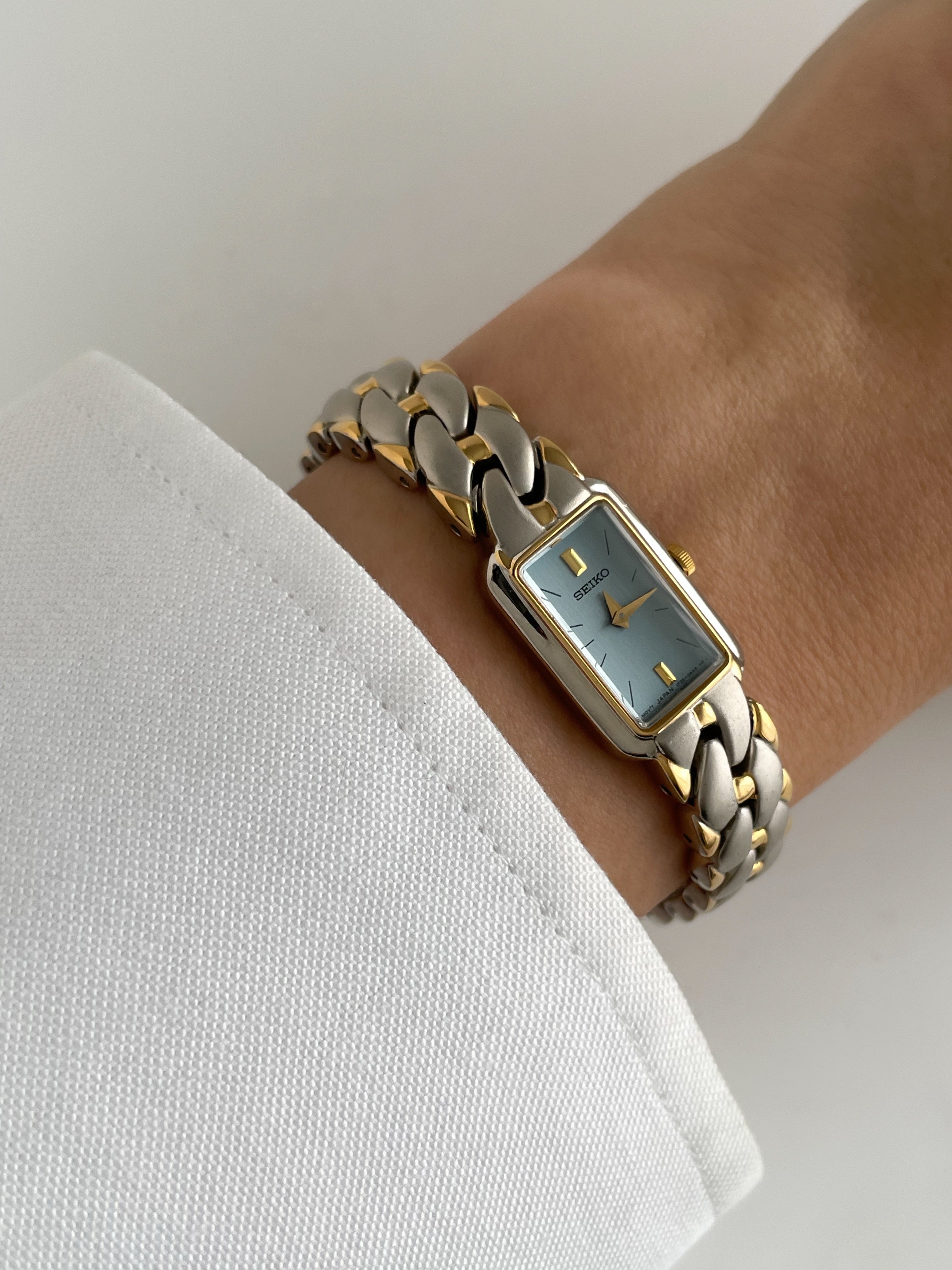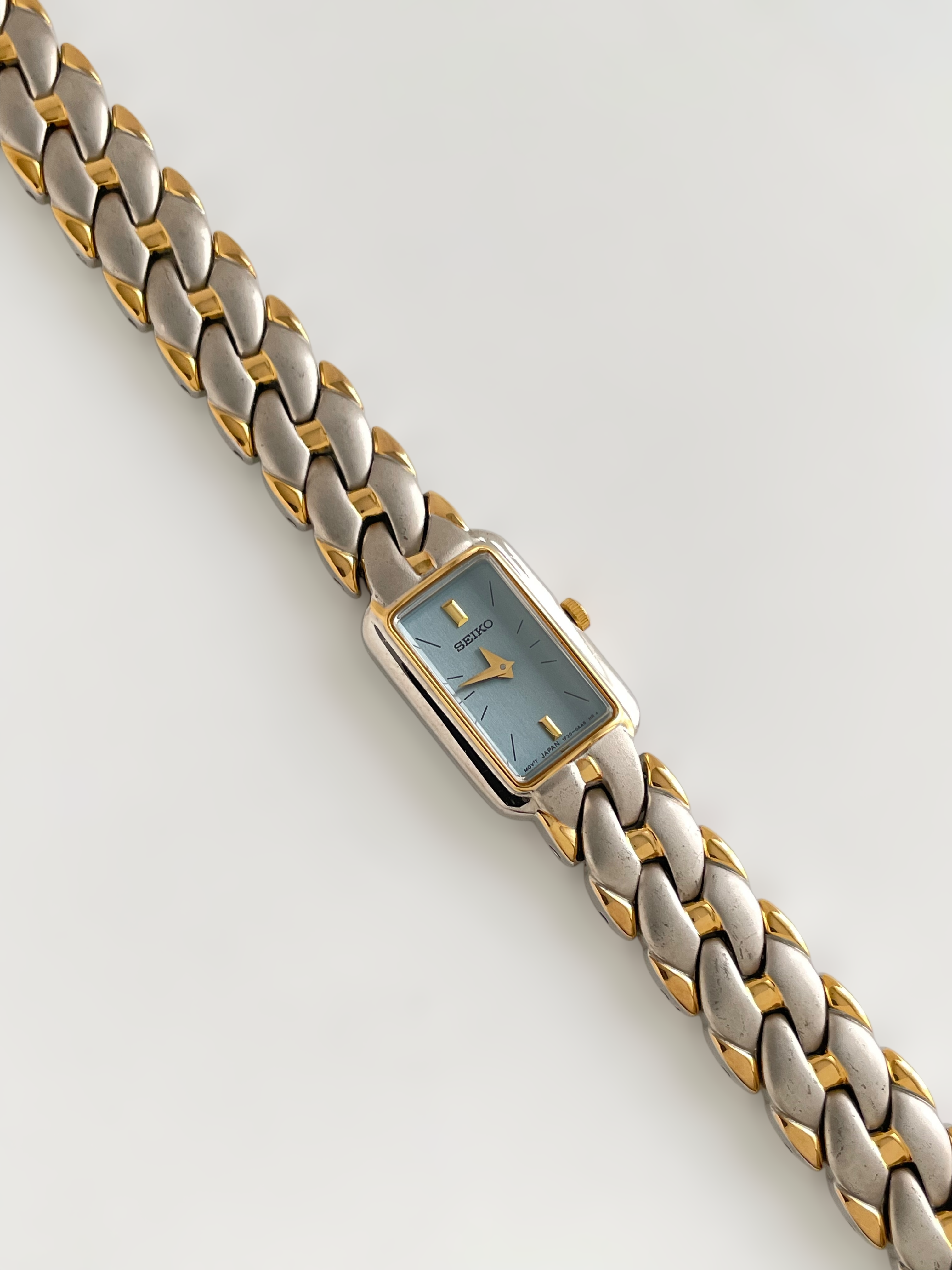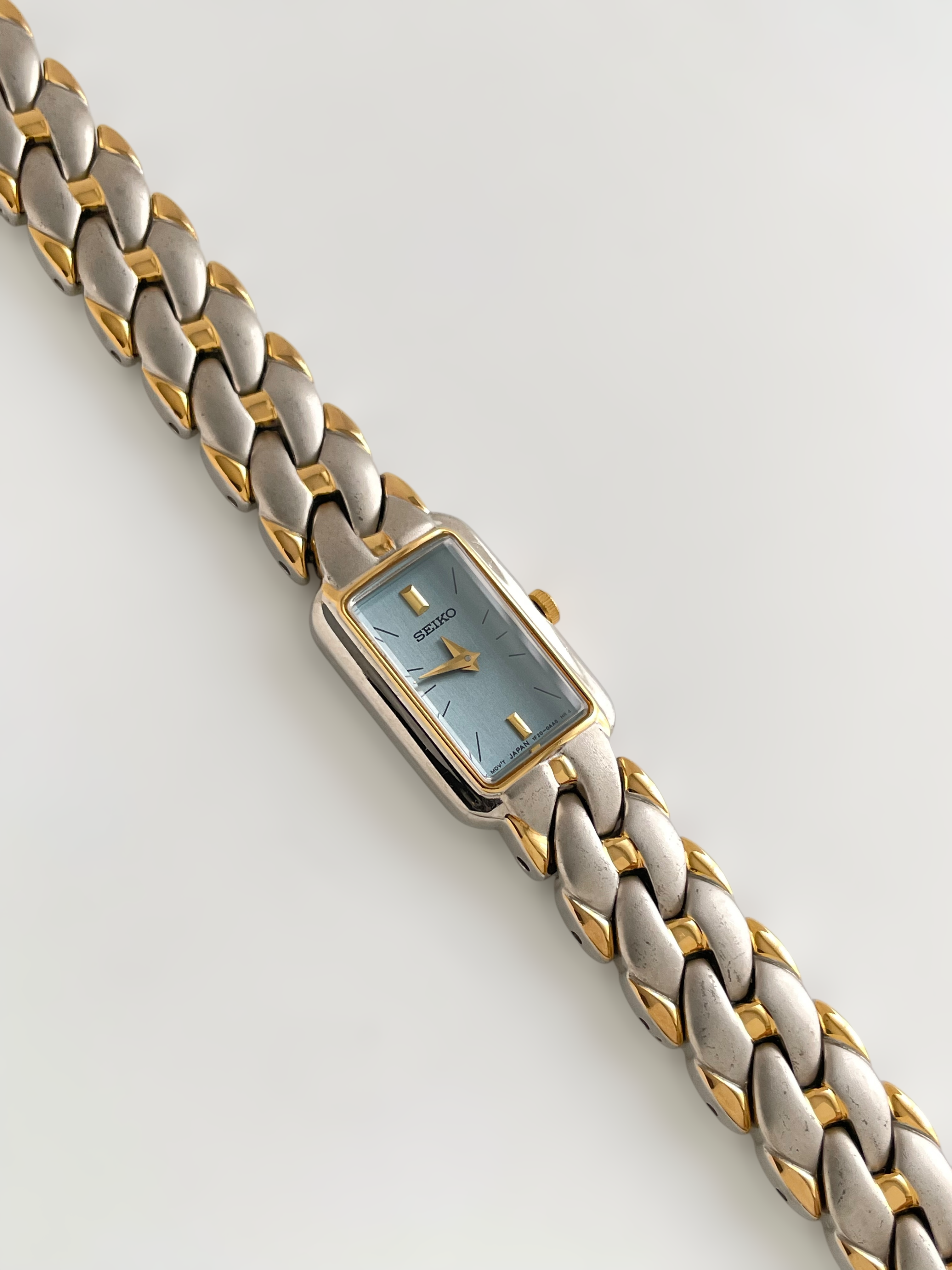 Gorgeous vintage and rare duotone Seiko watch with a unique bracelet design and a gorgeous blue face. Bracelet clasp closure.