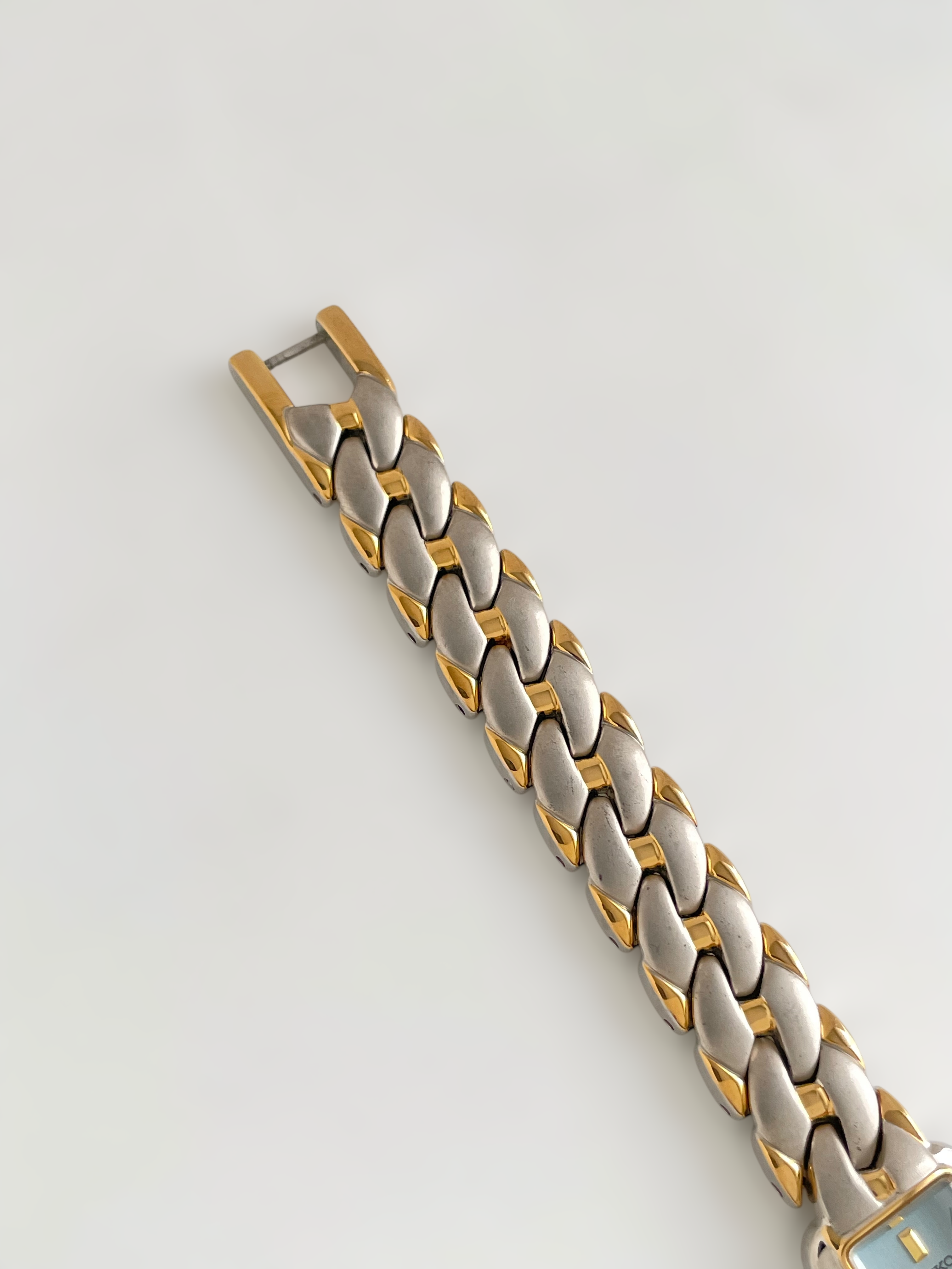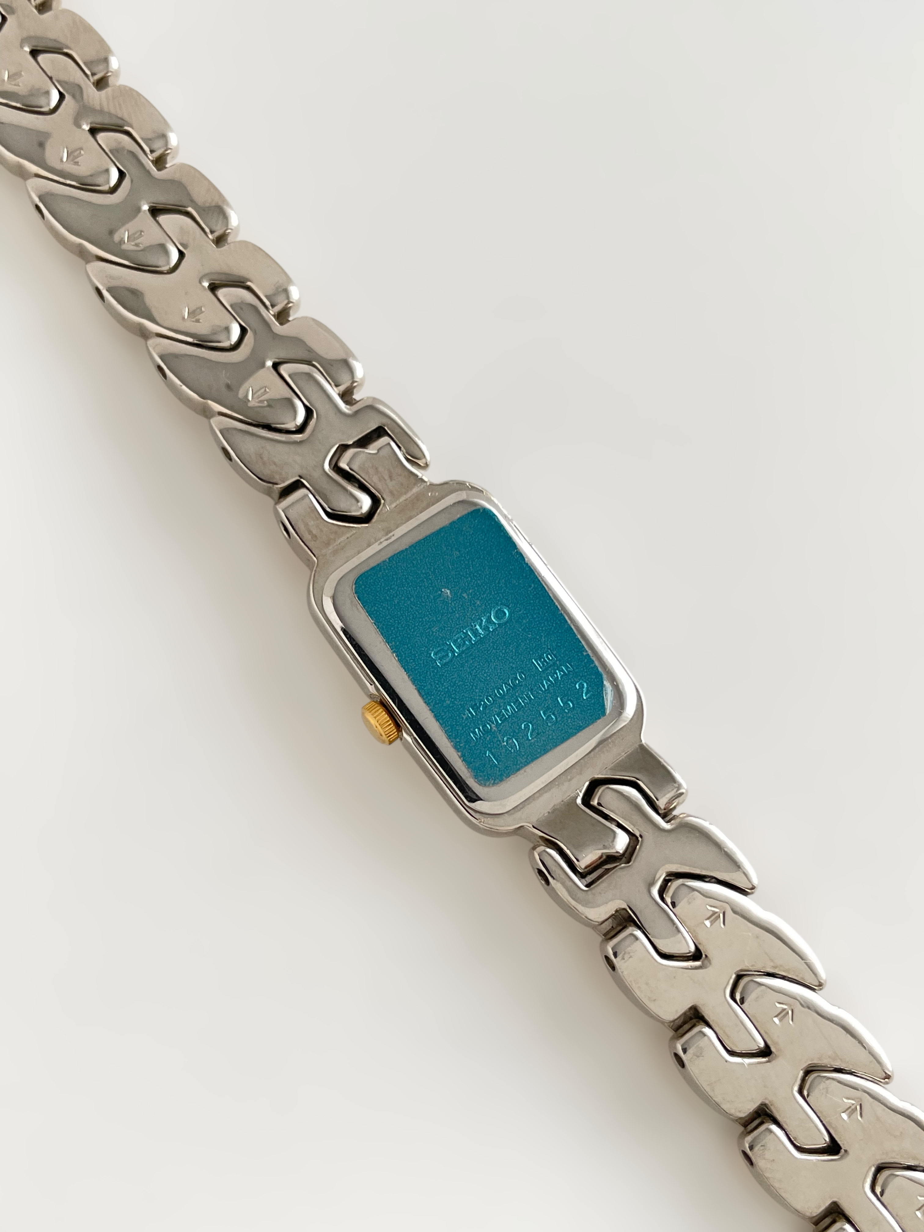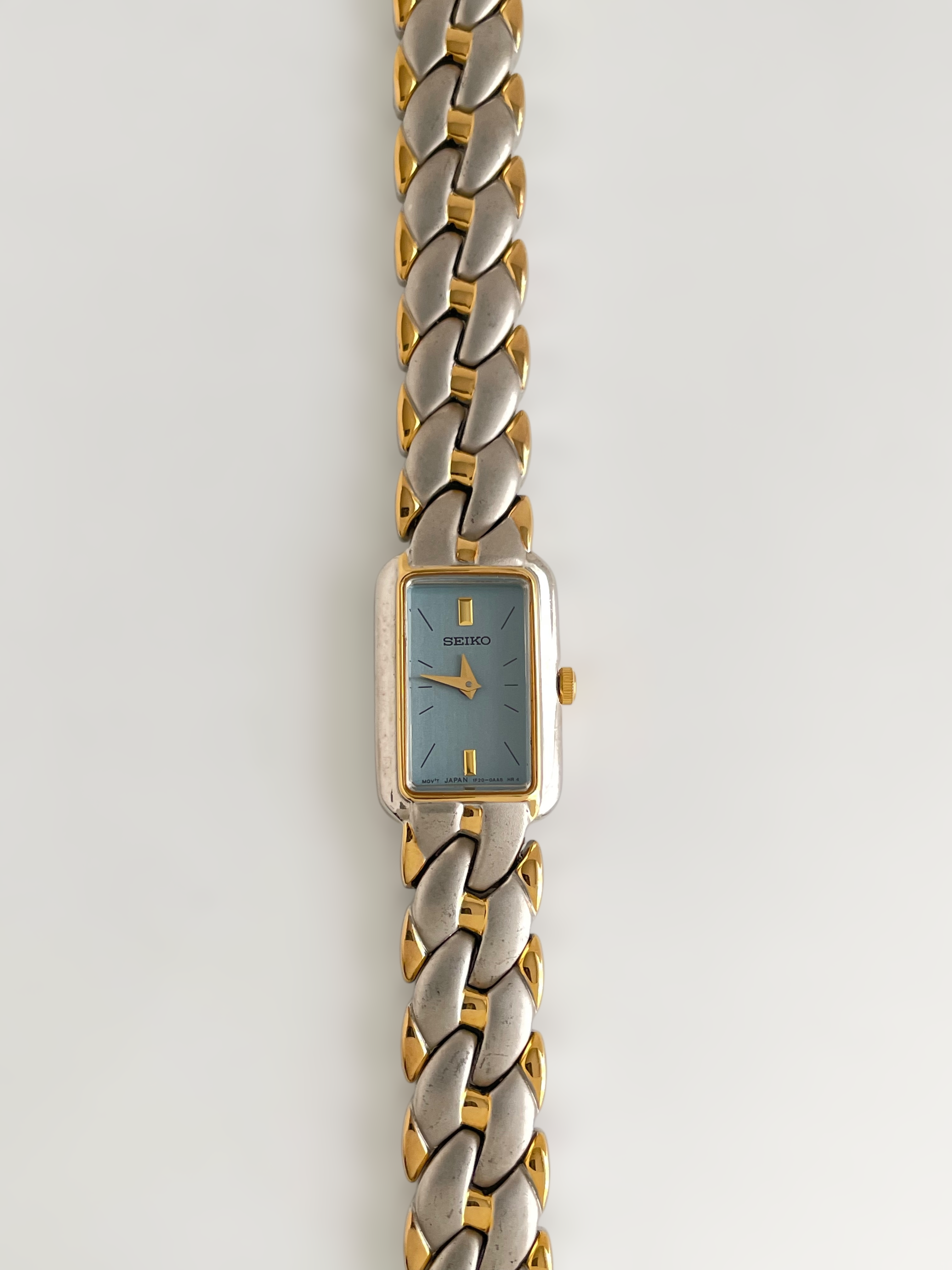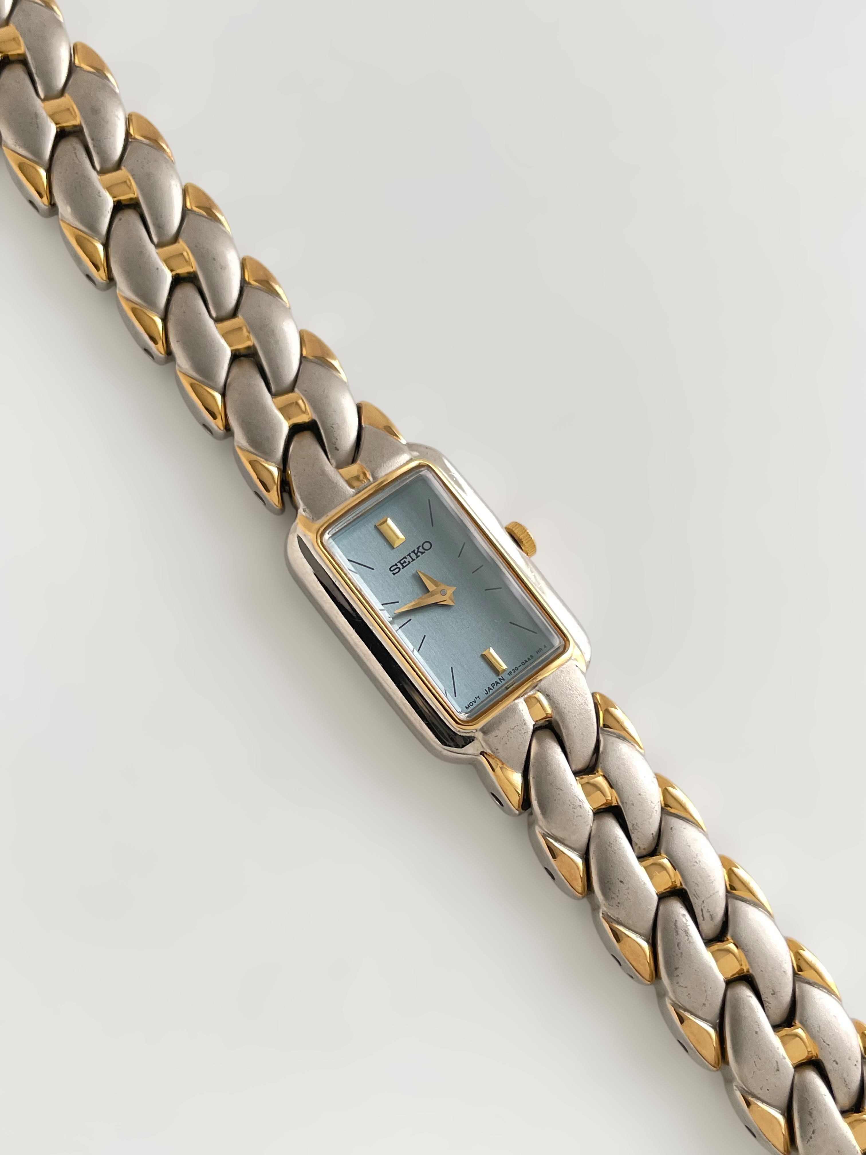Gorgeous vintage and rare duotone Seiko watch with a unique bracelet design and a gorgeous blue face. Bracelet clasp closure.