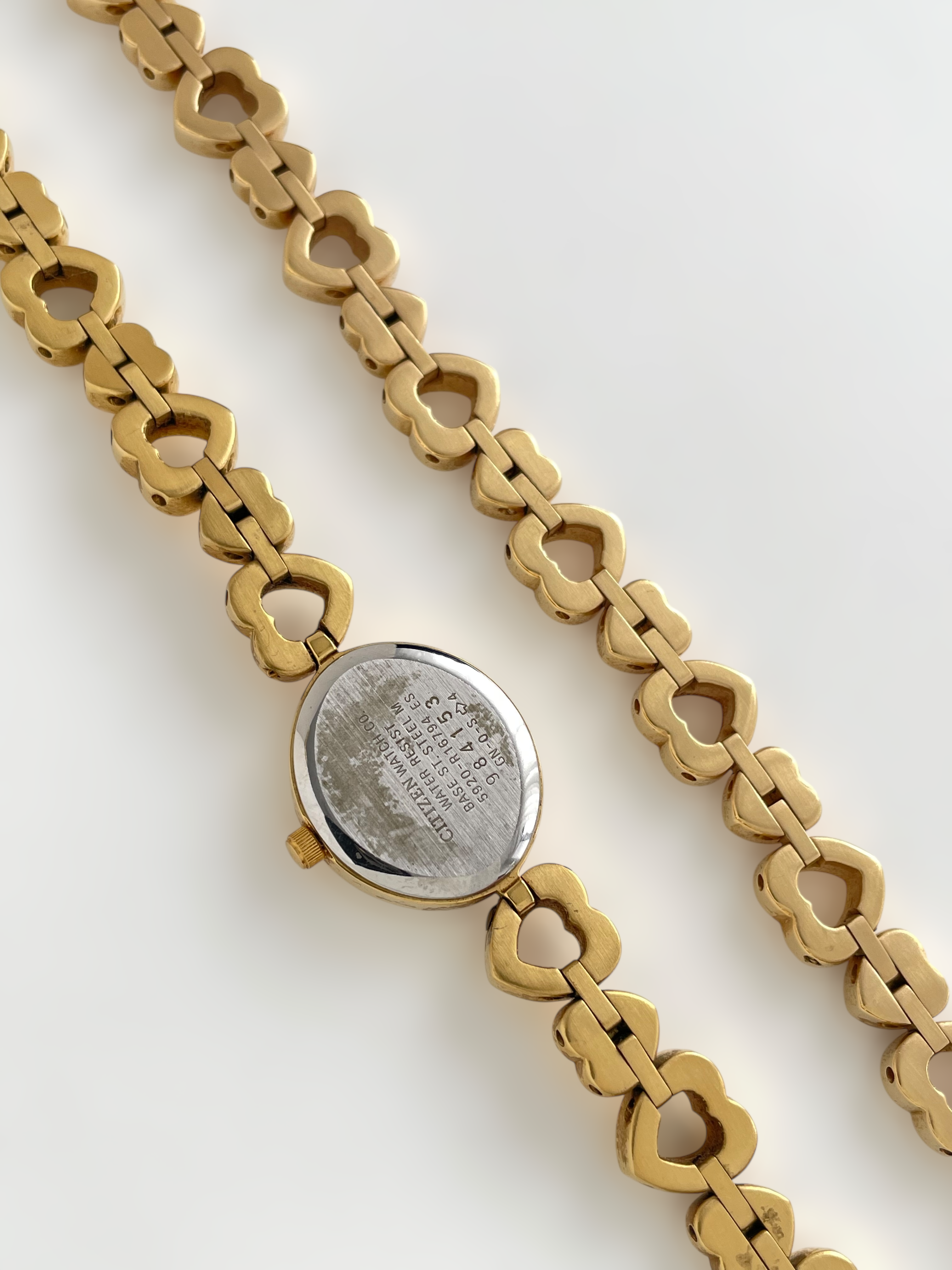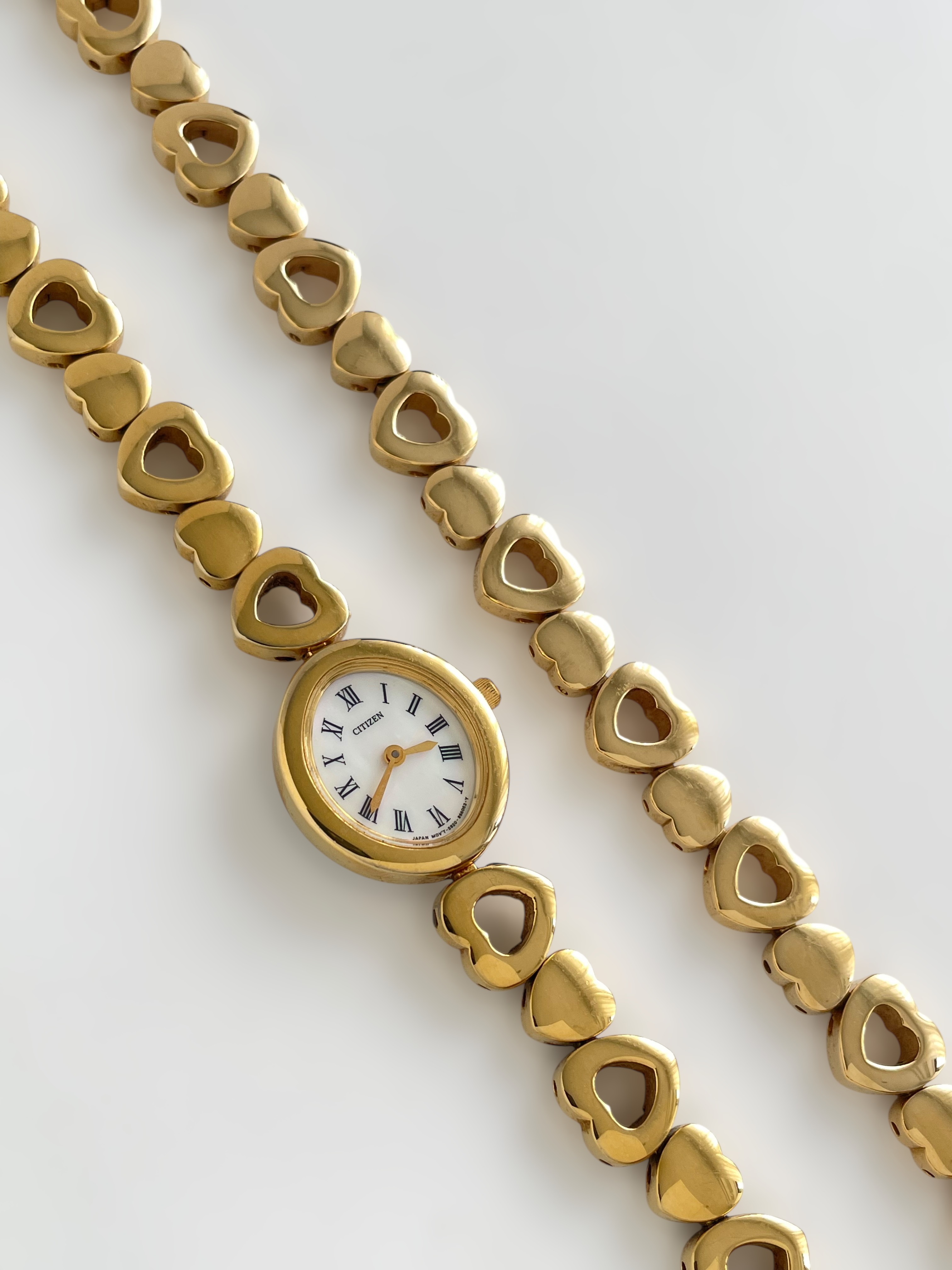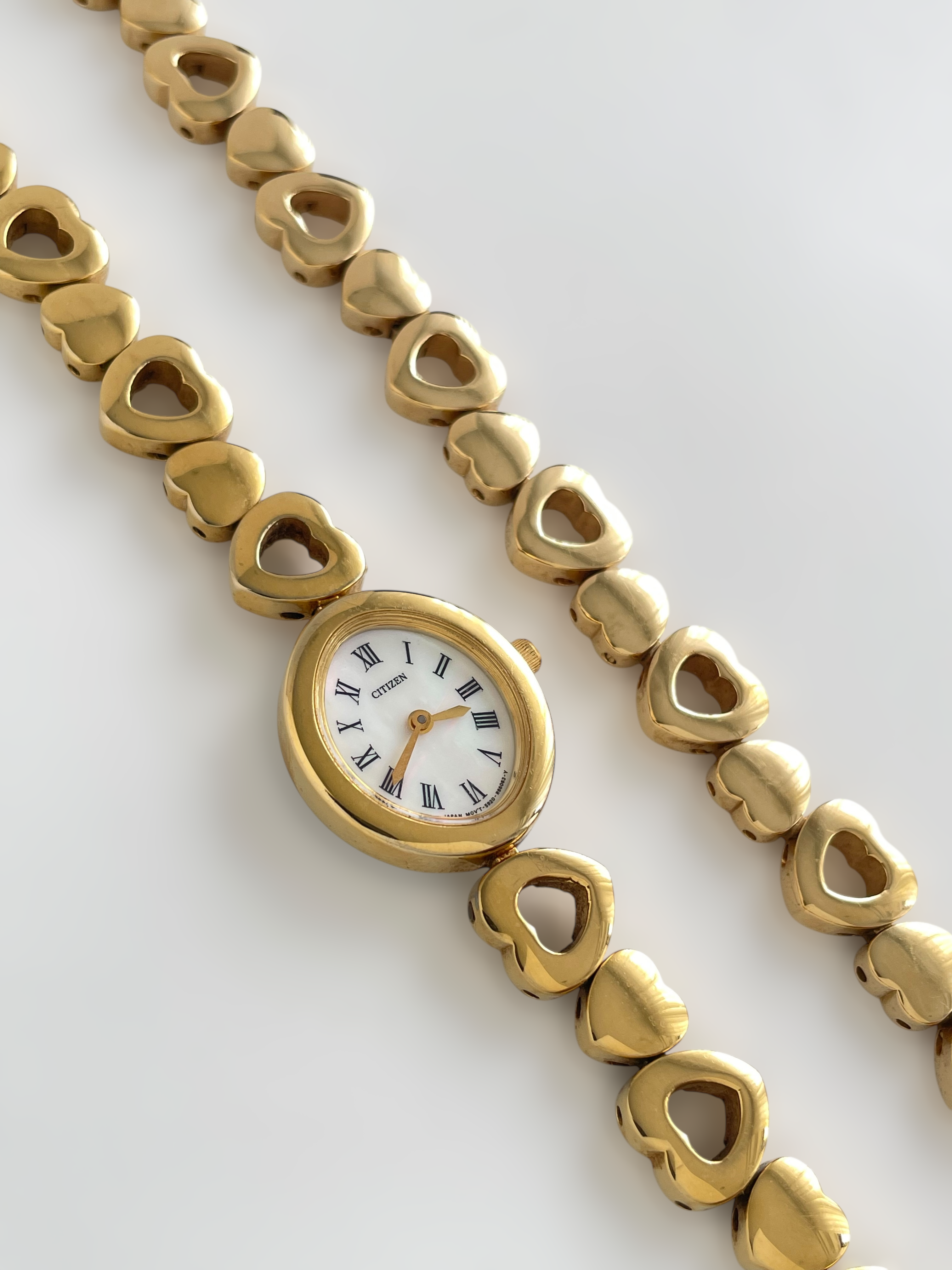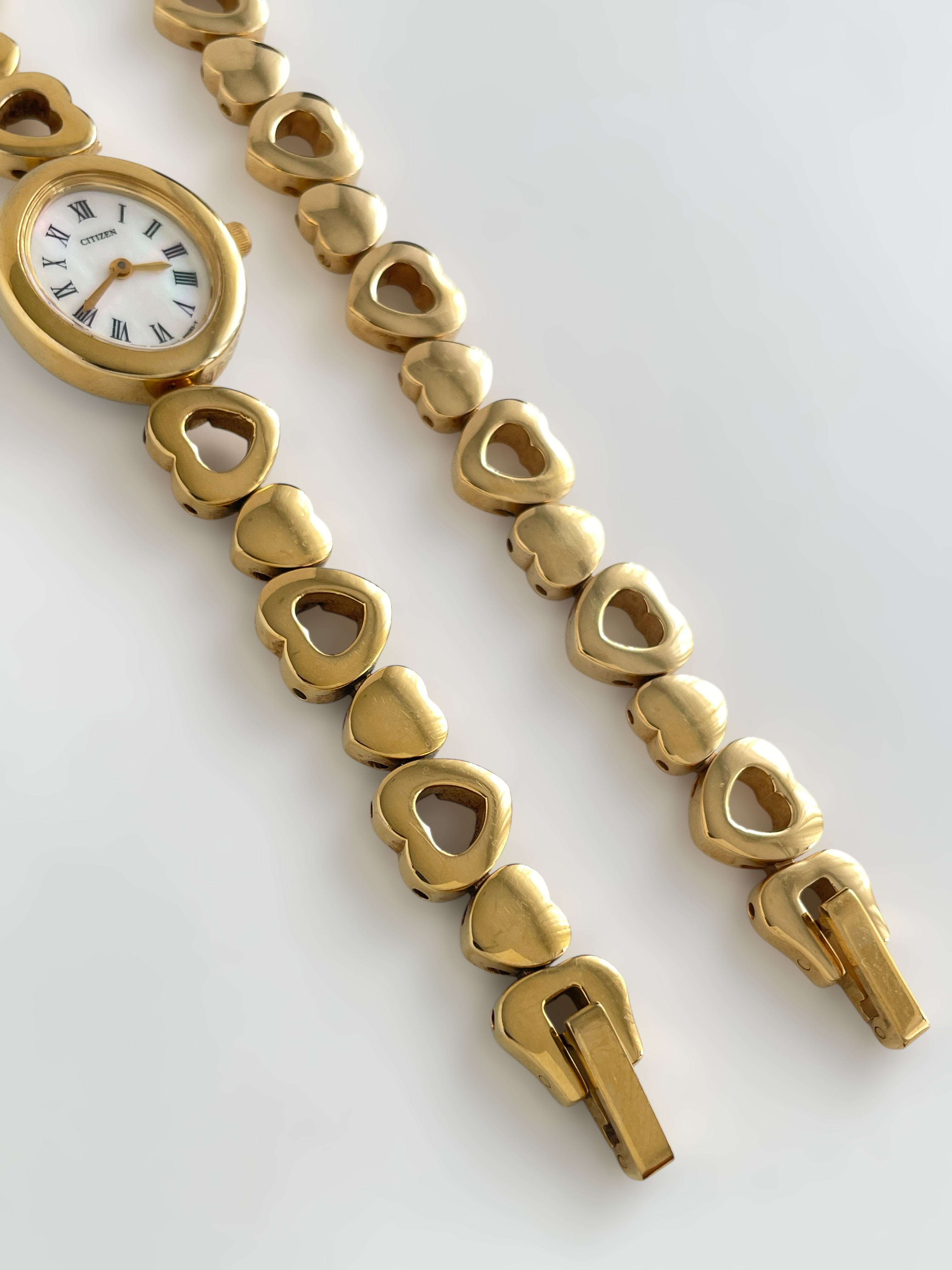 Beautiful vintage and gold plated Citizen watch set with the cutest heart link bracelet design and an oval case adorned with a mother of pearl face. Bracelet clasp closure.