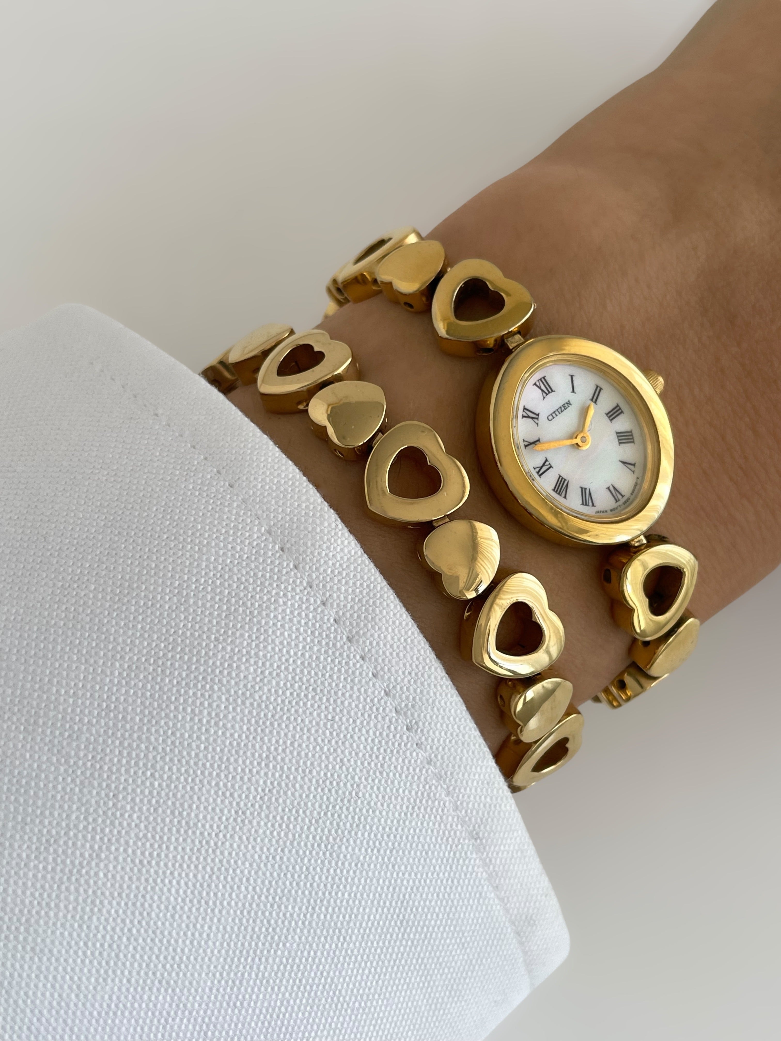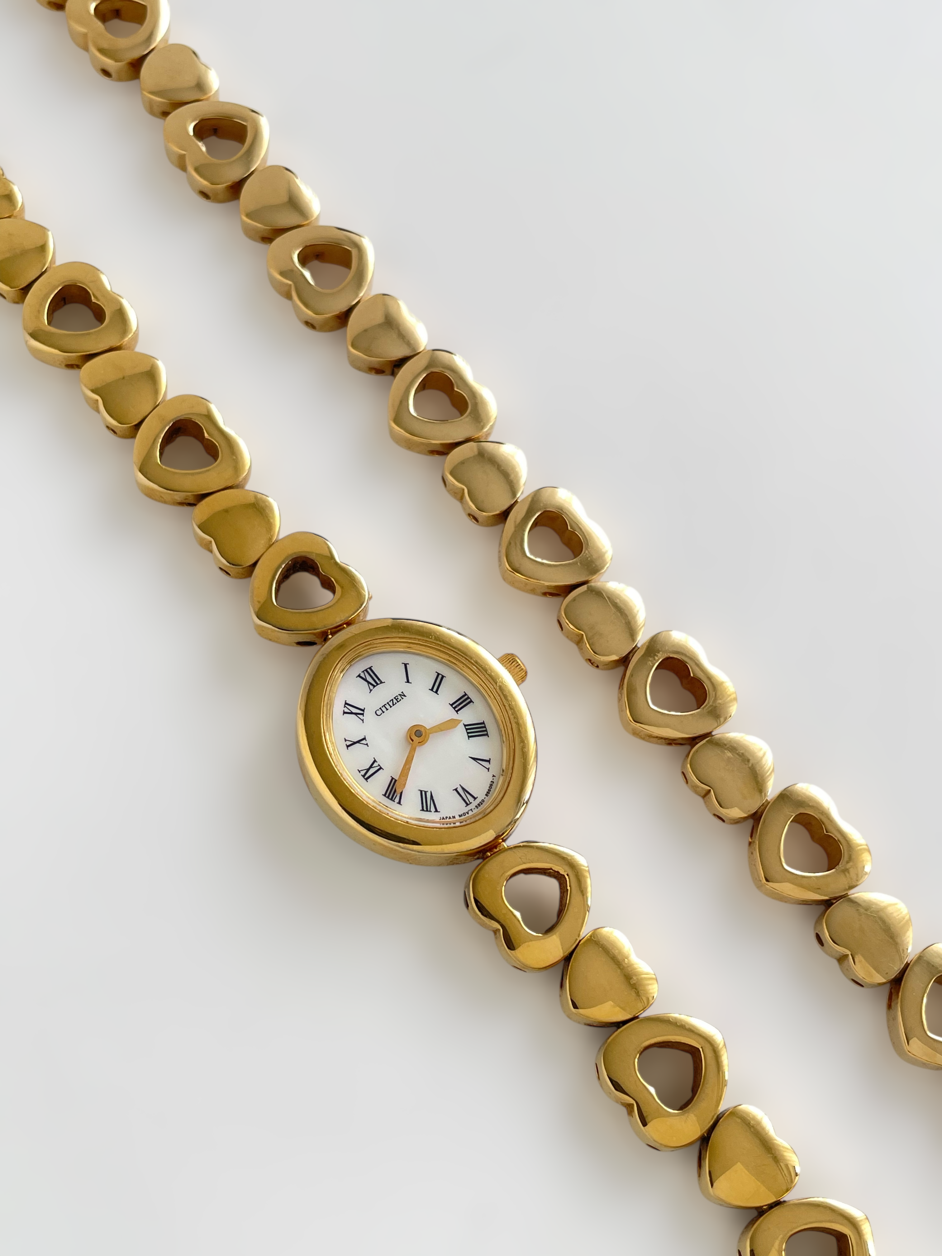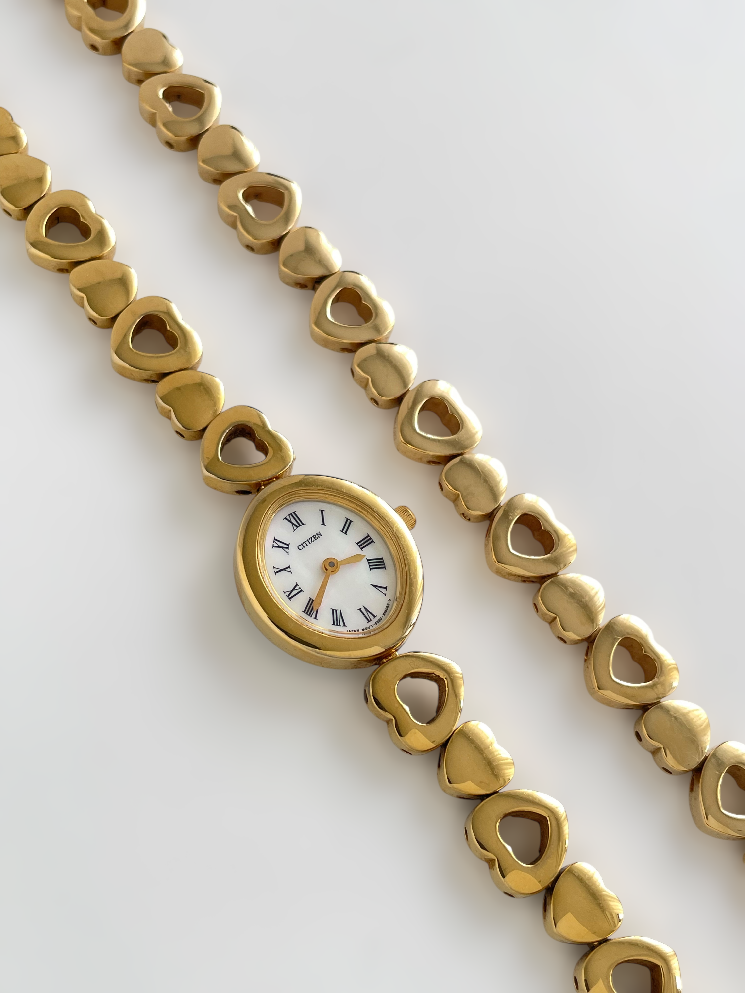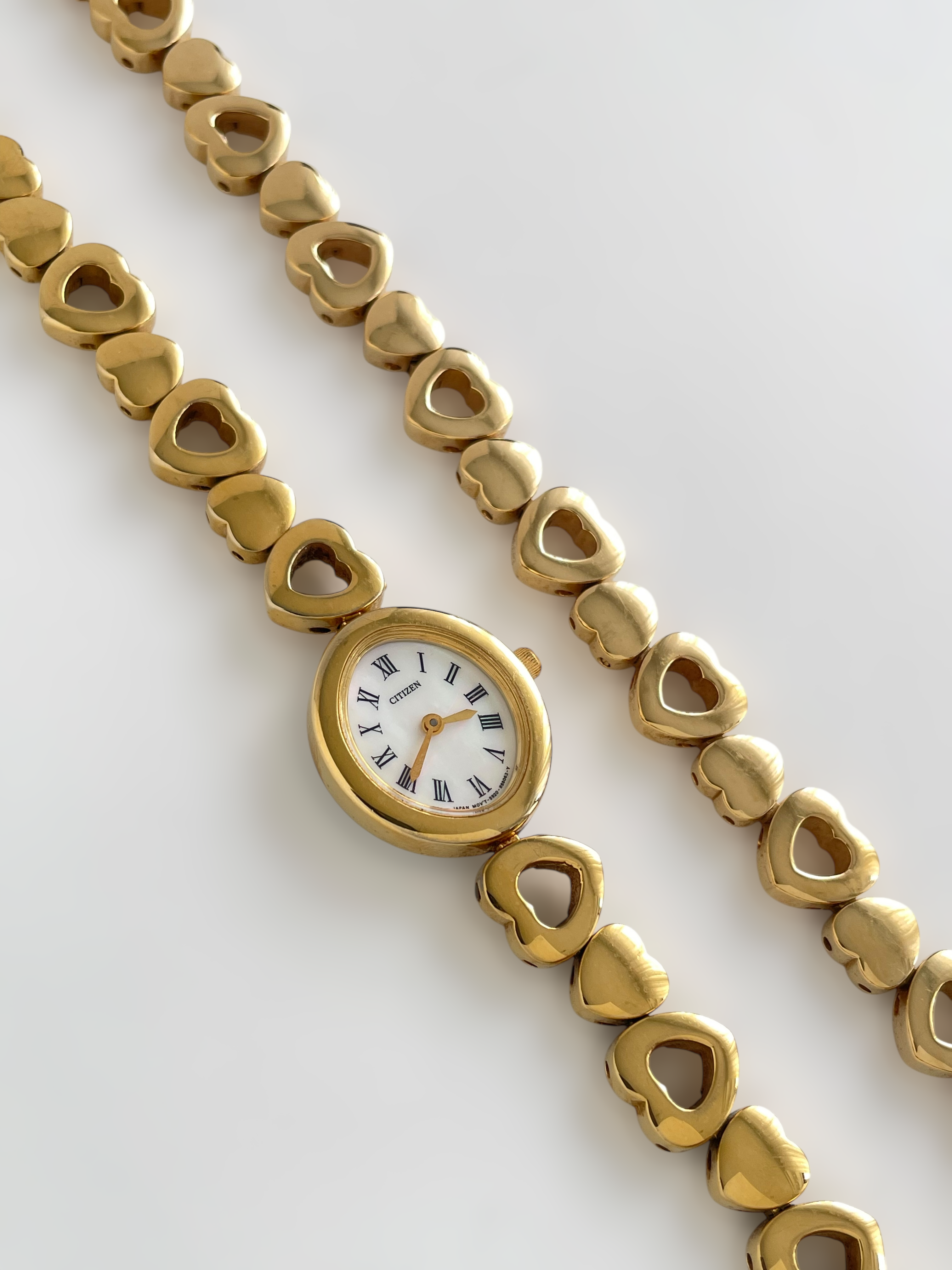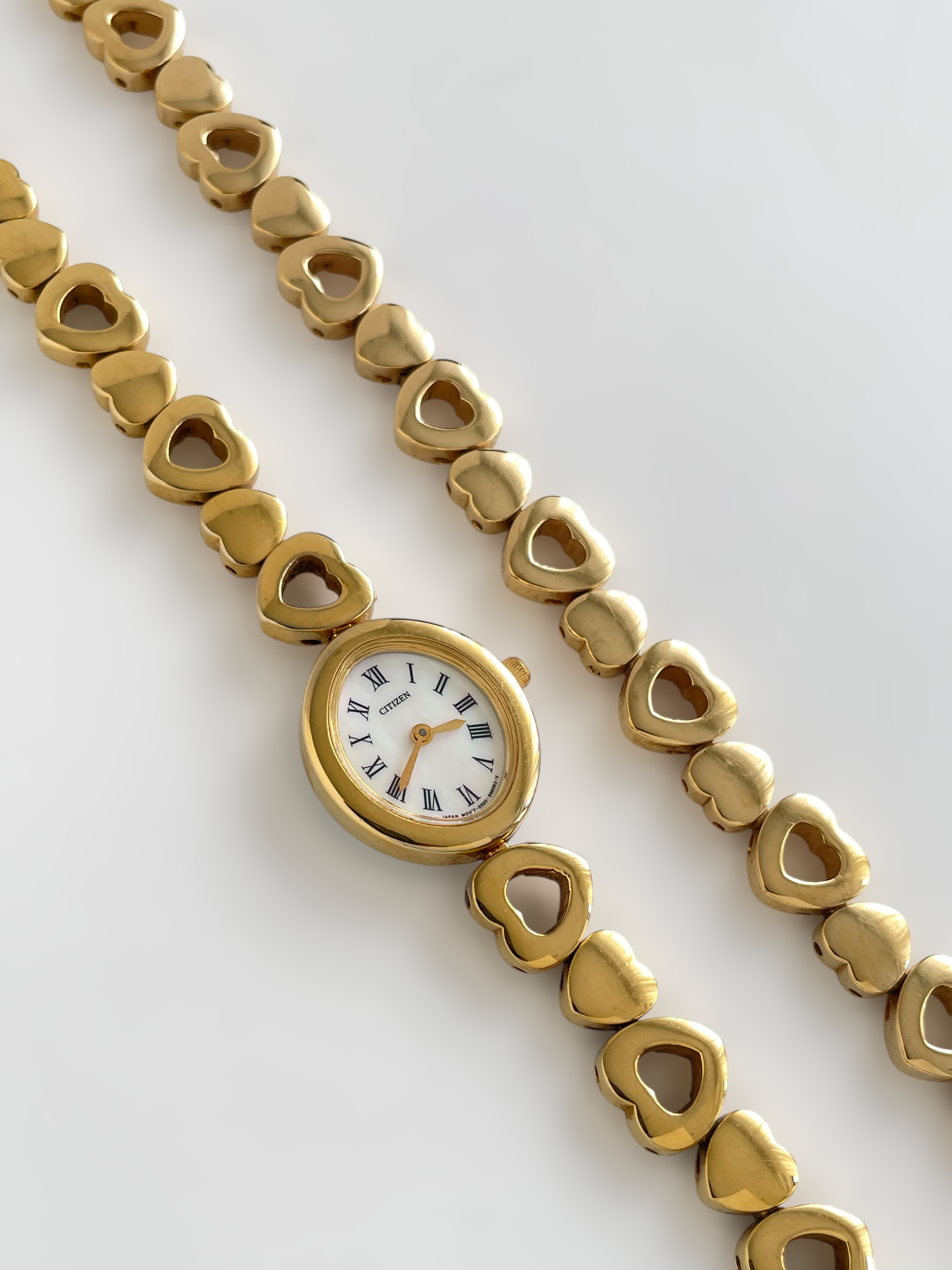 Beautiful vintage and gold plated Citizen watch set with the cutest heart link bracelet design and an oval case adorned with a mother of pearl face. Bracelet clasp closure.