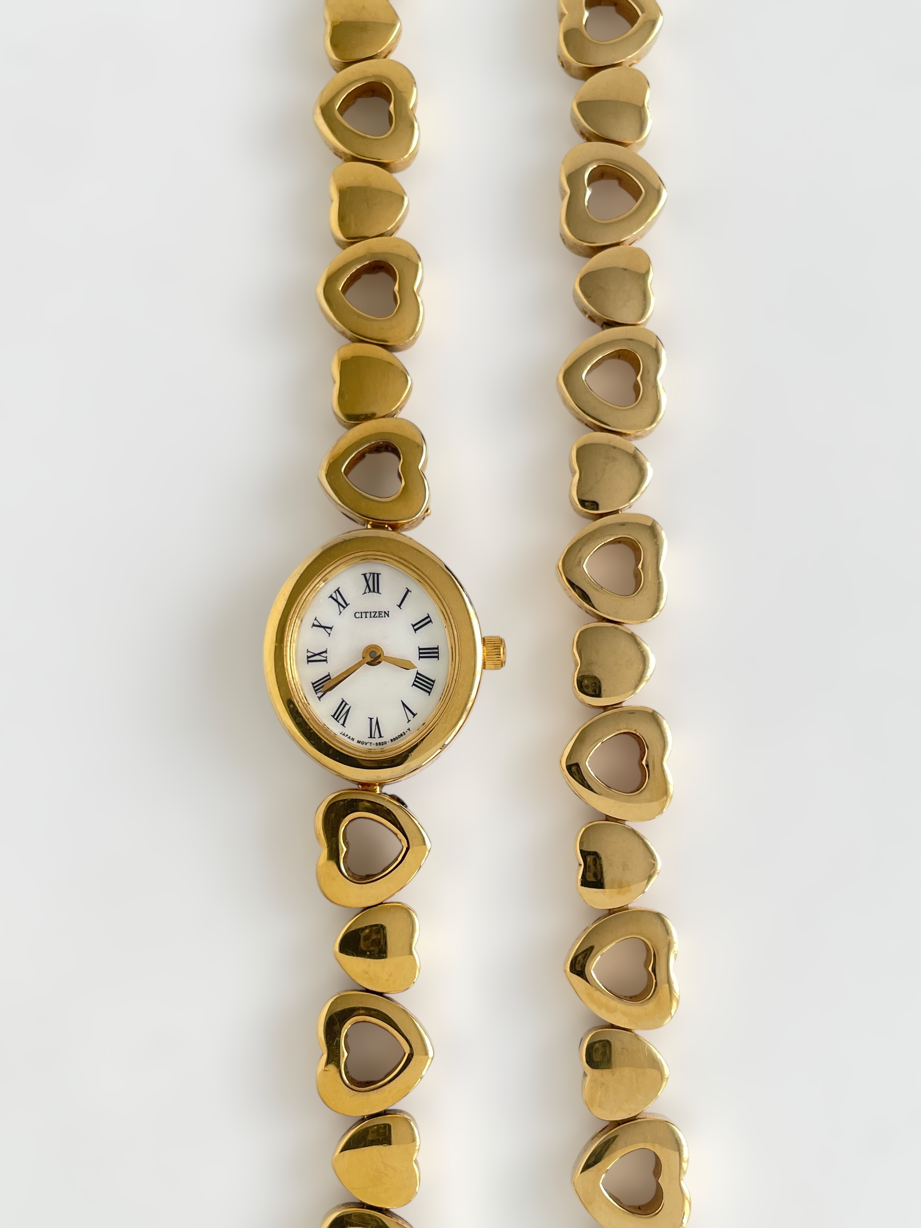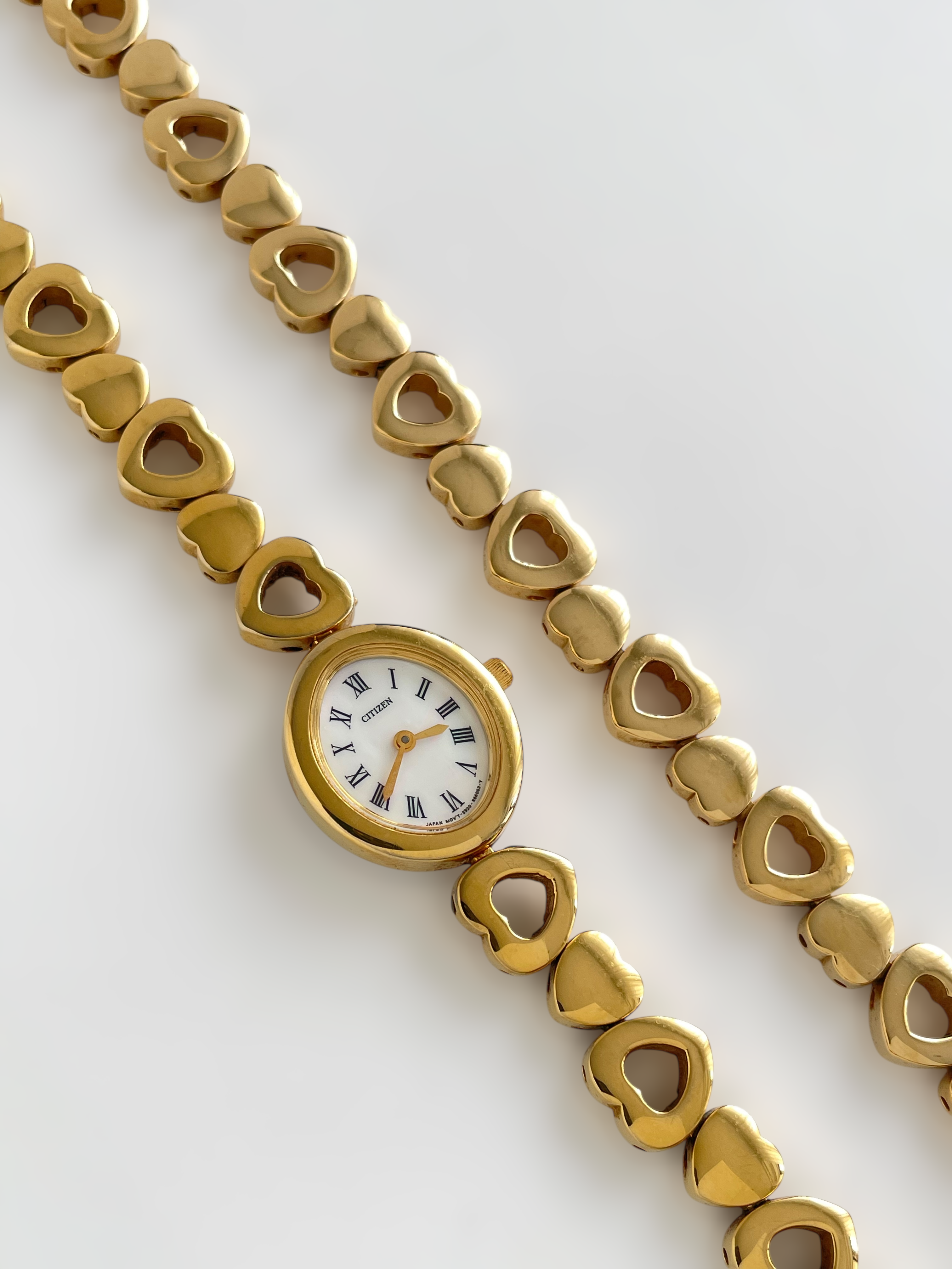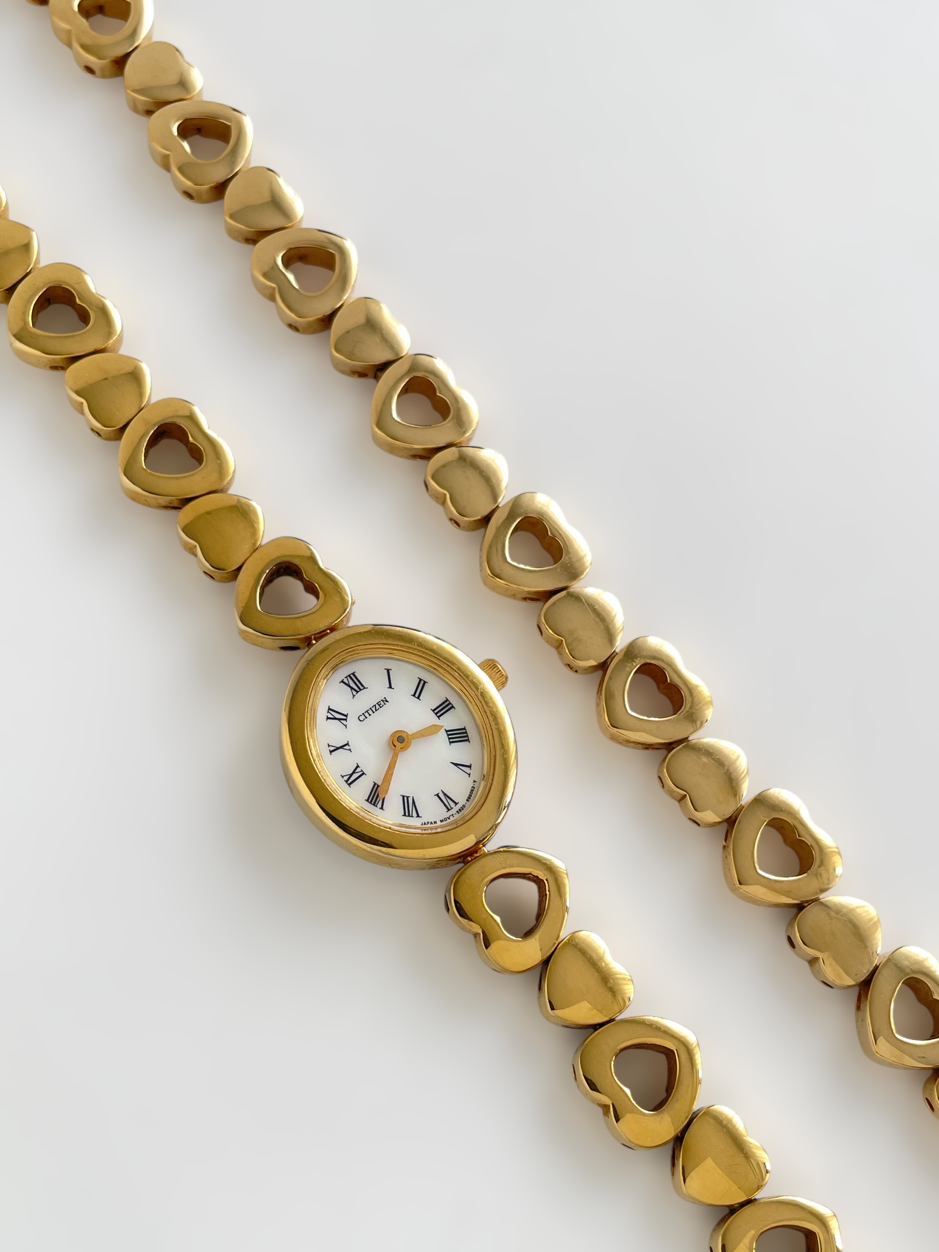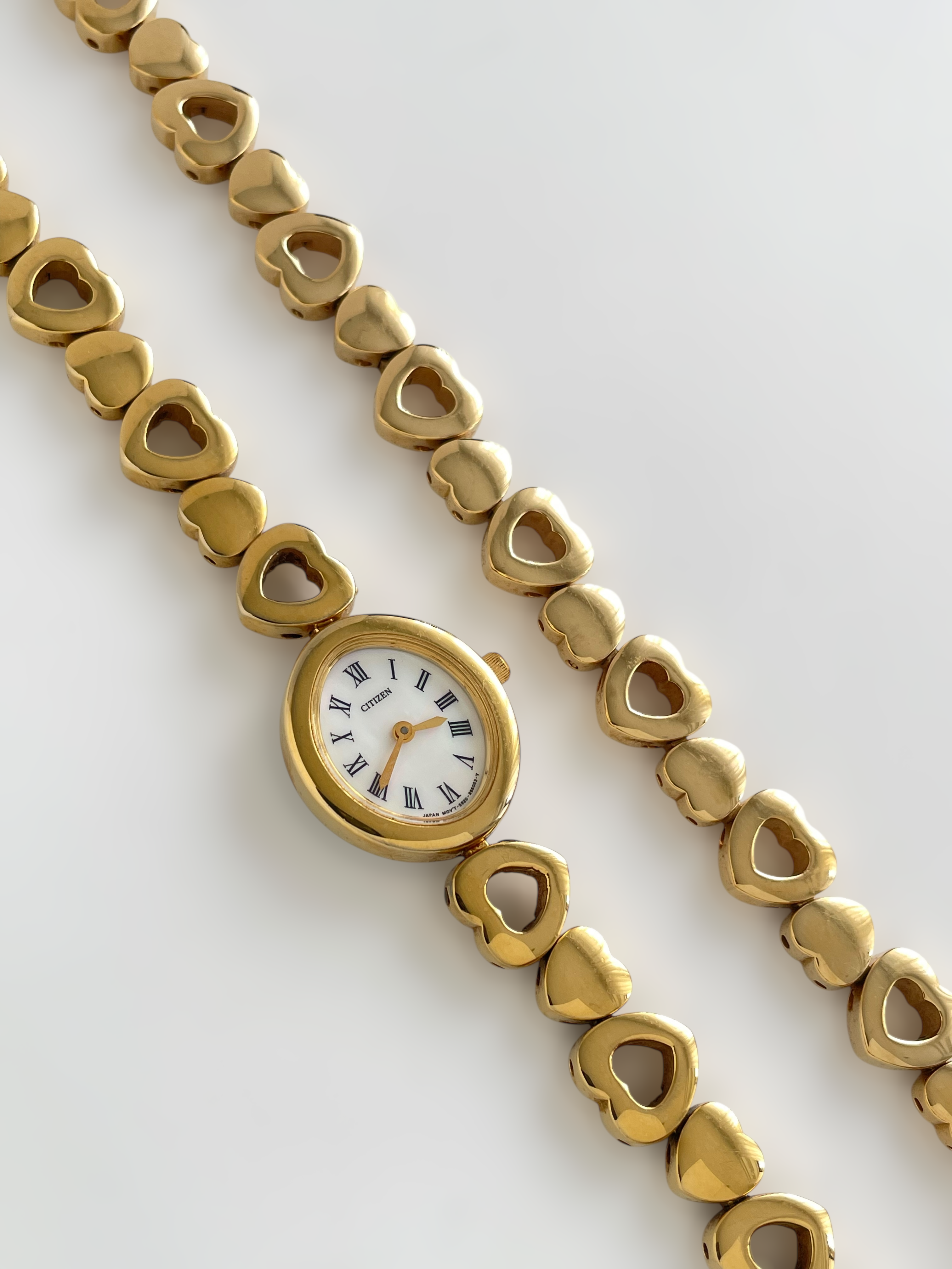 Beautiful vintage and gold plated Citizen watch set with the cutest heart link bracelet design and an oval case adorned with a mother of pearl face. Bracelet clasp closure.