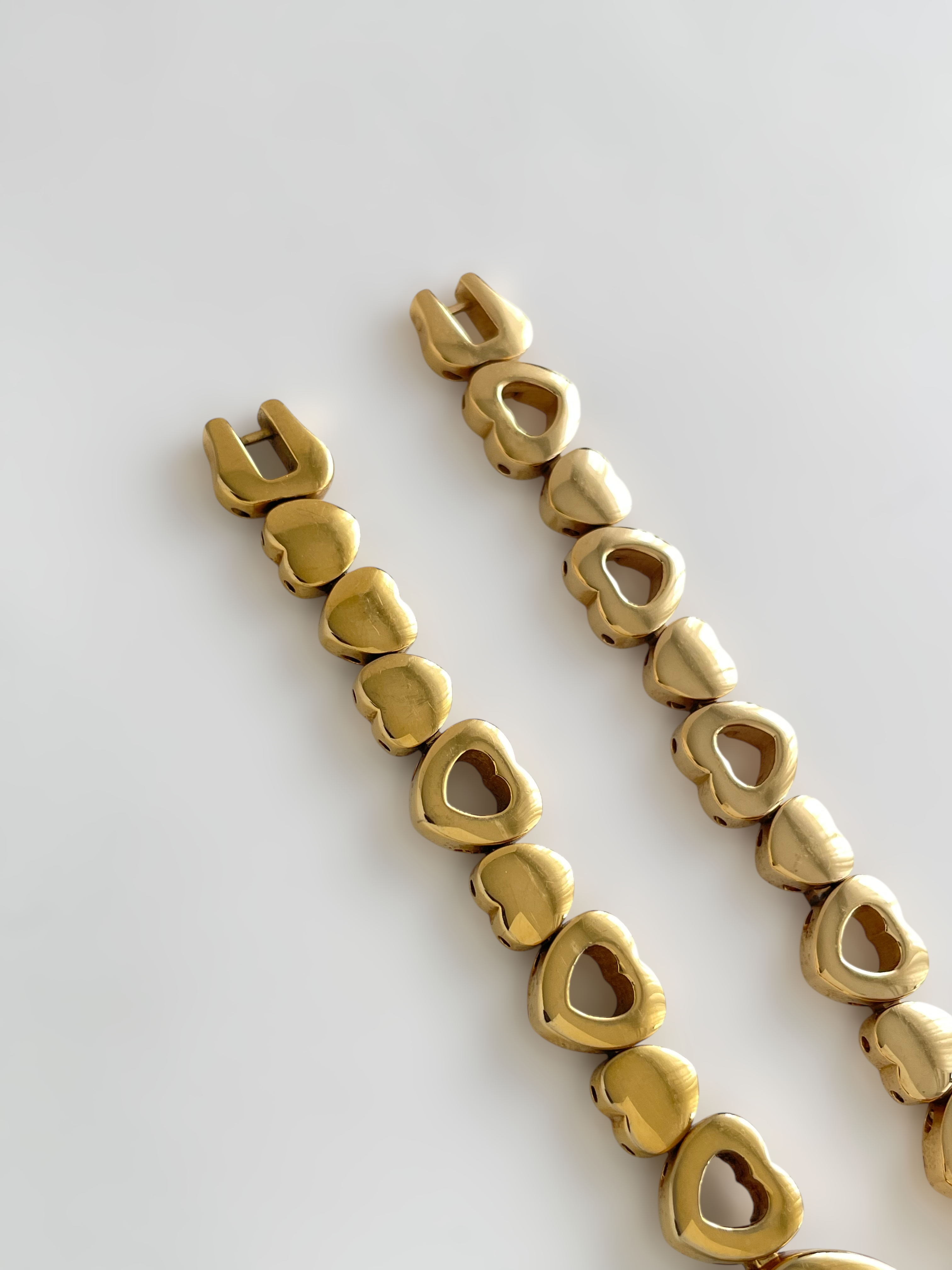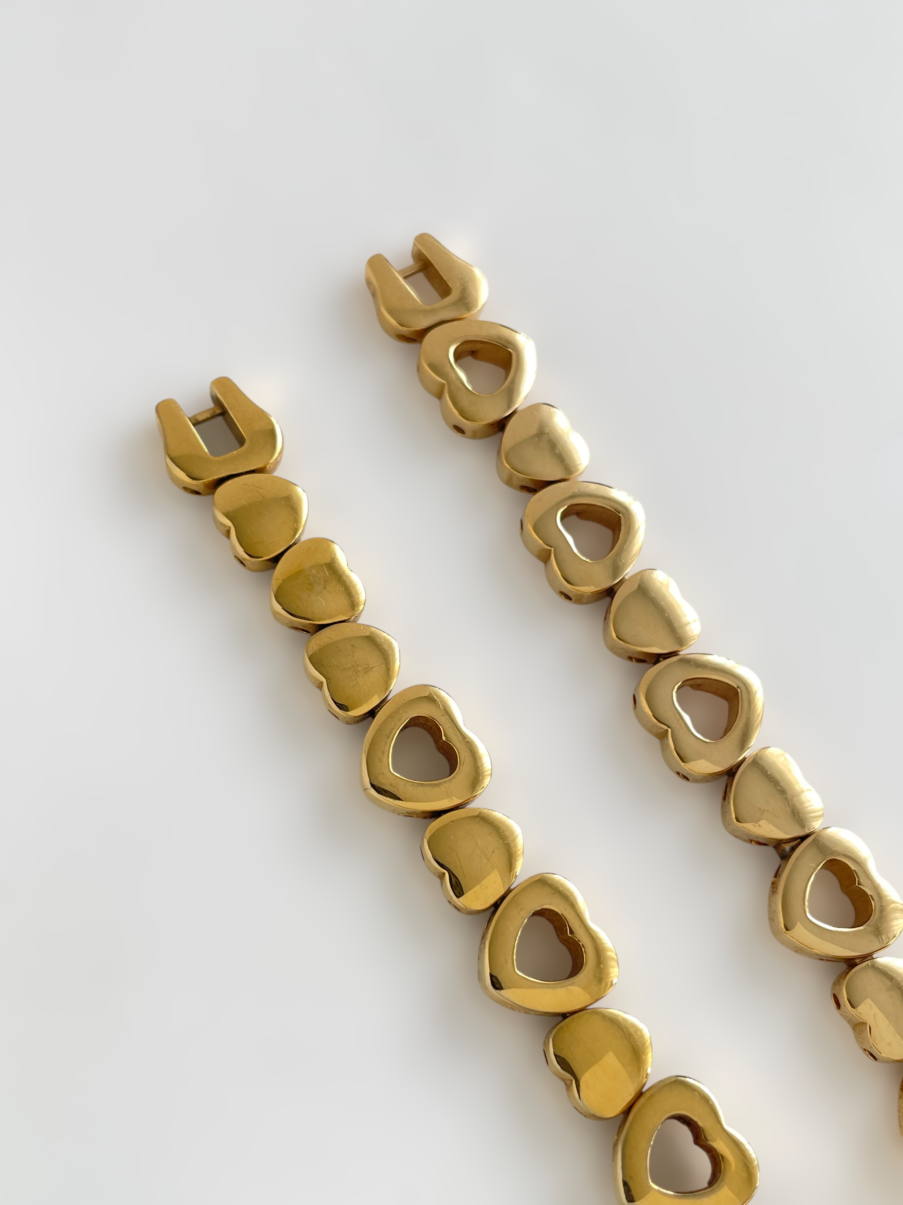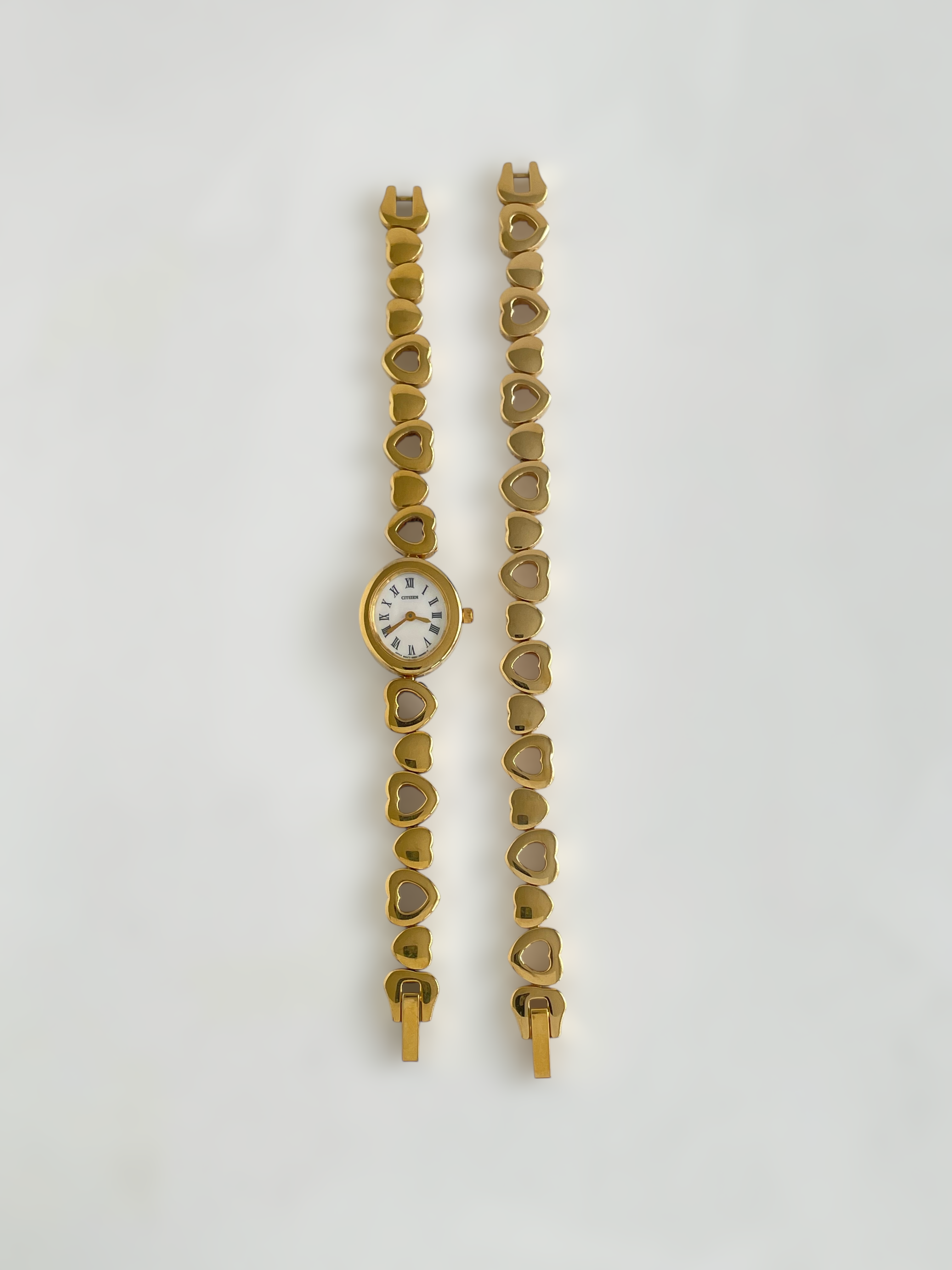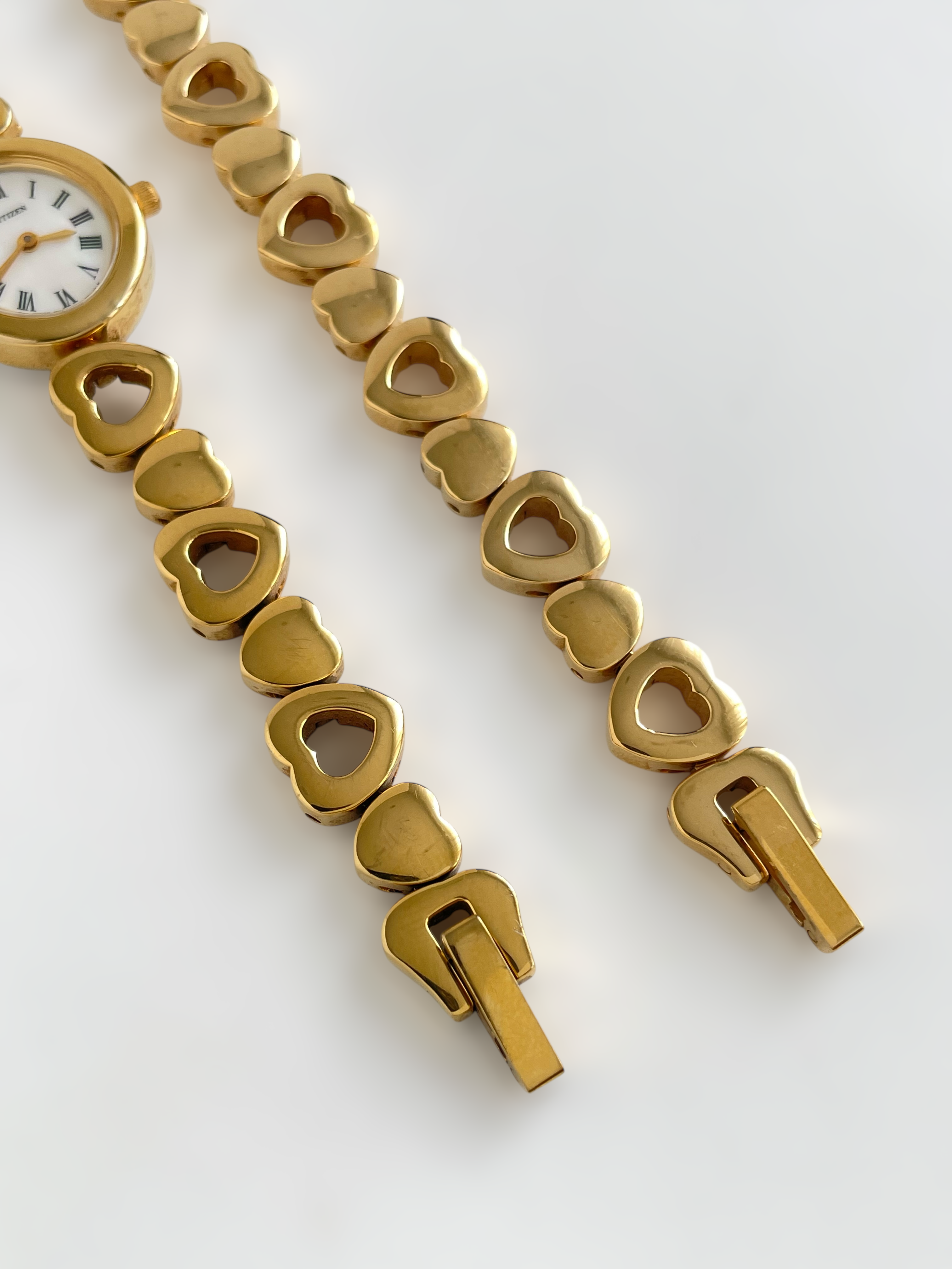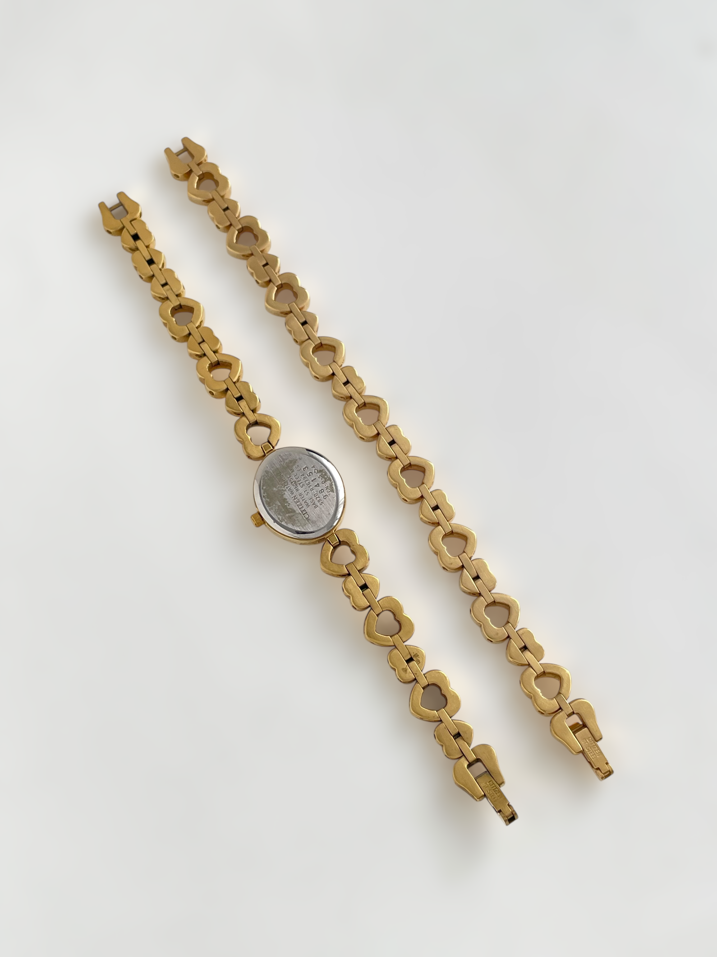 Beautiful vintage and gold plated Citizen watch set with the cutest heart link bracelet design and an oval case adorned with a mother of pearl face. Bracelet clasp closure.