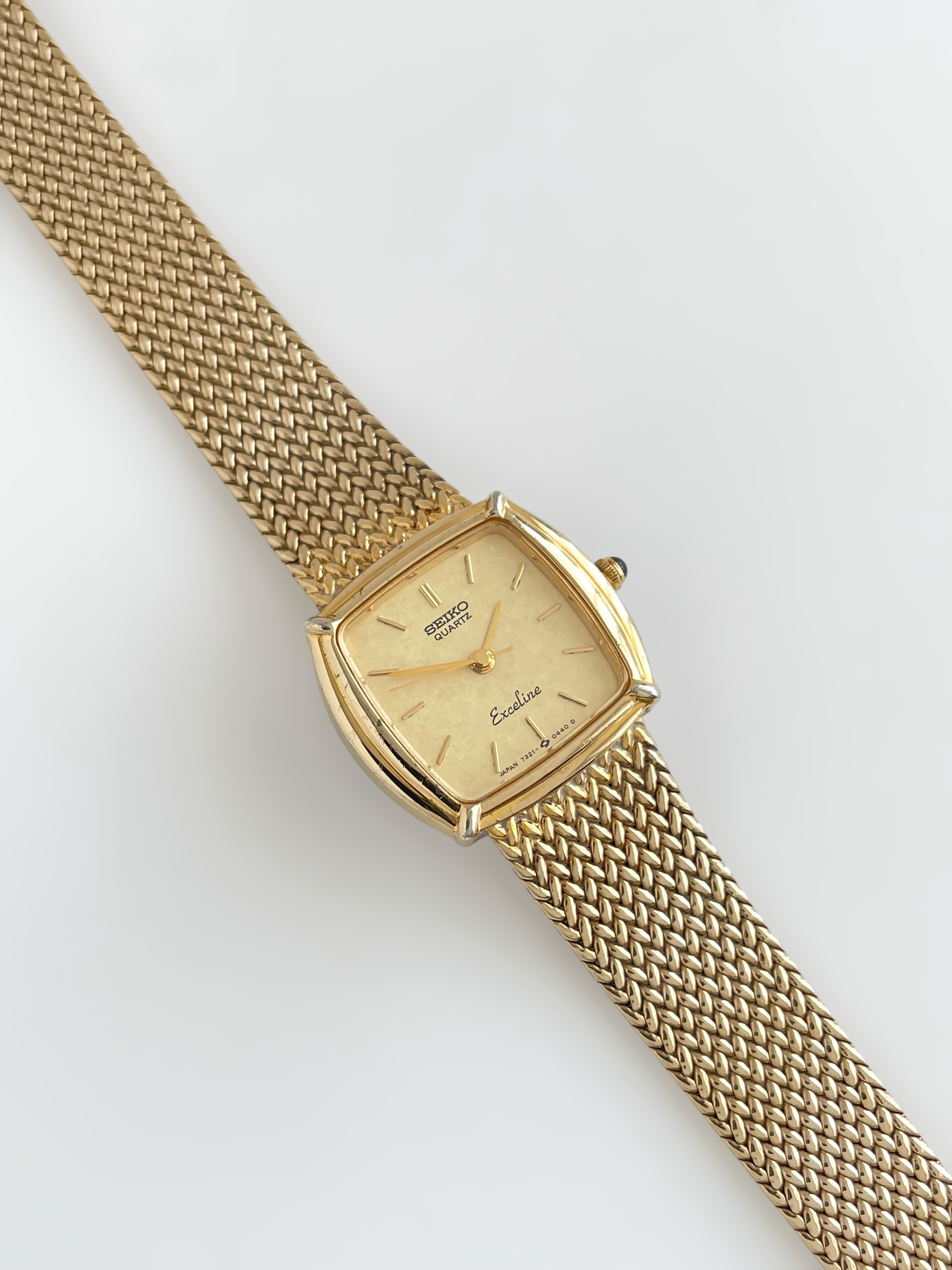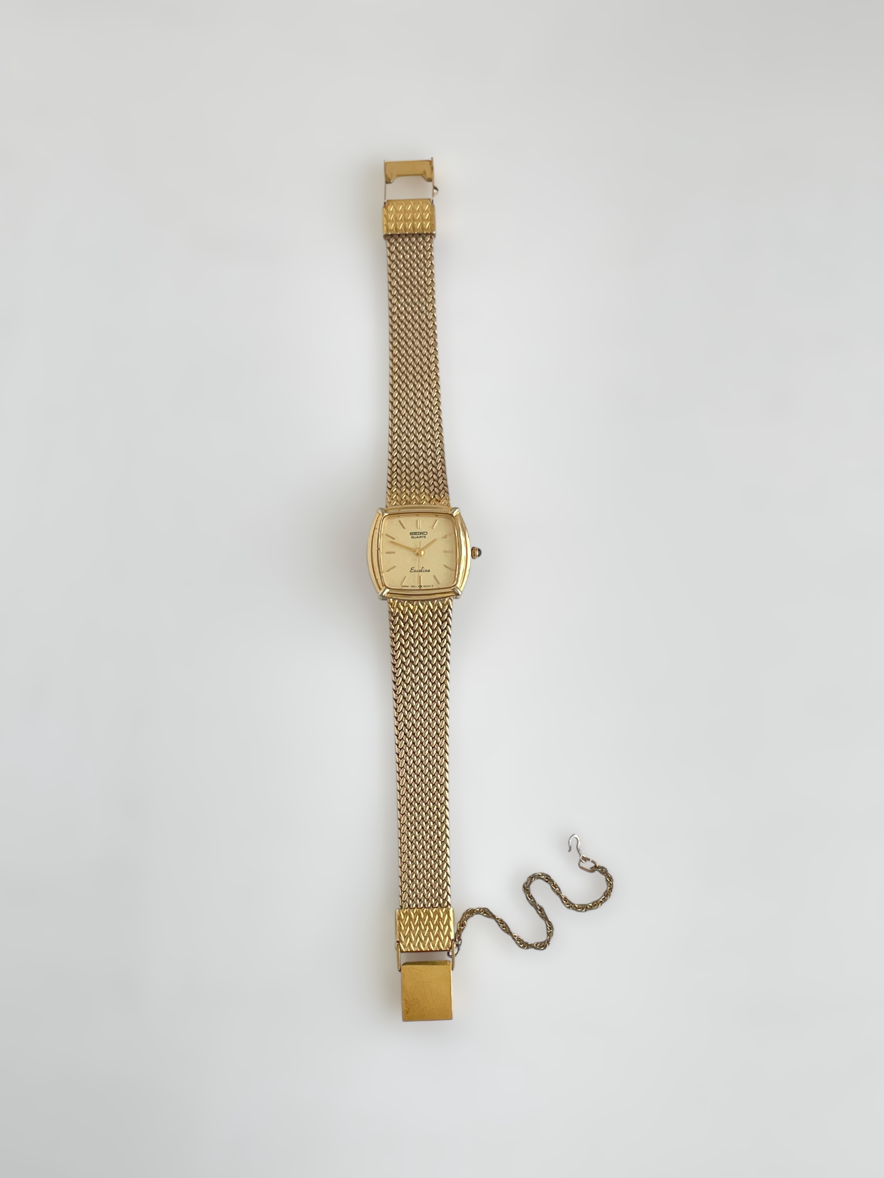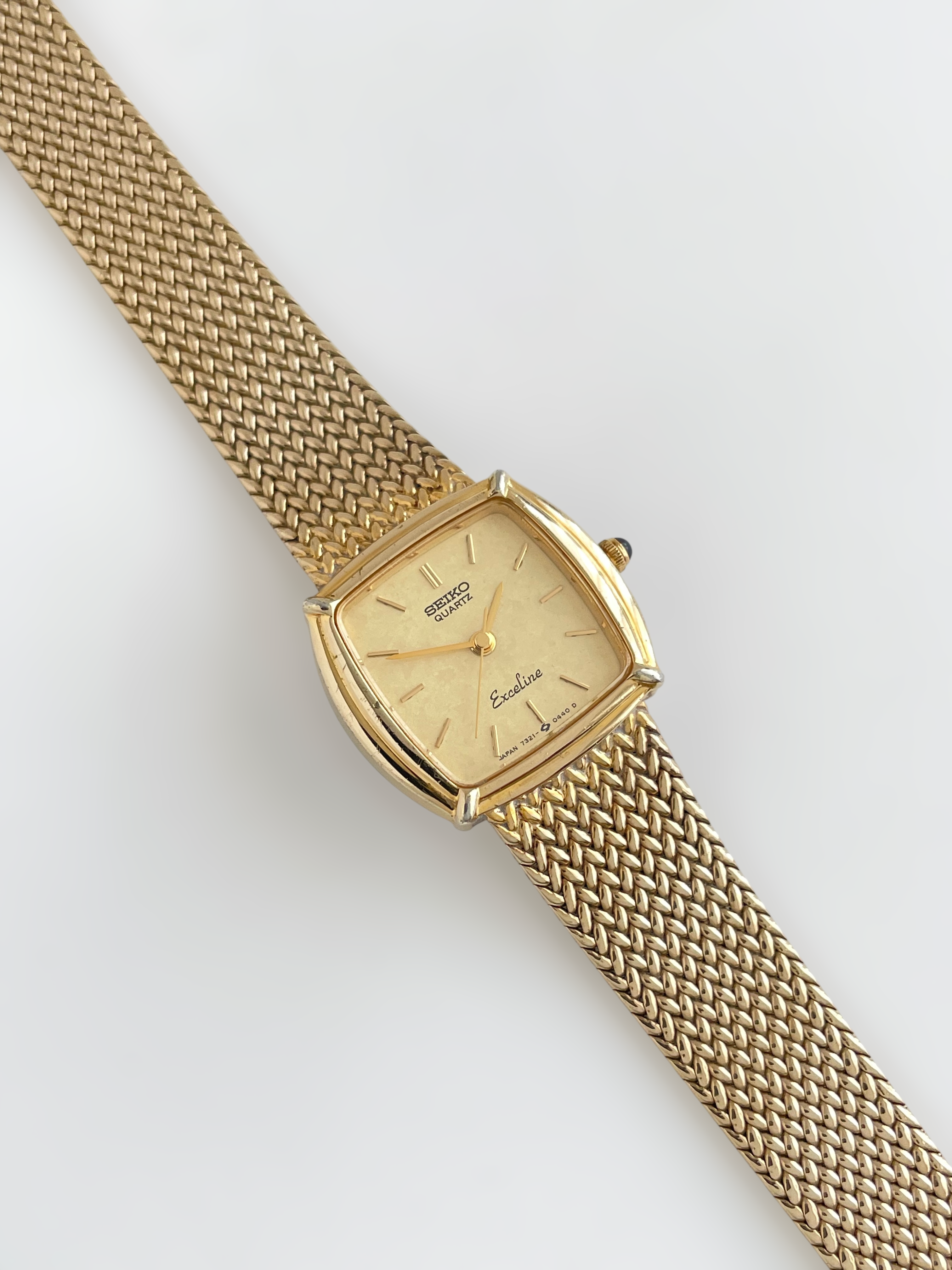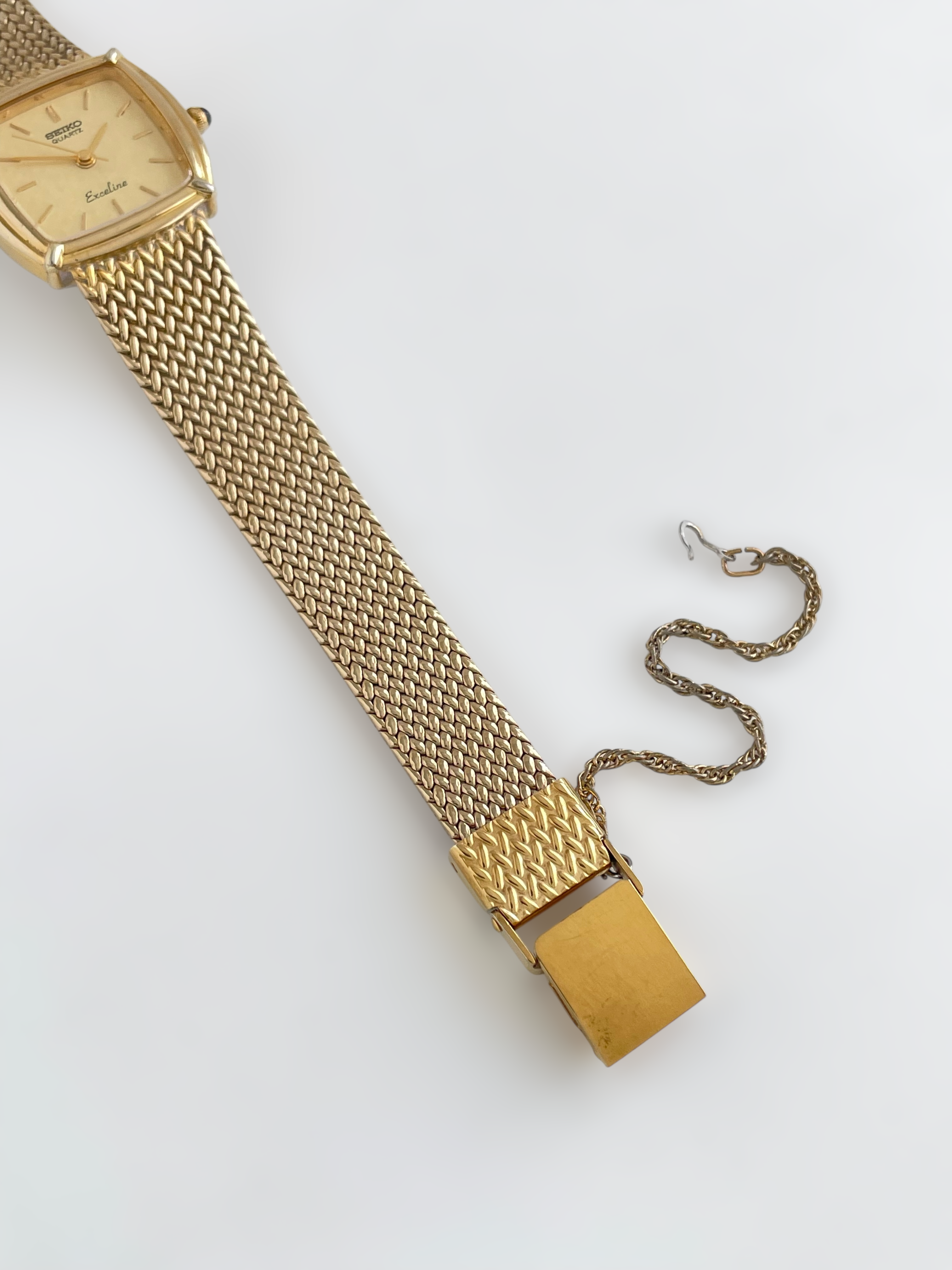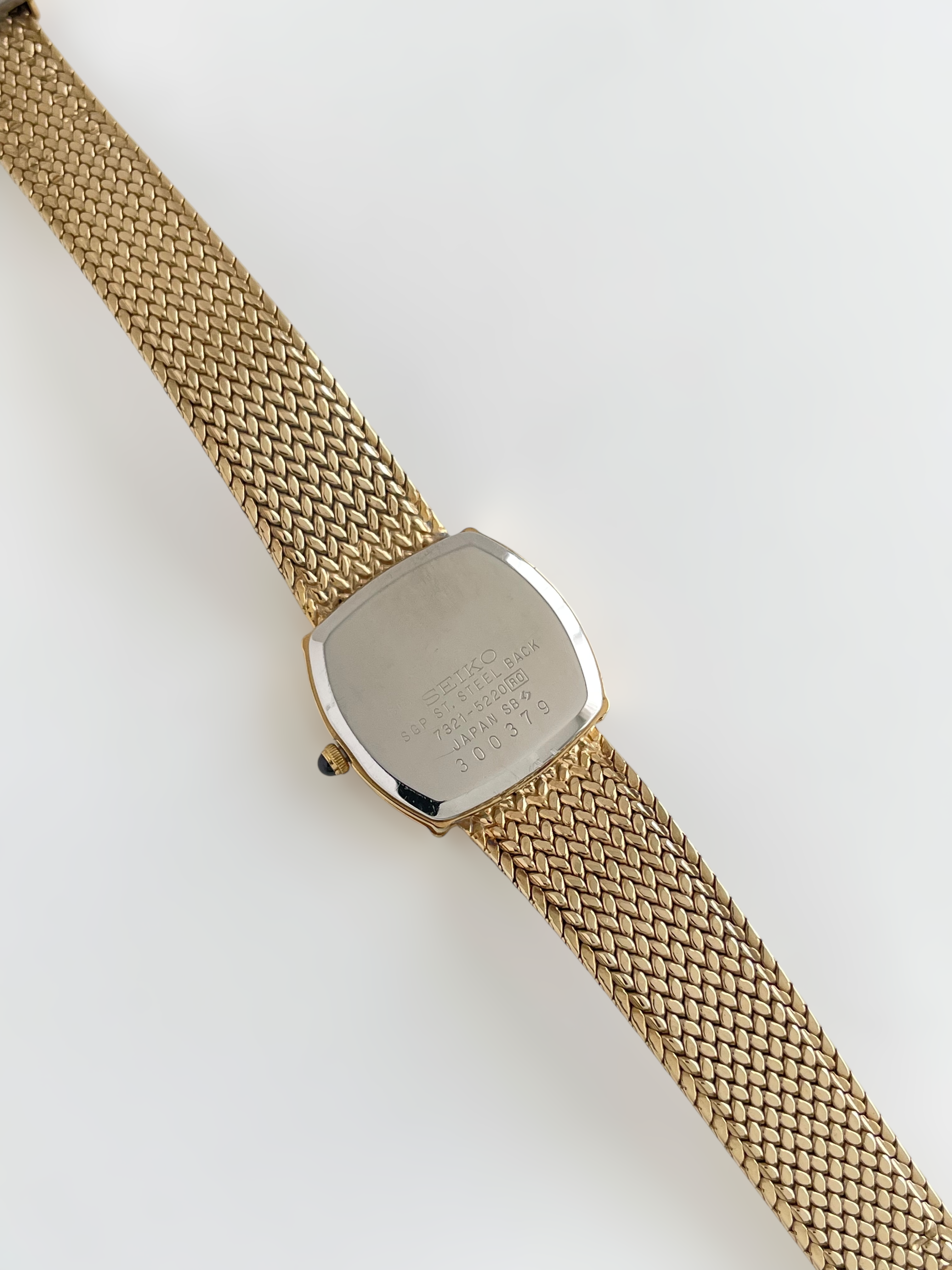 Beautiful vintage and gold plated Seiko watch with a flat bracelet design and a square case adorned with a unique bezel. Bracelet clasp closure with removable security chain.