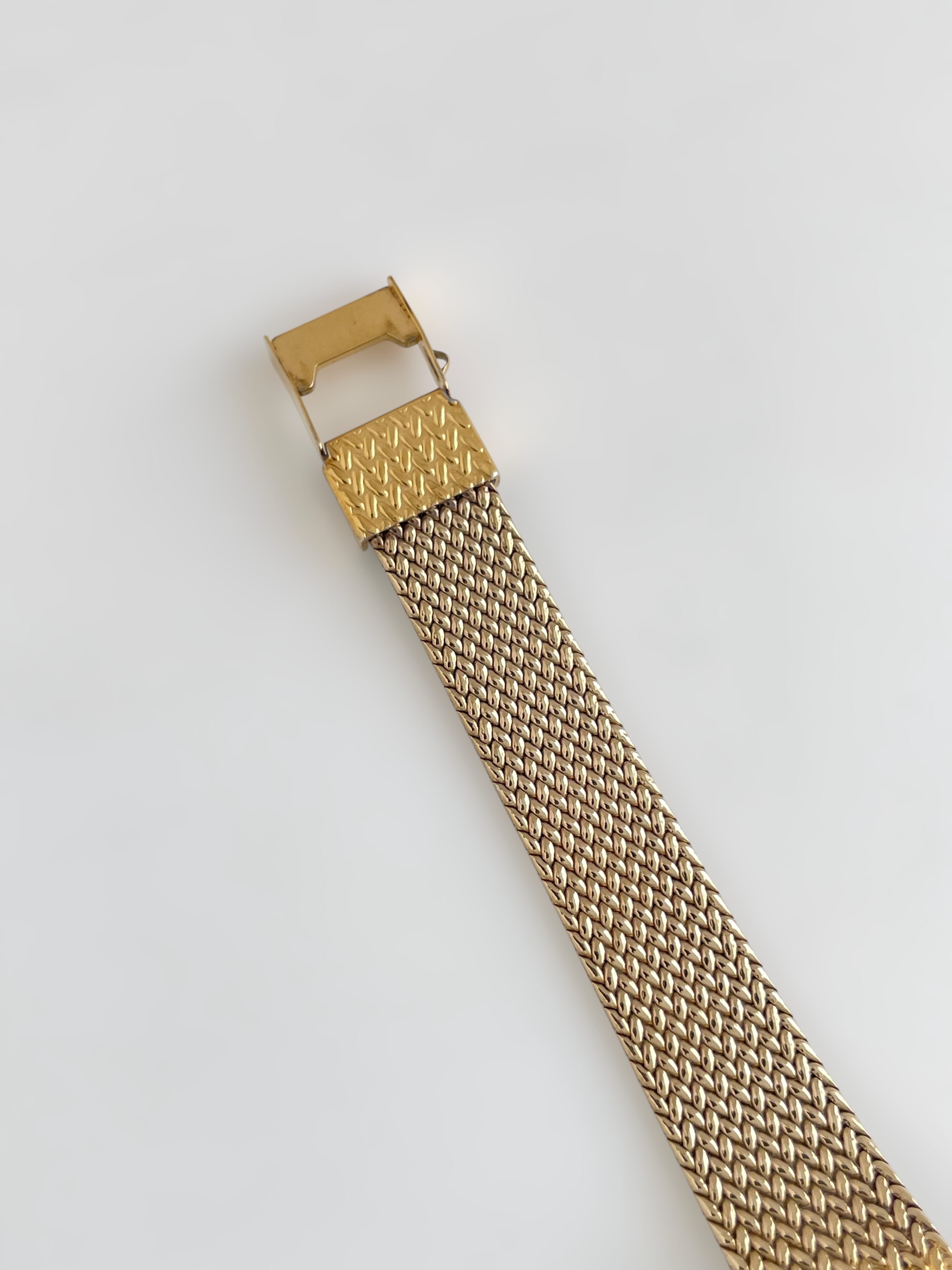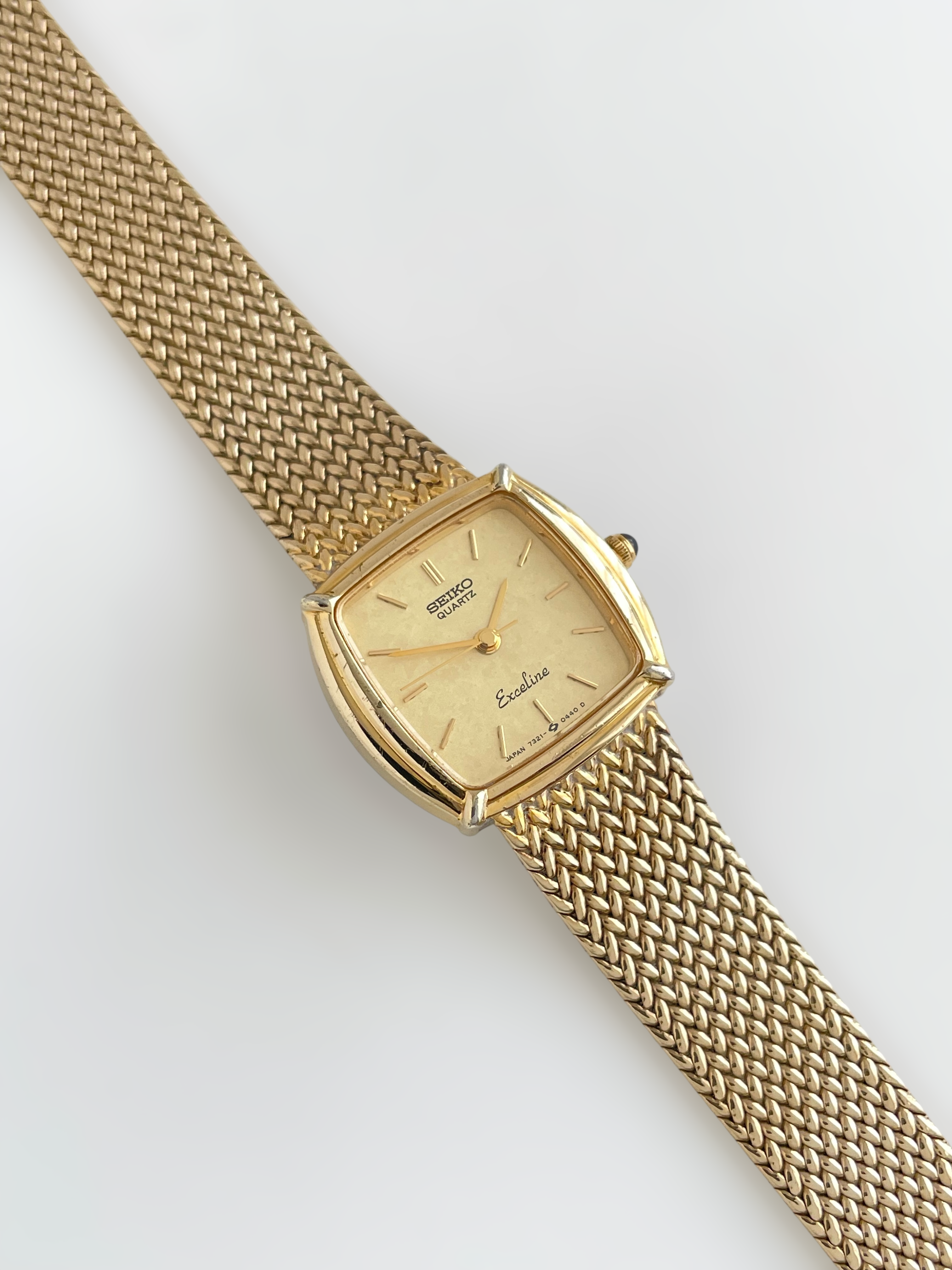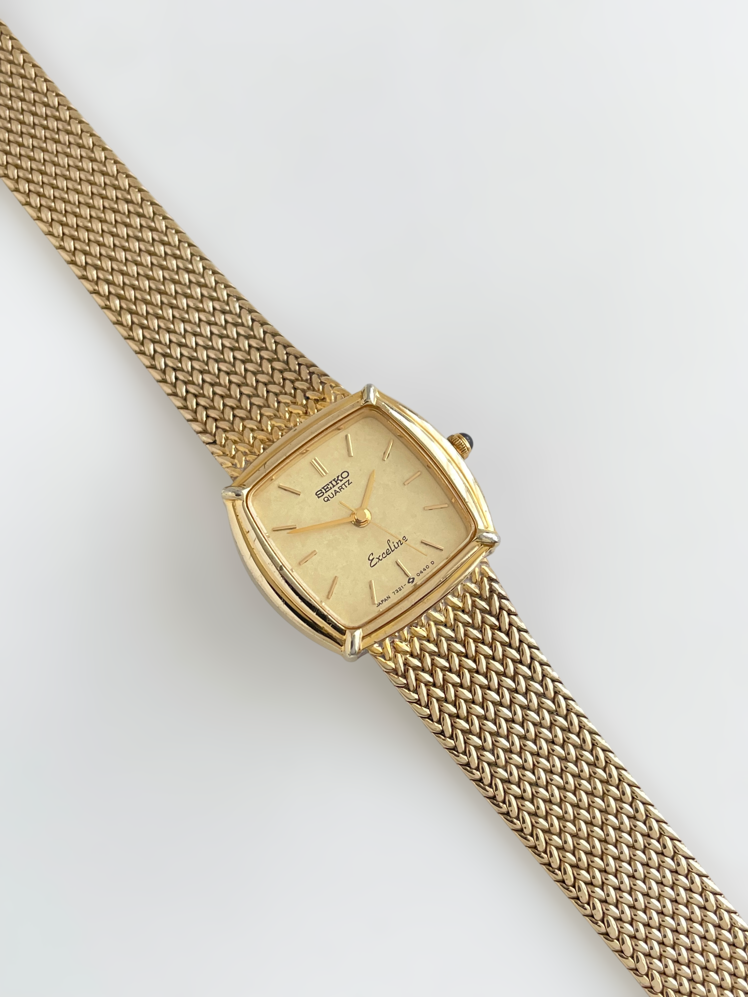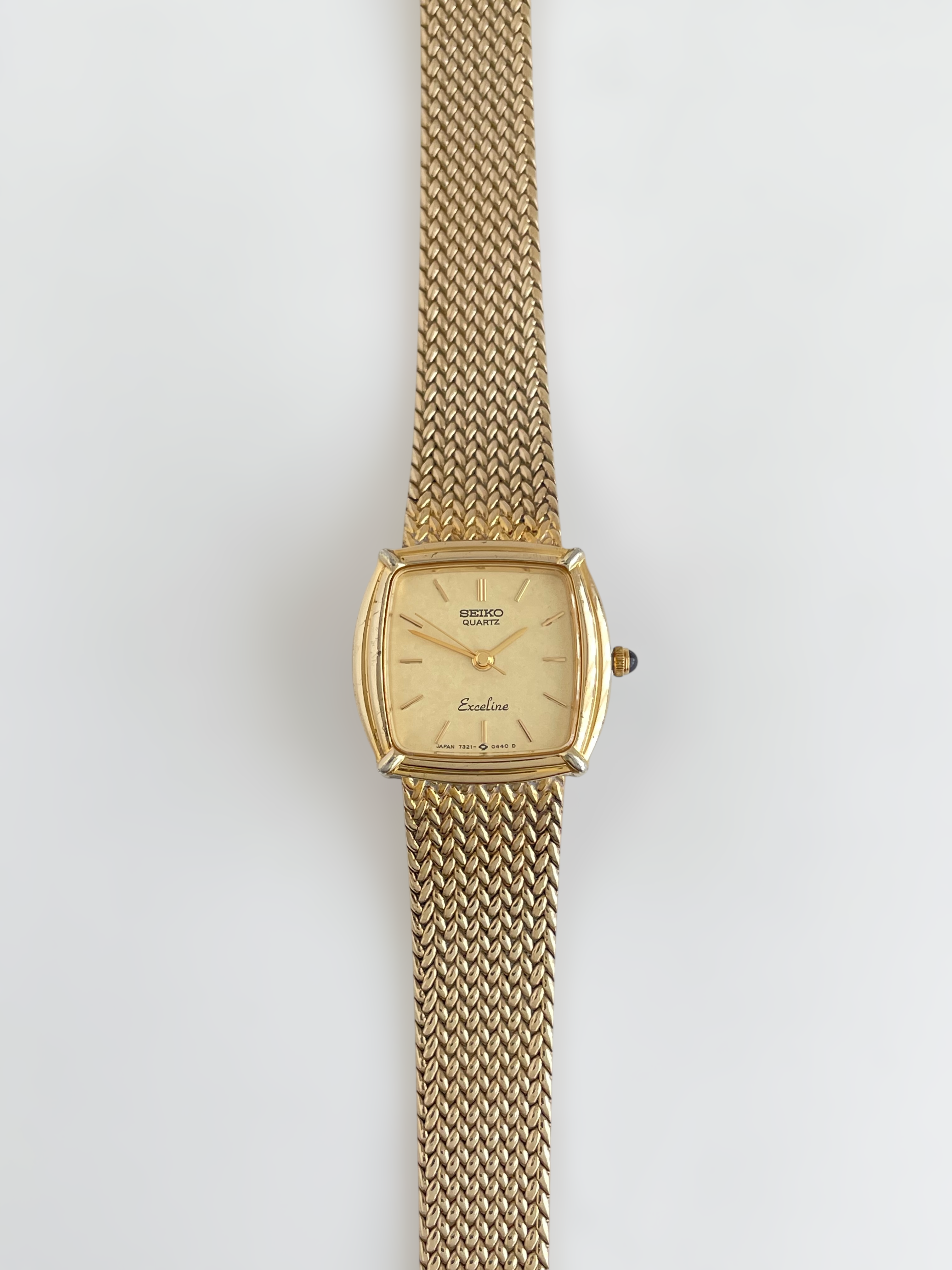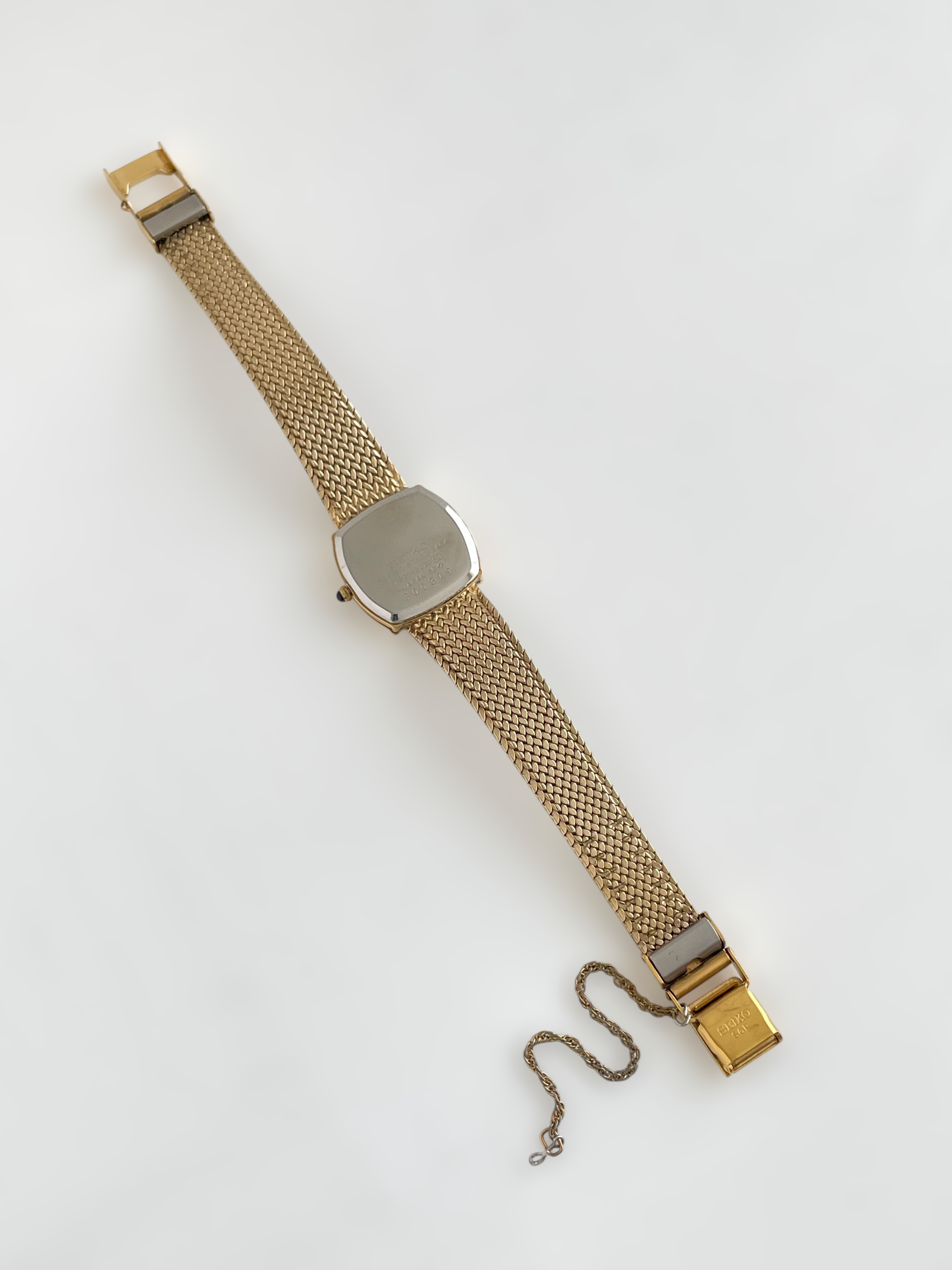 Beautiful vintage and gold plated Seiko watch with a flat bracelet design and a square case adorned with a unique bezel. Bracelet clasp closure with removable security chain.