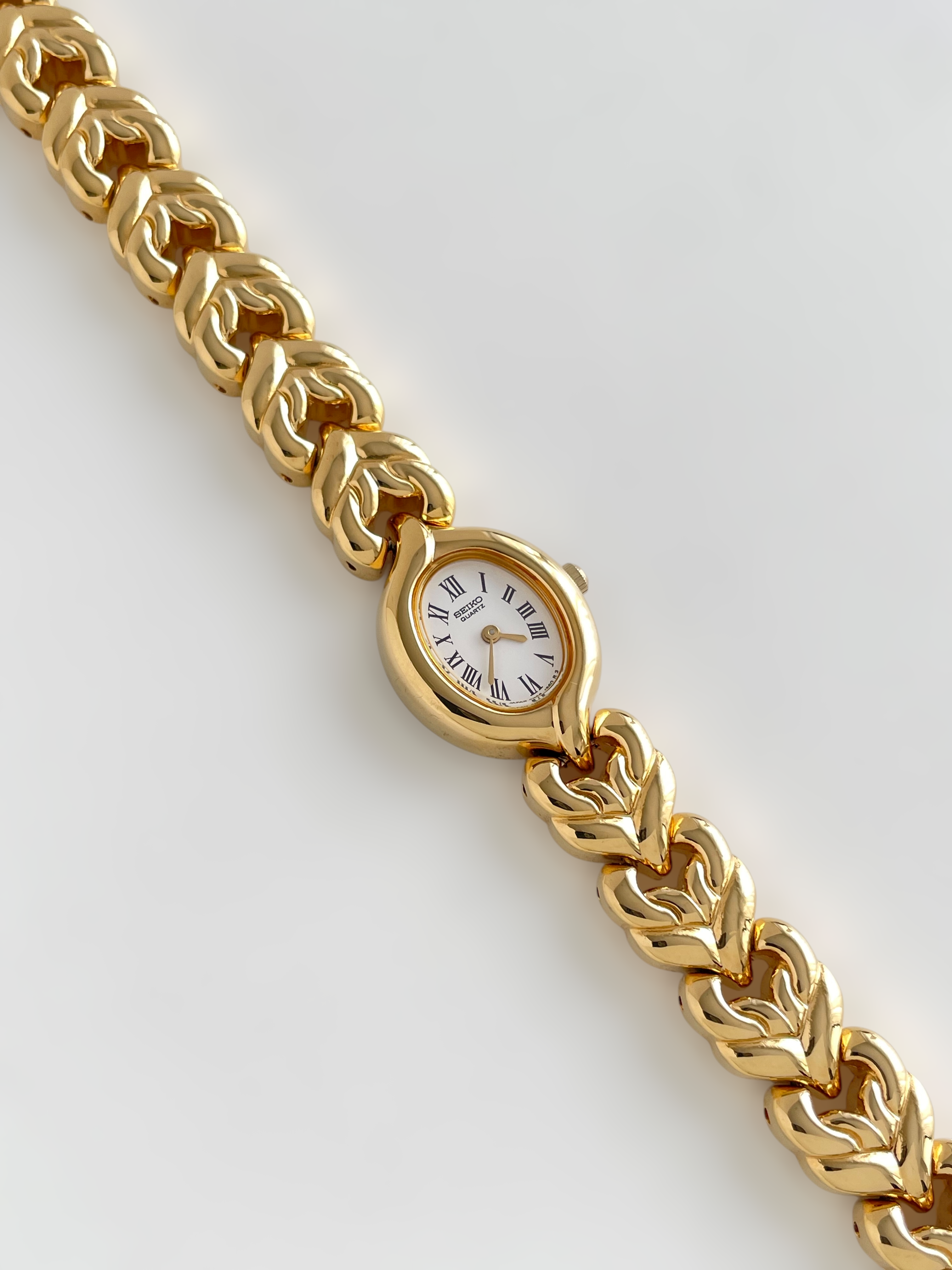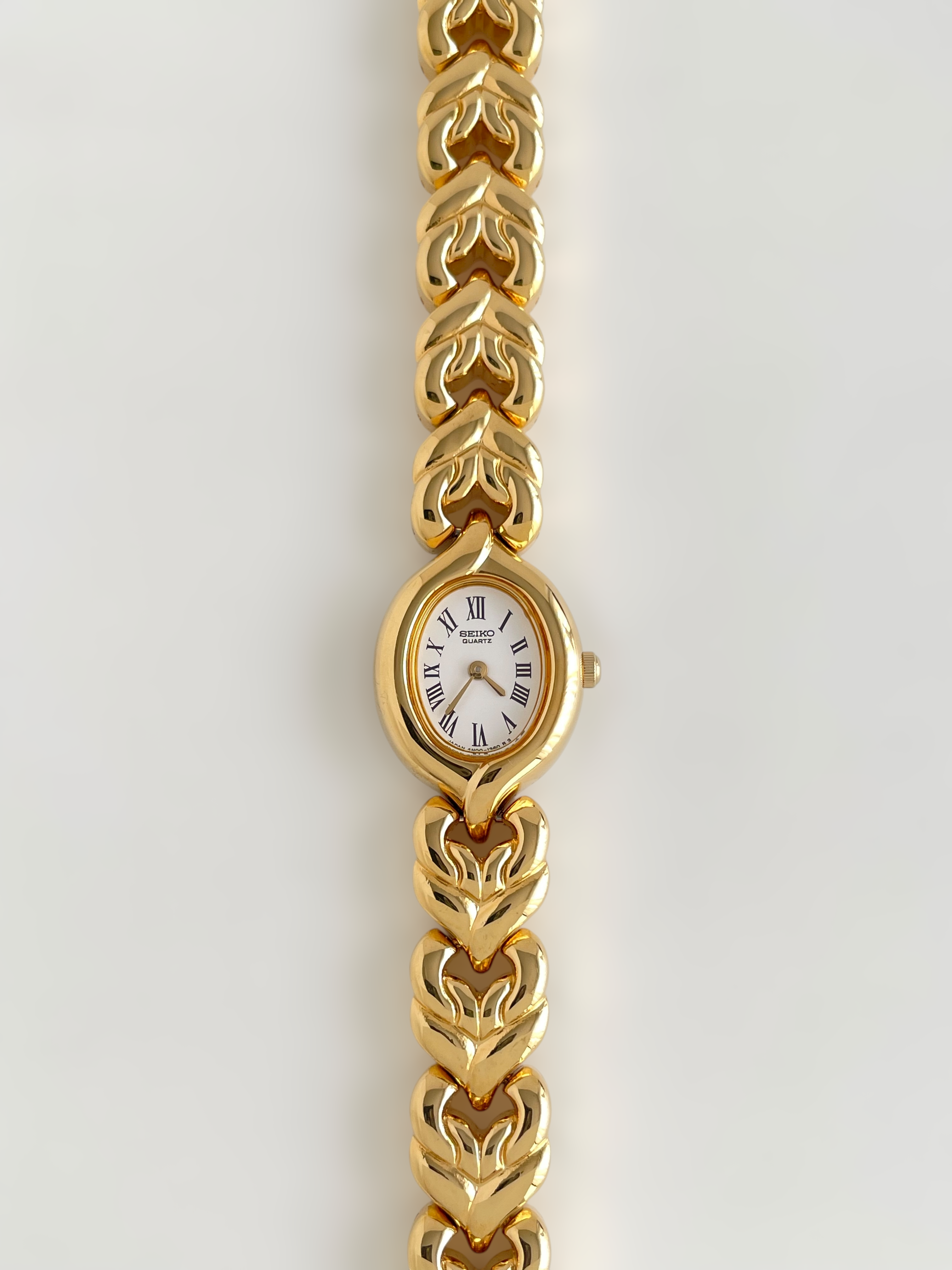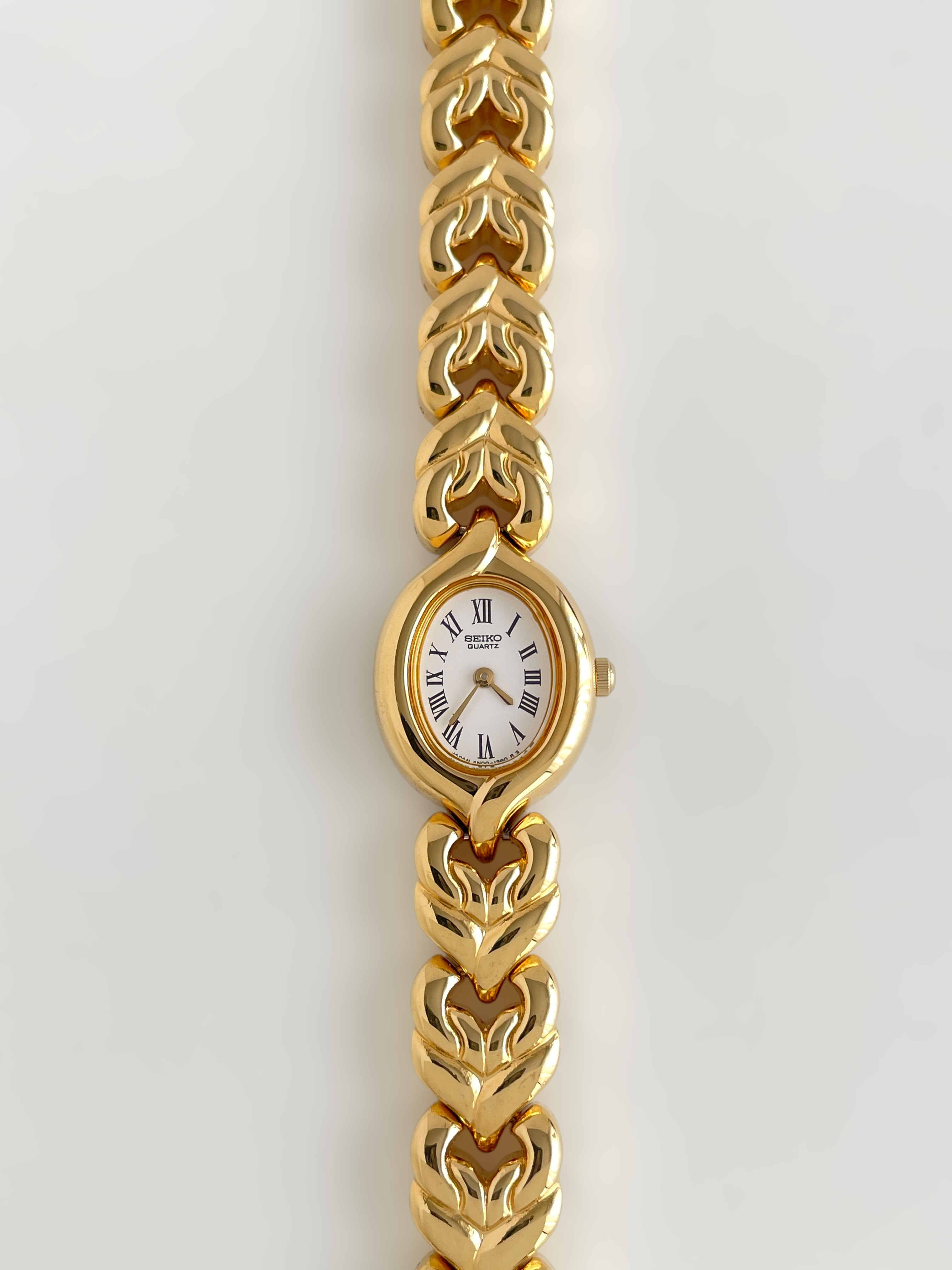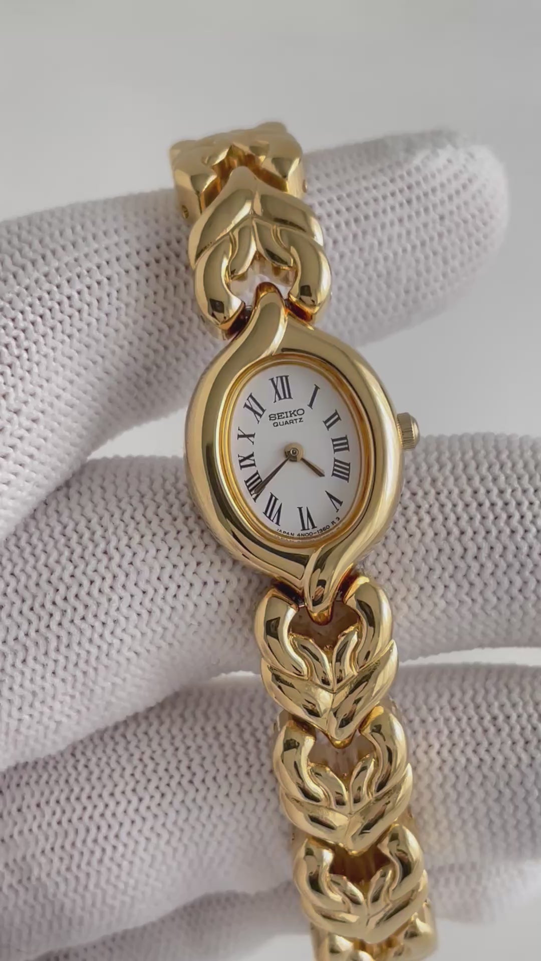 Gorgeous vintage and gold plated rare Seiko watch with an incredible bracelet design and a petite oval case. Iconic Seiko twist closure clasp.