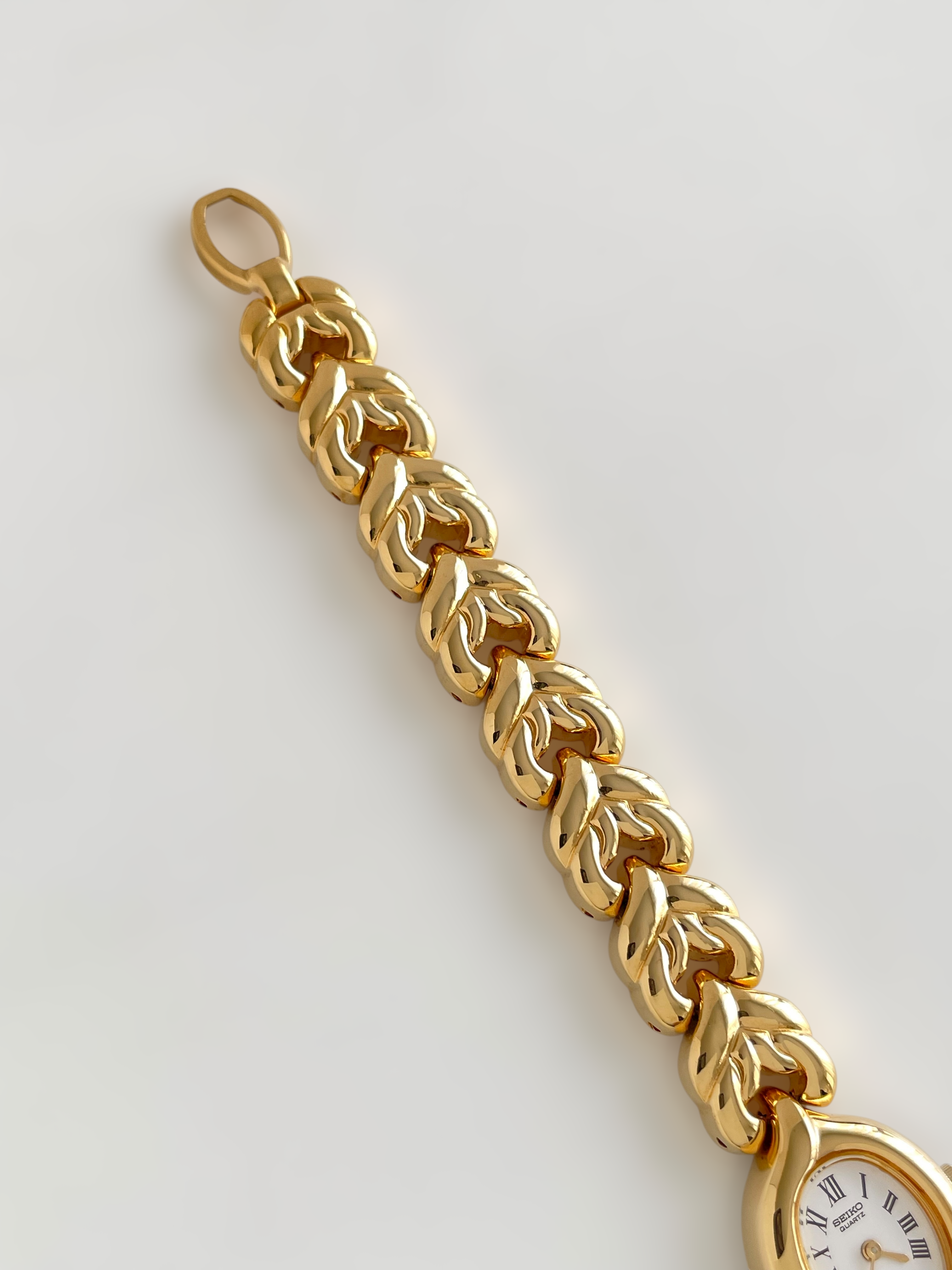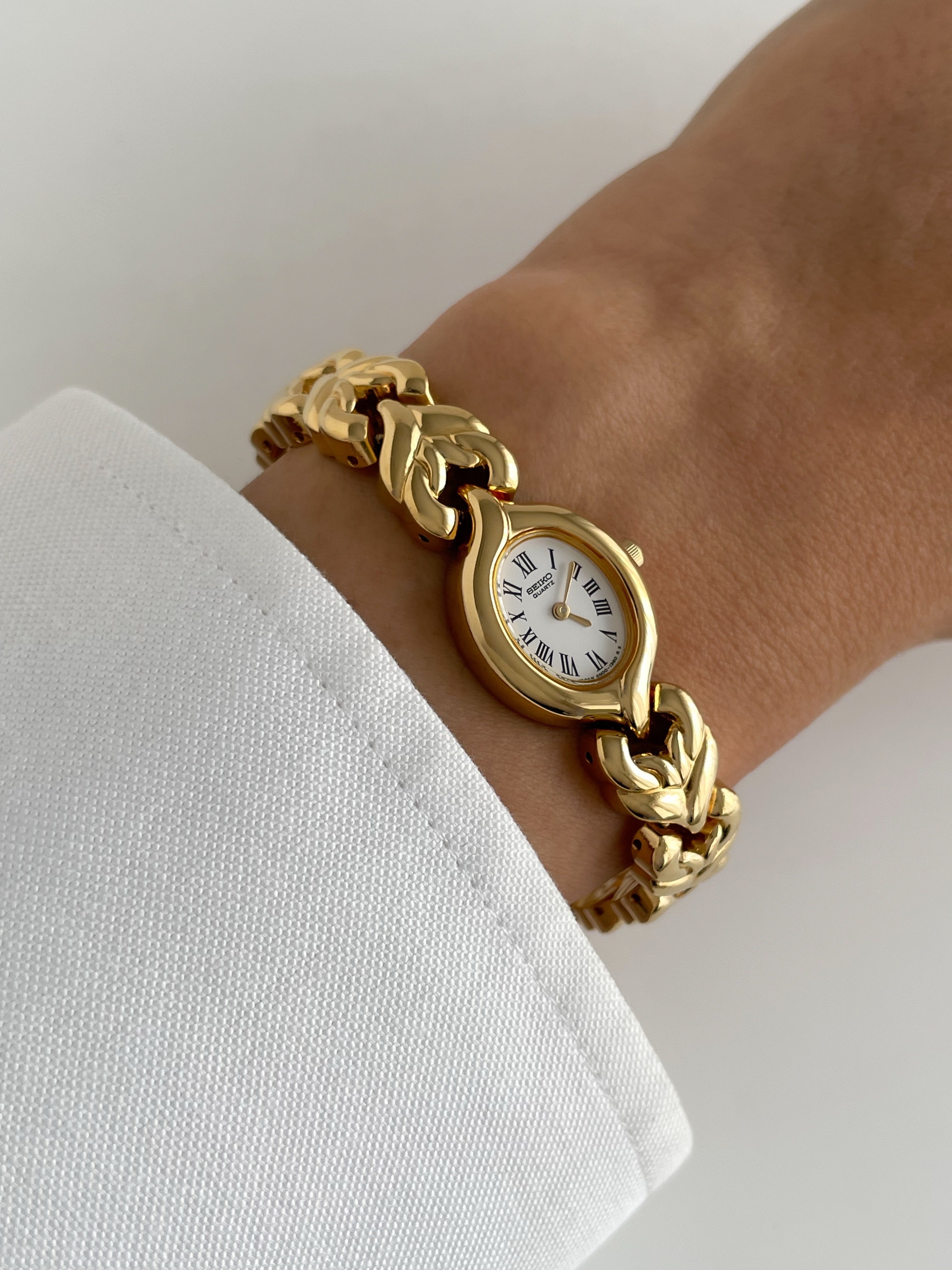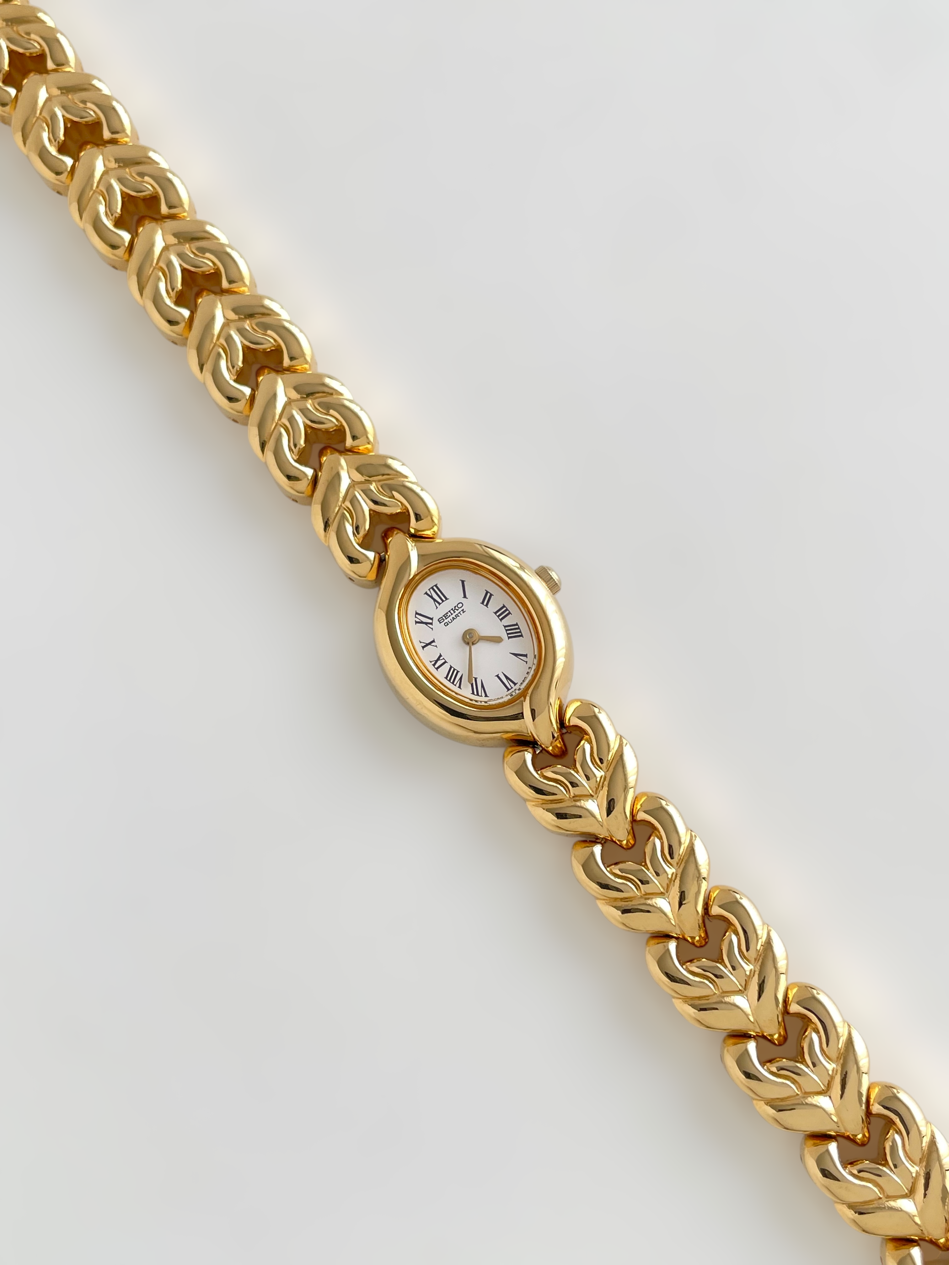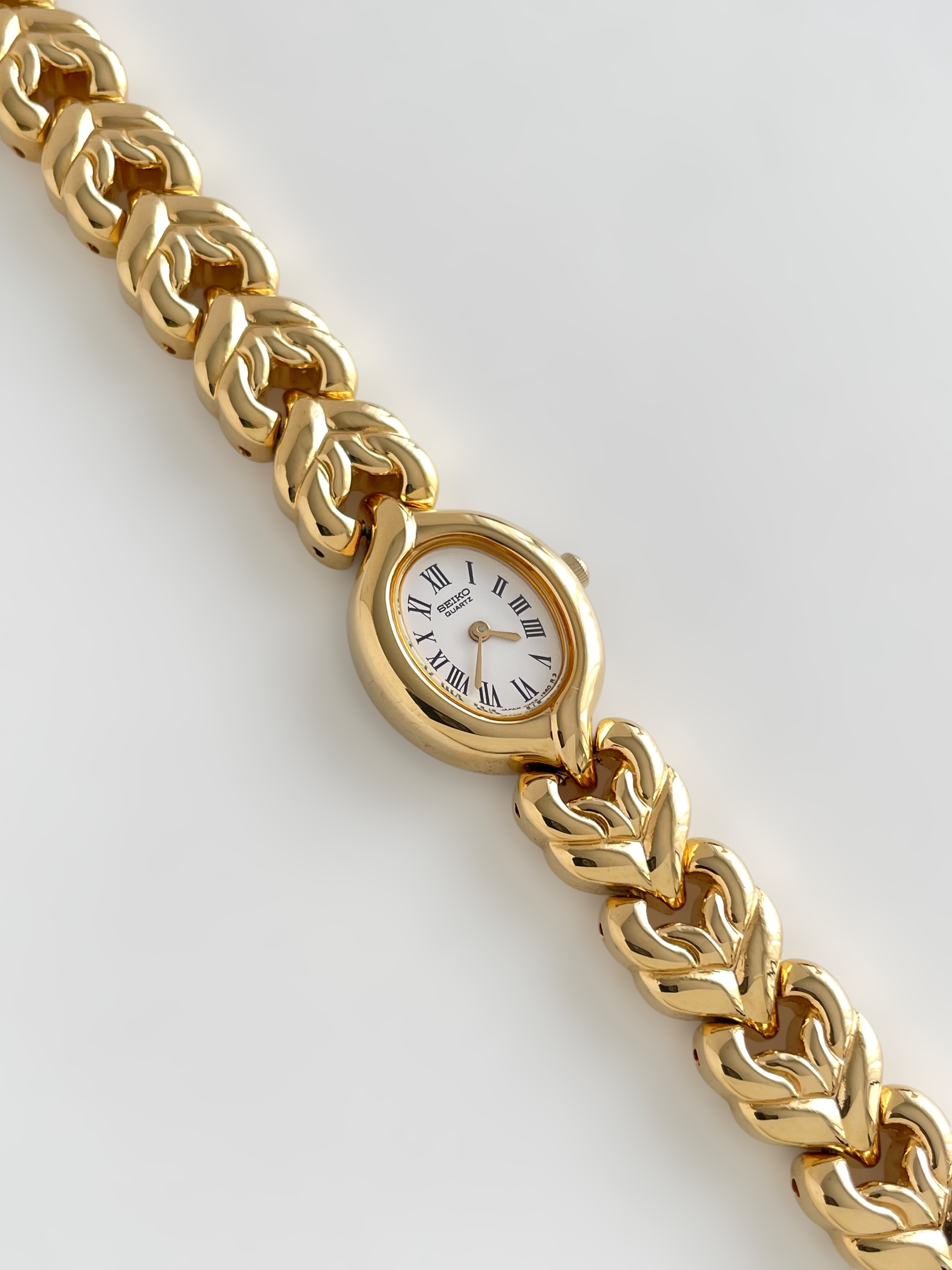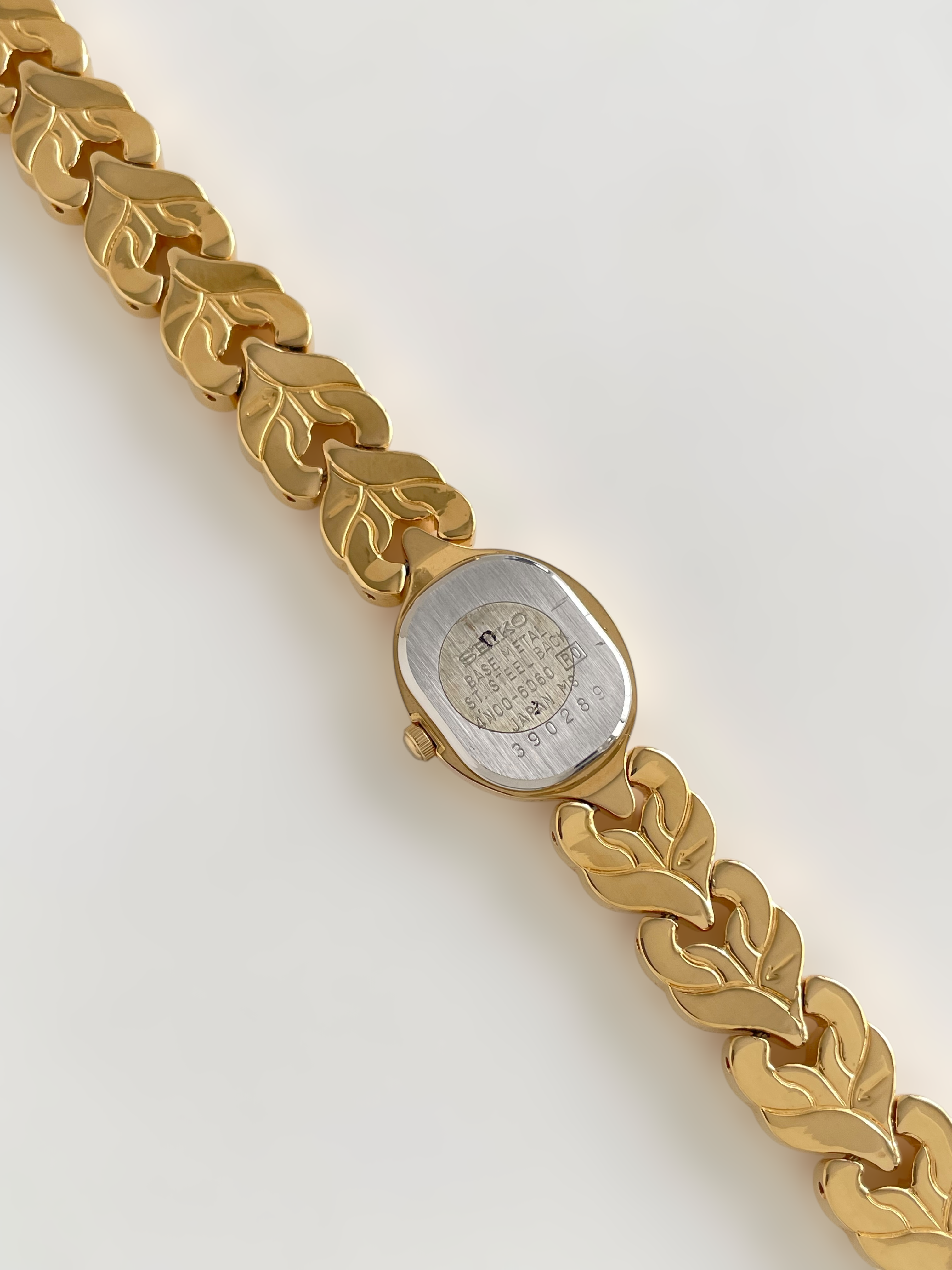 Gorgeous vintage and gold plated rare Seiko watch with an incredible bracelet design and a petite oval case. Iconic Seiko twist closure clasp.