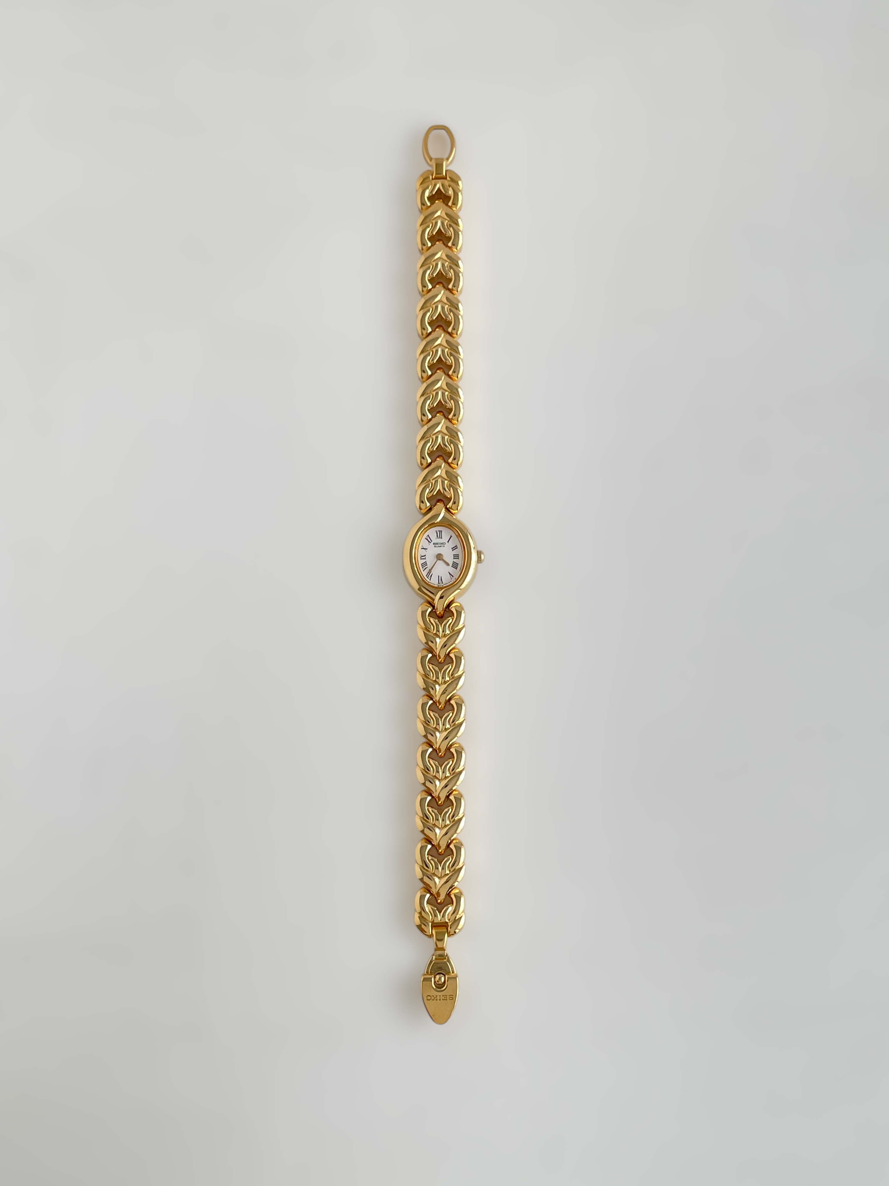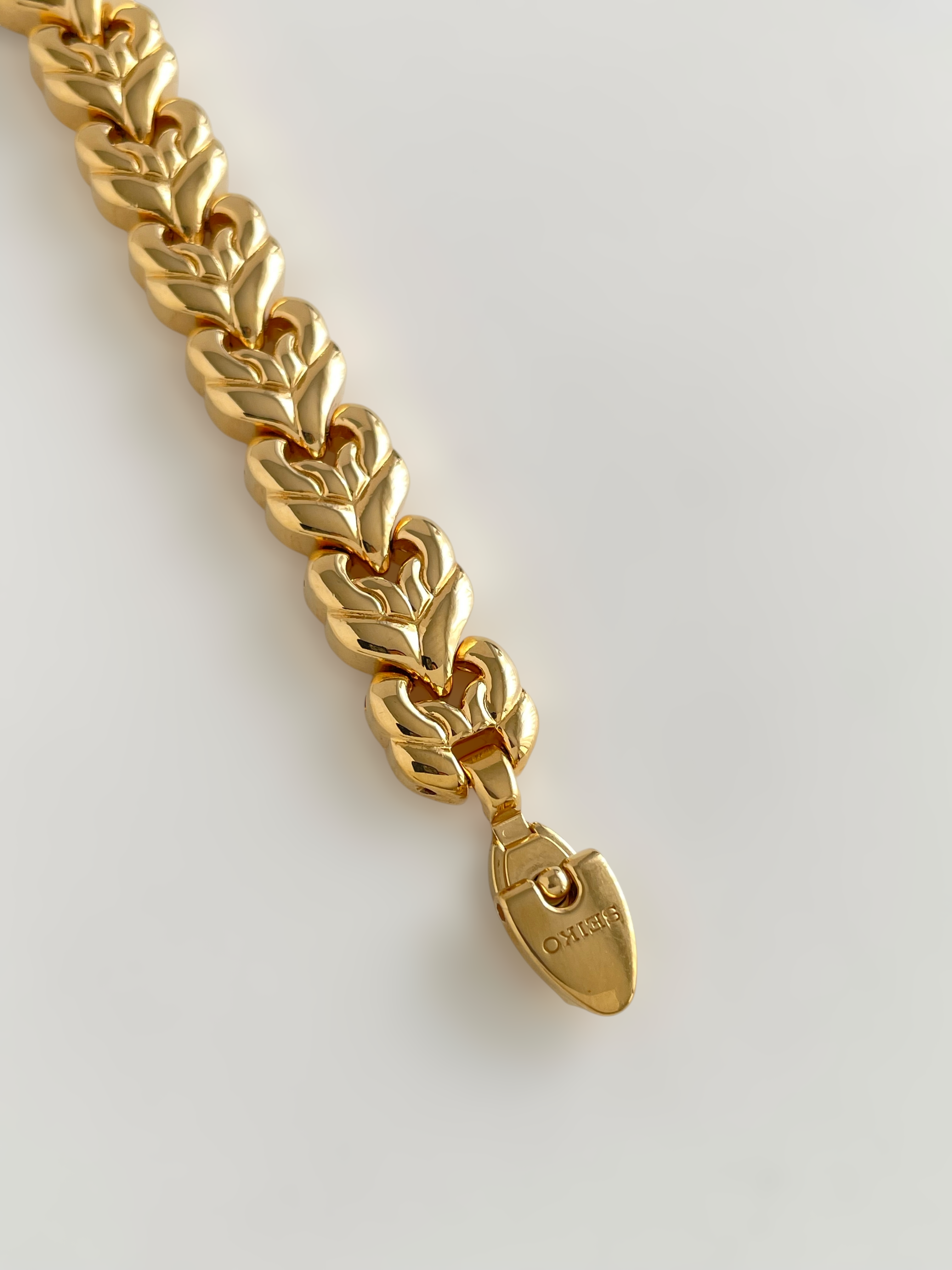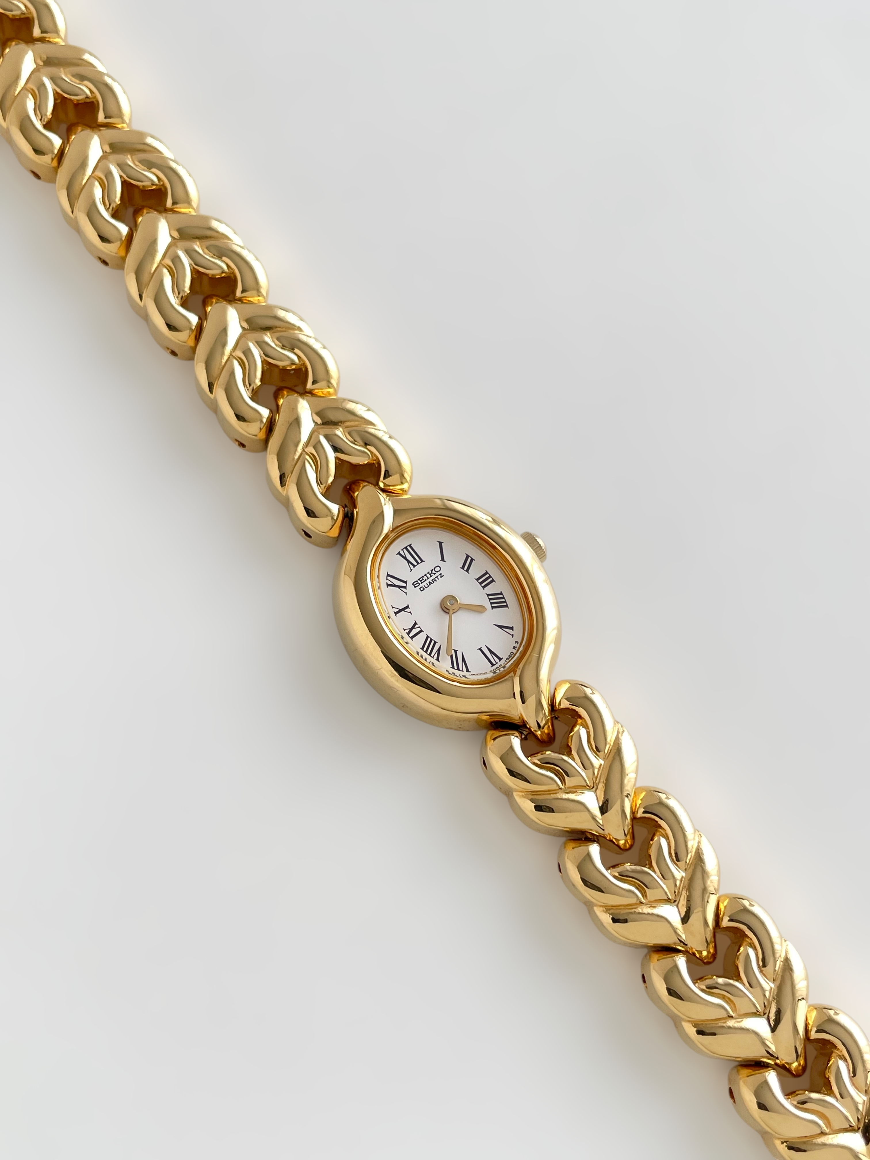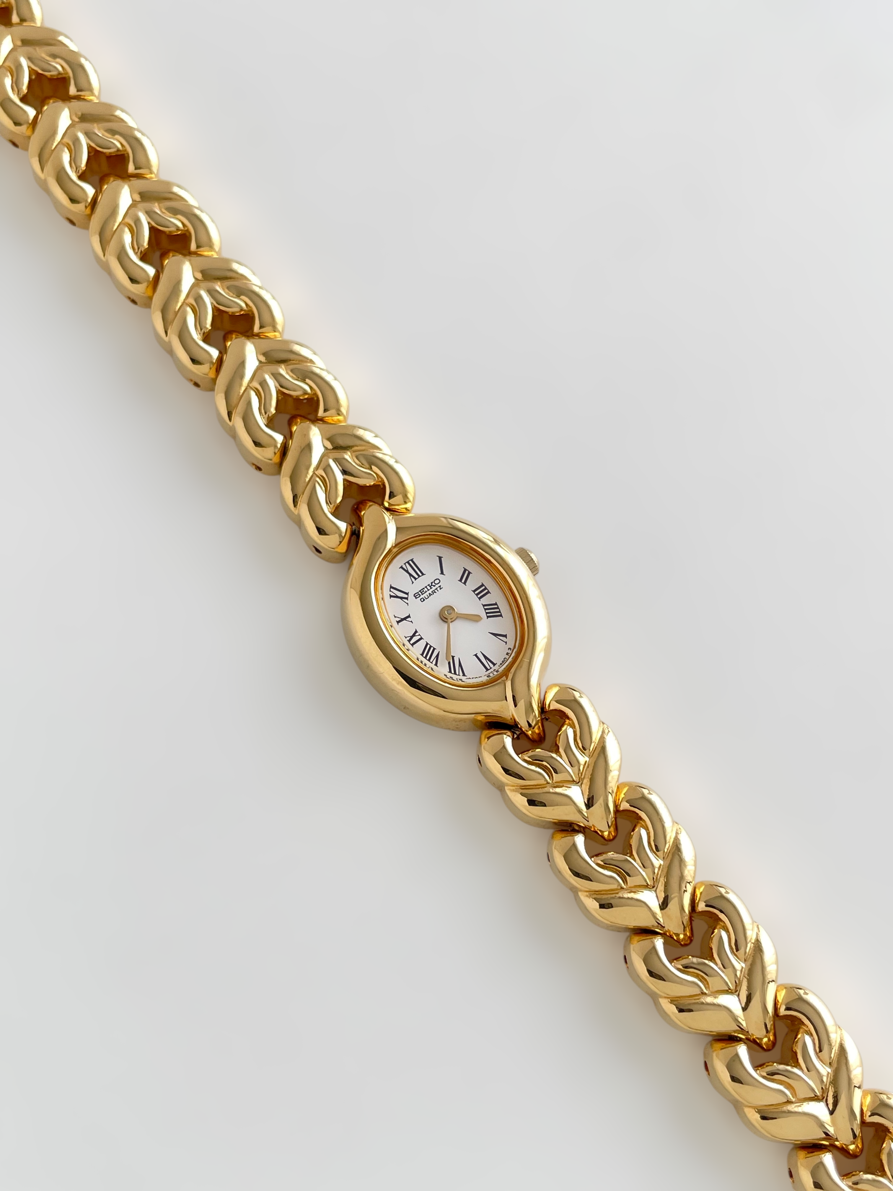 Gorgeous vintage and gold plated rare Seiko watch with an incredible bracelet design and a petite oval case. Iconic Seiko twist closure clasp.