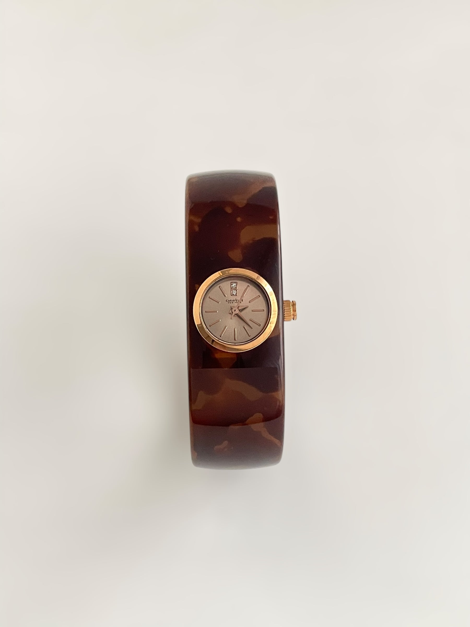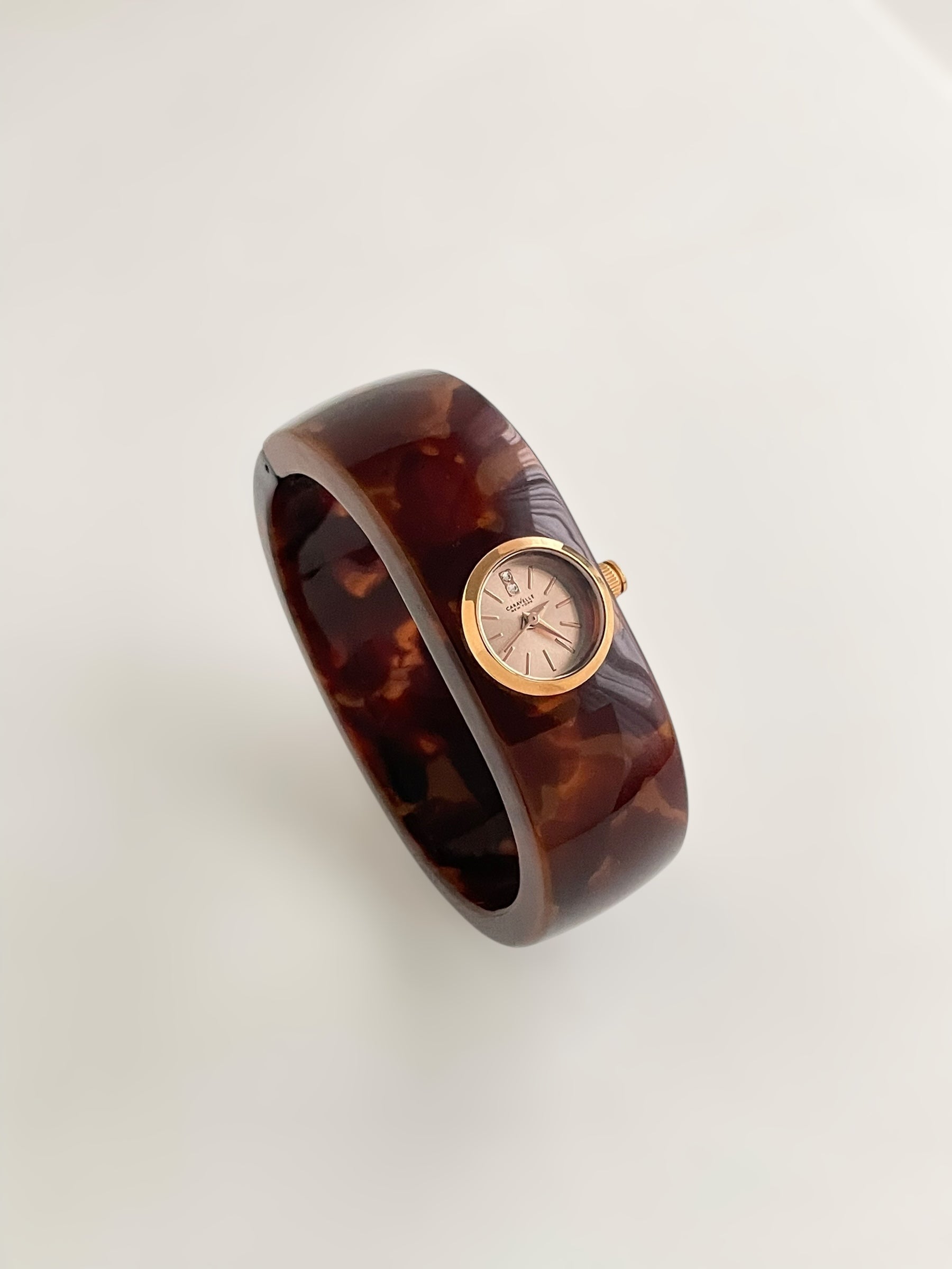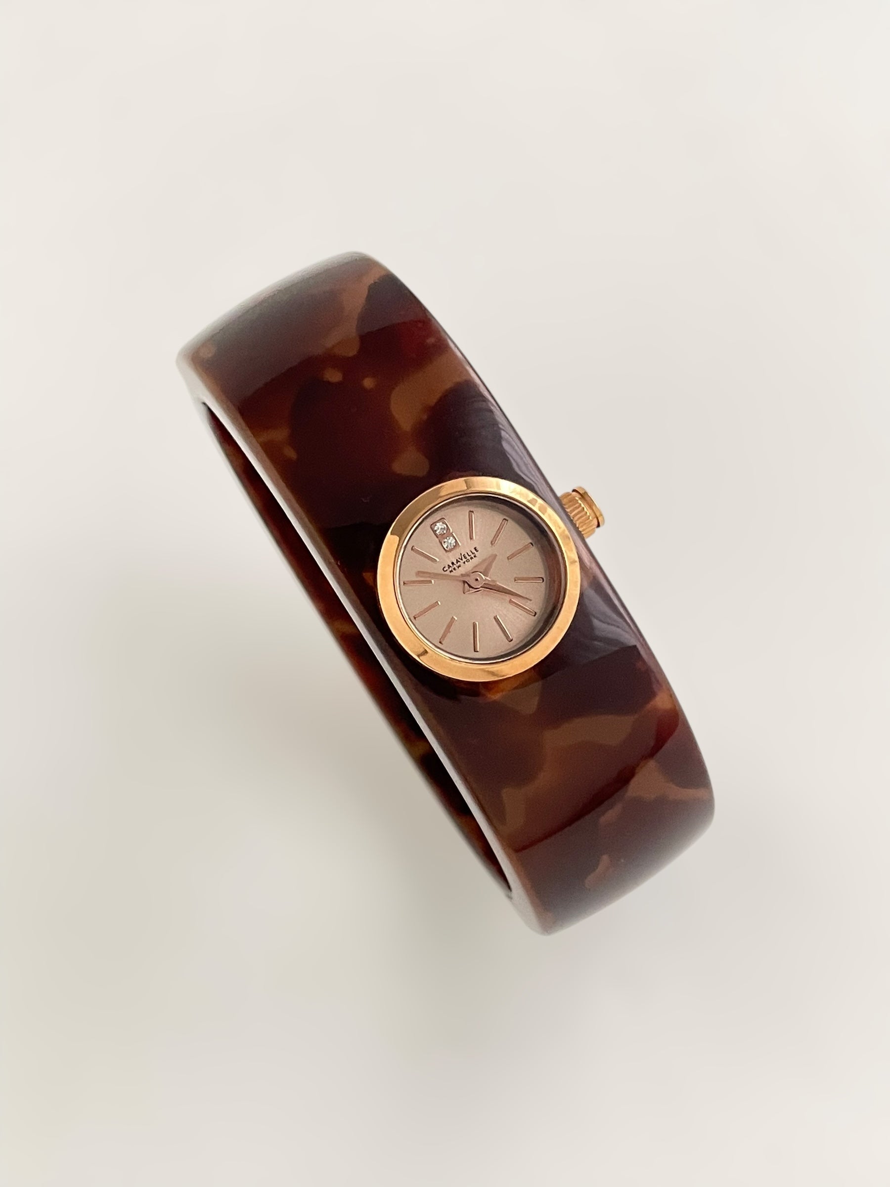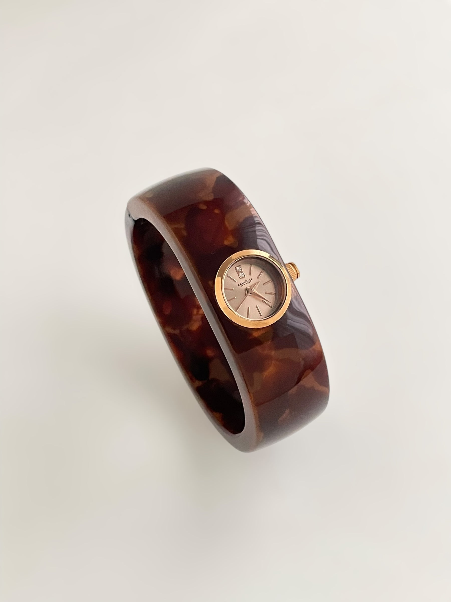 Gorgeous vintage inspired Caravelle by Bulova bangle watch with tortoise pattern resin bangle bracelet and a fixed round dial. Spring tension opening.