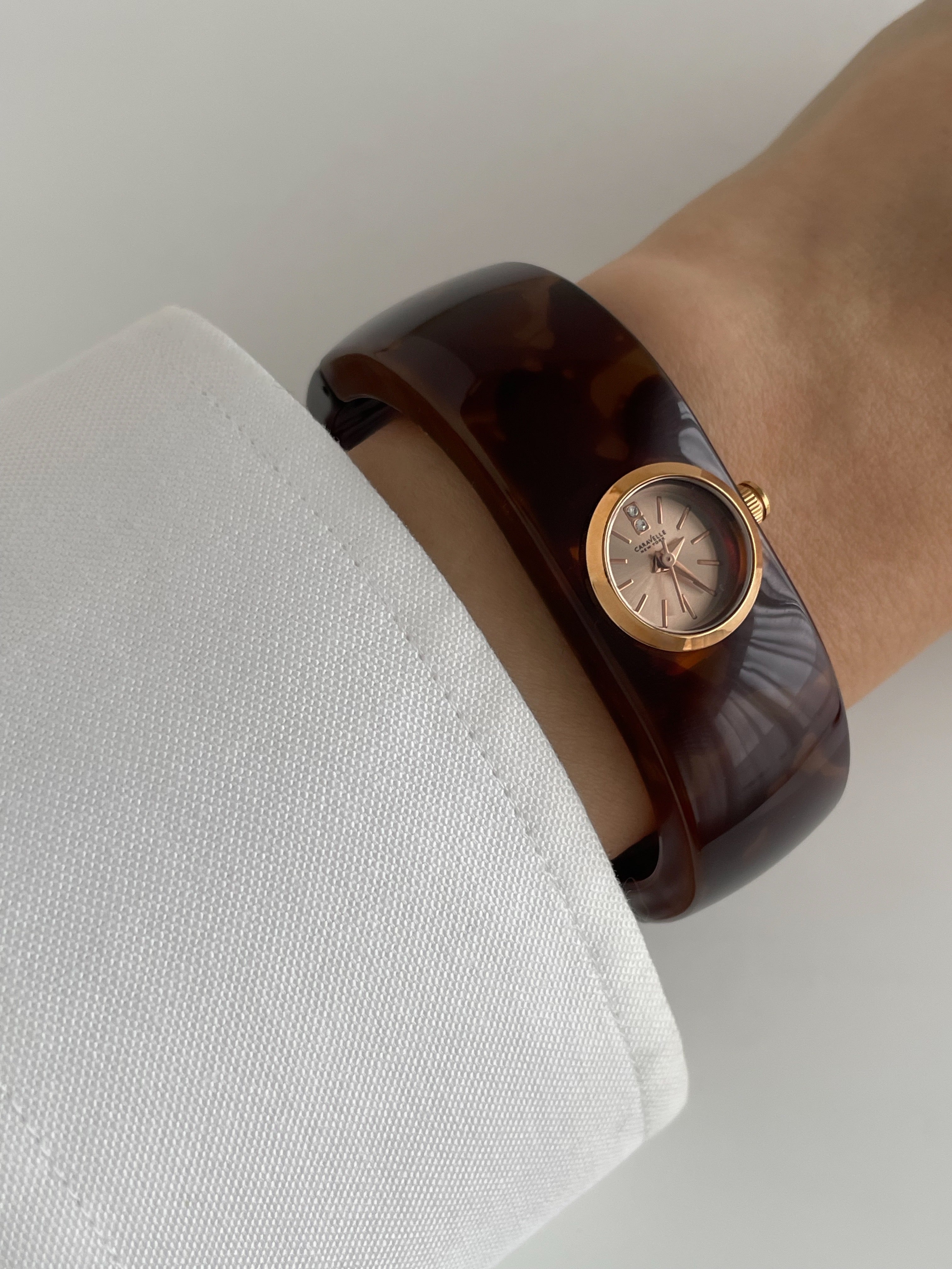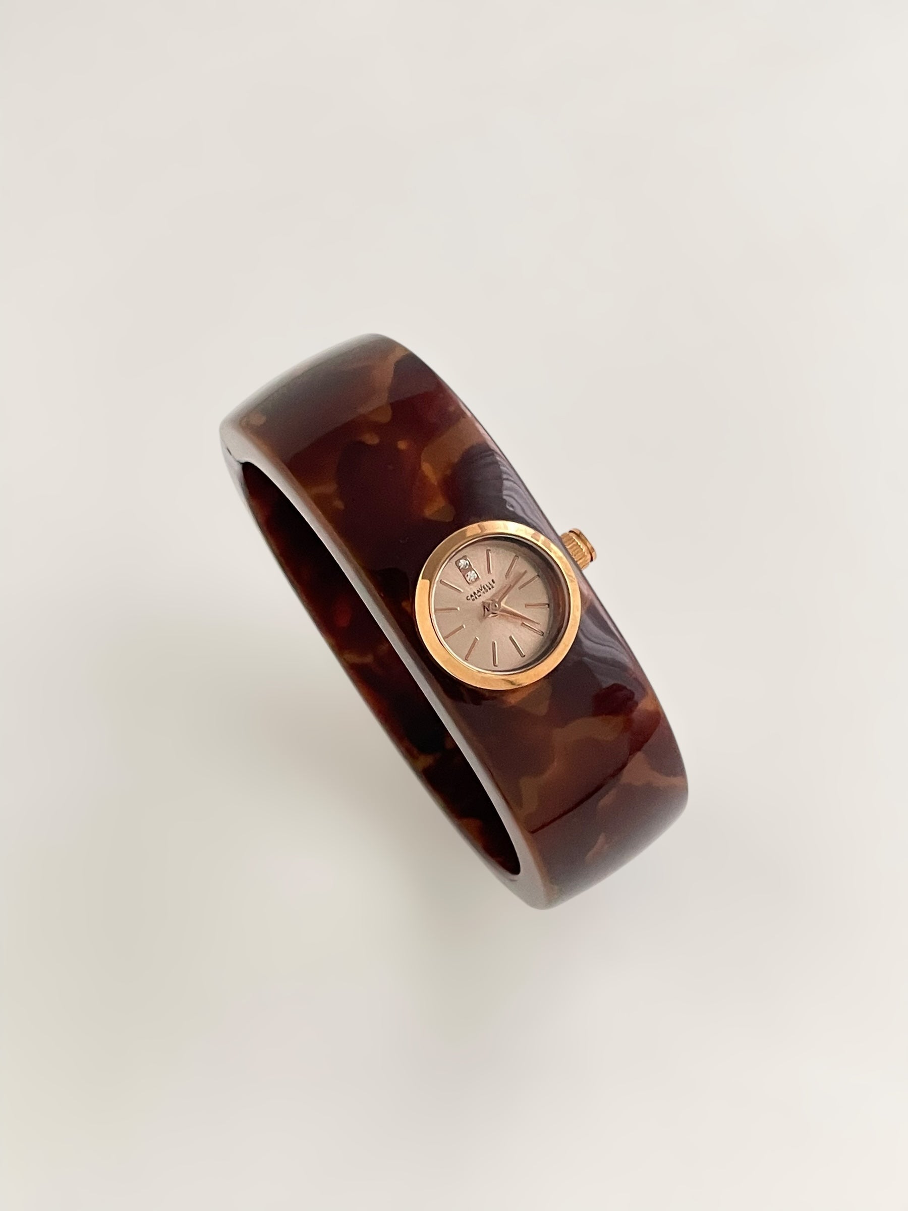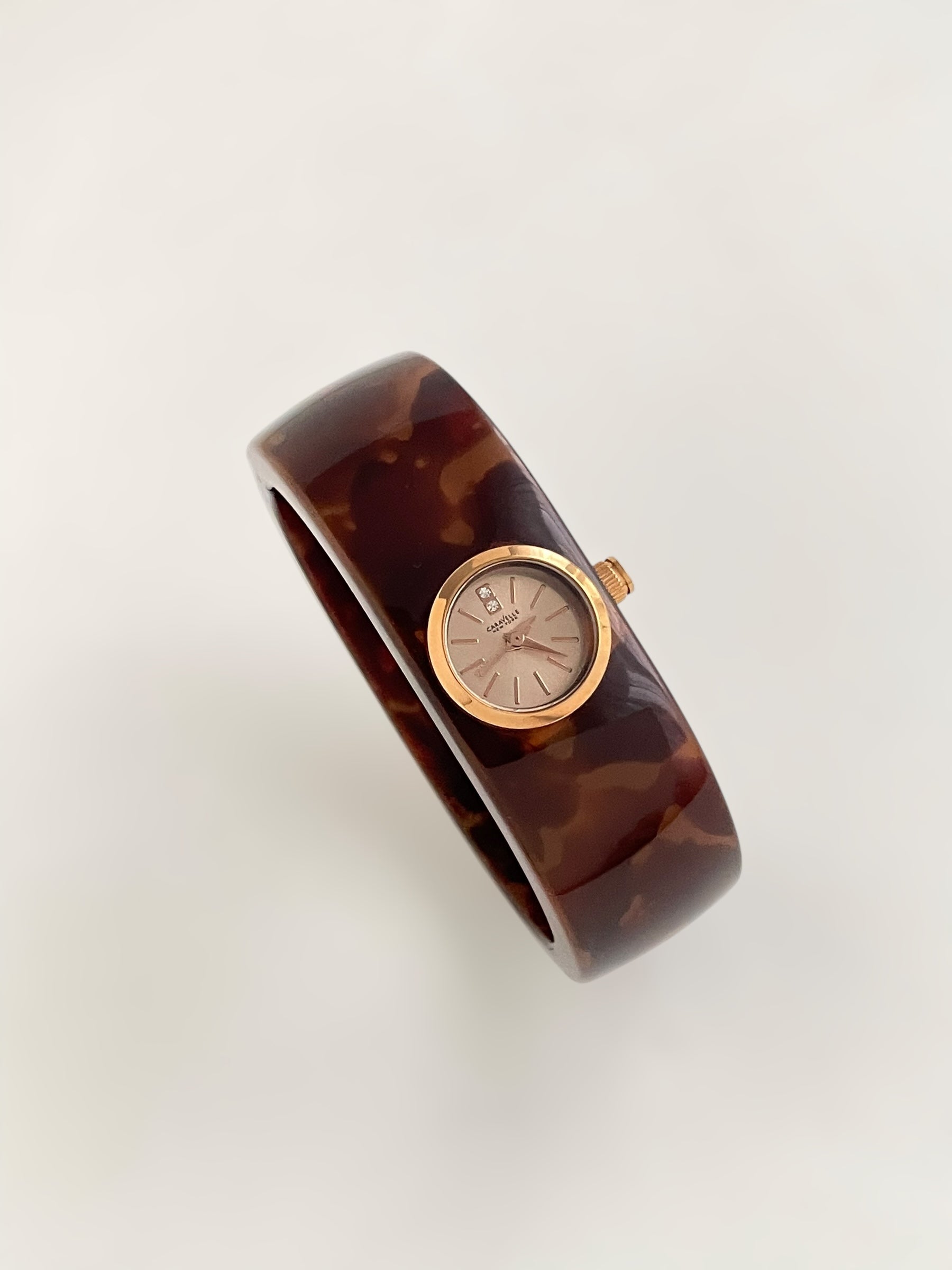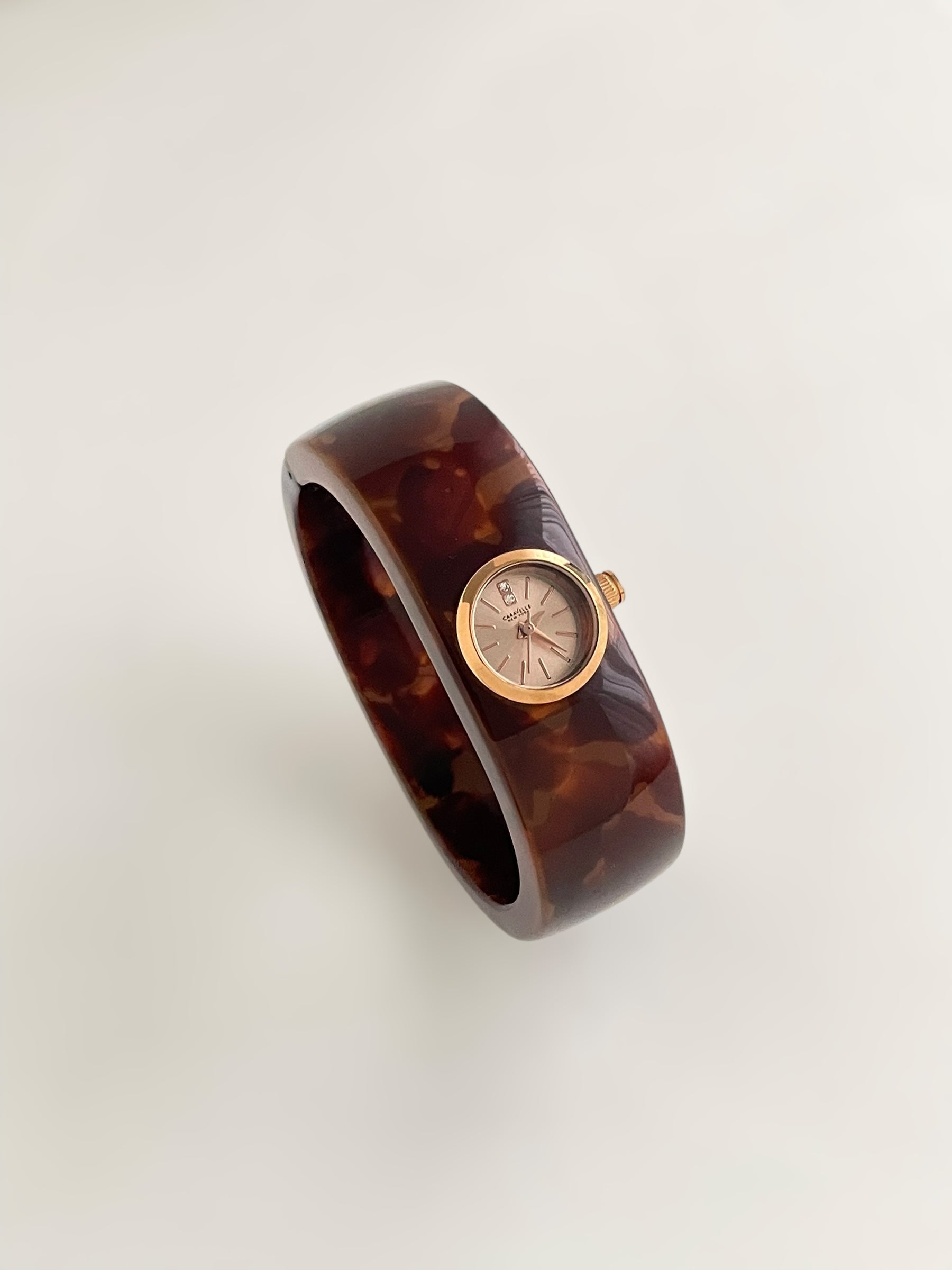 Gorgeous vintage inspired Caravelle by Bulova bangle watch with tortoise pattern resin bangle bracelet and a fixed round dial. Spring tension opening.