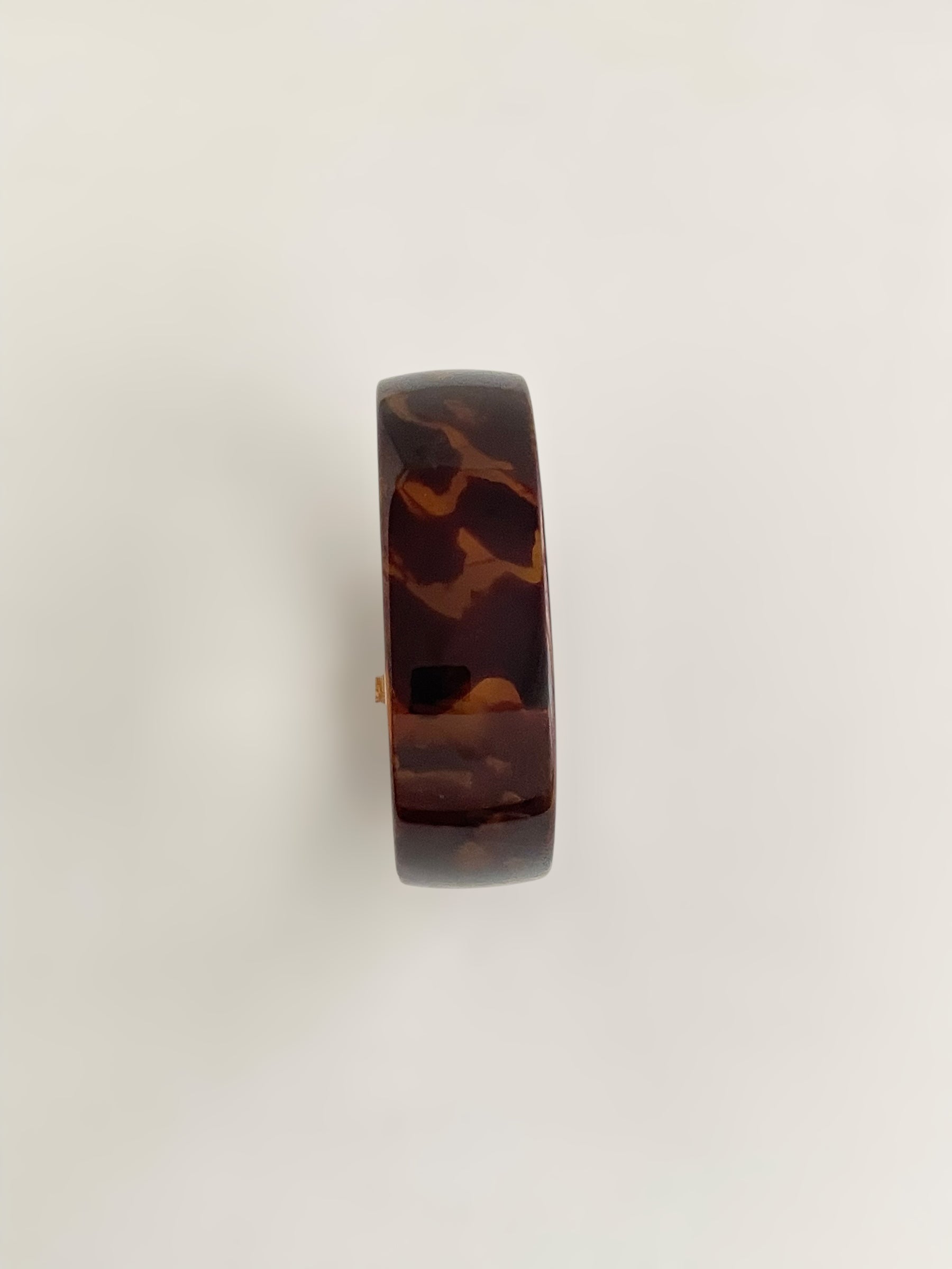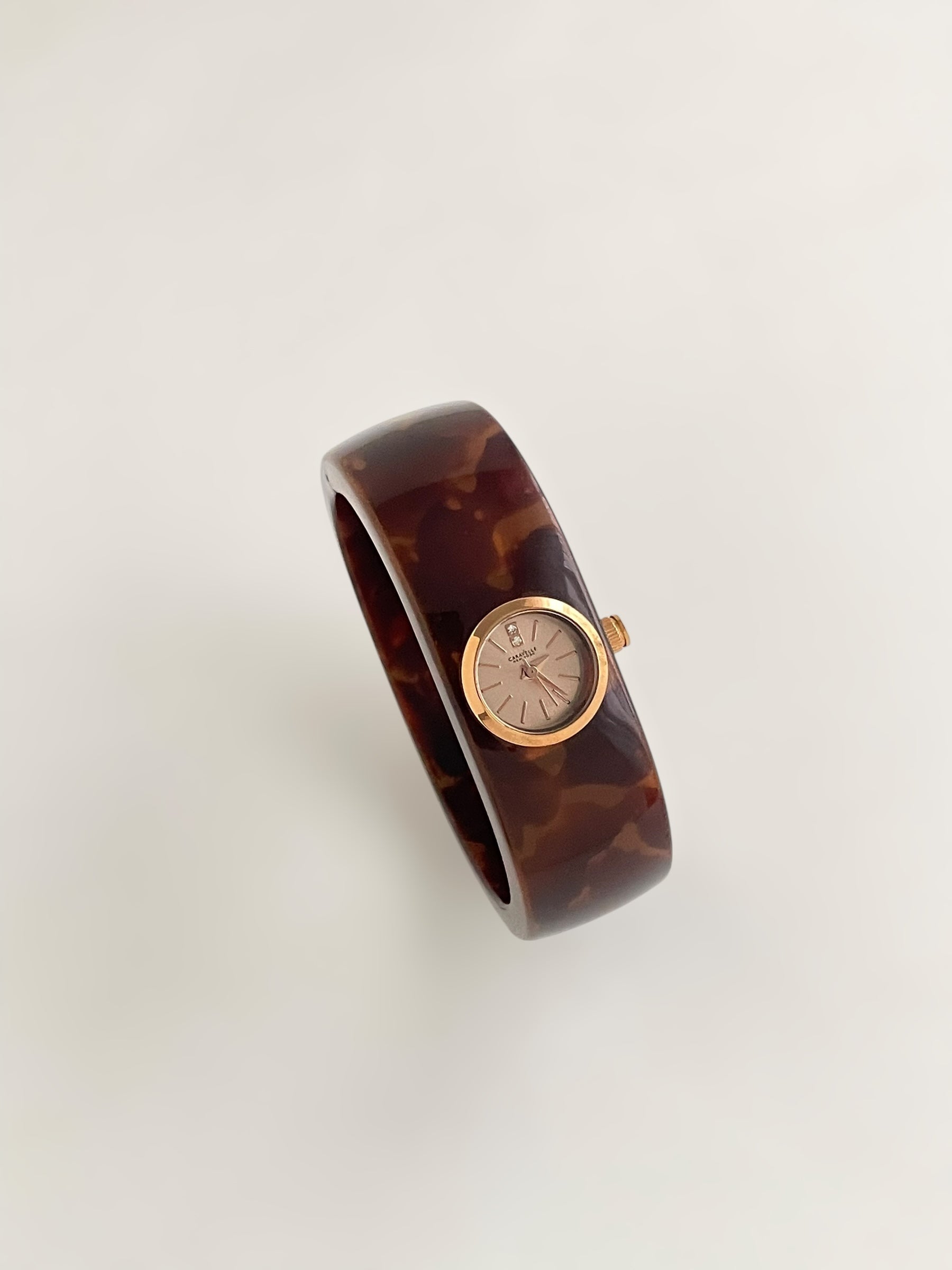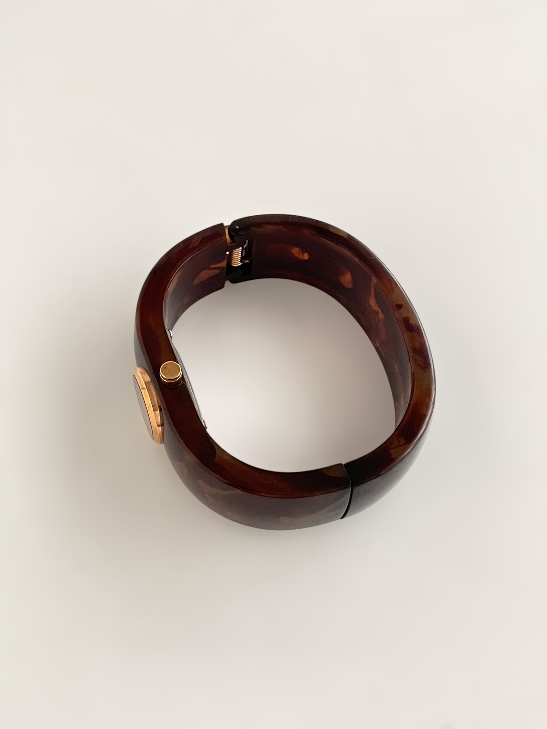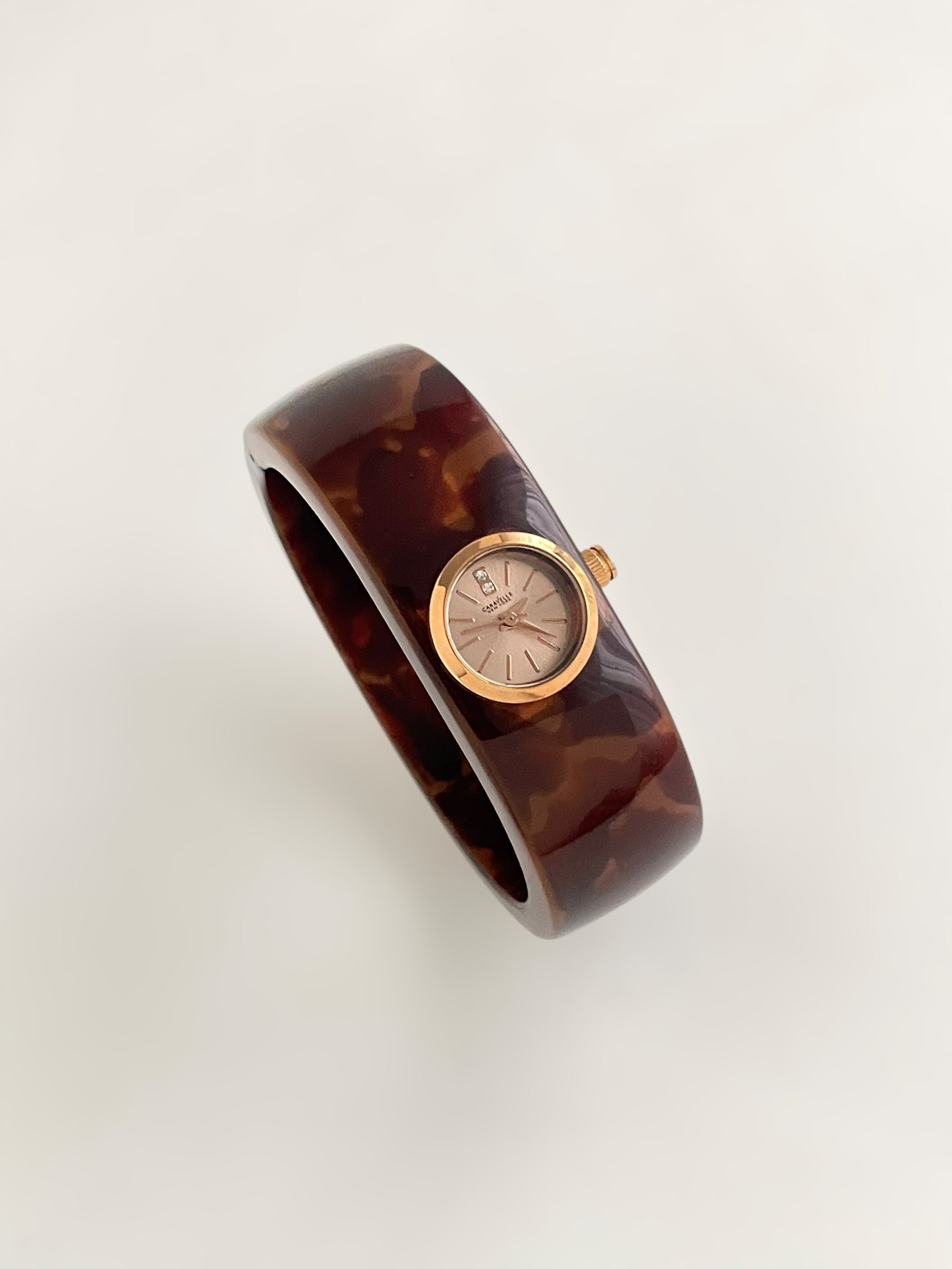 Gorgeous vintage inspired Caravelle by Bulova bangle watch with tortoise pattern resin bangle bracelet and a fixed round dial. Spring tension opening.